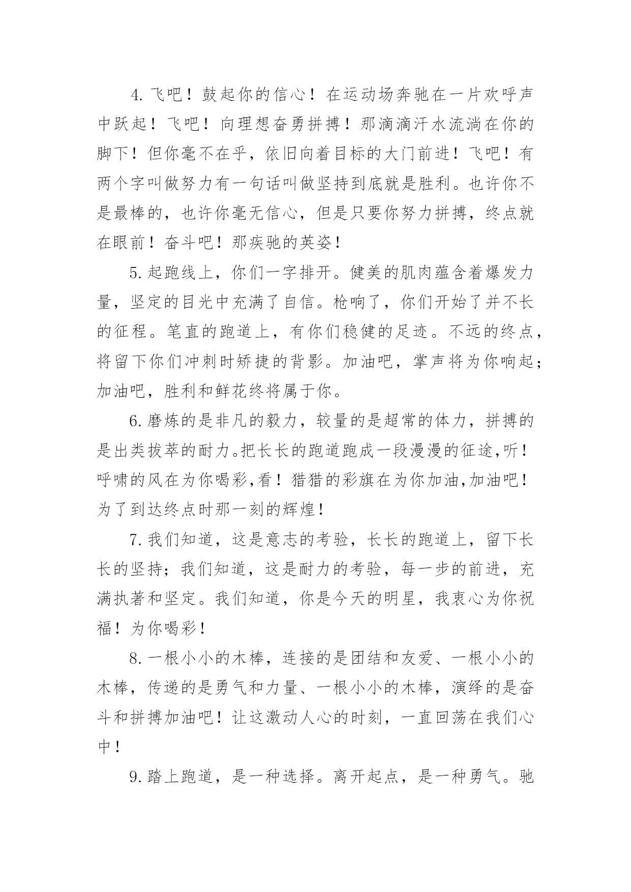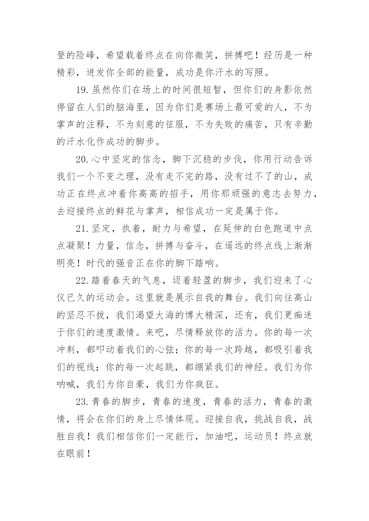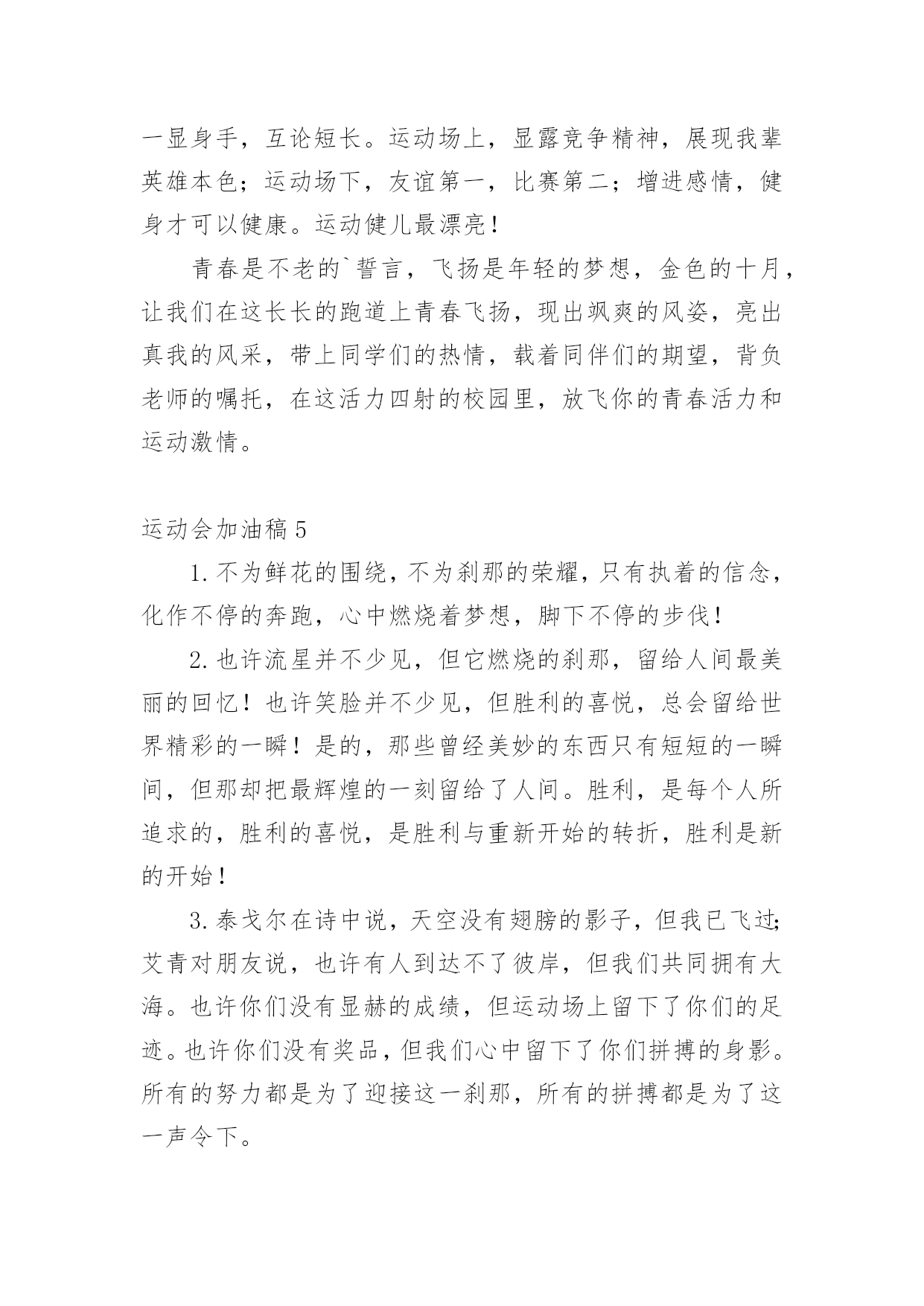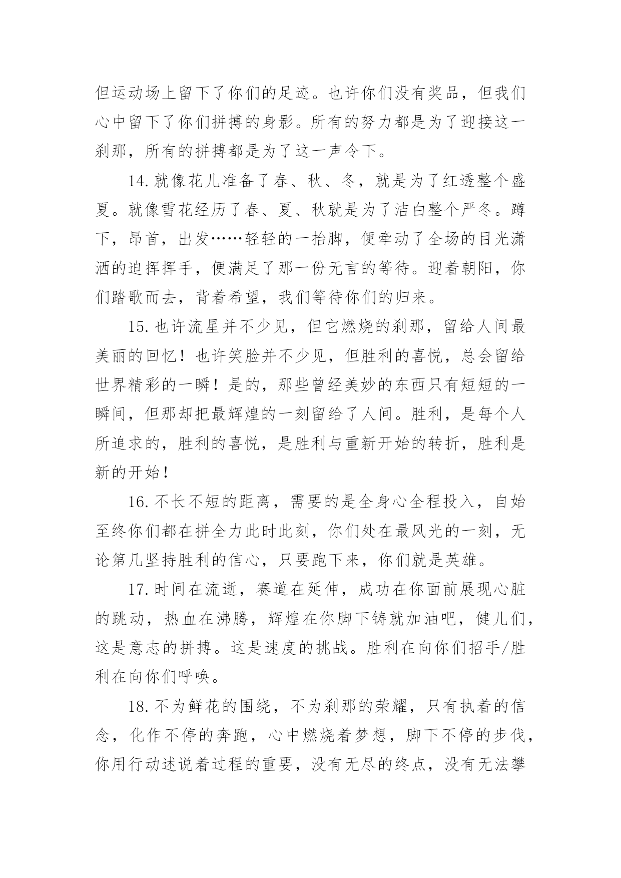 运动会加油稿运动会加油稿15篇【通用】在日新月异的现代社会中,很多地方都会使用到加油稿,加油稿是鼓励激励对方的文稿。大家知道加油稿怎么写才正确吗?以下是小编精心整理的运动会加油稿,希望能够帮助到大家。运动会加油稿1拼搏者拼搏者,你是赛场上最亮的点。在你的眼中,不在乎胜利的欢乐和失败的眼泪,完全只是为了展示生命跳跃的节拍。拼搏者,你是生命乐章中最响的.音符。在你的心中,只有不停拼搏的信念,用自己坚实的步伐去迈开人生新的旅程。场上的拼搏者,你是我们永远的骄傲!珍惜每一次每一次起跑,都充满了希望,每一次腾空,都迸发出力量。每一次成功,都书写着激昂。每一次失败,都孕育着成长。珍惜这每一次的喜悦和失落,珍惜这每一次的感动和忧伤。让花季的心情挥洒万一片绮丽的彩霞,让青春的理想谱写出一段美妙的乐章。不要沉默不要沉默,不要卑怯的退缩;不要沉默,不要颓废的包裹;不要沉默,我们要拼搏,要在沉静中奋起,丢开羞涩,不要沉默!运动会加油稿2理想毕竟不同于现实,失败是生活的一部分,谁也无法选择,无法拒绝。人生要自己去拼搏,去奋斗,在风雨中百折不挠,勇往前进,流泪不是失落,徘徊不是迷惑。加油吧,运动健儿们!不为掌声的诠释,不为刻意的征服,只有辛勤的汗水化作追求的'脚步,心中坚定的信念,脚下沉稳的步伐,你用行动诉说着一个不变的真理,没有比脚更长的路,没有比人更高的山,希望在终点向你招手,努力吧!运动会加油稿31、挑战自我,超越梦想,团结互助,共创佳绩。2、我运动,我健康,此时我欢乐。3、运动起来,勇敢第一。4、夸夫迫日惊华夏,此时平步青云塔黄沙。5、不为鲜花的围绕,不为刹那的荣耀,仅有执着的信念,化作不停的奔跑,心中燃烧着梦想,脚下不停的步伐6、深深的呼吸,等待你的是艰难的100米。7、场上英姿显自豪,脚下步伐在飞奔。你们是骄傲,你们是自豪,跑道因你幻彩,应对红色跑道,你们挥洒自如,不惧一切冲向终点!8、一根小小的`木棒,连接的是团结和友爱一根小小的木棒,传递的是勇气和力量,一根小小的木棒,演绎的是奋斗和拼搏,加油吧!让这激动人心的时刻,一直回荡在我们心中9、时间在流逝,赛道在延伸,成功在你面前展现,心脏在跳动,热血在沸腾,辉煌在你脚下铸就,加油吧,健儿们!运动会加油稿4努力、努力、再努力!加油、加油、再加油!你一定可以像苍龙一样,光耀九州,也可以像孤鹰一样翱翔世界,相信自己。超越自我,胜利永远属于努力的拼搏的你!他们朝气蓬勃,勇往直前;他们同甘共苦,团结一心,不一样的脚步,同一样的声音,是他们团结的心声在召唤。我们的运动健儿,摩拳擦掌,跃跃欲试,要在运动场上一显身手,互论短长。运动场上,显露竞争精神,展现我辈英雄本色;运动场下,友谊第一,比赛第二;增进感情,健身才可以健康。运动健儿最漂亮!青春是不老的`誓言,飞扬是年轻的梦想,金色的十月,让我们在这长长的跑道上青春飞扬,现出飒爽的风姿,亮出真我的风采,带上同学们的热情,载着同伴们的期望,背负老师的嘱托,在这活力四射的校园里,放飞你的青春活力和运动激情。运动会加油稿51.不为鲜花的围绕,不为刹那的荣耀,只有执着的信念,化作不停的奔跑,心中燃烧着梦想,脚下不停的步伐!2.也许流星并不少见,但它燃烧的刹那,留给人间最美丽的回忆!也许笑脸并不少见,但胜利的喜悦,总会留给世界精彩的一瞬!是的,那些曾经美妙的东西只有短短的一瞬间,但那却把最辉煌的一刻留给了人间。胜利,是每个人所追求的,胜利的喜悦,是胜利与重新开始的转折,胜利是新的开始!3.泰戈尔在诗中说,天空没有翅膀的影子,但我已飞过;艾青对朋友说,也许有人到达不了彼岸,但我们共同拥有大海。也许你们没有显赫的成绩,但运动场上留下了你们的足迹。也许你们没有奖品,但我们心中留下了你们拼搏的身影。所有的努力都是为了迎接这一刹那,所有的拼搏都是为了这一声令下。4.飞吧!鼓起你的信心!在运动场奔驰在一片欢呼声中跃起!飞吧!向理想奋勇拼搏!那滴滴汗水流淌在你的脚下!但你毫不在乎,依旧向着目标的大门前进!飞吧!有两个字叫做努力有一句话叫做坚持到底就是胜利。也许你不是最棒的,也许你毫无信心,但是只要你努力拼搏,终点就在眼前!奋斗吧!那疾驰的英姿!5.起跑线上,你们一字排开。健美的肌肉蕴含着爆发力量,坚定的目光中充满了自信。枪响了,你们开始了并不长的征程。笔直的跑道上,有你们稳健的足迹。不远的终点,将留下你们冲刺时矫捷的背影。加油吧,掌声将为你响起;加油吧,胜利和鲜花终将属于你。6.磨炼的是非凡的毅力,较量的是超常的体力,拼搏的是出类拔萃的耐力。把长长的跑道跑成一段漫漫的征途,听!呼啸的风在为你喝彩,看!猎猎的彩旗在为你加油,加油吧!为了到达终点时那一刻的辉煌!7.我们知道,这是意志的考验,长长的跑道上,留下长长的坚持;我们知道,这是耐力的考验,每一步的前进,充满执著和坚定。我们知