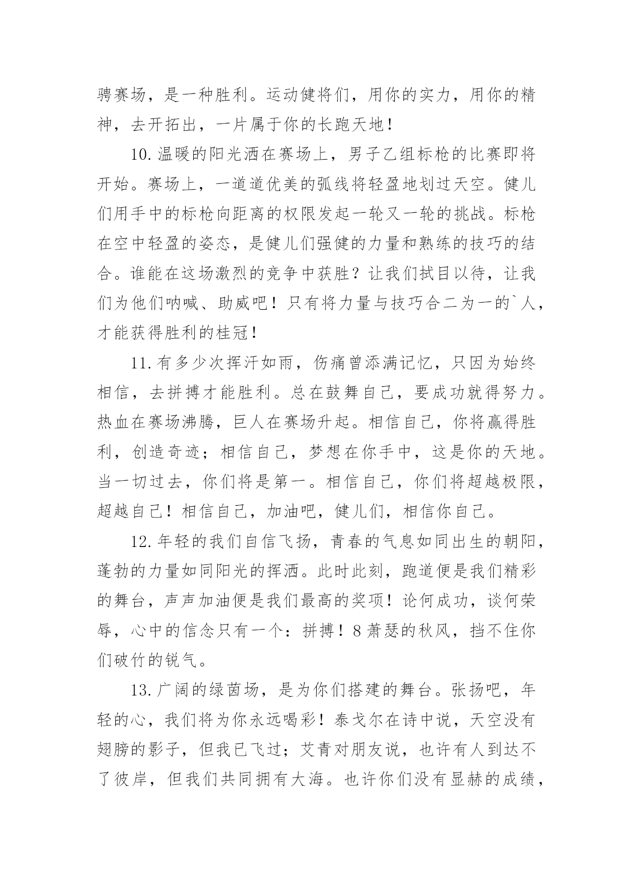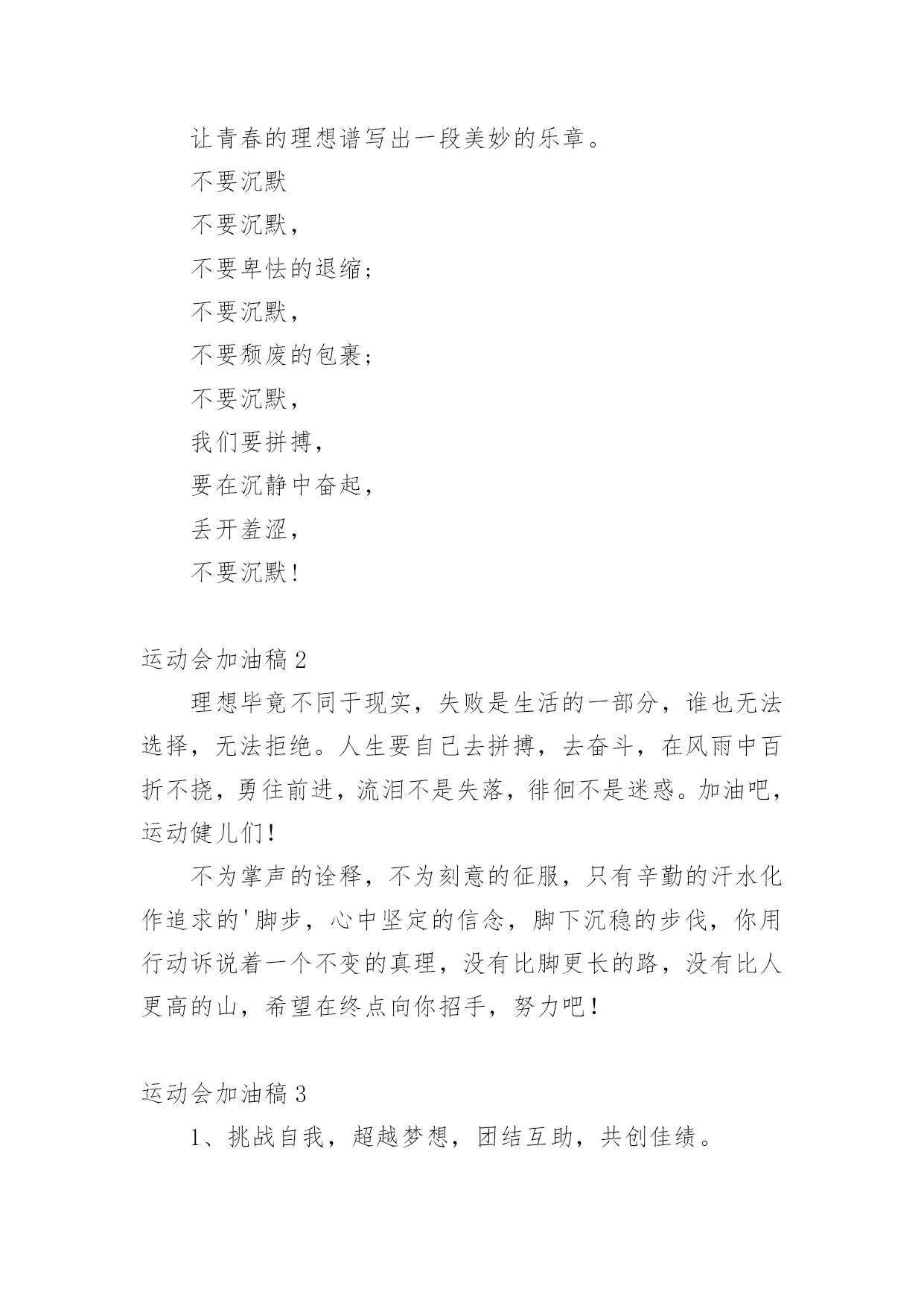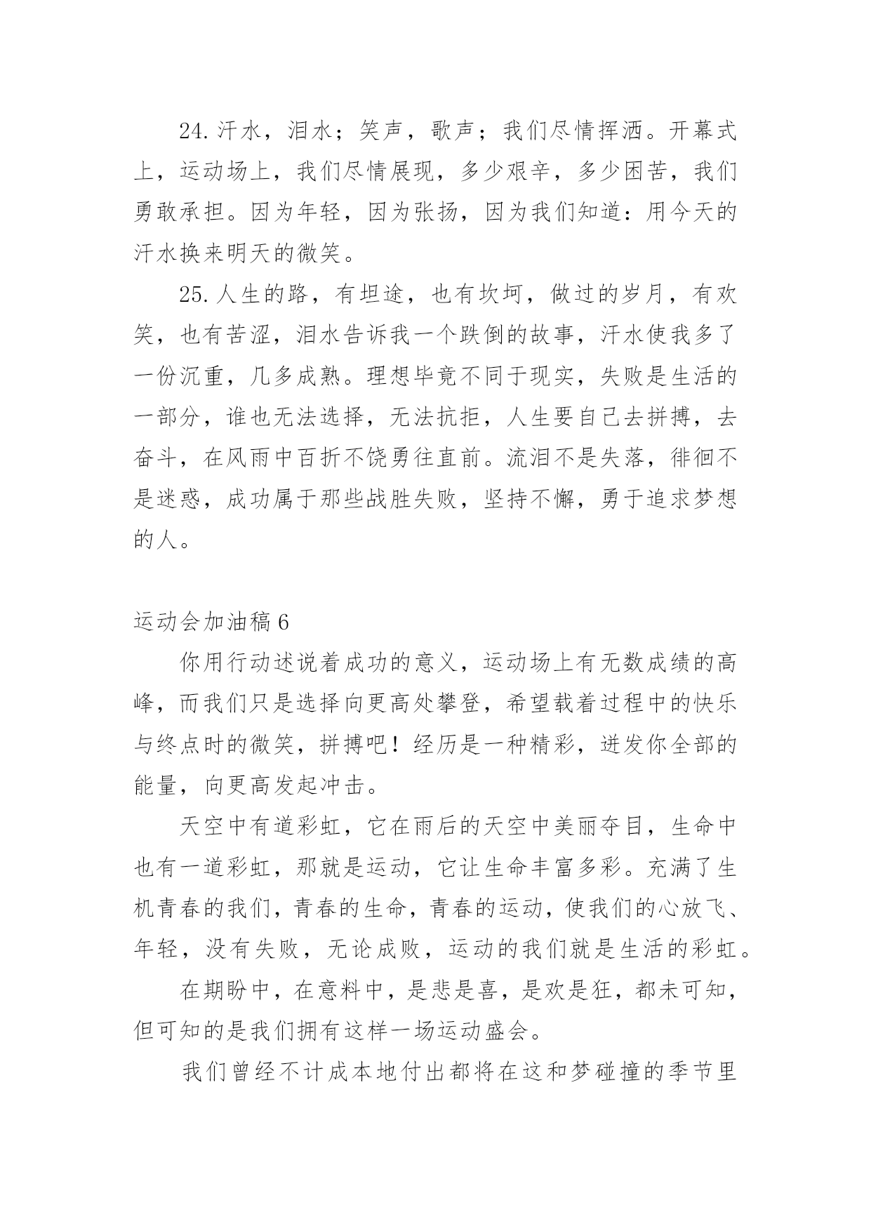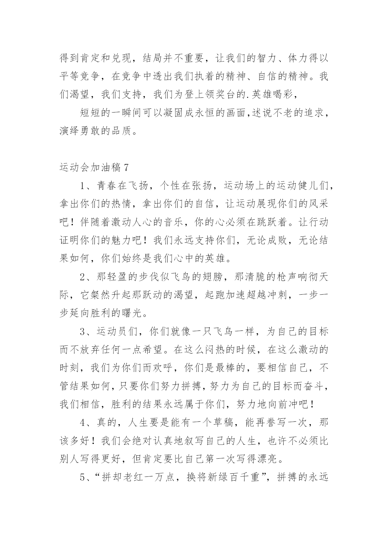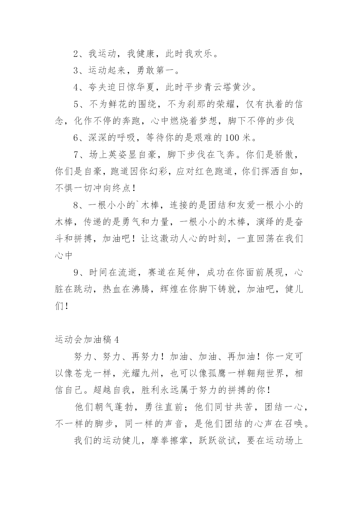 运动会加油稿运动会加油稿15篇【通用】在日新月异的现代社会中,很多地方都会使用到加油稿,加油稿是鼓励激励对方的文稿。大家知道加油稿怎么写才正确吗?以下是小编精心整理的运动会加油稿,希望能够帮助到大家。运动会加油稿1拼搏者拼搏者,你是赛场上最亮的点。在你的眼中,不在乎胜利的欢乐和失败的眼泪,完全只是为了展示生命跳跃的节拍。拼搏者,你是生命乐章中最响的.音符。在你的心中,只有不停拼搏的信念,用自己坚实的步伐去迈开人生新的旅程。场上的拼搏者,你是我们永远的骄傲!珍惜每一次每一次起跑,都充满了希望,每一次腾空,都迸发出力量。每一次成功,都书写着激昂。每一次失败,都孕育着成长。珍惜这每一次的喜悦和失落,珍惜这每一次的感动和忧伤。让花季的心情挥洒万一片绮丽的彩霞,让青春的理想谱写出一段美妙的乐章。不要沉默不要沉默,不要卑怯的退缩;不要沉默,不要颓废的包裹;不要沉默,我们要拼搏,要在沉静中奋起,丢开羞涩,不要沉默!运动会加油稿2理想毕竟不同于现实,失败是生活的一部分,谁也无法选择,无法拒绝。人生要自己去拼搏,去奋斗,在风雨中百折不挠,勇往前进,流泪不是失落,徘徊不是迷惑。加油吧,运动健儿们!不为掌声的诠释,不为刻意的征服,只有辛勤的汗水化作追求的'脚步,心中坚定的信念,脚下沉稳的步伐,你用行动诉说着一个不变的真理,没有比脚更长的路,没有比人更高的山,希望在终点向你招手,努力吧!运动会加油稿31、挑战自我,超越梦想,团结互助,共创佳绩。2、我运动,我健康,此时我欢乐。3、运动起来,勇敢第一。4、夸夫迫日惊华夏,此时平步青云塔黄沙。5、不为鲜花的围绕,不为刹那的荣耀,仅有执着的信念,化作不停的奔跑,心中燃烧着梦想,脚下不停的步伐6、深深的呼吸,等待你的是艰难的100米。7、场上英姿显自豪,脚下步伐在飞奔。你们是骄傲,你们是自豪,跑道因你幻彩,应对红色跑道,你们挥洒自如,不惧一切冲向终点!8、一根小小的`木棒,连接的是团结和友爱一根小小的木棒,传递的是勇气和力量,一根小小的木棒,演绎的是奋斗和拼搏,加油吧!让这激动人心的时刻,一直回荡在我们心中9、时间在流逝,赛道在延伸,成功在你面前展现,心脏在跳动,热血在沸腾,辉煌在你脚下铸就,加油吧,健儿们!运动会加油稿4努力、努力、再努力!加油、加油、再加油!你一定可以像苍龙一样,光耀九州,也可以像孤鹰一样翱翔世界,相信自己。超越自我,胜利永远属于努力的拼搏的你!他们朝气蓬勃,勇往直前;他们同甘共苦,团结一心,不一样的脚步,同一样的声音,是他们团结的心声在召唤。我们的运动健儿,摩拳擦掌,跃跃欲试,要在运动场上一显身手,互论短长。运动场上,显露竞争精神,展现我辈英雄本色;运动场下,友谊第一,比赛第二;增进感情,健身才可以健康。运动健儿最漂亮!青春是不老的`誓言,飞扬是年轻的梦想,金色的十月,让我们在这长长的跑道上青春飞扬,现出飒爽的风姿,亮出真我的风采,带上同学们的热情,载着同伴们的期望,背负老师的嘱托,在这活力四射的校园里,放飞你的青春活力和运动激情。运动会加油稿51.不为鲜花的围绕,不为刹那的荣耀,只有执着的信念,化作不停的奔跑,心中燃烧着梦想,脚下不停的步伐!2.也许流星并不少见,但它燃烧的刹那,留给人间最美丽的回忆!也许笑脸并不少见,但胜利的喜悦,总会留给世界精彩的一瞬!是的,那些曾经美妙的东西只有短短的一瞬间,但那却把最辉煌的一刻留给了人间。胜利,是每个人所追求的,胜利的喜悦,是胜利与重新开始的转折,胜利是新的开始!3.泰戈尔在诗中说,天空没有翅膀的影子,但我已飞过;艾青对朋友说,也许有人到达不了彼岸,但我们共同拥有大海。也许你们没有显赫的成绩,但运动场上留下了你们的足迹。也许你们没有奖品,但我们心中留下了你们拼搏的身影。所有的努力都是为了迎接这一刹那,所有的拼搏都是为了这一声令下。4.飞吧!鼓起你的信心!在运动场奔驰在一片欢呼声中跃起!飞吧!向理想奋勇拼搏!那滴滴汗水流淌在你的脚下!但你毫不在乎,依旧向着目标的大门前进!飞吧!有两个字叫做努力有一句话叫做坚持到底就是胜利。也许你不是最棒的,也许你毫无信心,但是只要你努力拼搏,终点就在眼前!奋斗吧!那疾驰的英姿!5.起跑线上,你们一字排开。健美的肌肉蕴含着爆发力量,坚定的目光中充满了自信。枪响了,你们开始了并不长的征程。笔直的跑道上,有你们稳健的足迹。不远的终点,将留下你们冲刺时矫捷的背影。加油吧,掌声将为你响起;加油吧,胜利和鲜花终将属于你。6.磨炼的是非凡的毅力,较量的是超常的体力,拼搏的是出类拔萃的耐力。把长长的跑道跑成一段漫漫的征途,听!呼啸的风在为你喝彩,看!猎猎的彩旗在为你加油,加油吧!为了到达终点时那一刻的辉煌!7.我们知道,这是意志的考验,长长的跑道上,留下长长的坚持;我们知道,这是耐力的考验,每一步的前进,充满执著和坚定。我们知