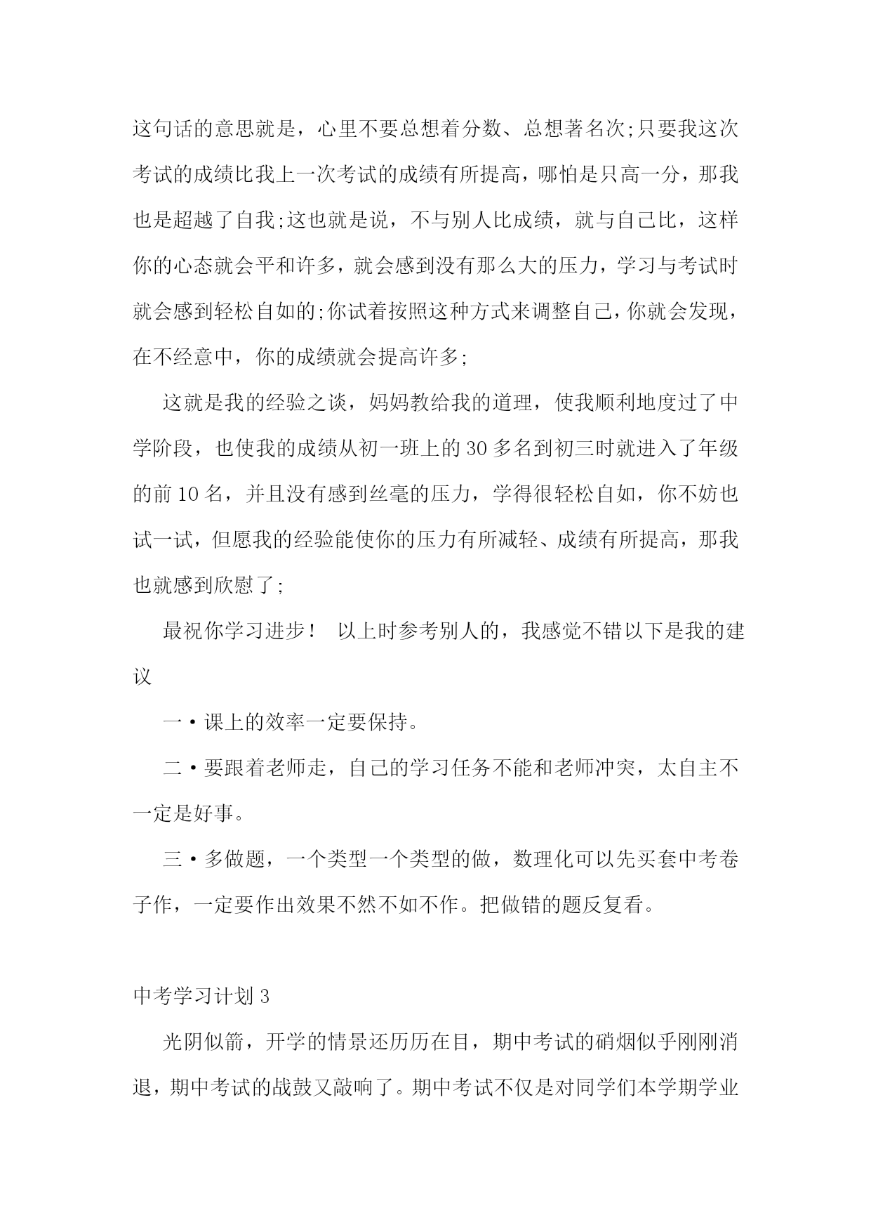 中考学习计划15篇中考学习计划1一、学情分析1、我校这届毕业班的学生对于历史学科的复习的最大特点就是重视程度偏低,明显表现为上课情绪、激情不足,平时主动复习的欲望淡薄,有些学生甚至出现马虎应付的现象。2、大部分学生基础知识不牢,能力欠缺,一是平时积累少,或者根本没有积累;二是平时练习时间少;三是平时练习的一些比较有创新的题目依赖性较大,表现为等待老师的答案,或者干脆置之不理。3、学生自己可控的时间少,自主学习能力非常有限,在各科的复习时间上的安排欠缺合理性,学生对历史复习大多跟着感觉走,导致复习效果不是很理想;4、学生对练习的巩固情况令人担忧,大部分对练习没能形成一个系统性的整理和概括,思想上仍是单纯地认为练习过的习题就是不需要再进行巩固了;甚至个别的学生眼高手低,对多次出现的习题不搭理。5、许多学生的书写仍是比较潦草不清,答案不讲格式,学习习惯比较差;二、指导思想调动学生学习历史的积极性,改变学生学习方式,促进学生自主学习、合作学习、探究学习;引导学生关注社会、关注人文、关注生活。培养学生创新能力和实践能力,培养学生良好的品德和健全的人格,为学生终生学习奠定坚实的基础。严格遵循考试标准和开放思维的规律,紧扣教材,精心安排复习计划,科学组织复习。整合知识点,收集焦点和热点,迁移训练。大容量快节奏,全面完成任务。充分发挥学生主动性,提高学生的学习技能和思维水平,促进创新思维的形成和发展,提高学生的应考能力,全力迎接中考。三、复习方法历史中考已从应试型考试向能力型考试方向发展。在历史中考复习中,离开历史基础知识的掌握去谈能力的培养,这种能力就成了无源之水,无本之木。所以,历史中考复习时必须做到知识和能力并重。第一轮:巩固知识,夯实基础,系统复习。1、紧扣课程标准、深研中考说明:进入九年级阶段,学习内容和要求、解题思路和方法、及所要达到的能力,都与以往有所不同。历史事件的发展是有其内在规律的,历史教材的编撰也是有其经纬逻辑的。要紧扣课程标准,把握历史复习导向;深研中考说明。要分析教材框架、理清历史事件脉络,通过对书本中一个又一个历史事件的学习和分析,看清教材中每一章每一节编撰的用意。2、重视标题,按章逐节。历史学科讲究系统性和连贯性,要学会把课本中的知识纵向排列、横向比较、甚至逆向推导。这样能够比较容易地在整个历史长河中,找准该历史事件的位置作用、影响大小,从而有利于我们记忆和理解。3、认真阅读,留心细节。课文中的遣词造句是经过千锤百炼的,我们要尊重历史,用与书本中相同尺度的语言来讲述历史事实,切忌随意发挥,画蛇添足。要想取得好成绩,还要注意课本中页脚注释、补充段落和照片下面的小字所述内容。要做到这一点,细是基础,懂是关键,活是技能,从而达到用的目的。4、培养学生动手动脑能力和习惯。把课本中的文字转变成一目了然的表格,使历史知识条理化、简单化、小专题化,可以很好地增强我们读题、解题、做题、答题的能力。5、课堂以读议练为主.。课堂上教师讲课的内容,都是经过认真思考和准备的,重点、要点、难点分明,学生以听记为主。复习中,思考自查,学生则要以思考为要,找出自身的弱点、虚点和肓点。要从追求有趣的故事情节,提高为得出有用的历史经验。6、既要掌握历史知识,也要学会考试技巧。一道结构完整的历史试题,通常由4个部分组成,即提示语、主干语、限定语、项目语,答题时要有意识地按照这4个方面去认真分解试题。答题书写要做到“四化”,即构思目标化、层次条理化、答案要点化、书写序号化。7、重视世界史的复习(1)国别史的复习法。主要是英、法、美、德、日、俄(苏)等国的历史。例如,法国政权的更替。(2)国际关系史的复习法。如英法关系、英美关系、德法关系、美日关系、一战、二战、巴黎和会、华盛顿会议等都属于国际关系史,应加强复习。(3)中外史关系的复习法.如中日关系、中英关系、中美关系、中俄(苏)关系、中法关系、中德关系。(4)中外经济文化政治的发展史,如美国的经济发展、经济全球、三次科技革命等。8、深化现有知识结构(1)注意历史事实之间的横向联系。例如19世纪末20世纪初,成为帝国主义国家的有美、英、德、法、俄、日等。接着,新兴的美国超过了英国,德国先后超过了法国和英国,从而改变了帝国主义国家之间的力量对比,造成了它们之间的新矛盾,形成了几个帝国主义大国加紧争夺世界霸权,重新瓜分世界的局势。(2)注意事物本身的纵向联系。如三元里人民抗击英军侵略和义和团抗击八国联军侵略这两场斗争的共同点。再如英国资产阶级革命、美国独立战争、法国资产阶级革命的过程。(3)注意知识的广度。关于国共两次合作,可以理解为第一次是党内合作,第二次是党外合作。关于美国两次资产阶级革命,美国独立战争是解决美国资本主义发展的外部矛盾;美国内战是解决