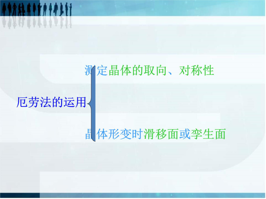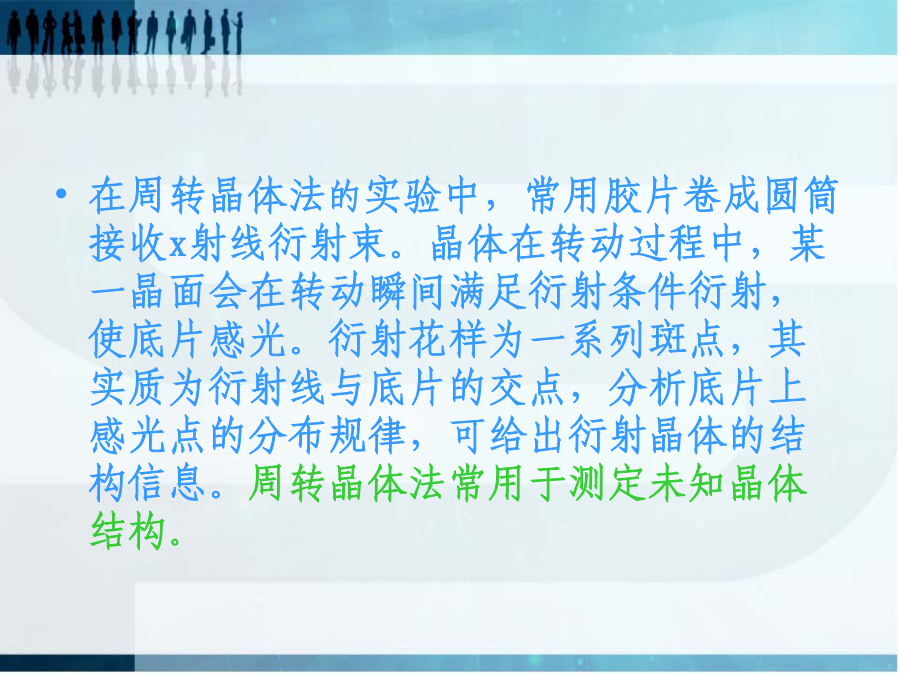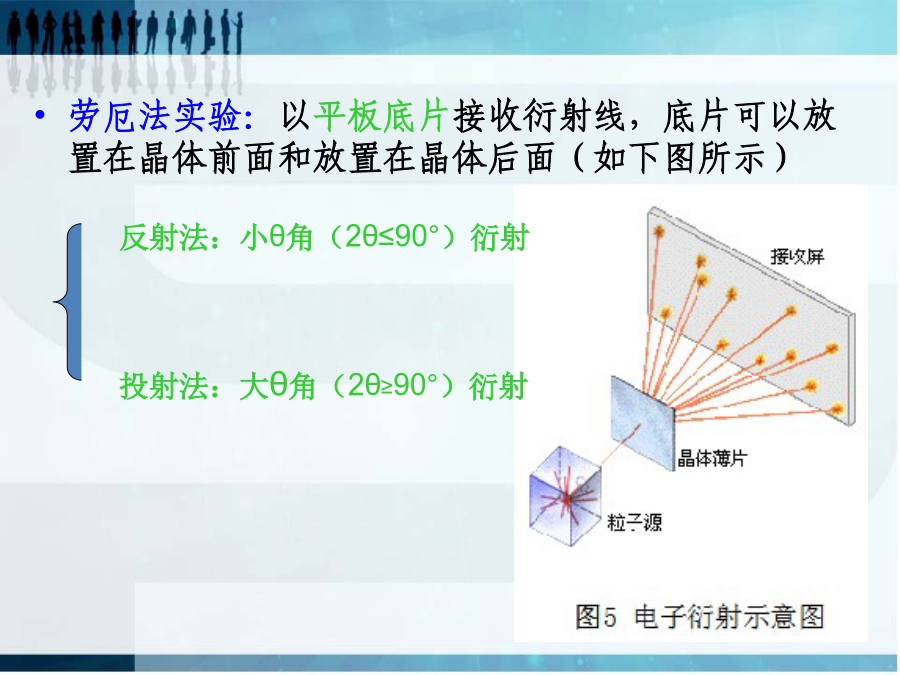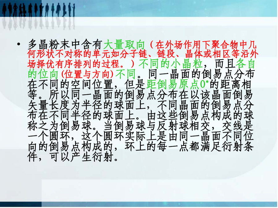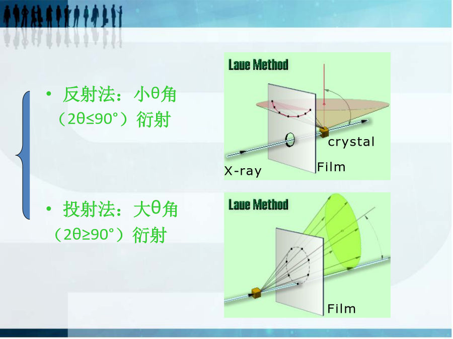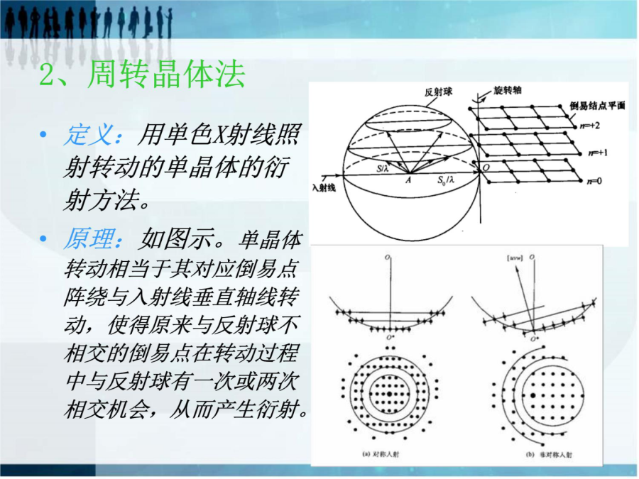1、劳厄法劳厄法实验:以平板底片接收衍射线,底片可以放置在晶体前面和放置在晶体后面(如下图所示)反射法:小θ角(2θ≤90°)衍射投射法:大θ角(2θ≥90°)衍射在周转晶体法的实验中,常用胶片卷成圆筒接收x射线衍射束。晶体在转动过程中,某一晶面会在转动瞬间满足衍射条件衍射,使底片感光。衍射花样为一系列斑点,其实质为衍射线与底片的交点,分析底片上感光点的分布规律,可给出衍射晶体的结构信息。周转晶体法常用于测定未知晶体结构。3、粉末多晶法多晶粉末中含有大量取向(在外场作用下聚合物中几何形状不对称的单元如分子链、链段、晶体或相区等沿外场择优有序排列的过程。)不同的小晶粒,而且各自的位向(位置与方向)不同。同一晶面的倒易点分布在不同的空间位置,但是距倒易原点O*的距离相等。所以同一晶面的倒易点分布在以该晶面倒易矢量长度为半径的球面上,不同晶面的倒易点分布在不同半径的球面上。由这些倒易点构成的球称之为倒易球。当倒易球与反射球相交,交线是一个圆环,这个圆环实际上是由同一晶面不同位向的倒易点构成的,环上的每一点都满足衍射条件,可以产生衍射。