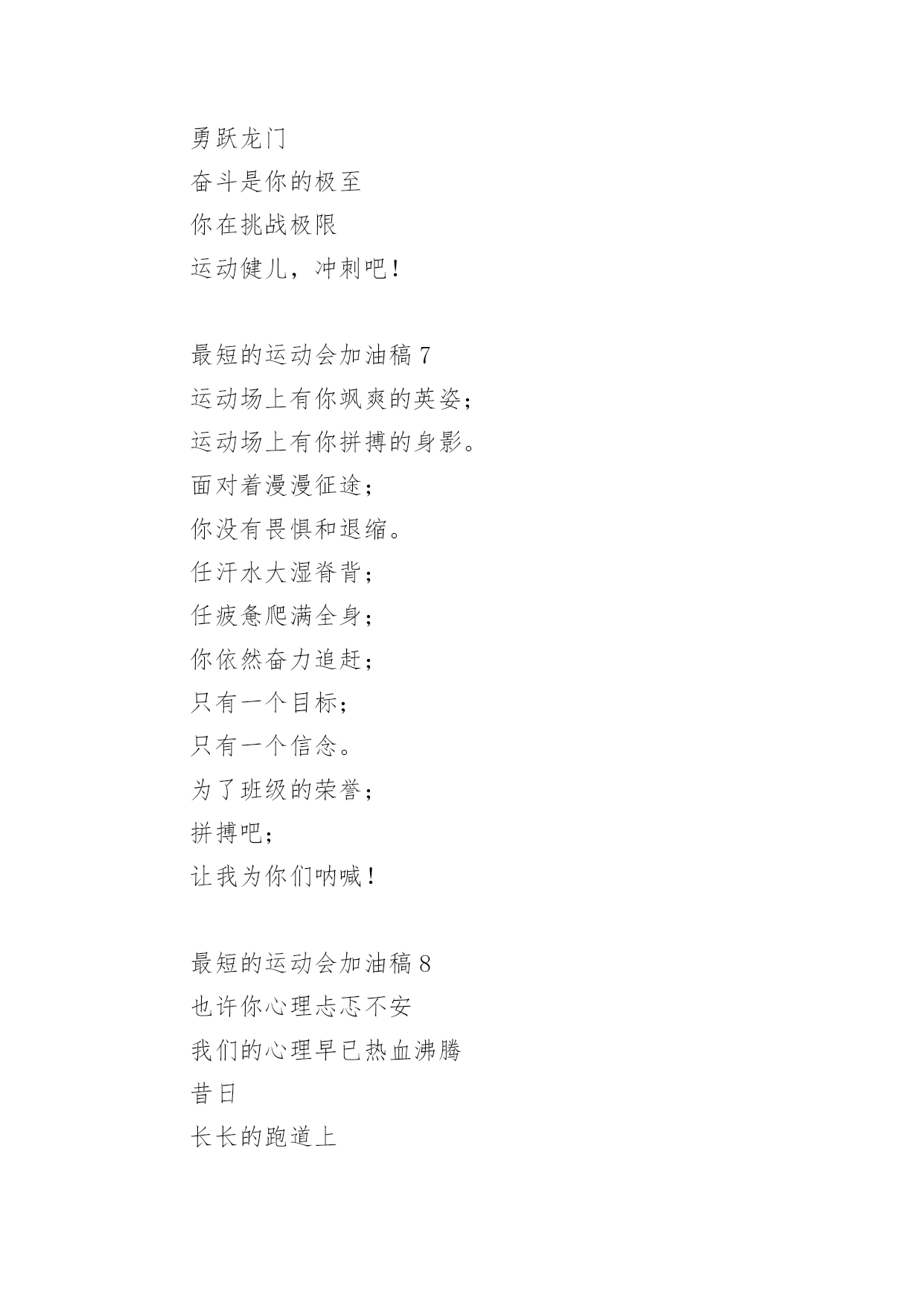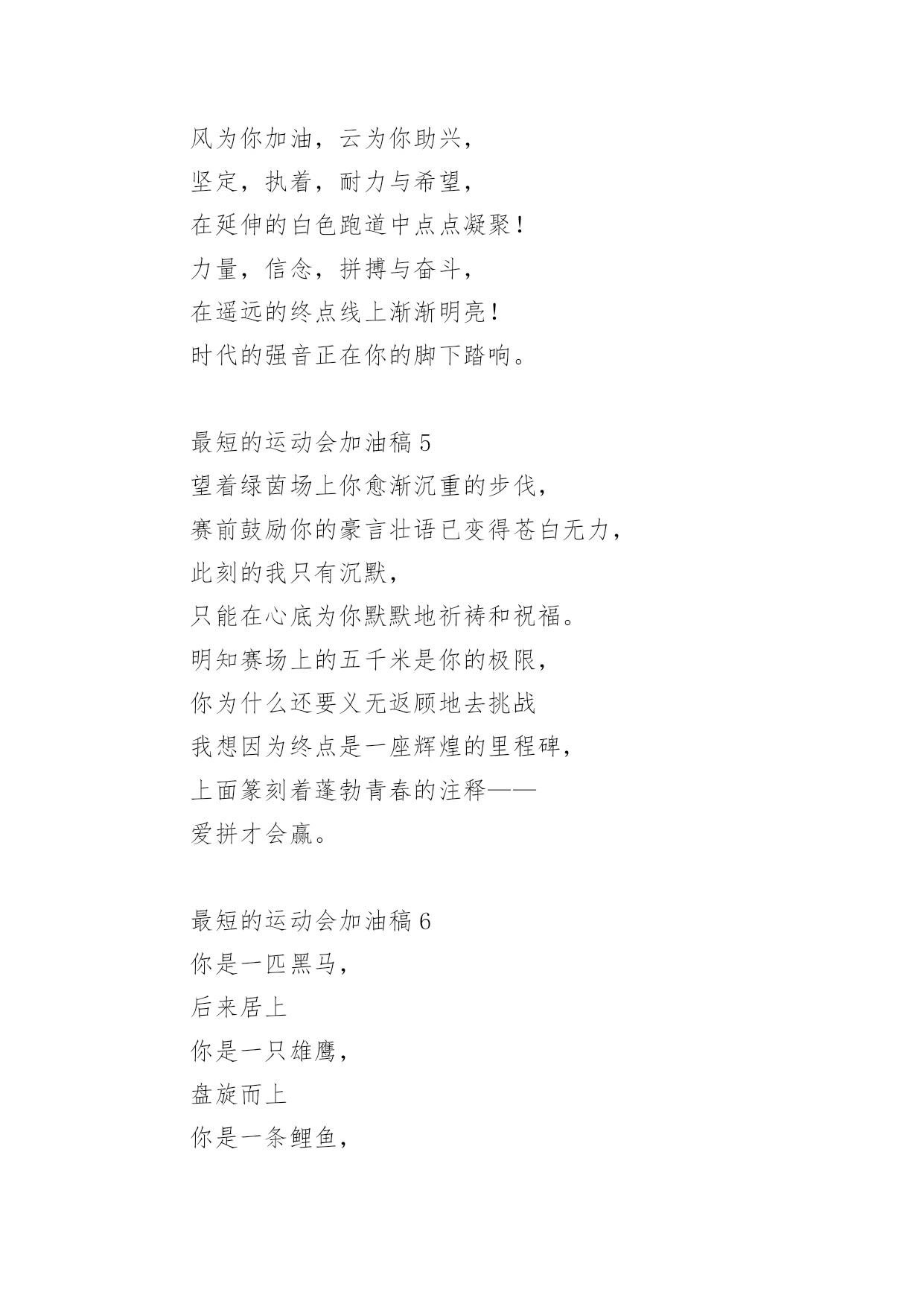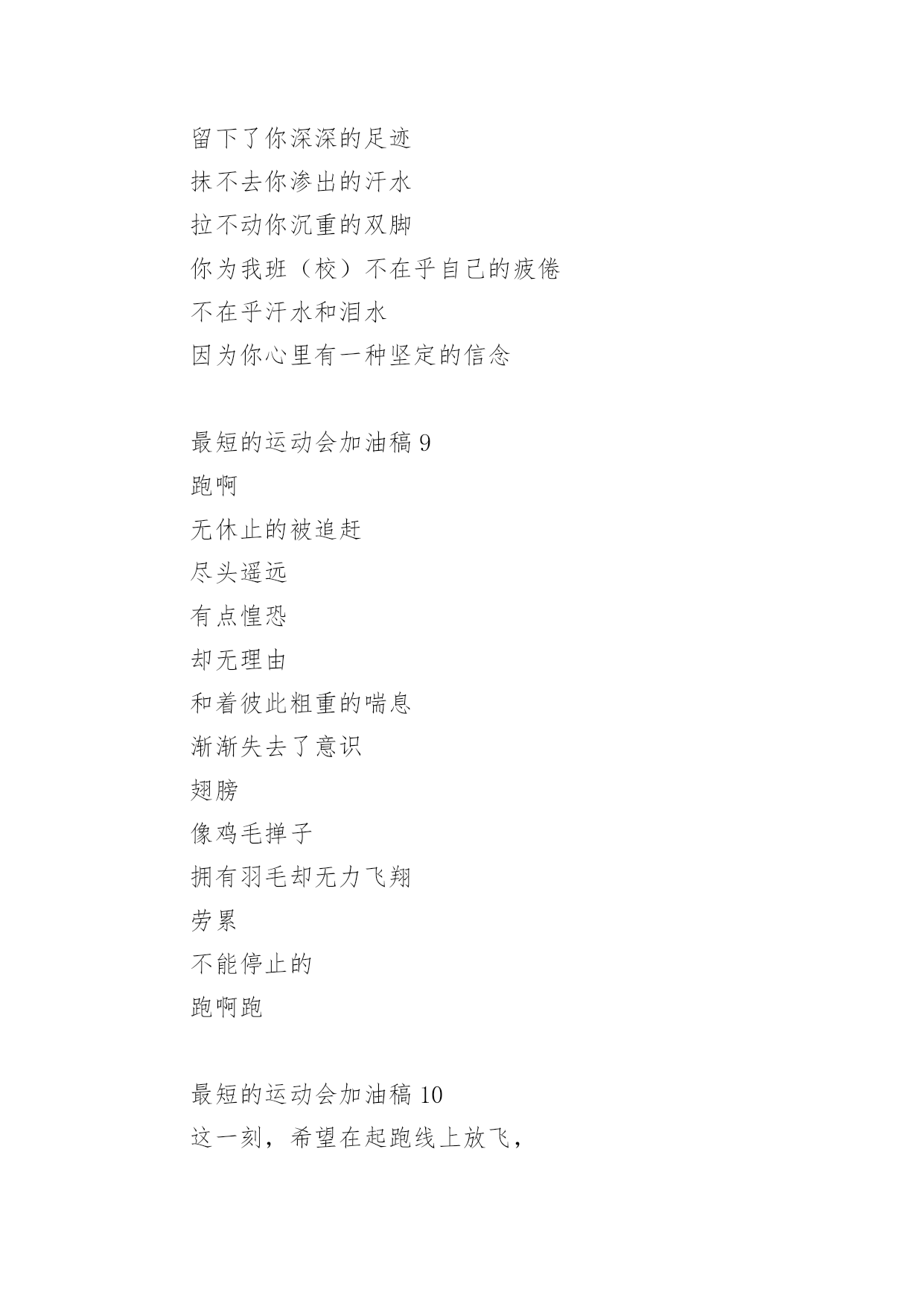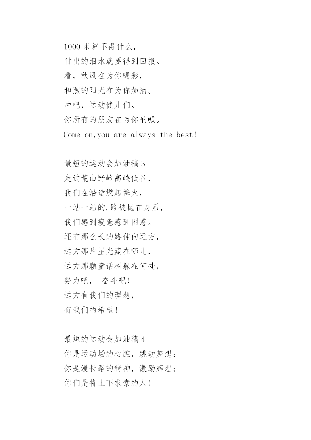 最短的运动会加油稿运动会加油稿一般短小精悍,既能鼓舞运动员,也能调动运动场上的气氛。以下是最短的运动会加油稿,欢迎阅读。最短的运动会加油稿1一滴滴汗水,飘洒在绿茵场上,伴随着矫健的步伐,奏出希望的乐章。一种种信念,放在蔚蓝的天空,伴随着你那深沉的眼光,画出美丽的弧线。人生能有几回搏?千百双眼睛注视着你,为了希望、为了胜利,跑出青春的梦想。最短的运动会加油稿2漫漫征途,加油吧!运动健儿们。不要畏惧对手的强大,你的对手只有你自己。1000米算不得什么,付出的泪水就要得到回报。看,秋风在为你喝彩,和煦的阳光在为你加油。冲吧,运动健儿们。你所有的朋友在为你呐喊。Comeon,youarealwaysthebest!最短的运动会加油稿3走过荒山野岭高峡低谷,我们在沿途燃起篝火,一站一站的.路被抛在身后,我们感到疲惫感到困惑。还有那么长的路伸向远方,远方那片星光藏在哪儿,远方那颗童话树躲在何处,努力吧,奋斗吧!远方有我们的理想,有我们的希望!最短的运动会加油稿4你是运动场的心脏,跳动梦想;你是漫长路的精神,激励辉煌;你们是将上下求索的人!风为你加油,云为你助兴,坚定,执着,耐力与希望,在延伸的白色跑道中点点凝聚!力量,信念,拼搏与奋斗,在遥远的终点线上渐渐明亮!时代的强音正在你的脚下踏响。最短的运动会加油稿5望着绿茵场上你愈渐沉重的步伐,赛前鼓励你的豪言壮语已变得苍白无力,此刻的我只有沉默,只能在心底为你默默地祈祷和祝福。明知赛场上的五千米是你的极限,你为什么还要义无返顾地去挑战我想因为终点是一座辉煌的里程碑,上面篆刻着蓬勃青春的注释——爱拼才会赢。最短的运动会加油稿6你是一匹黑马,后来居上你是一只雄鹰,盘旋而上你是一条鲤鱼,勇跃龙门奋斗是你的极至你在挑战极限运动健儿,冲刺吧!最短的运动会加油稿7运动场上有你飒爽的英姿;运动场上有你拼搏的身影。面对着漫漫征途;你没有畏惧和退缩。任汗水大湿脊背;任疲惫爬满全身;你依然奋力追赶;只有一个目标;只有一个信念。为了班级的荣誉;拼搏吧;让我为你们呐喊!最短的运动会加油稿8也许你心理忐忑不安我们的心理早已热血沸腾昔日长长的跑道上留下了你深深的足迹抹不去你渗出的汗水拉不动你沉重的双脚你为我班(校)不在乎自己的疲倦不在乎汗水和泪水因为你心里有一种坚定的信念最短的运动会加油稿9跑啊无休止的被追赶尽头遥远有点惶恐却无理由和着彼此粗重的喘息渐渐失去了意识翅膀像鸡毛掸子拥有羽毛却无力飞翔劳累不能停止的跑啊跑最短的运动会加油稿10这一刻,希望在起跑线上放飞,这一刻,时间在永恒中定格。那响起的枪声,是为你们助威的号角;看台上的呼声,是为你们呐喊的旌旗。勇敢地向着希望起飞吧!因为,梦,就在前方,就在前方!