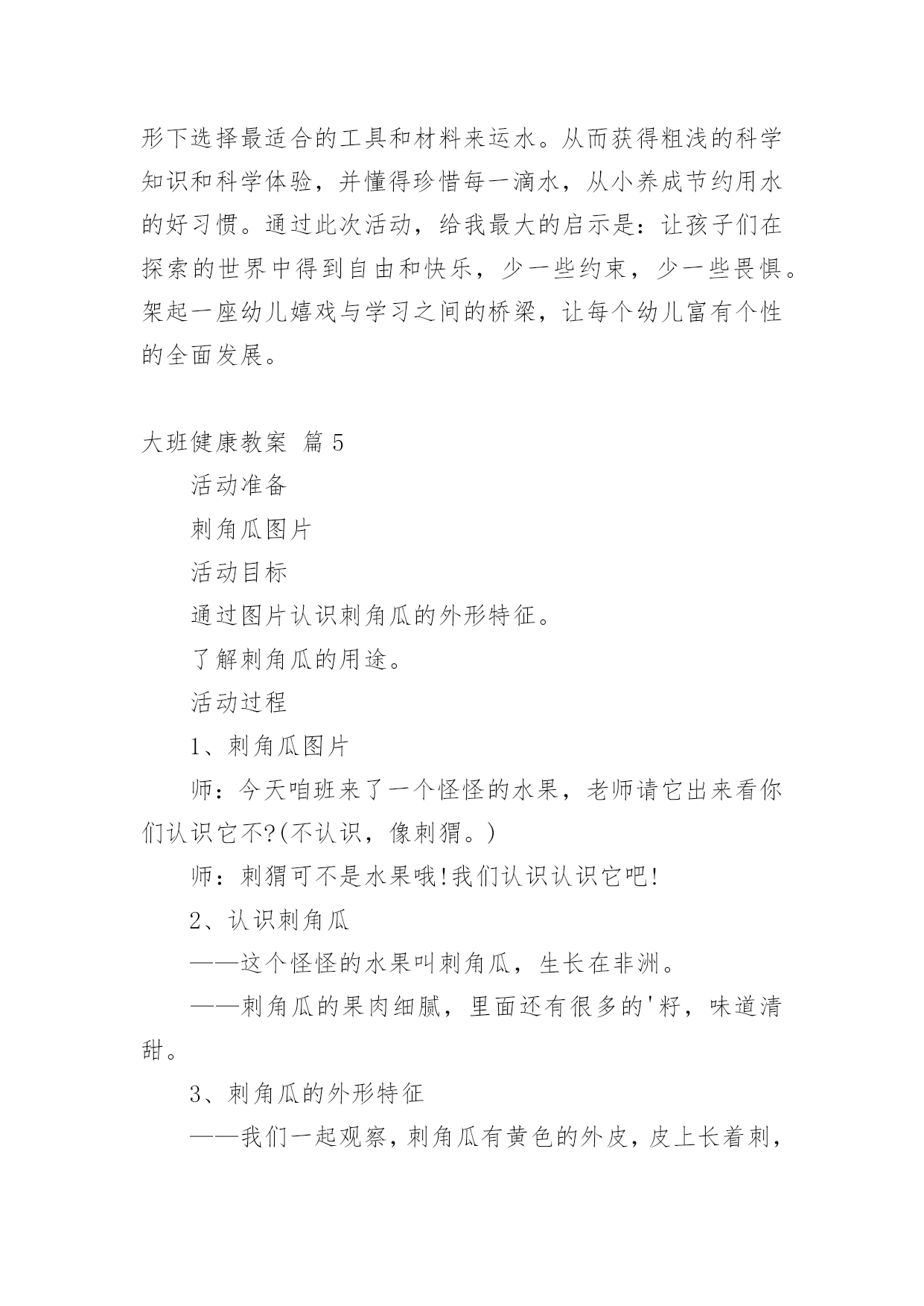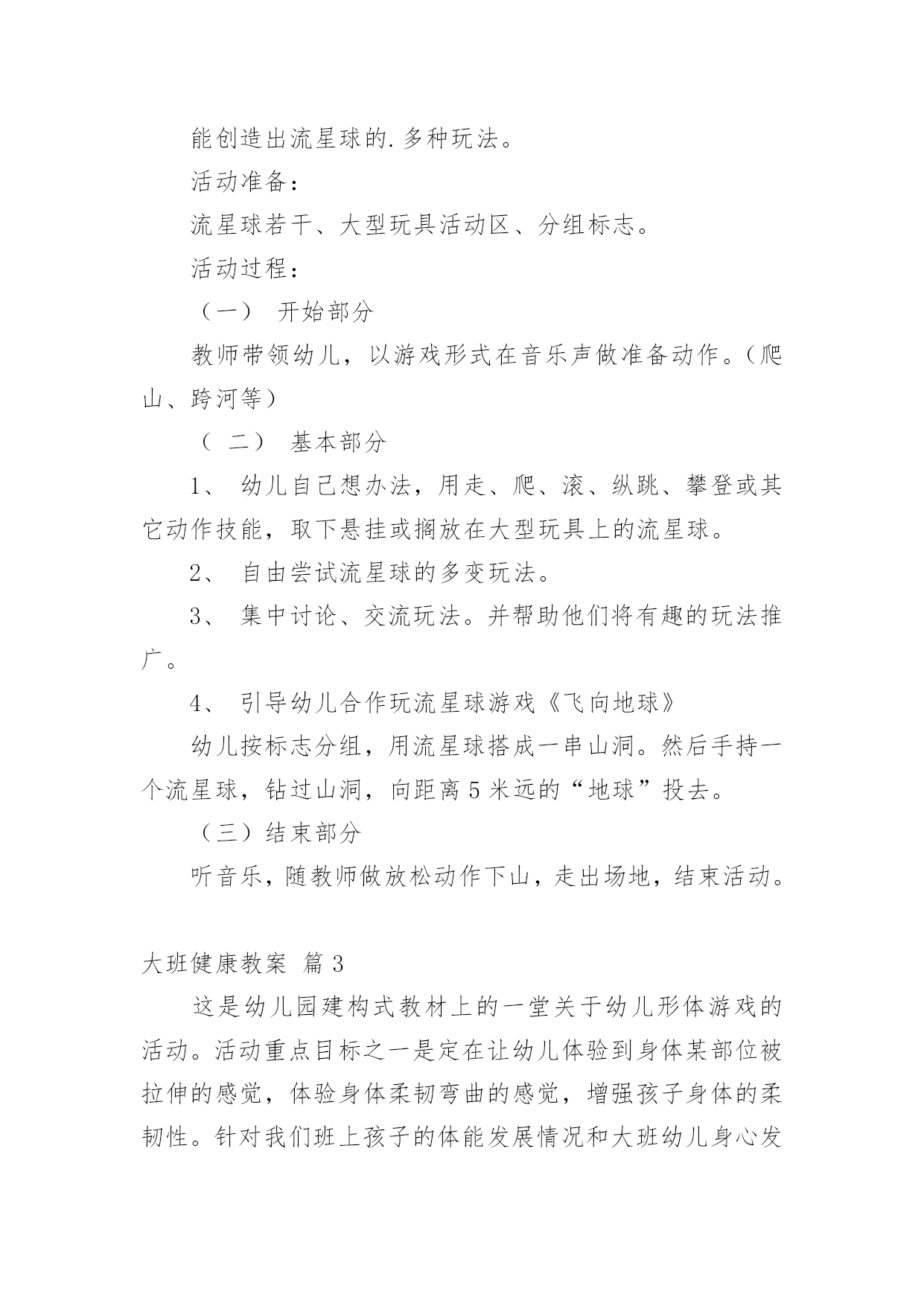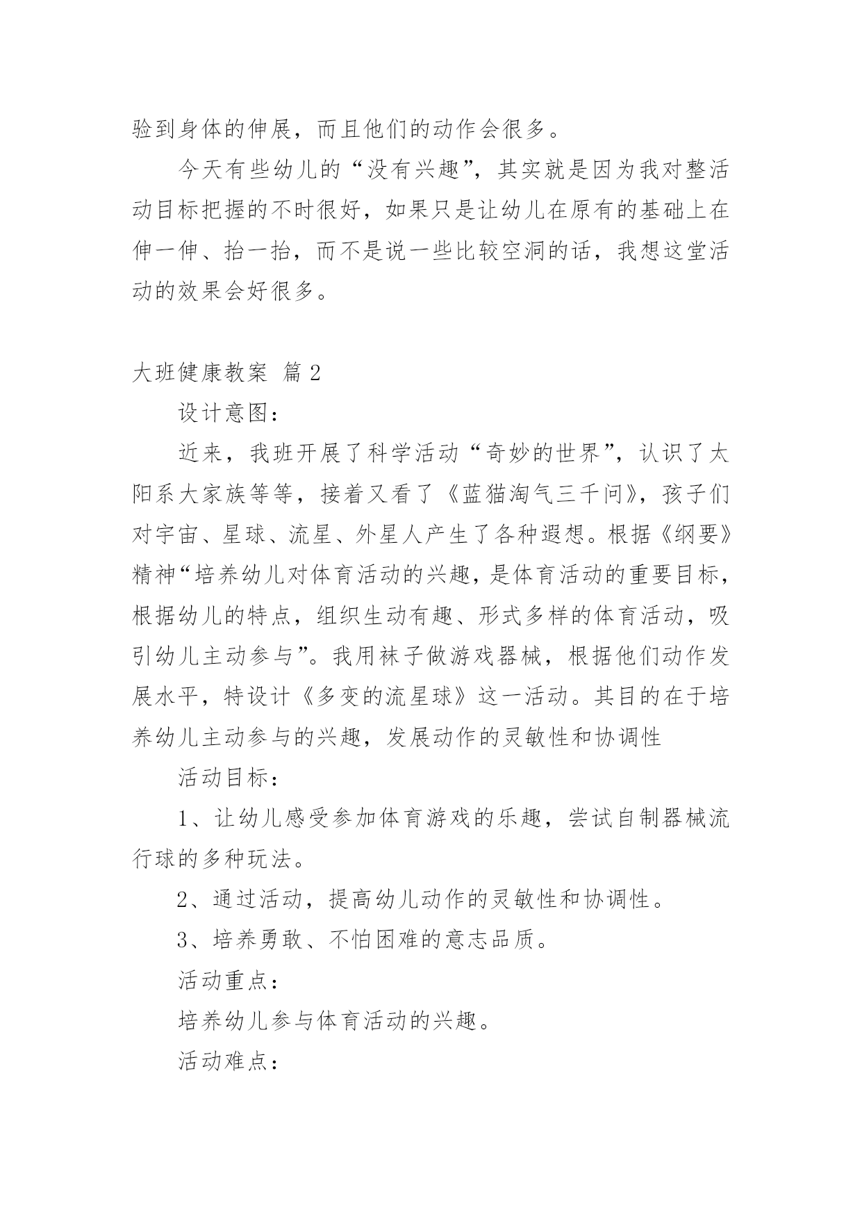 大班健康教案【热门】大班健康教案模板锦集5篇作为一名专为他人授业解惑的人民教师,时常需要编写教案,编写教案有利于我们科学、合理地支配课堂时间。来参考自己需要的教案吧!下面是小编帮大家整理的大班健康教案5篇,希望对大家有所帮助。大班健康教案篇1《我能够》是一堂关于幼儿形体活动的活动。在第一个环节“做做有趣的动作”,主要由我带领幼儿来做。我在前面示范,幼儿在后面照着做。在做的时候说说感受。因为我的目标之一是定在让幼儿尝试身体的各个部位的充分伸展,我开展活动时紧紧围绕柔韧性展开。我第一个动作:弯腰双手触地。幼儿们也纷纷学着我的样子弯下腰来。等我去检查时,发现有一部分幼儿在双手触地的同时,膝盖微微歪曲。所以,我请一个动作规范的幼儿示范并指出有些幼儿做得不到位的地方。接下来就是侧弯腰的动作。在这一过程中,我虽然极力引导幼儿充分的伸展,想让幼儿体验到身体某部位被拉伸的感觉,但是效果没有我预期中的那么好。归结原因:1、活动前没有考虑好活动的队形,队伍拉得太长,后面的幼儿听不清楚,外加本身有个别幼儿对此活动的兴趣不高,所以后面的秩序不是很好,有些幼儿只是在做动作,但是没有做到伸展身体某一部分的要求。2、有些幼儿的表述干扰了活动的有效进行,比如龙龙在做弯腰双手触地的这个动作时,由于脚崩的很直,所以当手触地时,双腿都在抖,可当我问及你的身体有什么感受?他说没有。我在进一步问,你的腿怎么了?有什么感受?他还说没有?有可能是因为该幼儿想显示自己的韧带很好,不愿承认已经酸了,也有可能就是故意这样说,因为下面已经有孩子这样说了,他觉得很有意思,总之,孩子们的这个表现,影响了我让幼儿具体体验身体感受的程度和兴趣。在第二个环节孩子们尝试做柔韧性动作中,有些幼儿的.动作还是比较好的,在总结的时候我让他们到前面来做一做。在这个过程中我没让下面的孩子一起来做一做,进而再让他们相互比较发现个体间在动作方面的差异性,这是我这个活动中最大的疏忽。这些都是我在开展活动各个环节的时候心里的具体体验及当时内心的反思。活动结束后,我再次重新反思,觉得本次活动我的目标定位不是很准确,让幼儿尝试身体的各个部位的充分伸展是不是就是通过做柔韧性动作达到,固然做了柔韧性动作身体肯定能达到伸展,但是反过来却不一定,我把幼儿可以做的动作框小了,甚至说要求高了。其实对于幼儿来说只要能让身体各部分伸展就行,比如说,幼儿本来手可以伸这么高,现在在伸高一点,本来你可以这么样,现在在进一步,试试看,只要这样,幼儿就能体验到身体的伸展,而且他们的动作会很多。今天有些幼儿的“没有兴趣”,其实就是因为我对整活动目标把握的不时很好,如果只是让幼儿在原有的基础上在伸一伸、抬一抬,而不是说一些比较空洞的话,我想这堂活动的效果会好很多。大班健康教案篇2设计意图:近来,我班开展了科学活动“奇妙的世界”,认识了太阳系大家族等等,接着又看了《蓝猫淘气三千问》,孩子们对宇宙、星球、流星、外星人产生了各种遐想。根据《纲要》精神“培养幼儿对体育活动的兴趣,是体育活动的重要目标,根据幼儿的特点,组织生动有趣、形式多样的体育活动,吸引幼儿主动参与”。我用袜子做游戏器械,根据他们动作发展水平,特设计《多变的流星球》这一活动。其目的在于培养幼儿主动参与的兴趣,发展动作的灵敏性和协调性活动目标:1、让幼儿感受参加体育游戏的乐趣,尝试自制器械流行球的多种玩法。2、通过活动,提高幼儿动作的灵敏性和协调性。3、培养勇敢、不怕困难的意志品质。活动重点:培养幼儿参与体育活动的兴趣。活动难点:能创造出流星球的.多种玩法。活动准备:流星球若干、大型玩具活动区、分组标志。活动过程:(一)开始部分教师带领幼儿,以游戏形式在音乐声做准备动作。(爬山、跨河等)(二)基本部分1、幼儿自己想办法,用走、爬、滚、纵跳、攀登或其它动作技能,取下悬挂或搁放在大型玩具上的流星球。2、自由尝试流星球的多变玩法。3、集中讨论、交流玩法。并帮助他们将有趣的玩法推广。4、引导幼儿合作玩流星球游戏《飞向地球》幼儿按标志分组,用流星球搭成一串山洞。然后手持一个流星球,钻过山洞,向距离5米远的“地球”投去。(三)结束部分听音乐,随教师做放松动作下山,走出场地,结束活动。大班健康教案篇3这是幼儿园建构式教材上的一堂关于幼儿形体游戏的活动。活动重点目标之一是定在让幼儿体验到身体某部位被拉伸的感觉,体验身体柔韧弯曲的感觉,增强孩子身体的柔韧性。针对我们班上孩子的体能发展情况和大班幼儿身心发展的特点,我在此大主题的基础上,在活动内容上做了相对的调整和创新。一、针对性强对于身体的延伸,孩子们的理解往往比较宽泛,因为从头至尾的身体拉伸举不胜举。而在有限的课堂中,怎么样达到一定的教学效果,达到一定的运动量,达到一定的健康保健知识,是一项值得思索的问题。于是,我把今天课的内容定位于“学习前滚翻”