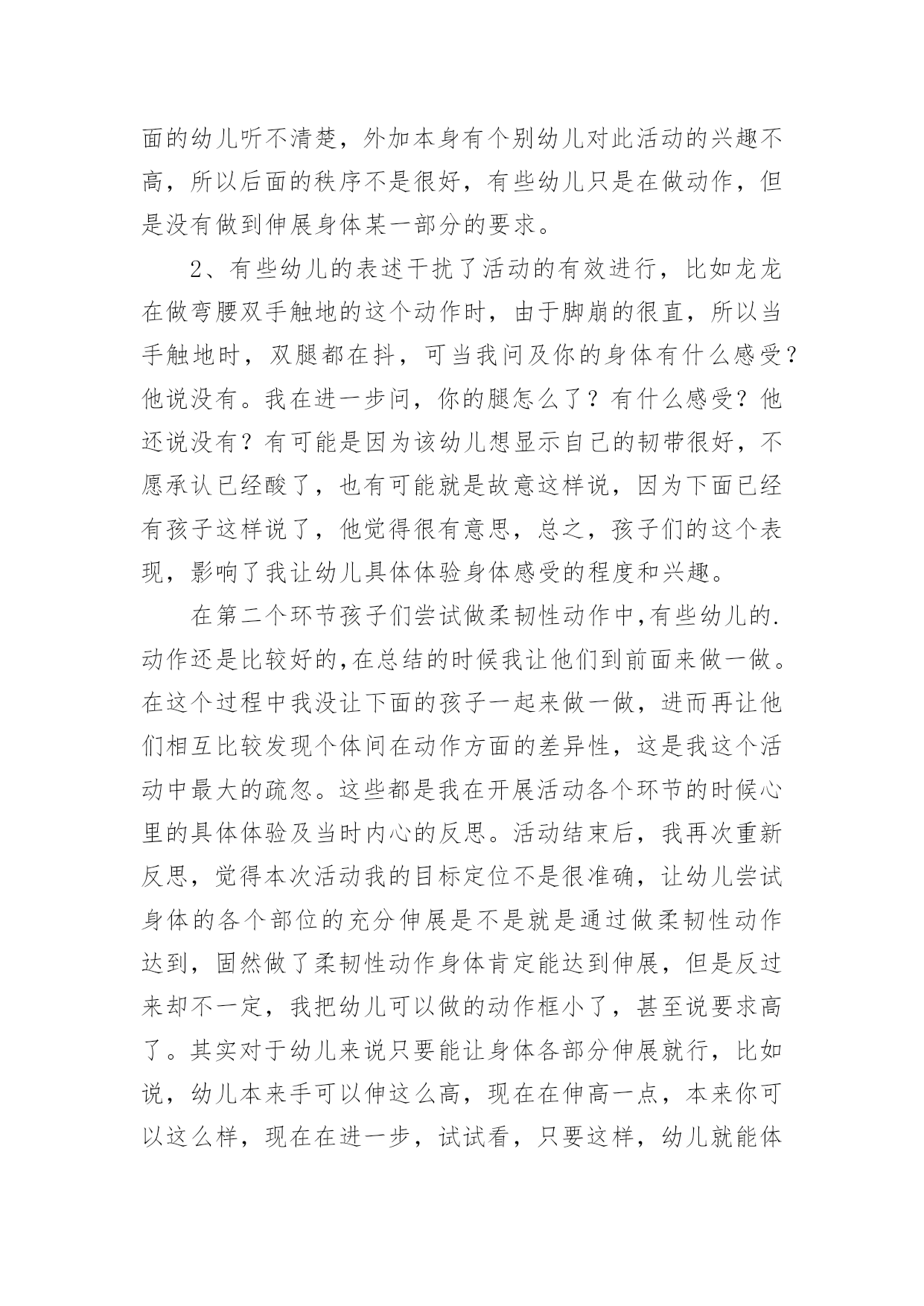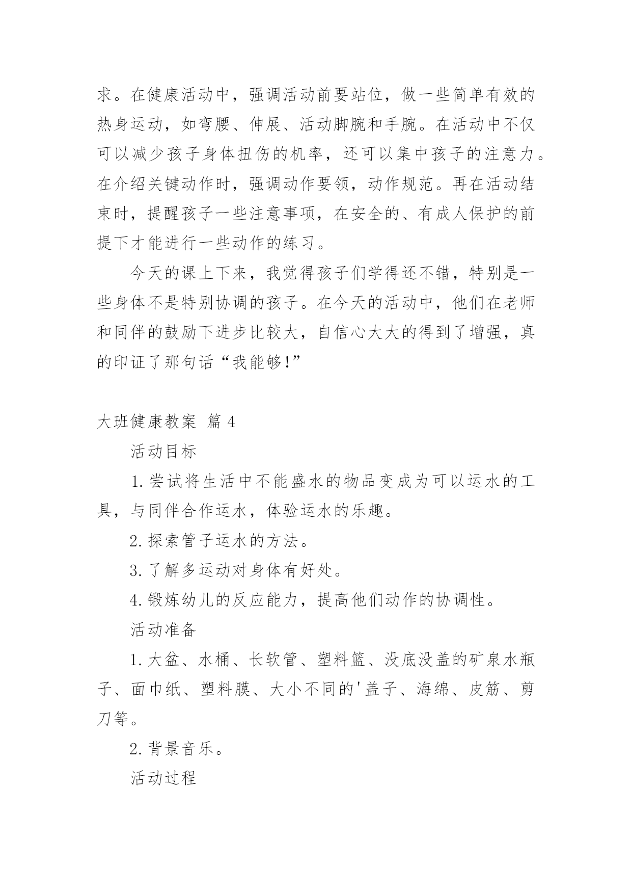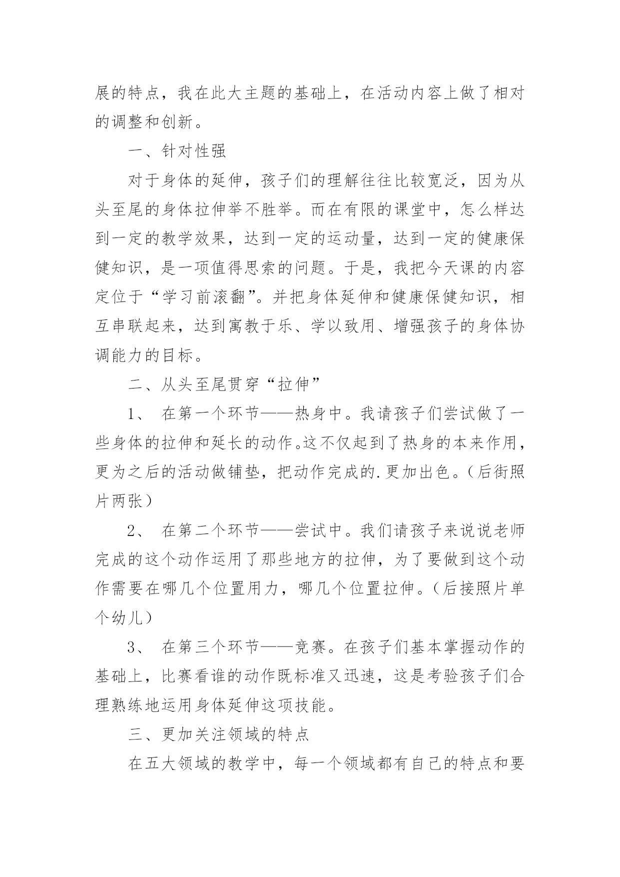 大班健康教案【热门】大班健康教案模板锦集5篇作为一名专为他人授业解惑的人民教师,时常需要编写教案,编写教案有利于我们科学、合理地支配课堂时间。来参考自己需要的教案吧!下面是小编帮大家整理的大班健康教案5篇,希望对大家有所帮助。大班健康教案篇1《我能够》是一堂关于幼儿形体活动的活动。在第一个环节“做做有趣的动作”,主要由我带领幼儿来做。我在前面示范,幼儿在后面照着做。在做的时候说说感受。因为我的目标之一是定在让幼儿尝试身体的各个部位的充分伸展,我开展活动时紧紧围绕柔韧性展开。我第一个动作:弯腰双手触地。幼儿们也纷纷学着我的样子弯下腰来。等我去检查时,发现有一部分幼儿在双手触地的同时,膝盖微微歪曲。所以,我请一个动作规范的幼儿示范并指出有些幼儿做得不到位的地方。接下来就是侧弯腰的动作。在这一过程中,我虽然极力引导幼儿充分的伸展,想让幼儿体验到身体某部位被拉伸的感觉,但是效果没有我预期中的那么好。归结原因:1、活动前没有考虑好活动的队形,队伍拉得太长,后面的幼儿听不清楚,外加本身有个别幼儿对此活动的兴趣不高,所以后面的秩序不是很好,有些幼儿只是在做动作,但是没有做到伸展身体某一部分的要求。2、有些幼儿的表述干扰了活动的有效进行,比如龙龙在做弯腰双手触地的这个动作时,由于脚崩的很直,所以当手触地时,双腿都在抖,可当我问及你的身体有什么感受?他说没有。我在进一步问,你的腿怎么了?有什么感受?他还说没有?有可能是因为该幼儿想显示自己的韧带很好,不愿承认已经酸了,也有可能就是故意这样说,因为下面已经有孩子这样说了,他觉得很有意思,总之,孩子们的这个表现,影响了我让幼儿具体体验身体感受的程度和兴趣。在第二个环节孩子们尝试做柔韧性动作中,有些幼儿的.动作还是比较好的,在总结的时候我让他们到前面来做一做。在这个过程中我没让下面的孩子一起来做一做,进而再让他们相互比较发现个体间在动作方面的差异性,这是我这个活动中最大的疏忽。这些都是我在开展活动各个环节的时候心里的具体体验及当时内心的反思。活动结束后,我再次重新反思,觉得本次活动我的目标定位不是很准确,让幼儿尝试身体的各个部位的充分伸展是不是就是通过做柔韧性动作达到,固然做了柔韧性动作身体肯定能达到伸展,但是反过来却不一定,我把幼儿可以做的动作框小了,甚至说要求高了。其实对于幼儿来说只要能让身体各部分伸展就行,比如说,幼儿本来手可以伸这么高,现在在伸高一点,本来你可以这么样,现在在进一步,试试看,只要这样,幼儿就能体验到身体的伸展,而且他们的动作会很多。今天有些幼儿的“没有兴趣”,其实就是因为我对整活动目标把握的不时很好,如果只是让幼儿在原有的基础上在伸一伸、抬一抬,而不是说一些比较空洞的话,我想这堂活动的效果会好很多。大班健康教案篇2设计意图:近来,我班开展了科学活动“奇妙的世界”,认识了太阳系大家族等等,接着又看了《蓝猫淘气三千问》,孩子们对宇宙、星球、流星、外星人产生了各种遐想。根据《纲要》精神“培养幼儿对体育活动的兴趣,是体育活动的重要目标,根据幼儿的特点,组织生动有趣、形式多样的体育活动,吸引幼儿主动参与”。我用袜子做游戏器械,根据他们动作发展水平,特设计《多变的流星球》这一活动。其目的在于培养幼儿主动参与的兴趣,发展动作的灵敏性和协调性活动目标:1、让幼儿感受参加体育游戏的乐趣,尝试自制器械流行球的多种玩法。2、通过活动,提高幼儿动作的灵敏性和协调性。3、培养勇敢、不怕困难的意志品质。活动重点:培养幼儿参与体育活动的兴趣。活动难点:能创造出流星球的.多种玩法。活动准备:流星球若干、大型玩具活动区、分组标志。活动过程:(一)开始部分教师带领幼儿,以游戏形式在音乐声做准备动作。(爬山、跨河等)(二)基本部分1、幼儿自己想办法,用走、爬、滚、纵跳、攀登或其它动作技能,取下悬挂或搁放在大型玩具上的流星球。2、自由尝试流星球的多变玩法。3、集中讨论、交流玩法。并帮助他们将有趣的玩法推广。4、引导幼儿合作玩流星球游戏《飞向地球》幼儿按标志分组,用流星球搭成一串山洞。然后手持一个流星球,钻过山洞,向距离5米远的“地球”投去。(三)结束部分听音乐,随教师做放松动作下山,走出场地,结束活动。大班健康教案篇3这是幼儿园建构式教材上的一堂关于幼儿形体游戏的活动。活动重点目标之一是定在让幼儿体验到身体某部位被拉伸的感觉,体验身体柔韧弯曲的感觉,增强孩子身体的柔韧性。针对我们班上孩子的体能发展情况和大班幼儿身心发展的特点,我在此大主题的基础上,在活动内容上做了相对的调整和创新。一、针对性强对于身体的延伸,孩子们的理解往往比较宽泛,因为从头至尾的身体拉伸举不胜举。而在有限的课堂中,怎么样达到一定的教学效果,达到一定的运动量,达到一定的健康保健知识,是一项值得思索的问题。于是,我把今天课的内容定位于“学习前滚翻”