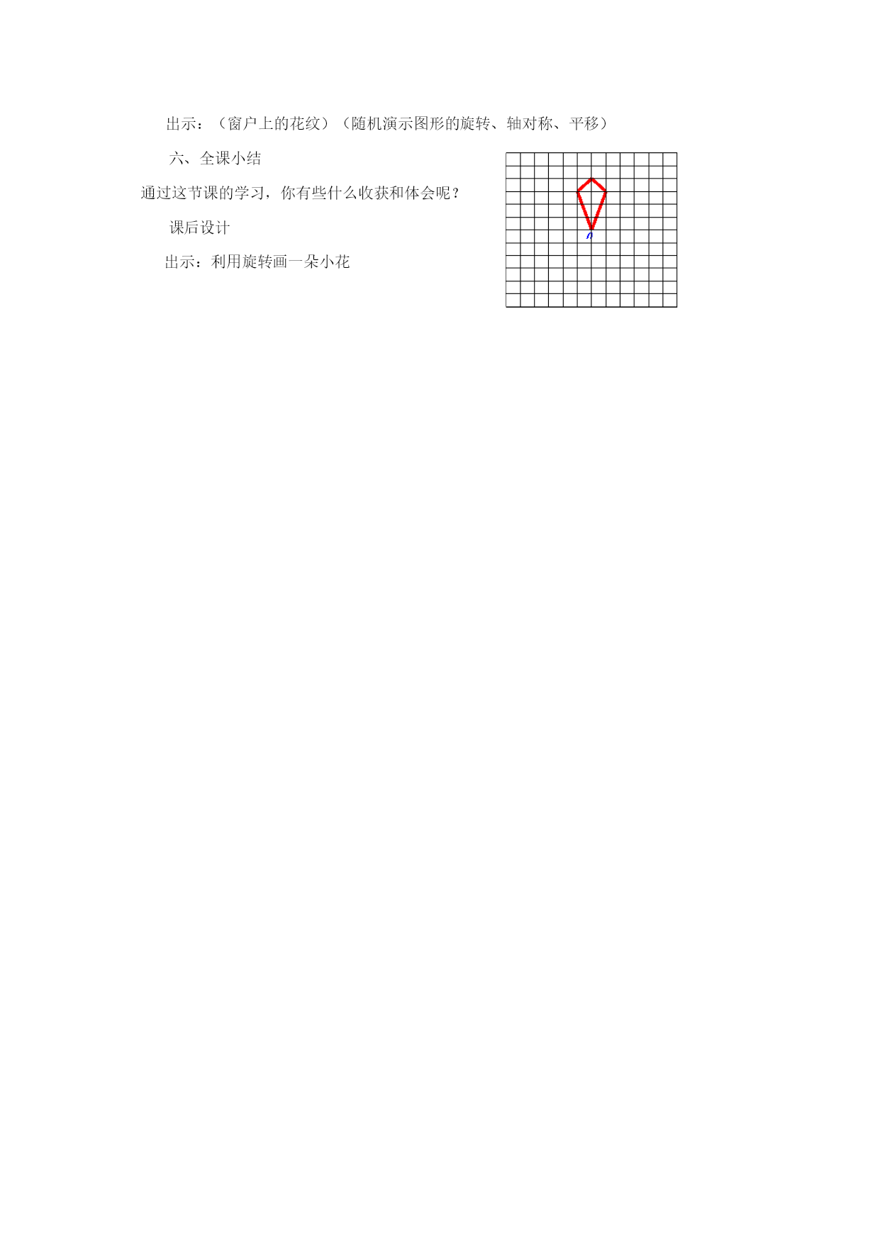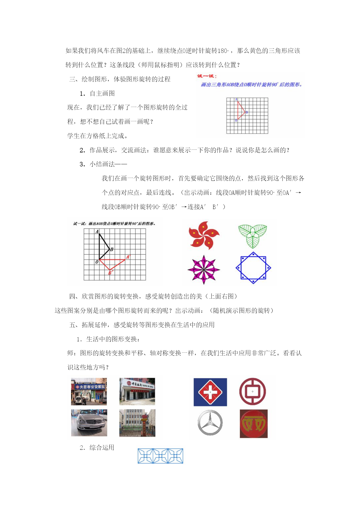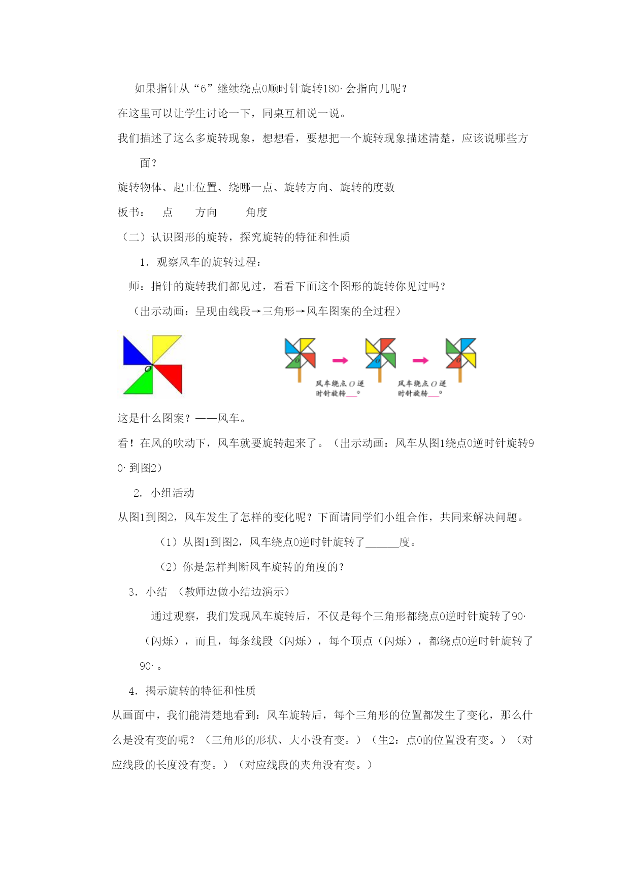 图形的变换—旋转http://www.lctvs.cn:8080/blog/u/gyp123/archives/2007/1617.html一、教学目标:1.进一步认识图形的旋转变换,探索它的特征和性质。2.能在方格纸上将简单的图形旋转90。。3.初步学会运用旋转的方法在方格纸上设计图案,发展学生的空间观念。4.欣赏图形的旋转变换所创造出的美,培养学生的审美能力;感受旋转在生活中的应用,体会数学的价值。二、教材分析:教学重点:1.理解图形旋转变换的含义。2.探索图形旋转的特征和性质。教学难点:探索图形旋转的特征和性质。三、教学过程:一、创设游戏情境,引入新课1.揭示课题(用FLASH课件制作一些漂亮的图案。)刚才,我们在制作图案的过程中,大家看到了“旋转”。这节课,我们就来研究“旋转”。板书课题。2.联系生活——生活中,你还见过哪些旋转现象?(出示动画:几种旋转现象)师:生活中像这样的旋转现象很多,我们就从与我们关系最密切地钟表开始研究吧!二、认识图形的旋转,探索图形旋转的特征与性质(一)认识线段的旋转,理解旋转的含义观察、描述旋转现象出示:钟表(1).请同学们仔细观察指针的旋转过程。出示动画:(指针从12指向1)(2).谁能用一句话完整地描述一下刚才的这个旋转过程?(教师引导学生叙述完整)如果指针从“6”继续绕点O顺时针旋转180。会指向几呢?在这里可以让学生讨论一下,同桌互相说一说。我们描述了这么多旋转现象,想想看,要想把一个旋转现象描述清楚,应该说哪些方面?旋转物体、起止位置、绕哪一点、旋转方向、旋转的度数板书:点方向角度(二)认识图形的旋转,探究旋转的特征和性质1.观察风车的旋转过程:师:指针的旋转我们都见过,看看下面这个图形的旋转你见过吗?(出示动画:呈现由线段→三角形→风车图案的全过程)这是什么图案?——风车。看!在风的吹动下,风车就要旋转起来了。(出示动画:风车从图1绕点O逆时针旋转90。到图2)2.小组活动从图1到图2,风车发生了怎样的变化呢?下面请同学们小组合作,共同来解决问题。(1)从图1到图2,风车绕点O逆时针旋转了___度。(2)你是怎样判断风车旋转的角度的?3.小结(教师边做小结边演示)通过观察,我们发现风车旋转后,不仅是每个三角形都绕点O逆时针旋转了90。(闪烁),而且,每条线段(闪烁),每个顶点(闪烁),都绕点O逆时针旋转了90。。4.揭示旋转的特征和性质从画面中,我们能清楚地看到:风车旋转后,每个三角形的位置都发生了变化,那么什么是没有变的呢?(三角形的形状、大小没有变。)(生2:点O的位置没有变。)(对应线段的长度没有变。)(对应线段的夹角没有变。)如果我们将风车在图2的基础上,继续绕点O逆时针旋转180。,那么黄色的三角形应该转到什么位置?这条线段(师用鼠标指明)应该转到什么位置?三、绘制图形,体验图形旋转的过程1.自主画图现在,我们已经了解了一个图形旋转的全过程,想不想自己试着画一画呢?学生在方格纸上完成。2.作品展示,交流画法:谁愿意来展示一下你的作品?说说你是怎么画的?3.小结画法——我们在画一个旋转图形时,首先要确定它围绕的点,然后找到这个图形各个点的对应点,最后连线。(出示动画:线段OA顺时针旋转90。至OA′→线段OB顺时针旋转90。至OB′→连接A′B′)四、欣赏图形的旋转变换,感受旋转创造出的美(上面右图)这些图案分别是由哪个图形旋转而来的呢?出示动画:(随机演示图形的旋转)五、拓展延伸,感受旋转等图形变换在生活中的应用1.生活中的图形变换:师:图形的旋转变换和平移、轴对称变换一样,在我们生活中应用非常广泛。看看认识这些地方吗?2.综合运用出示:(窗户上的花纹)(随机演示图形的旋转、轴对称、平移)六、全课小结通过这节课的学习,你有些什么收获和体会呢?课后设计出示:利用旋转画一朵小花