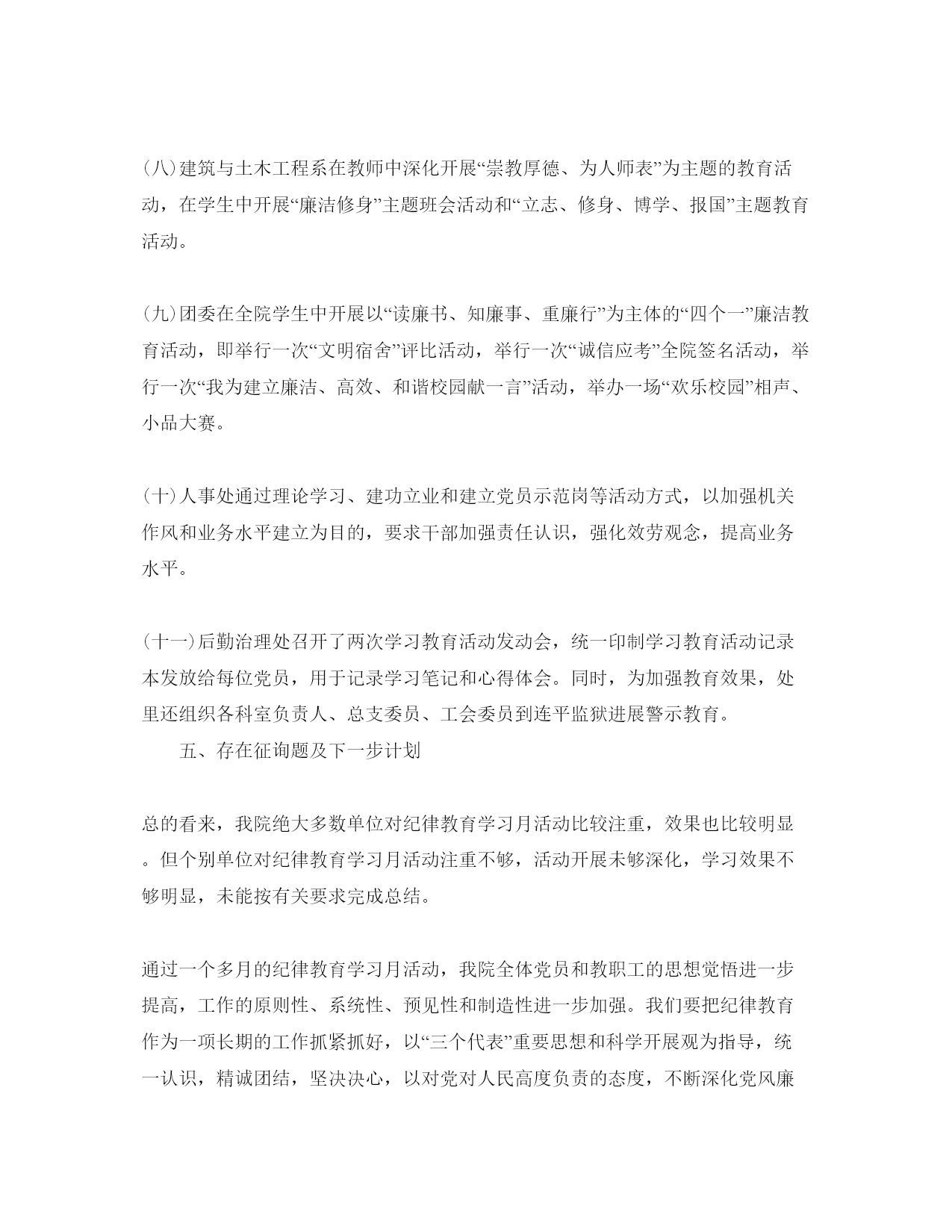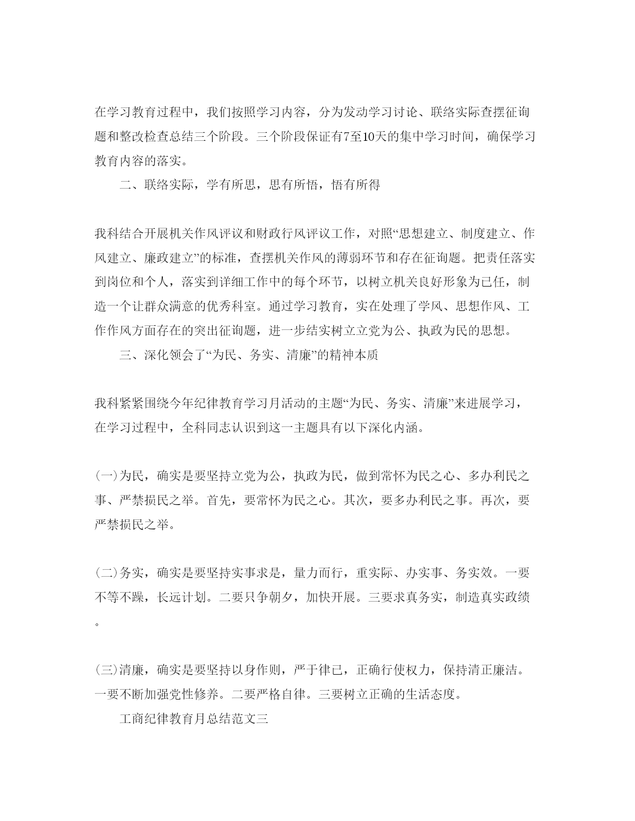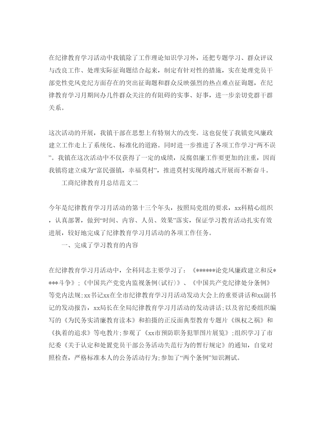 2021年工商纪律教育月参考总结工商纪律教育月总结范文一自从活动开展以来,邓小平理论和“三个代表”重要思想为指导,深化贯彻落实开展观和党的xx大和十七届五中全会精神,以“以人为本、执政为民”为主题,加强对党员干部的反腐倡廉教育。实在抓好公务员队伍和企事业单位领导成员的廉洁教育。这成为我镇坚持的主要思想,通过这次学习,对提高党员的思想觉悟有特别大的协助,下面就对我镇纪律教育学习月活动总结如下:一、精心组织纪律教育学习月活动为抓好纪律教育活动组织,我镇党委把纪律教育学习月活动列入重要议事日程,制定一系列措施,确保教育活动落到实处:一、成立领导小组,由镇委书记任组长,分管党风廉政工作的领导担任副组长,成员由各部门人员、村(居)支书主任组成,确保工作落到实处。各村(居)委会也成立了工作小组,构成一级抓一级,层层抓落实的组织机制。二、精心制定方案,结合我镇实际,制定《莫村镇关于2011年开展纪律教育学习活动月施行意见》,科学安排、缜密部署我镇党员干部学习纪律教育学习月活动内容和学习时间,为教育活动实效奠定了根底。三、划定教育范围,我镇纪律教育学习月活动教育对象是全镇党员干部,对教育对象还作了分类教育,对党员干部开展以制度为重点的党性党纪教育,对公职人员开展廉政教育,对全社会开展廉洁教育。我镇侧重地抓了领导班子成员的纪律教育,以此带动全镇纪律教育自上而下铺开。四、抓好催促检查,为防止教育活动流于和走过场,我镇对教育活动进展检查和催促,要求总结汇报在学习中遇到征询题和好经历,写好学习心得体会,保证了教育活动落到实处。二、做好学习培训(一)开好发动会。8月9日我镇举行纪律教育学习月发动大会,镇府全体干部职工,及各村(居)委会支书主任共100多人参加了会议,会议学习了文件精神并对教育活动作了部署,部署学习:胡xx同志在十七届中央纪委六次全会和纪念建党90周年大会上的重要讲话,温xx同志在国务院第四次廉政工作会议上的讲话,贺国强同志在十七届中央纪委六次全会上的工作报告;中央纪委、中央组织部、中央宣传部《关于加强领导干部反腐倡廉教育的意见》;汪洋同志在省纪委十届五次全会上的讲话,黄华华同志在x政府第四次廉政工作会议上的讲话,xxx同志在省纪委十届五次全会上的工作报告;市纪委十届六次全会精神;县纪委十一届六次全会精神;《中国共产党党员领导干部廉洁从政假设干准则》、《〈中国共产党党员领导干部廉洁从政假设干准则〉施行方法》、《关于实行党风廉政建立责任制的规定》等党内法规;正面典型先进事迹和反面典型案例剖析等。学习月活动内容要求以党支部、各办公室、工、青、妇等部门和单位为学习基地,使整个纪律教育活动认识到位,责任到人,会后,各部门单位、村(居)委会迅速传达,据统计,我镇各党支部发动大会30多场次,参加人员达500多人。(二)组织学习中央、省、市、县全会精神和各项反腐倡廉制度。8月20日—8月25日,我镇班子领导和党员干部(1)结合纪念建党90周年开展理想信念教育。以纪念建党90周年系列教育活动为契机,组织广大党员干部认真学习党的理论、党的知识、党的历史,开展中国特色社会主义理论体系和社会主义核心价值体系教育,引导党员干部结实树立正确的世界观、人生观和价值观,不断保持对马克思主义的坚决信仰,结实树立中国特色社会主义的坚决信念。(2)结合“大调研大讨论”活动开展党的主旨教育。组织党员干部深化学习科学开展观,坚持以人为本,牢记全心全意为人民效劳的主旨,树立正确的群众观和权力观,进一步加强主旨认识、责任认识、公仆认识和效劳认识,坚持实事求是,亲切联络群众,把实现好、维护好、开展好最广大人民群众根本利益作为一切工作的出发点和落脚点,自觉实践以人为本、执政为民的理念。(3)结合贯彻《廉政准则》开展党纪政纪法纪教育。引导广大党员干部坚决正确的政治立场,加强政治敏锐性和政治鉴别力,在思想上、政治上、行动上同党中央保持高度一致,自觉抵抗和反对违犯党的政治道路和方针政策的言论和行为。开展反腐倡廉法规制度教育,把《廉政准则》等党纪法规作为学习的主要内容,加强党员干部的纪律观念和制度认识。要将保密法纪宣传教育纳入纪律教育学习月活动的内容,组织党员干部尤其是领导干部和重点涉密人员,认真学习新修订的《保密法》等法律法规,做到同部署、同检查、同落实到达统一。(4)结合换届工作开展换届纪律教育。引导各级党员干部尤其是领导干部讲党性、顾大局、守纪律,自觉遵守“5个严禁、2021个不准和5个一律”的纪律要求,正确对待个人进退留转,正确对待选举结果,自觉服从组织安排,坚决抵抗不正之风,营建风清气正的换届环境。教育党员干部加强政治认识和大局观念,以党的事业和人民的利益为重,正确行使民主权利。(5)结合创人民满意效劳窗口的活动开展作风教育。结合创人民满意效劳窗口的活动,教