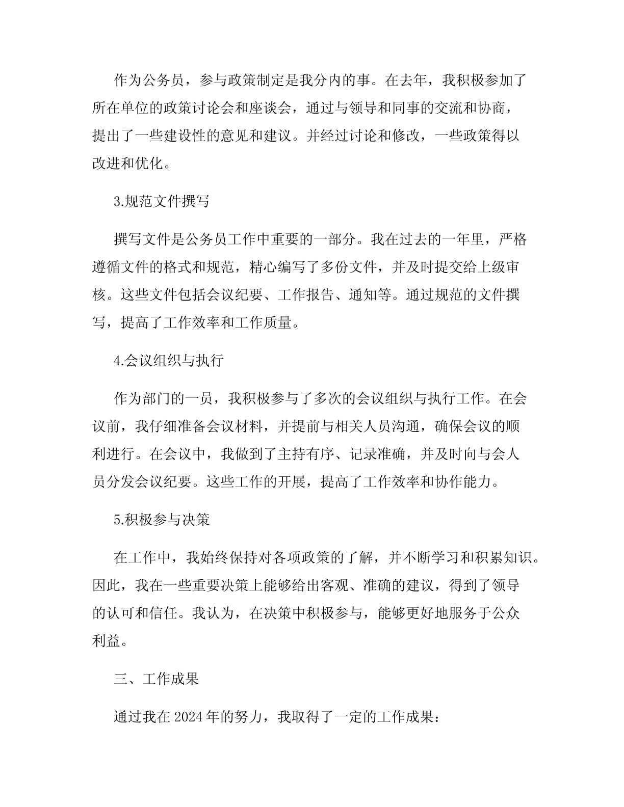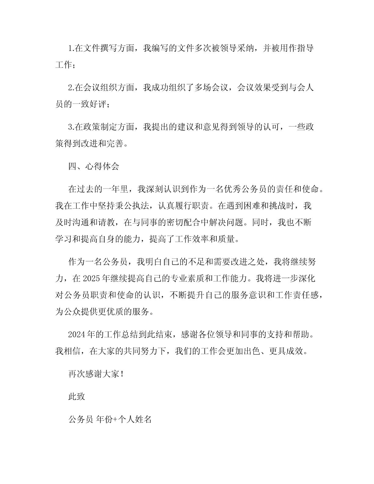 2024优秀公务员个人工作总结尊敬的领导、同事们:时光荏苒,转眼间2024年即将过去。在过去的一年里,我在公务员岗位上兢兢业业、勤勤恳恳,尽心尽力为本单位的工作做出了贡献。在这里,我将对我在2024年的工作进行总结和回顾,与大家分享我的心得和成果。一、背景介绍及岗位职责作为一名公务员,我所在的岗位是负责协助管理和执行政府的行政事务。我的具体职责包括但不限于协助制定政策、处理公民咨询、组织会议、撰写文件、参与决策等。我认识到,作为公务员,我肩负着为社会公众服务的重任和使命。二、工作总结在过去一年中,我从以下几个方面认真履行了我的职责,并取得了一定的成绩:1.严格履行职责作为一名公务员,我深知职责的重要性,所以我始终严格遵守工作纪律和法律法规。在公务员道德规范上我本身就有较强的自律,及时处理并回复公民的来信和疑问,保证了信息的准确和回应的及时性。2.积极参与政策制定作为公务员,参与政策制定是我分内的事。在去年,我积极参加了所在单位的政策讨论会和座谈会,通过与领导和同事的交流和协商,提出了一些建设性的意见和建议。并经过讨论和修改,一些政策得以改进和优化。3.规范文件撰写撰写文件是公务员工作中重要的一部分。我在过去的一年里,严格遵循文件的格式和规范,精心编写了多份文件,并及时提交给上级审核。这些文件包括会议纪要、工作报告、通知等。通过规范的文件撰写,提高了工作效率和工作质量。4.会议组织与执行作为部门的一员,我积极参与了多次的会议组织与执行工作。在会议前,我仔细准备会议材料,并提前与相关人员沟通,确保会议的顺利进行。在会议中,我做到了主持有序、记录准确,并及时向与会人员分发会议纪要。这些工作的开展,提高了工作效率和协作能力。5.积极参与决策在工作中,我始终保持对各项政策的了解,并不断学习和积累知识。因此,我在一些重要决策上能够给出客观、准确的建议,得到了领导的认可和信任。我认为,在决策中积极参与,能够更好地服务于公众利益。三、工作成果通过我在2024年的努力,我取得了一定的工作成果:1.在文件撰写方面,我编写的文件多次被领导采纳,并被用作指导工作;2.在会议组织方面,我成功组织了多场会议,会议效果受到与会人员的一致好评;3.在政策制定方面,我提出的建议和意见得到领导的认可,一些政策得到改进和完善。四、心得体会在过去的一年里,我深刻认识到作为一名优秀公务员的责任和使命。我在工作中坚持秉公执法,认真履行职责。在遇到困难和挑战时,我及时沟通和请教,在与同事的密切配合中解决问题。同时,我也不断学习和提高自身的能力,提高了工作效率和质量。作为一名公务员,我明白自己的不足和需要改进之处,我将继续努力,在2025年继续提高自己的专业素质和工作能力。我将进一步深化对公务员职责和使命的认识,不断提升自己的服务意识和工作责任感,为公众提供更优质的服务。2024年的工作总结到此结束,感谢各位领导和同事的支持和帮助。我相信,在大家的共同努力下,我们的工作会更加出色、更具成效。再次感谢大家!此致公务员年份+个人姓名
