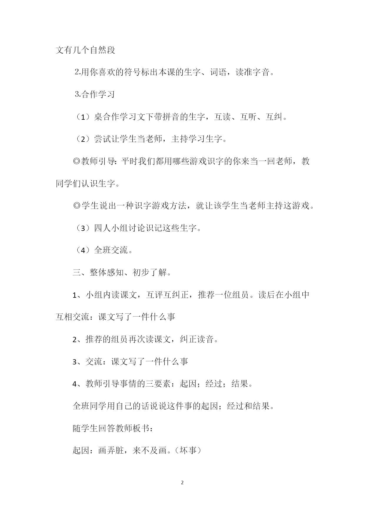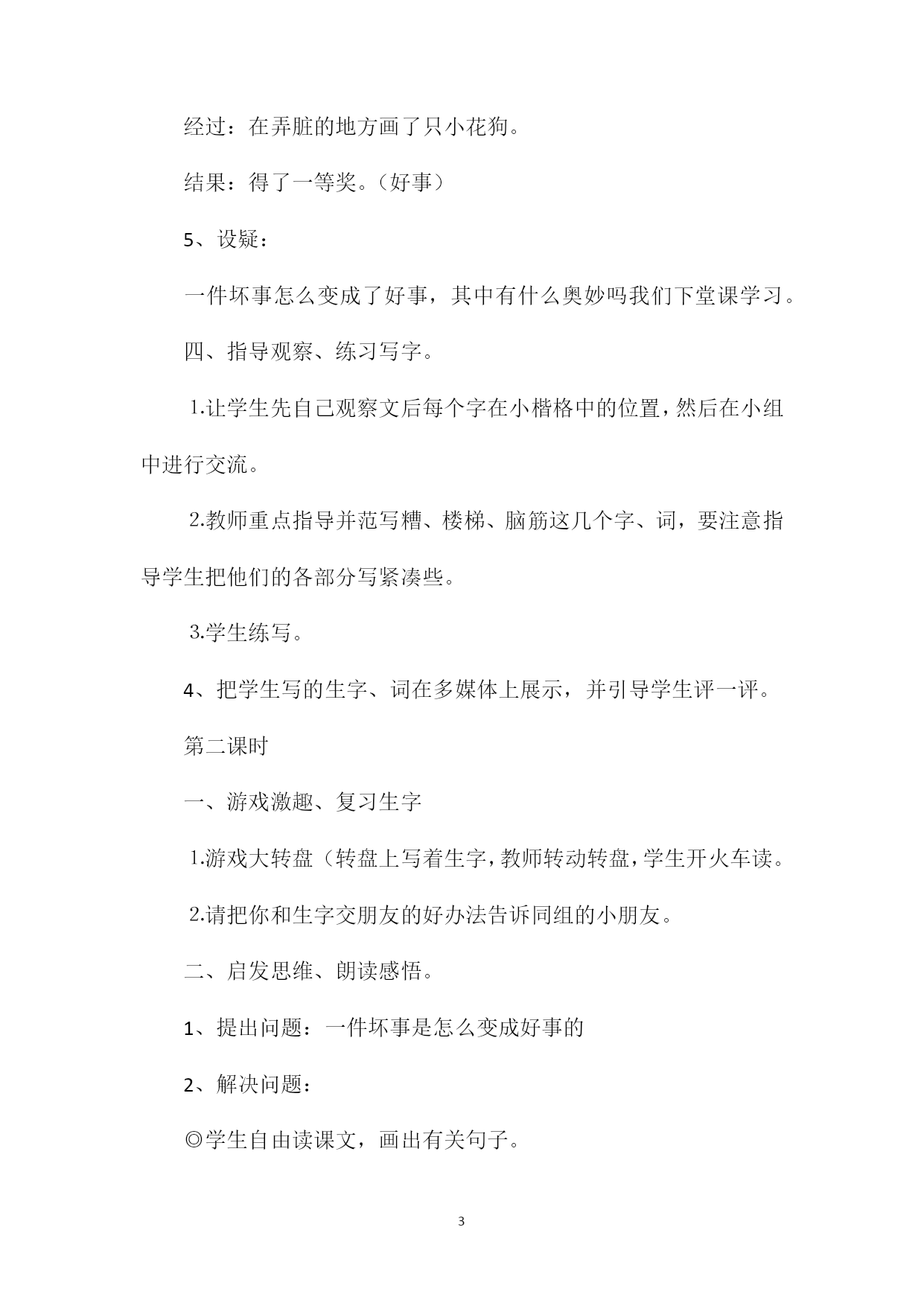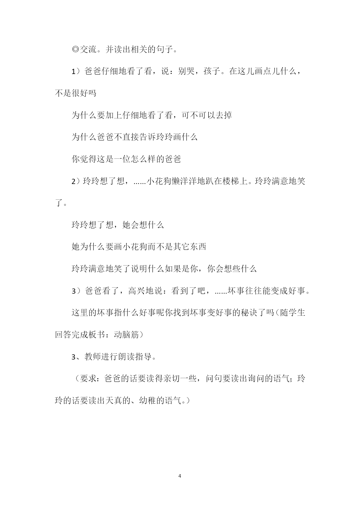 PAGEPAGE4《玲玲的画》教学设计1、认识玲、祥等8个生字,会写叭、玲等9个字以及楼梯和脑筋两个词语。2、正确、流利、有感情的朗读课文。感悟积累对自己有启发的句子。3、了解课文内容后,让学生明白生活中的很多事情并不像我们想象的那么糟。只要肯动脑筋,坏事往往能变成好事。教学时间:两课时教学过程:第一课时一、创设情景、谈话导入⒈谈话激趣⑴今天,老师又要给大家介绍一位新朋友,她叫玲玲,她在生活中也遇到了不高兴的事,我们来看看,她是怎么处理的呢请同学门打开课本116页,教师(板书课题:25《玲玲的画》)⑵齐读课题,学习生字玲。说说可以用什么方法记住玲。二、尝试学习、读文识字⒈自由读课文,边读边想:课文里写了一件什么事再标一标,课文有几个自然段⒉用你喜欢的符号标出本课的生字、词语,读准字音。⒊合作学习(1)桌合作学习文下带拼音的生字,互读、互听、互纠。(2)尝试让学生当老师,主持学习生字。◎教师引导:平时我们都用哪些游戏识字的你来当一回老师,教同学们认识生字。◎学生说出一种识字游戏方法,就让该学生当老师主持这游戏。(3)四人小组讨论识记这些生字。(4)全班交流。三、整体感知、初步了解。1、小组内读课文,互评互纠正,推荐一位组员。读后在小组中互相交流:课文写了一件什么事2、推荐的组员再次读课文,纠正读音。3、交流:课文写了一件什么事4、教师引导事情的三要素:起因;经过;结果。全班同学用自己的话说说这件事的起因;经过和结果。随学生回答教师板书:起因:画弄脏,来不及画。(坏事)经过:在弄脏的地方画了只小花狗。结果:得了一等奖。(好事)5、设疑:一件坏事怎么变成了好事,其中有什么奥妙吗我们下堂课学习。四、指导观察、练习写字。⒈让学生先自己观察文后每个字在小楷格中的位置,然后在小组中进行交流。⒉教师重点指导并范写糟、楼梯、脑筋这几个字、词,要注意指导学生把他们的各部分写紧凑些。⒊学生练写。4、把学生写的生字、词在多媒体上展示,并引导学生评一评。第二课时一、游戏激趣、复习生字⒈游戏大转盘(转盘上写着生字,教师转动转盘,学生开火车读。⒉请把你和生字交朋友的好办法告诉同组的小朋友。二、启发思维、朗读感悟。1、提出问题:一件坏事是怎么变成好事的2、解决问题:◎学生自由读课文,画出有关句子。◎交流。并读出相关的句子。1)爸爸仔细地看了看,说:别哭,孩子。在这儿画点儿什么,不是很好吗为什么要加上仔细地看了看,可不可以去掉为什么爸爸不直接告诉玲玲画什么你觉得这是一位怎么样的爸爸2)玲玲想了想,......小花狗懒洋洋地趴在楼梯上。玲玲满意地笑了。玲玲想了想,她会想什么她为什么要画小花狗而不是其它东西玲玲满意地笑了说明什么如果是你,你会想些什么3)爸爸看了,高兴地说:看到了吧,......坏事往往能变成好事。这里的坏事指什么好事呢你找到坏事变好事的秘诀了吗(随学生回答完成板书:动脑筋)3、教师进行朗读指导。(要求:爸爸的话要读得亲切一些,问句要读出询问的语气;玲玲的话要读出天真的、幼稚的语气。)