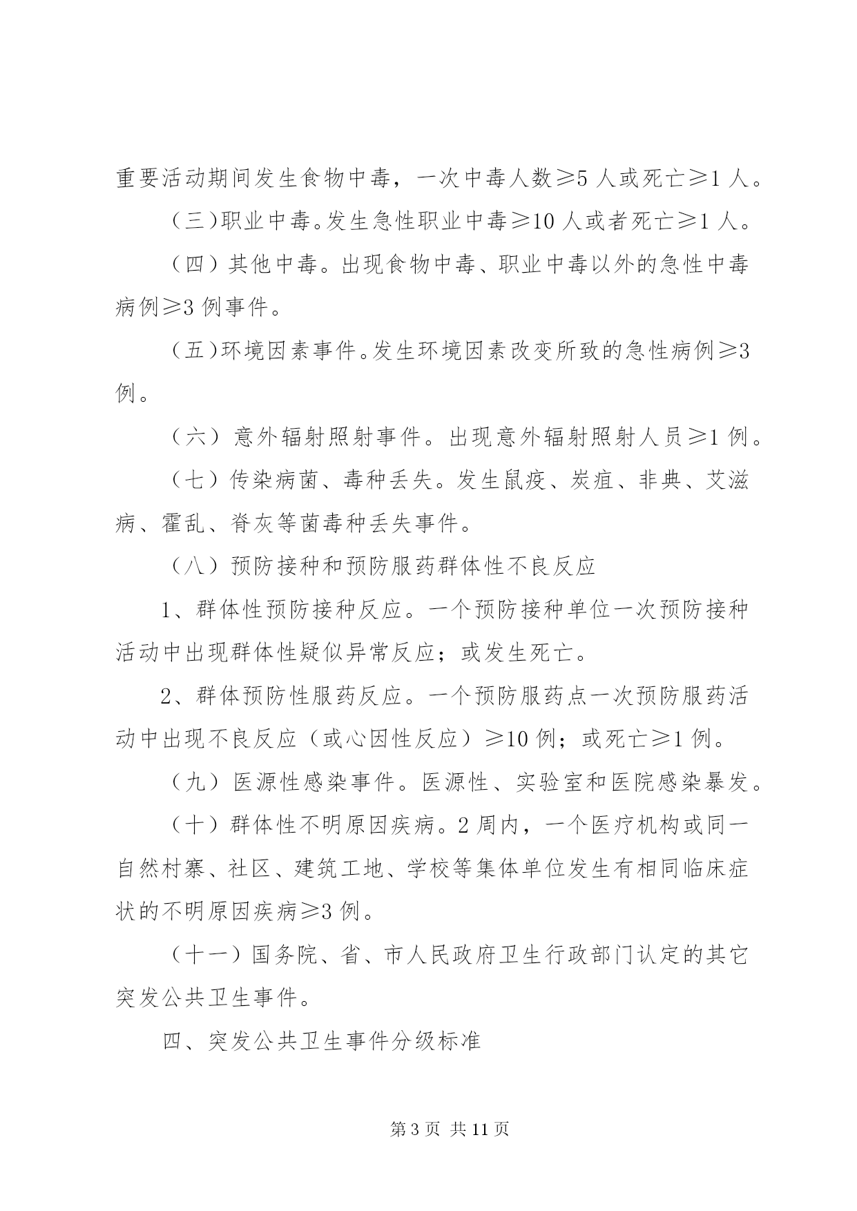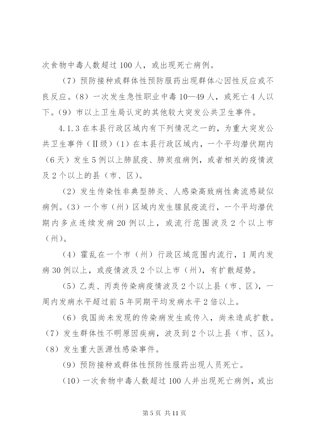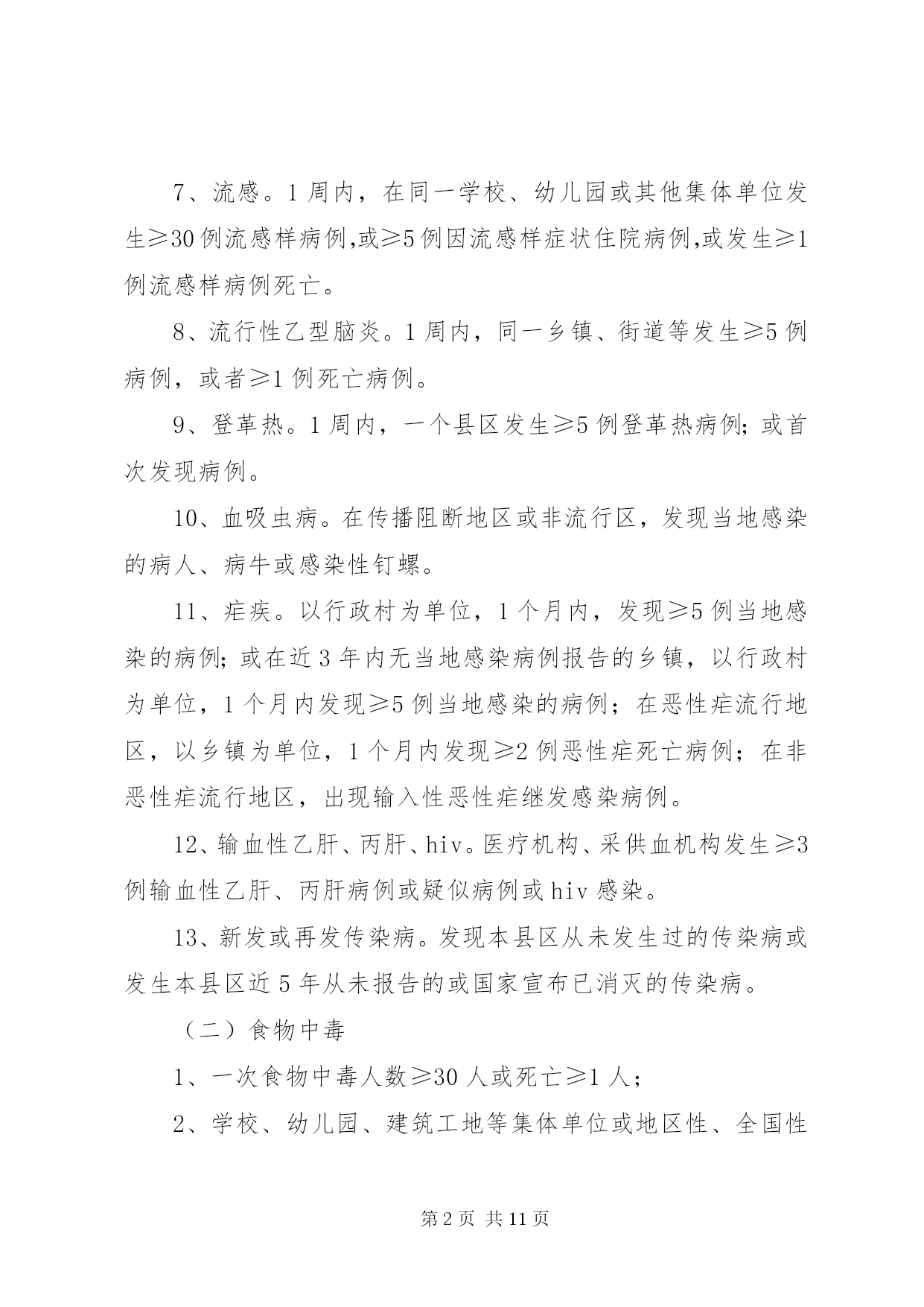 第PAGE\*Arabic\*MERGEFORMAT11页共NUMPAGES\*MERGEFORMAT11页突发公共卫生事件报告范围与标准(一)传染病1、鼠疫/霍乱/传染性非典型肺炎/人感染高致病性禽流感/肺炭疽/职业性炭疽/不明原因肺炎:发现≥1例病例。2、流行性脑脊髓膜炎/细菌性和阿米巴性痢疾。3天内,同一学校、幼儿园、自然村寨、社区、建筑工地等集体单位发生≥3例流脑病例、≥10例细菌性和阿米巴性痢疾病例,或者两种传染病各有≥2例死亡病例。3、皮肤炭疽或肠炭疽。1周内,同一学校、幼儿园、自然村寨、社区、建筑工地等集体单位发生≥3例皮肤炭疽或肠炭疽病例。4、甲肝/戊肝/伤寒(副伤寒)/流行性出血热/钩端螺旋体病:1周内,同一学校、幼儿园、自然村寨、社区、建筑工地等集体单位发生≥5例病例,或者流行性出血热/钩端螺旋体病出现≥1例死亡病例,伤寒(副伤寒)出现≥2例死亡病例。5、麻疹/风疹/流行性腮腺炎/猩红热/水痘。1周内,同一学校、幼儿园、自然村寨、社区、建筑工地等集体单位发生≥10例病例。6、感染性腹泻(除霍乱、痢疾、伤寒和副伤寒以外)。1周内,同一学校、幼儿园、自然村寨、社区、建筑工地等集体单位中发生≥20例病例,或出现≥1例死亡病例。7、流感。1周内,在同一学校、幼儿园或其他集体单位发生≥30例流感样病例,或≥5例因流感样症状住院病例,或发生≥1例流感样病例死亡。8、流行性乙型脑炎。1周内,同一乡镇、街道等发生≥5例病例,或者≥1例死亡病例。9、登革热。1周内,一个县区发生≥5例登革热病例;或首次发现病例。10、血吸虫病。在传播阻断地区或非流行区,发现当地感染的病人、病牛或感染性钉螺。11、疟疾。以行政村为单位,1个月内,发现≥5例当地感染的病例;或在近3年内无当地感染病例报告的乡镇,以行政村为单位,1个月内发现≥5例当地感染的病例;在恶性疟流行地区,以乡镇为单位,1个月内发现≥2例恶性疟死亡病例;在非恶性疟流行地区,出现输入性恶性疟继发感染病例。12、输血性乙肝、丙肝、hiv。医疗机构、采供血机构发生≥3例输血性乙肝、丙肝病例或疑似病例或hiv感染。13、新发或再发传染病。发现本县区从未发生过的传染病或发生本县区近5年从未报告的或国家宣布已消灭的传染病。(二)食物中毒1、一次食物中毒人数≥30人或死亡≥1人;2、学校、幼儿园、建筑工地等集体单位或地区性、全国性重要活动期间发生食物中毒,一次中毒人数≥5人或死亡≥1人。(三)职业中毒。发生急性职业中毒≥10人或者死亡≥1人。(四)其他中毒。出现食物中毒、职业中毒以外的急性中毒病例≥3例事件。(五)环境因素事件。发生环境因素改变所致的急性病例≥3例。(六)意外辐射照射事件。出现意外辐射照射人员≥1例。(七)传染病菌、毒种丢失。发生鼠疫、炭疽、非典、艾滋病、霍乱、脊灰等菌毒种丢失事件。(八)预防接种和预防服药群体性不良反应1、群体性预防接种反应。一个预防接种单位一次预防接种活动中出现群体性疑似异常反应;或发生死亡。2、群体预防性服药反应。一个预防服药点一次预防服药活动中出现不良反应(或心因性反应)≥10例;或死亡≥1例。(九)医源性感染事件。医源性、实验室和医院感染暴发。(十)群体性不明原因疾病。2周内,一个医疗机构或同一自然村寨、社区、建筑工地、学校等集体单位发生有相同临床症状的不明原因疾病≥3例。(十一)国务院、省、市人民政府卫生行政部门认定的其它突发公共卫生事件。四、突发公共卫生事件分级标准根据突发公共卫生事件的性质、危害程度、涉及范围,突发公共卫生事件划分为一般(Ⅳ级)、较大(Ⅲ级)、重大(Ⅱ级)和特别重大(Ⅰ级)四级。4.1.1在本县行政区域内有下列情形之一的,为一般突发公共卫生事件(Ⅳ级)(1)腺鼠疫在本县行政区域内发生,一个平均潜伏期病例数未超过10例。(2)霍乱在本根据突发公共卫生事件的性质、危害程度、涉及范围,突发公共卫生事件划分为一县行政区域内发生,1周内发病9例以下。(3)一次食物中毒人数30—99人,未出现死亡病例。(4)一次发生急性职业中毒9人以下,未出现死亡病例。(5)县级以上卫生局认定的其他一般突发公共卫生事件。4.1.2在本县行政区域内有下列情形之一的,为较大的突发公共卫生事件(Ⅲ级)(1)发生肺鼠疫、肺炭疽病例,一个平均潜伏期内病例数未超过5例。(2)发生腺鼠疫流行,在本县行政区域内,一个平均潜伏期内连续发病10例以上,或波及2个以上县(市、区)。(3)霍乱在本县行政区域内发生,1周内发病10—29例,或疫情波及2个以上县(市、区)。(4)一周内在本县行政区域内,乙、丙类传染病发病水平超过前5年同期平均发病水平1倍以上。(5)在本县行政区域内发现群体性不明原因疾病。(6)一次食物中毒人数超过100人,或出现死亡病例。