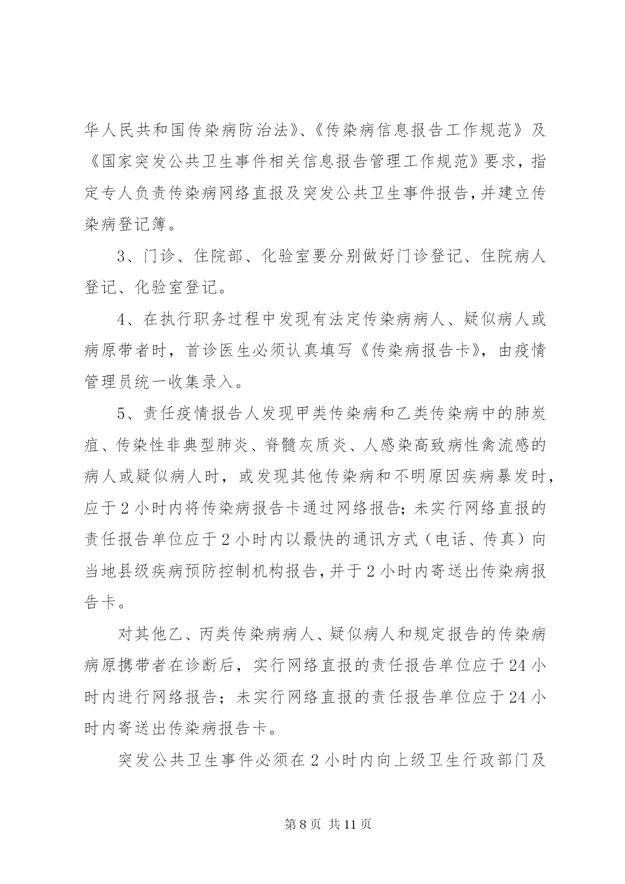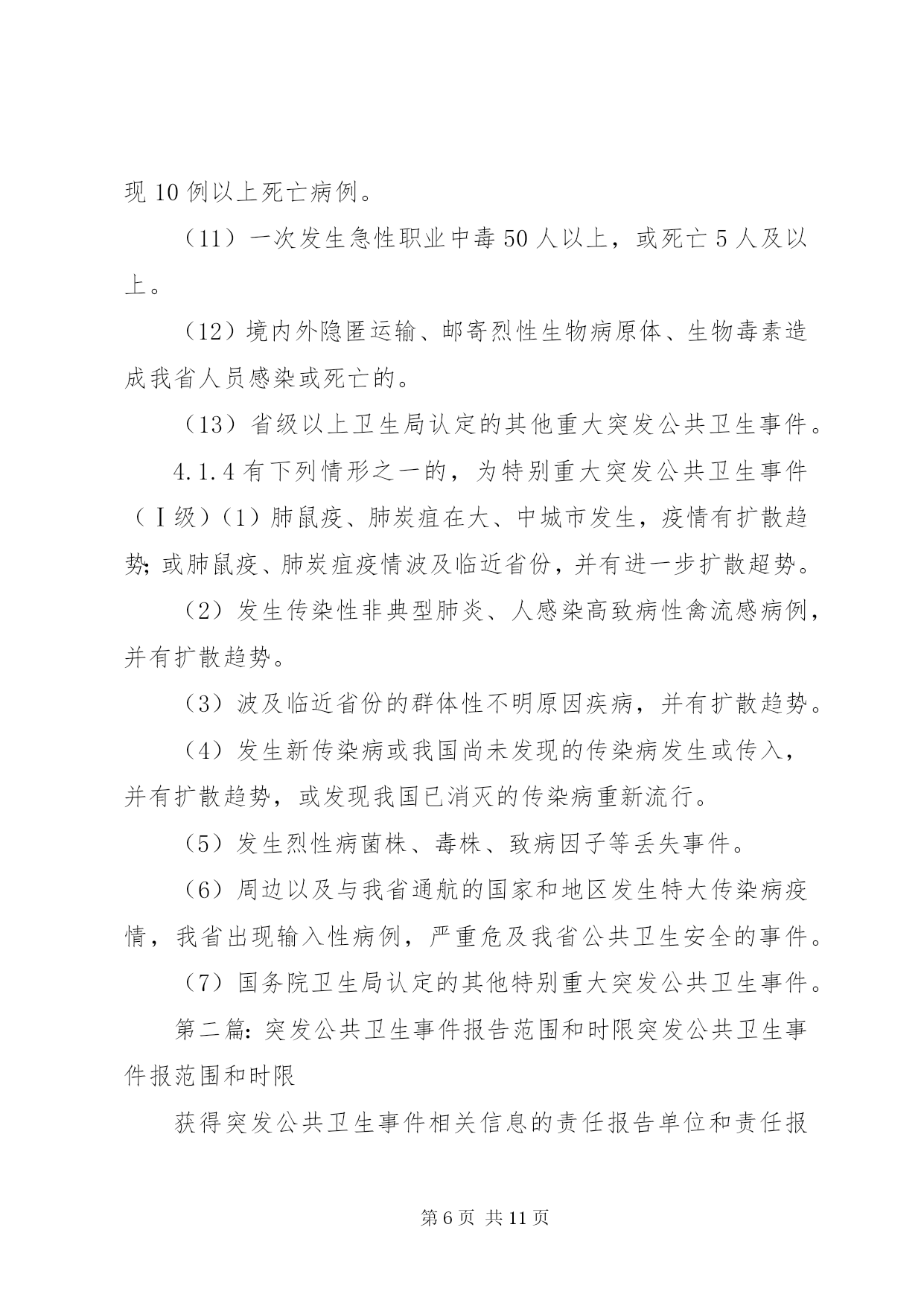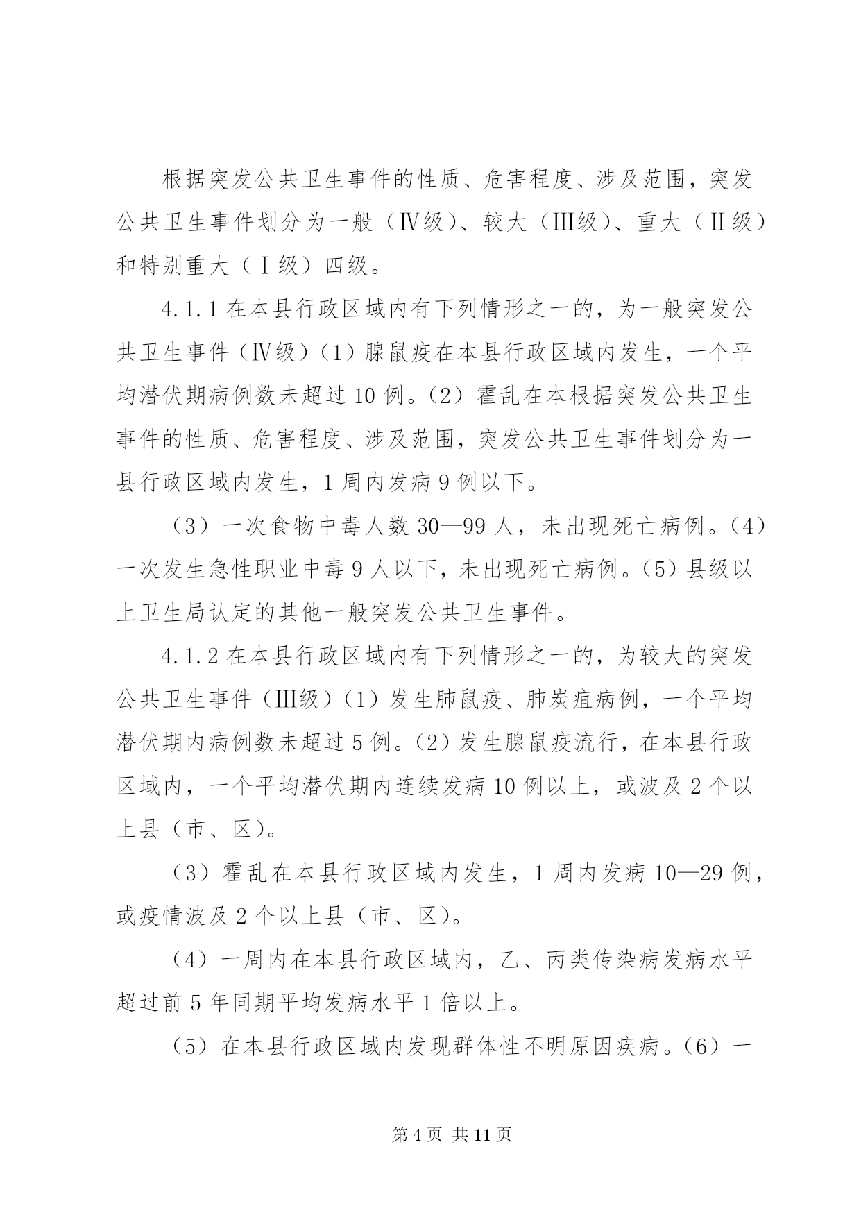 第PAGE\*Arabic\*MERGEFORMAT11页共NUMPAGES\*MERGEFORMAT11页突发公共卫生事件报告范围与标准(一)传染病1、鼠疫/霍乱/传染性非典型肺炎/人感染高致病性禽流感/肺炭疽/职业性炭疽/不明原因肺炎:发现≥1例病例。2、流行性脑脊髓膜炎/细菌性和阿米巴性痢疾。3天内,同一学校、幼儿园、自然村寨、社区、建筑工地等集体单位发生≥3例流脑病例、≥10例细菌性和阿米巴性痢疾病例,或者两种传染病各有≥2例死亡病例。3、皮肤炭疽或肠炭疽。1周内,同一学校、幼儿园、自然村寨、社区、建筑工地等集体单位发生≥3例皮肤炭疽或肠炭疽病例。4、甲肝/戊肝/伤寒(副伤寒)/流行性出血热/钩端螺旋体病:1周内,同一学校、幼儿园、自然村寨、社区、建筑工地等集体单位发生≥5例病例,或者流行性出血热/钩端螺旋体病出现≥1例死亡病例,伤寒(副伤寒)出现≥2例死亡病例。5、麻疹/风疹/流行性腮腺炎/猩红热/水痘。1周内,同一学校、幼儿园、自然村寨、社区、建筑工地等集体单位发生≥10例病例。6、感染性腹泻(除霍乱、痢疾、伤寒和副伤寒以外)。1周内,同一学校、幼儿园、自然村寨、社区、建筑工地等集体单位中发生≥20例病例,或出现≥1例死亡病例。7、流感。1周内,在同一学校、幼儿园或其他集体单位发生≥30例流感样病例,或≥5例因流感样症状住院病例,或发生≥1例流感样病例死亡。8、流行性乙型脑炎。1周内,同一乡镇、街道等发生≥5例病例,或者≥1例死亡病例。9、登革热。1周内,一个县区发生≥5例登革热病例;或首次发现病例。10、血吸虫病。在传播阻断地区或非流行区,发现当地感染的病人、病牛或感染性钉螺。11、疟疾。以行政村为单位,1个月内,发现≥5例当地感染的病例;或在近3年内无当地感染病例报告的乡镇,以行政村为单位,1个月内发现≥5例当地感染的病例;在恶性疟流行地区,以乡镇为单位,1个月内发现≥2例恶性疟死亡病例;在非恶性疟流行地区,出现输入性恶性疟继发感染病例。12、输血性乙肝、丙肝、hiv。医疗机构、采供血机构发生≥3例输血性乙肝、丙肝病例或疑似病例或hiv感染。13、新发或再发传染病。发现本县区从未发生过的传染病或发生本县区近5年从未报告的或国家宣布已消灭的传染病。(二)食物中毒1、一次食物中毒人数≥30人或死亡≥1人;2、学校、幼儿园、建筑工地等集体单位或地区性、全国性重要活动期间发生食物中毒,一次中毒人数≥5人或死亡≥1人。(三)职业中毒。发生急性职业中毒≥10人或者死亡≥1人。(四)其他中毒。出现食物中毒、职业中毒以外的急性中毒病例≥3例事件。(五)环境因素事件。发生环境因素改变所致的急性病例≥3例。(六)意外辐射照射事件。出现意外辐射照射人员≥1例。(七)传染病菌、毒种丢失。发生鼠疫、炭疽、非典、艾滋病、霍乱、脊灰等菌毒种丢失事件。(八)预防接种和预防服药群体性不良反应1、群体性预防接种反应。一个预防接种单位一次预防接种活动中出现群体性疑似异常反应;或发生死亡。2、群体预防性服药反应。一个预防服药点一次预防服药活动中出现不良反应(或心因性反应)≥10例;或死亡≥1例。(九)医源性感染事件。医源性、实验室和医院感染暴发。(十)群体性不明原因疾病。2周内,一个医疗机构或同一自然村寨、社区、建筑工地、学校等集体单位发生有相同临床症状的不明原因疾病≥3例。(十一)国务院、省、市人民政府卫生行政部门认定的其它突发公共卫生事件。四、突发公共卫生事件分级标准根据突发公共卫生事件的性质、危害程度、涉及范围,突发公共卫生事件划分为一般(Ⅳ级)、较大(Ⅲ级)、重大(Ⅱ级)和特别重大(Ⅰ级)四级。4.1.1在本县行政区域内有下列情形之一的,为一般突发公共卫生事件(Ⅳ级)(1)腺鼠疫在本县行政区域内发生,一个平均潜伏期病例数未超过10例。(2)霍乱在本根据突发公共卫生事件的性质、危害程度、涉及范围,突发公共卫生事件划分为一县行政区域内发生,1周内发病9例以下。(3)一次食物中毒人数30—99人,未出现死亡病例。(4)一次发生急性职业中毒9人以下,未出现死亡病例。(5)县级以上卫生局认定的其他一般突发公共卫生事件。4.1.2在本县行政区域内有下列情形之一的,为较大的突发公共卫生事件(Ⅲ级)(1)发生肺鼠疫、肺炭疽病例,一个平均潜伏期内病例数未超过5例。(2)发生腺鼠疫流行,在本县行政区域内,一个平均潜伏期内连续发病10例以上,或波及2个以上县(市、区)。(3)霍乱在本县行政区域内发生,1周内发病10—29例,或疫情波及2个以上县(市、区)。(4)一周内在本县行政区域内,乙、丙类传染病发病水平超过前5年同期平均发病水平1倍以上。(5)在本县行政区域内发现群体性不明原因疾病。(6)一次食物中毒人数超过100人,或出现死亡病例。