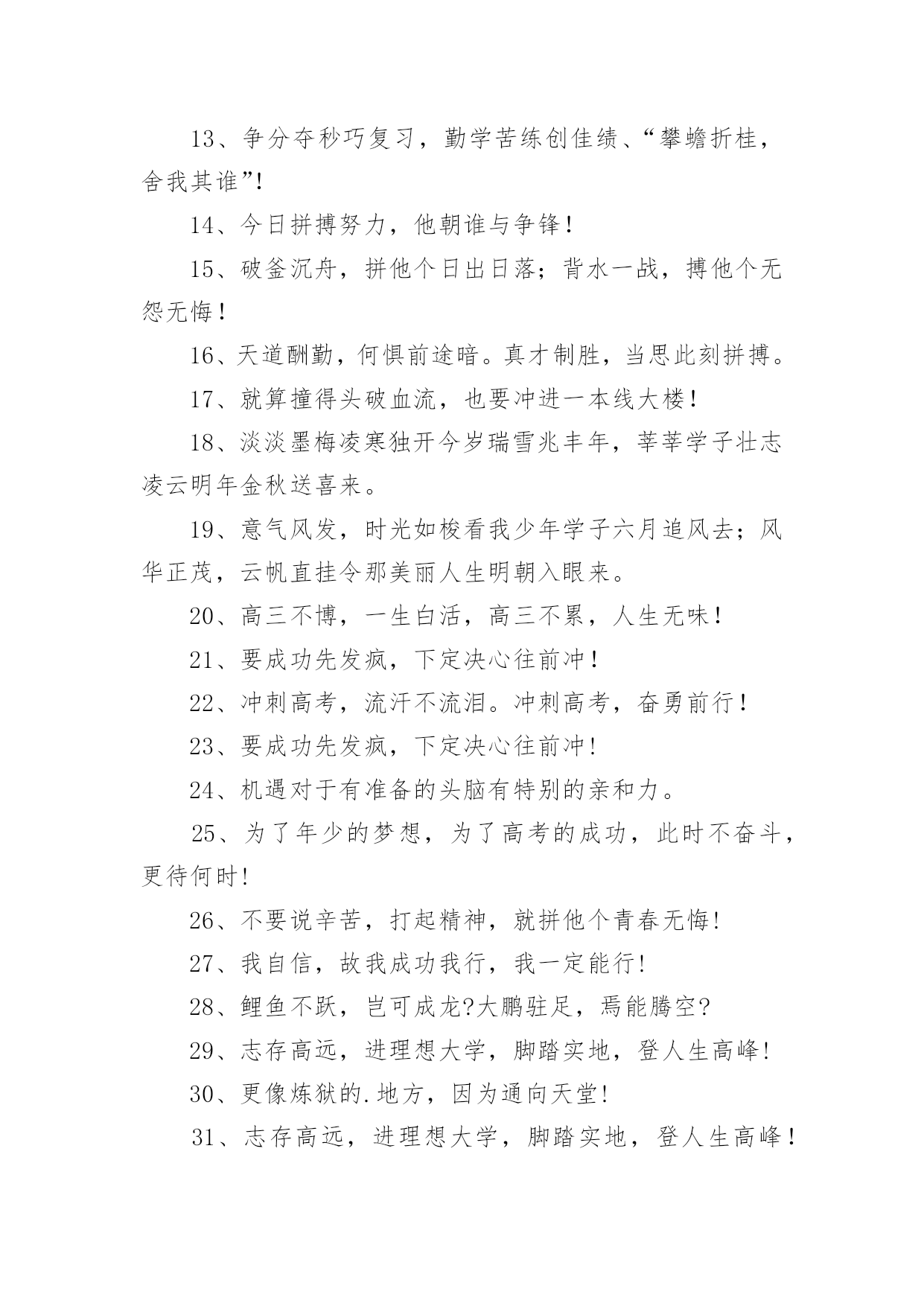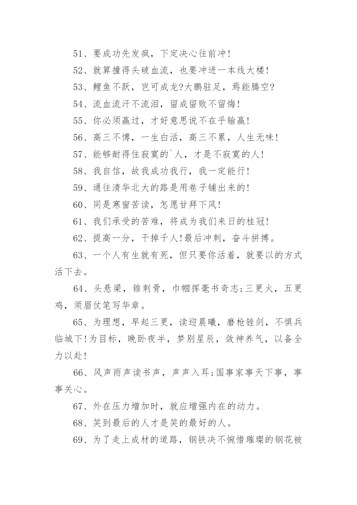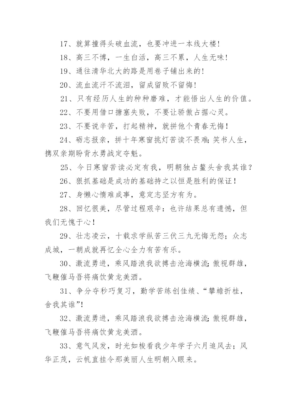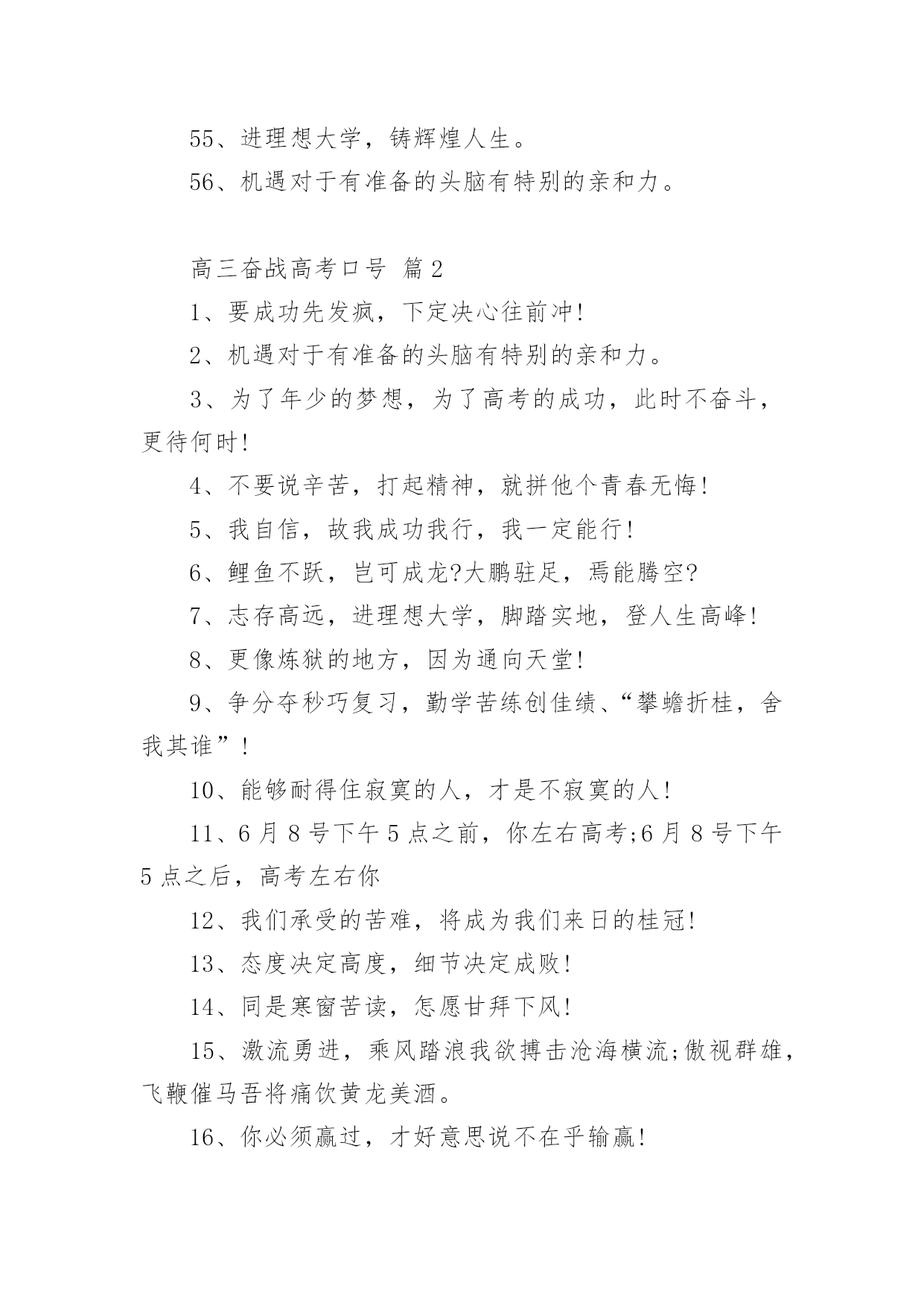 高三奋战高考口号在日常学习、工作抑或是生活中,大家都接触过比较经典的口号吧,口号具有在理智上启发人们,在情感上打动人们的作用。那什么样的口号才具有启发意义呢?以下是小编帮大家整理的高三奋战高考口号,仅供参考,大家一起来看看吧。高三奋战高考口号篇11、今朝坚韧搏风浪,明日清北校园聚。2、人活着要呼吸。呼者,出一口气;吸者,争一口气。3、拼一载春秋,搏一生无悔。4、今日的汗水,明日的收获。5、挑战极限,无悔人生。奋力拼搏进取,谱写风华篇章。6、聚精会神,精益求精。7、不比智力比努力,不比起点比进步。8、高三不再有,劝君珍惜之。一年之经历,终身之财富。9、人活着要呼吸。呼者,出一口气;吸者,争一口气。10、同甘共苦拼搏从此时;风雨兼程成败在今年。11、如火六月,决战沙场。12、是雄鹰就搏击长空,是猛虎就声振山谷。13、高三不再有,劝君珍惜之。一年之经历,终身之财富。14、今朝我以校为荣,明日校以我为耀。15、海阔凭鱼游鲤跃龙门;天高任鸟飞鹏程万里。16、两眼一睁,开始竞争!17、同甘共苦拼搏从此时;风雨兼程成败在今年。18、心存大志舒豪气,声声誓词冲云霄。19、扛得住给我扛,扛不住给我死扛。20、鲤鱼不跃,岂可成龙?大鹏驻足,焉能腾空?21、志存高远,进理想大学,脚踏实地,登人生高峰!22、遇难心不慌,遇易心更细。23、不要说辛苦,打起精神,就拼他个青春无悔!24、争分夺秒巧复习,勤学苦练创佳绩、“攀蟾折桂,舍我其谁”!25、功崇惟志,业广为勤。26、流血流汗不流泪,留成留败不留悔!27、争取时间就是争取成功,提高效率就是提高分数。28、不必每分钟都学习,但求学习中每分钟都有收获。29、超越自己,向自己挑战,向弱项挑战,向懒惰挑战,向陋习挑战。30、面对机遇,不犹豫;面对抉择,不彷徨;面对决战,不惧怕!31、不要自卑,你不比别人笨。不要自满,别人不比你笨。32、没有平日的失败,就没有最终的成功。重要的是分析失败原因并吸取教训。33、我自信,故我成功我行,我一定能行!34、拼一载春秋,搏一生无悔。35、今日的汗水,明日的收获。36、辛苦一年,收益一生。37、态度决定高度,细节决定成败!38、能够耐得住寂寞的人,才是不寂寞的人!39、同是寒窗苦读,怎愿甘拜下风!40、你必须赢过,才好意思说不在乎输赢!41、我们承受的苦难,将成为我们来日的桂冠!42、激情澎湃,高考不败。43、海阔凭鱼游鲤跃龙门;天高任鸟飞鹏程万里。44、心存大志舒豪气,声声誓词冲云霄。45、敏而好学,不耻下问。46、为了年少的.梦想,为了高考的成功,此时不奋斗,更待何时!47、今日寒窗苦读必定有我,明朝独占鳌头舍我其谁?48、扬起常笑脸,轻松迎高考。49、今朝我以校为荣,明日校以我为耀。50、乐学实学,挑战高考;勤勉向上,成就自我。51、就算撞得头破血流,也要冲进一本线大楼!52、不要用借口搪塞失败,不要让骄傲占据心灵。53、只有经历人生的种种磨难,才能悟出人生的价值。54、出淤泥而不染,濯清涟而不妖。55、进理想大学,铸辉煌人生。56、机遇对于有准备的头脑有特别的亲和力。高三奋战高考口号篇21、要成功先发疯,下定决心往前冲!2、机遇对于有准备的头脑有特别的亲和力。3、为了年少的梦想,为了高考的成功,此时不奋斗,更待何时!4、不要说辛苦,打起精神,就拼他个青春无悔!5、我自信,故我成功我行,我一定能行!6、鲤鱼不跃,岂可成龙?大鹏驻足,焉能腾空?7、志存高远,进理想大学,脚踏实地,登人生高峰!8、更像炼狱的地方,因为通向天堂!9、争分夺秒巧复习,勤学苦练创佳绩、“攀蟾折桂,舍我其谁”!10、能够耐得住寂寞的人,才是不寂寞的人!11、6月8号下午5点之前,你左右高考;6月8号下午5点之后,高考左右你12、我们承受的苦难,将成为我们来日的桂冠!13、态度决定高度,细节决定成败!14、同是寒窗苦读,怎愿甘拜下风!15、激流勇进,乘风踏浪我欲搏击沧海横流;傲视群雄,飞鞭催马吾将痛饮黄龙美酒。16、你必须赢过,才好意思说不在乎输赢!17、就算撞得头破血流,也要冲进一本线大楼!18、高三不博,一生白活,高三不累,人生无味!19、通往清华北大的路是用卷子铺出来的!20、流血流汗不流泪,留成留败不留悔!21、只有经历人生的种种磨难,才能悟出人生的价值。22、不要用借口搪塞失败,不要让骄傲占据心灵。23、不要说辛苦,打起精神,就拼他个青春无悔!24、砺志报亲,拼十年寒窗挑灯苦读不畏难;笑书人生,携双亲期盼背水勇战定夺魁。25、今日寒窗苦读必定有我,明朝独占鳌头舍我其谁?26、狠抓基础是成功的基础持之以恒是胜利的保证!27、身懒心惰难成事,意定志坚方有为。28、回忆很美,尽管过程艰辛:也许结果总有遗憾,但我们无愧于心!29、壮志凌云,十载求学纵苦三伏三九无悔无怨;众志成城,一朝成就再忆