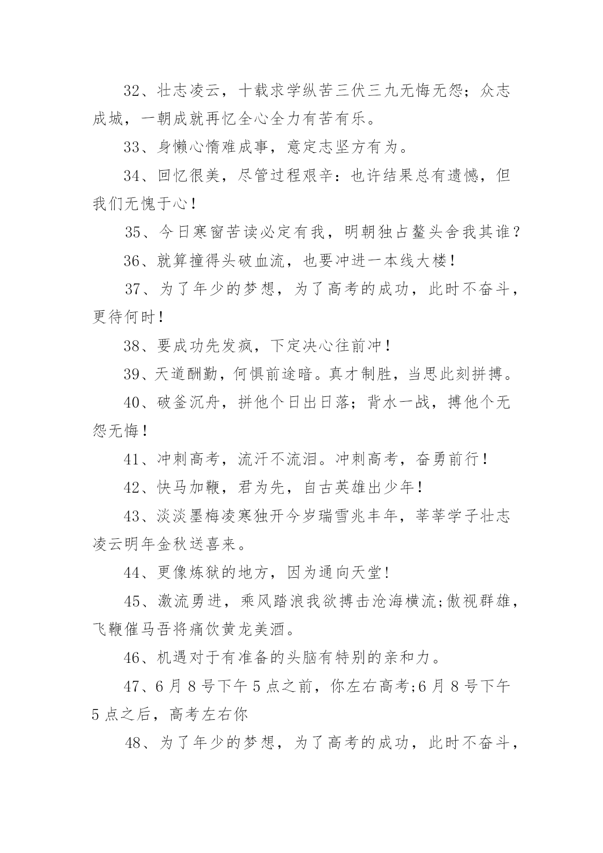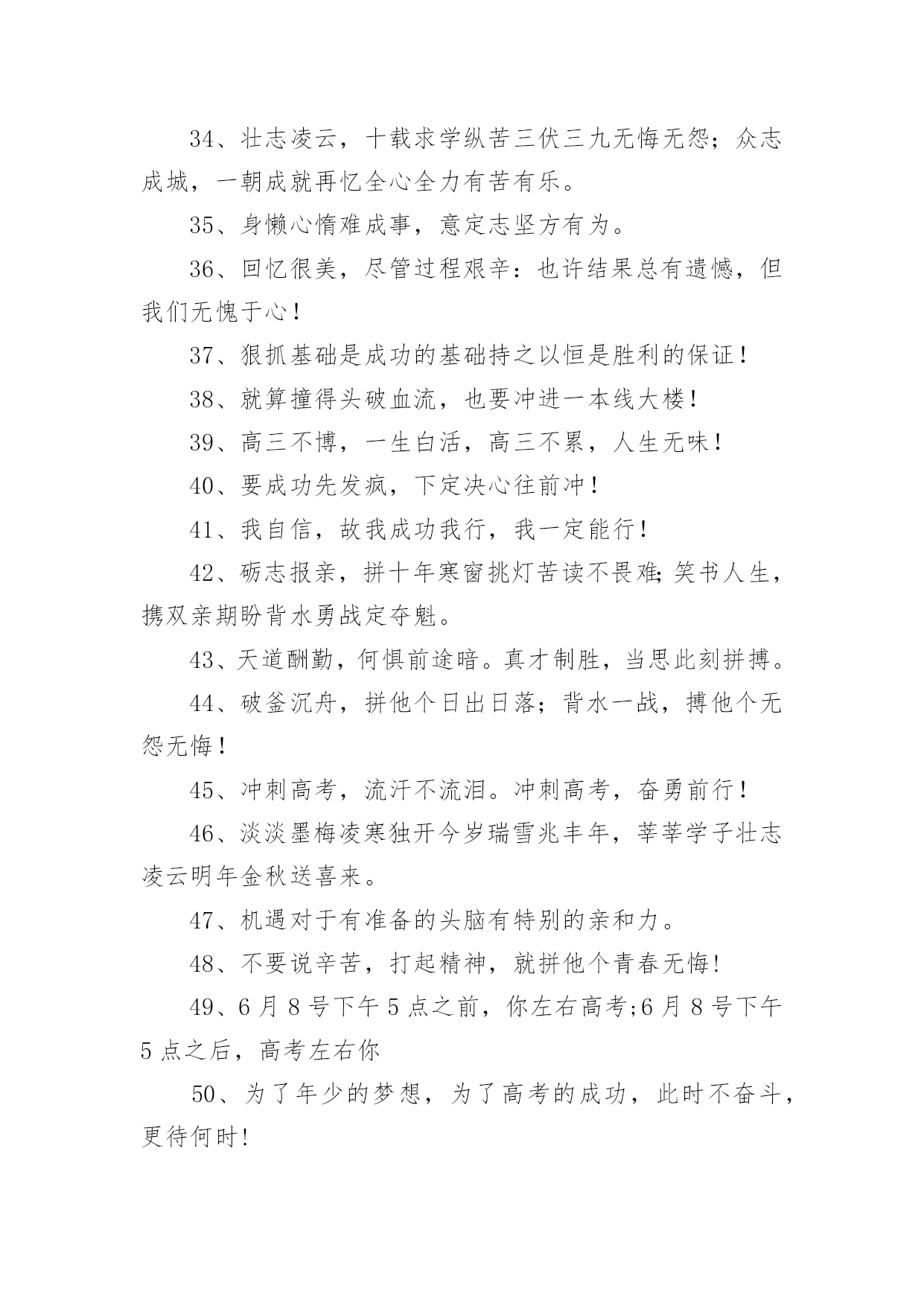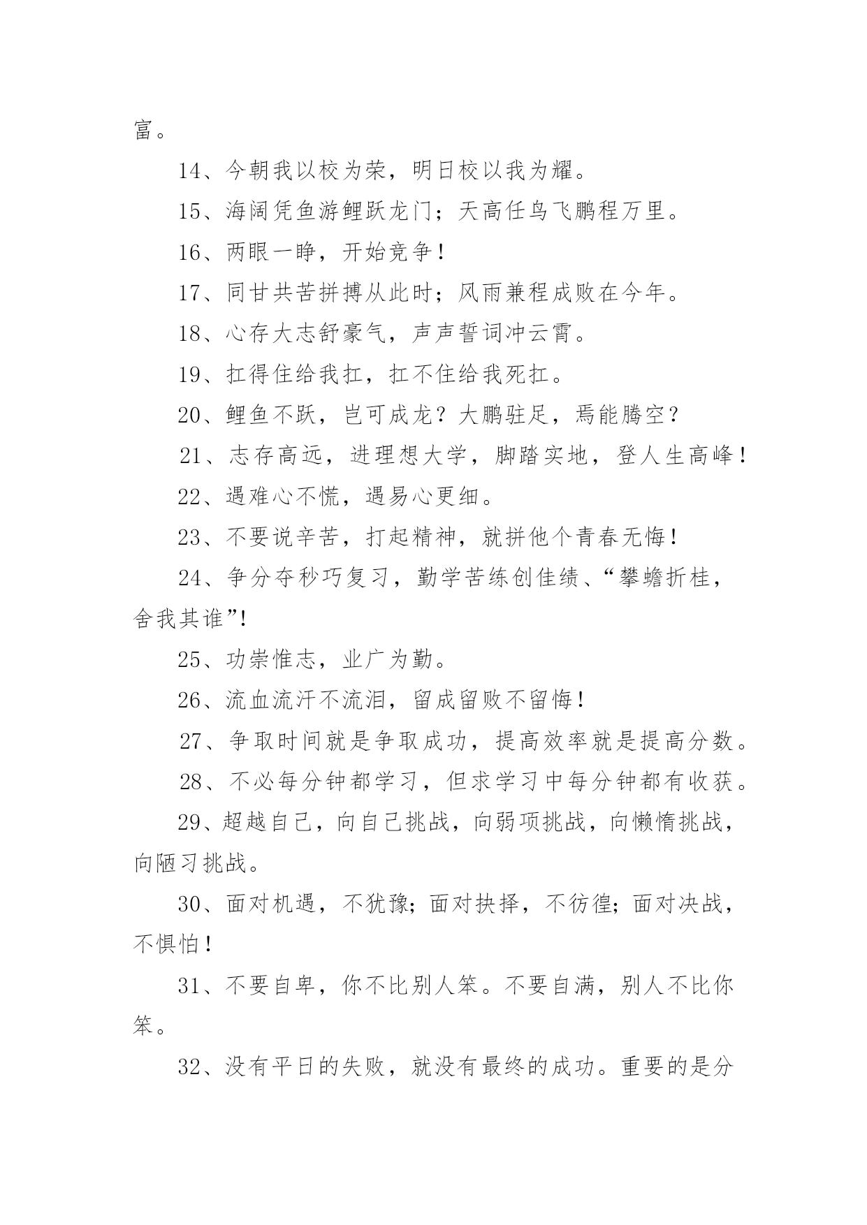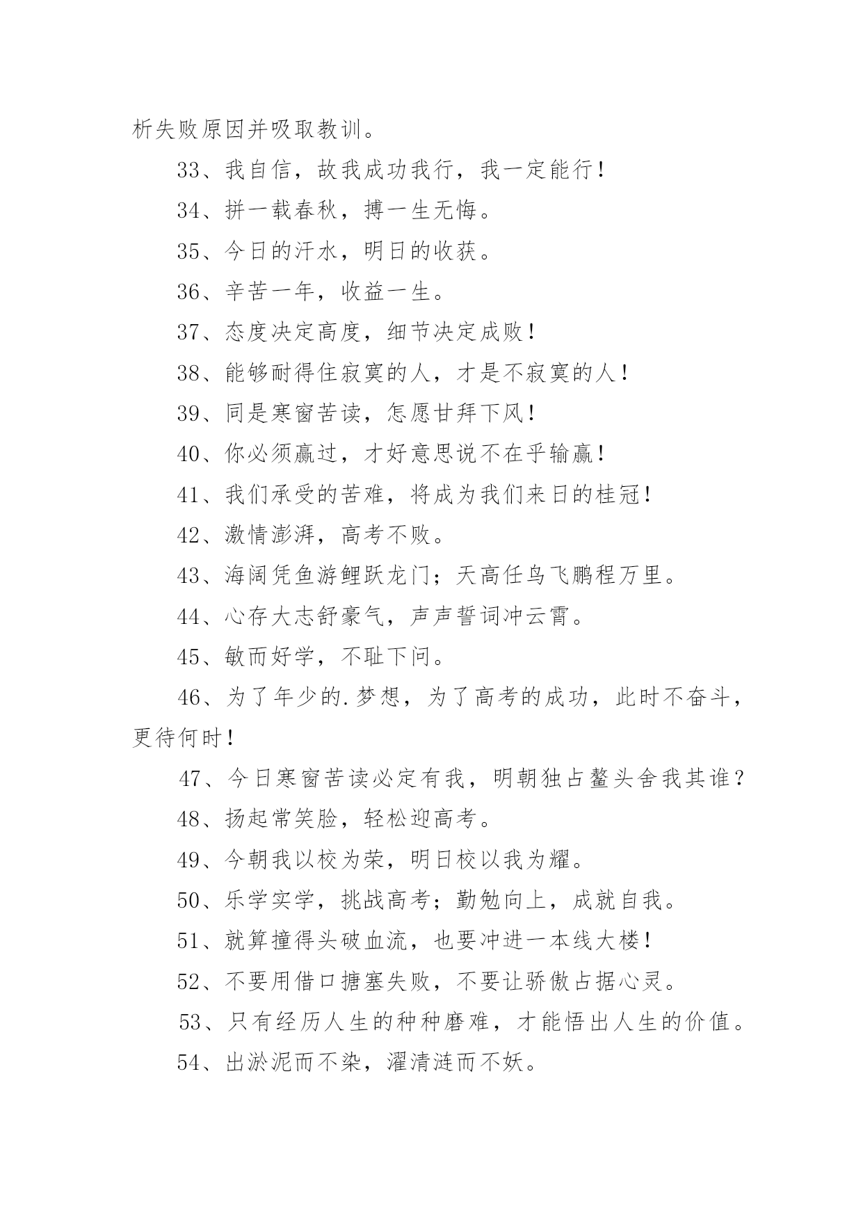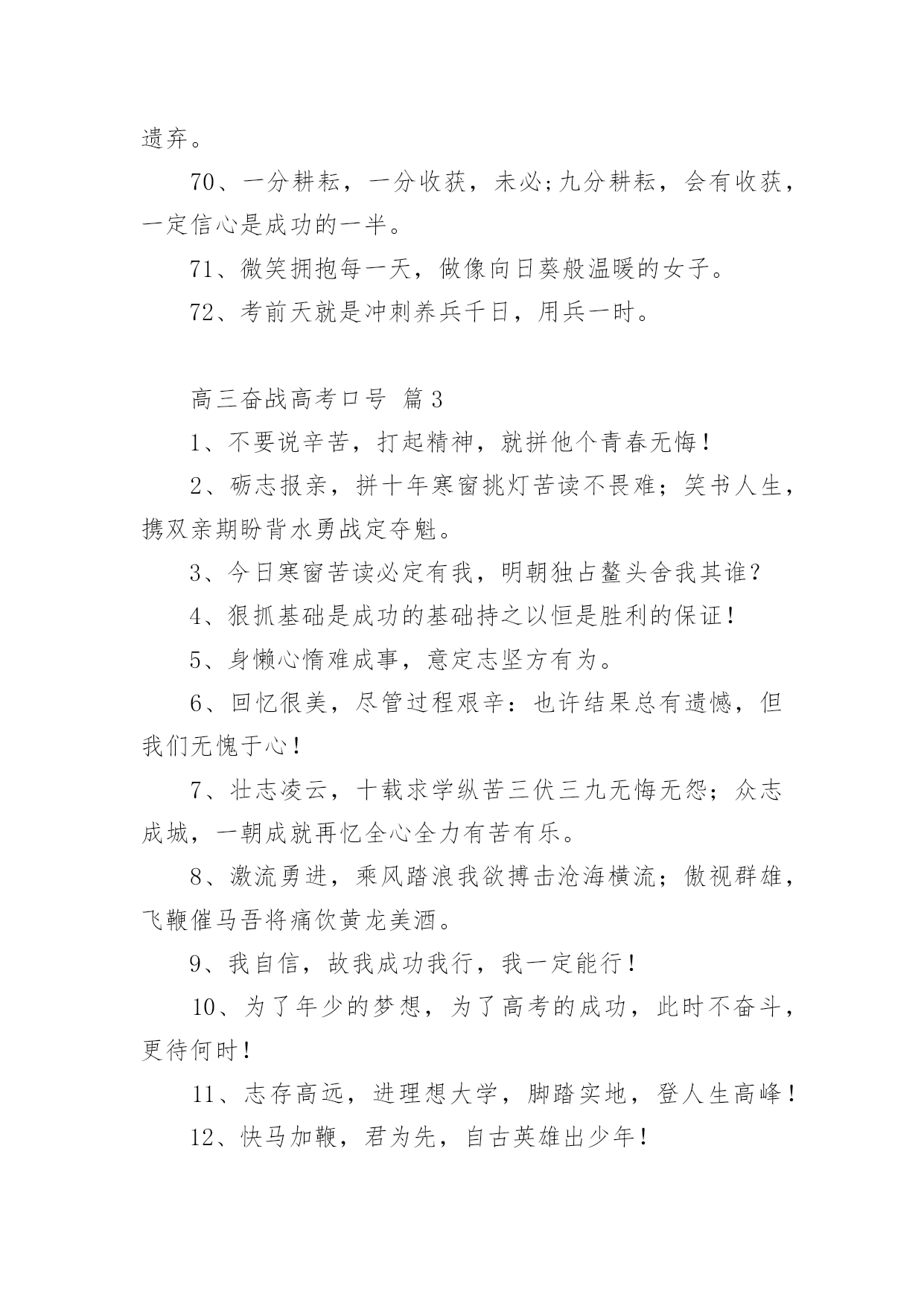 高三奋战高考口号在日常学习、工作抑或是生活中,大家都接触过比较经典的口号吧,口号具有在理智上启发人们,在情感上打动人们的作用。那什么样的口号才具有启发意义呢?以下是小编帮大家整理的高三奋战高考口号,仅供参考,大家一起来看看吧。高三奋战高考口号篇11、今朝坚韧搏风浪,明日清北校园聚。2、人活着要呼吸。呼者,出一口气;吸者,争一口气。3、拼一载春秋,搏一生无悔。4、今日的汗水,明日的收获。5、挑战极限,无悔人生。奋力拼搏进取,谱写风华篇章。6、聚精会神,精益求精。7、不比智力比努力,不比起点比进步。8、高三不再有,劝君珍惜之。一年之经历,终身之财富。9、人活着要呼吸。呼者,出一口气;吸者,争一口气。10、同甘共苦拼搏从此时;风雨兼程成败在今年。11、如火六月,决战沙场。12、是雄鹰就搏击长空,是猛虎就声振山谷。13、高三不再有,劝君珍惜之。一年之经历,终身之财富。14、今朝我以校为荣,明日校以我为耀。15、海阔凭鱼游鲤跃龙门;天高任鸟飞鹏程万里。16、两眼一睁,开始竞争!17、同甘共苦拼搏从此时;风雨兼程成败在今年。18、心存大志舒豪气,声声誓词冲云霄。19、扛得住给我扛,扛不住给我死扛。20、鲤鱼不跃,岂可成龙?大鹏驻足,焉能腾空?21、志存高远,进理想大学,脚踏实地,登人生高峰!22、遇难心不慌,遇易心更细。23、不要说辛苦,打起精神,就拼他个青春无悔!24、争分夺秒巧复习,勤学苦练创佳绩、“攀蟾折桂,舍我其谁”!25、功崇惟志,业广为勤。26、流血流汗不流泪,留成留败不留悔!27、争取时间就是争取成功,提高效率就是提高分数。28、不必每分钟都学习,但求学习中每分钟都有收获。29、超越自己,向自己挑战,向弱项挑战,向懒惰挑战,向陋习挑战。30、面对机遇,不犹豫;面对抉择,不彷徨;面对决战,不惧怕!31、不要自卑,你不比别人笨。不要自满,别人不比你笨。32、没有平日的失败,就没有最终的成功。重要的是分析失败原因并吸取教训。33、我自信,故我成功我行,我一定能行!34、拼一载春秋,搏一生无悔。35、今日的汗水,明日的收获。36、辛苦一年,收益一生。37、态度决定高度,细节决定成败!38、能够耐得住寂寞的人,才是不寂寞的人!39、同是寒窗苦读,怎愿甘拜下风!40、你必须赢过,才好意思说不在乎输赢!41、我们承受的苦难,将成为我们来日的桂冠!42、激情澎湃,高考不败。43、海阔凭鱼游鲤跃龙门;天高任鸟飞鹏程万里。44、心存大志舒豪气,声声誓词冲云霄。45、敏而好学,不耻下问。46、为了年少的.梦想,为了高考的成功,此时不奋斗,更待何时!47、今日寒窗苦读必定有我,明朝独占鳌头舍我其谁?48、扬起常笑脸,轻松迎高考。49、今朝我以校为荣,明日校以我为耀。50、乐学实学,挑战高考;勤勉向上,成就自我。51、就算撞得头破血流,也要冲进一本线大楼!52、不要用借口搪塞失败,不要让骄傲占据心灵。53、只有经历人生的种种磨难,才能悟出人生的价值。54、出淤泥而不染,濯清涟而不妖。55、进理想大学,铸辉煌人生。56、机遇对于有准备的头脑有特别的亲和力。高三奋战高考口号篇21、要成功先发疯,下定决心往前冲!2、机遇对于有准备的头脑有特别的亲和力。3、为了年少的梦想,为了高考的成功,此时不奋斗,更待何时!4、不要说辛苦,打起精神,就拼他个青春无悔!5、我自信,故我成功我行,我一定能行!6、鲤鱼不跃,岂可成龙?大鹏驻足,焉能腾空?7、志存高远,进理想大学,脚踏实地,登人生高峰!8、更像炼狱的地方,因为通向天堂!9、争分夺秒巧复习,勤学苦练创佳绩、“攀蟾折桂,舍我其谁”!10、能够耐得住寂寞的人,才是不寂寞的人!11、6月8号下午5点之前,你左右高考;6月8号下午5点之后,高考左右你12、我们承受的苦难,将成为我们来日的桂冠!13、态度决定高度,细节决定成败!14、同是寒窗苦读,怎愿甘拜下风!15、激流勇进,乘风踏浪我欲搏击沧海横流;傲视群雄,飞鞭催马吾将痛饮黄龙美酒。16、你必须赢过,才好意思说不在乎输赢!17、就算撞得头破血流,也要冲进一本线大楼!18、高三不博,一生白活,高三不累,人生无味!19、通往清华北大的路是用卷子铺出来的!20、流血流汗不流泪,留成留败不留悔!21、只有经历人生的种种磨难,才能悟出人生的价值。22、不要用借口搪塞失败,不要让骄傲占据心灵。23、不要说辛苦,打起精神,就拼他个青春无悔!24、砺志报亲,拼十年寒窗挑灯苦读不畏难;笑书人生,携双亲期盼背水勇战定夺魁。25、今日寒窗苦读必定有我,明朝独占鳌头舍我其谁?26、狠抓基础是成功的基础持之以恒是胜利的保证!27、身懒心惰难成事,意定志坚方有为。28、回忆很美,尽管过程艰辛:也许结果总有遗憾,但我们无愧于心!29、壮志凌云,十载求学纵苦三伏三九无悔无怨;众志成城,一朝成就再忆
