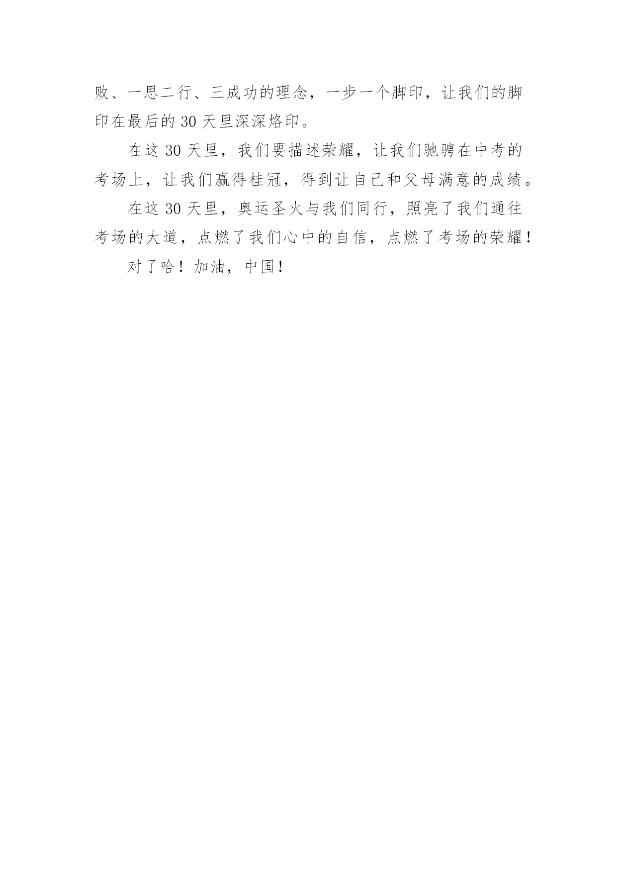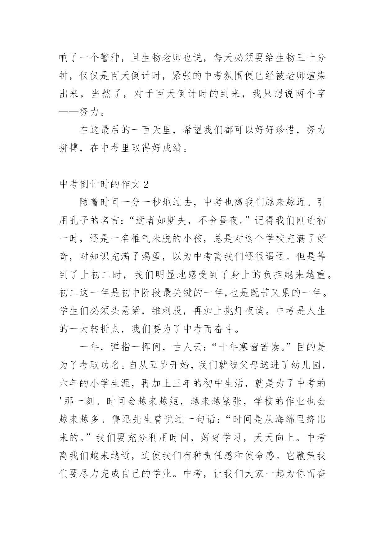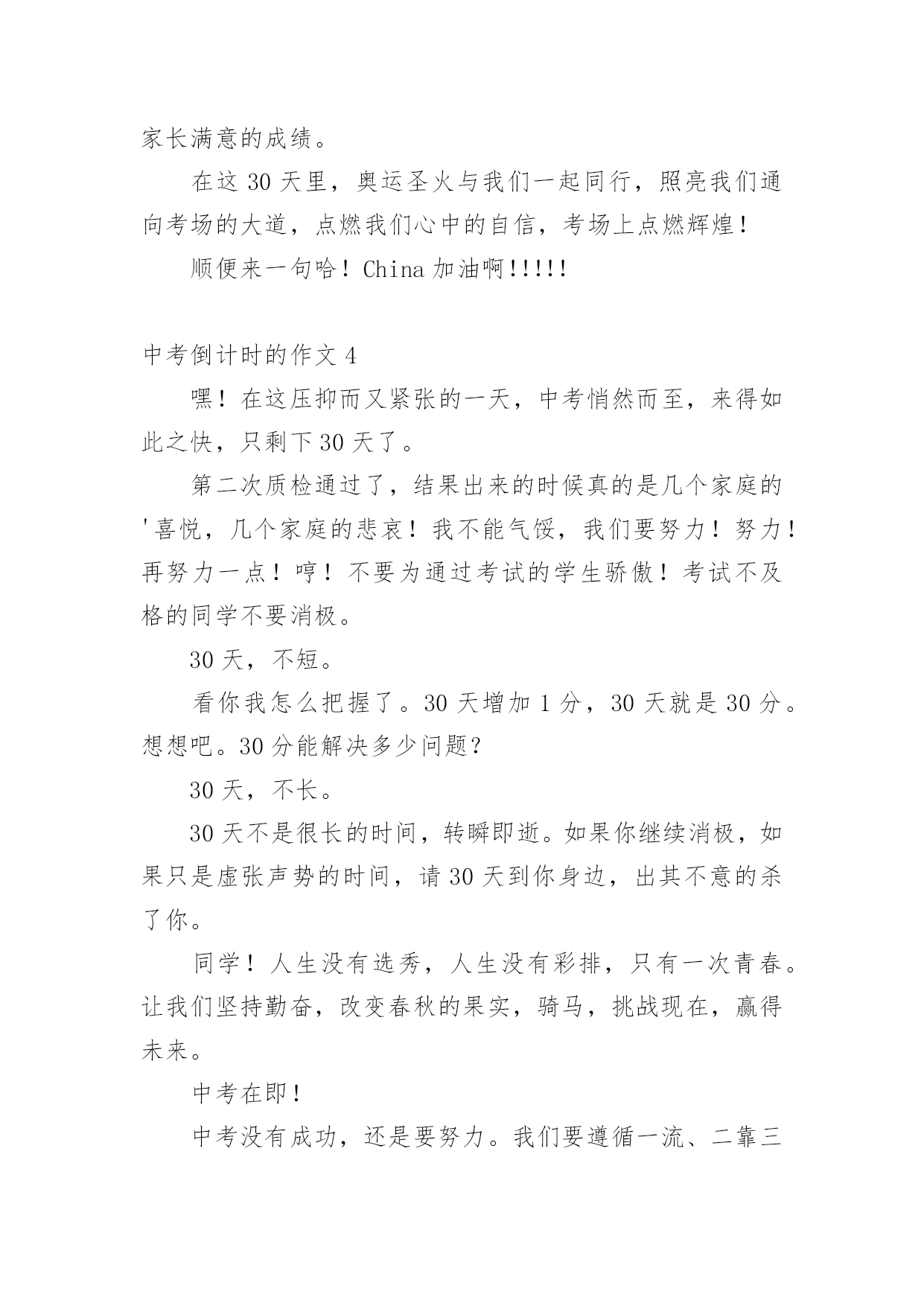 中考倒计时的作文在学习、工作、生活中,大家都不可避免地要接触到作文吧,借助作文可以提高我们的语言组织能力。那么你知道一篇好的作文该怎么写吗?以下是小编为大家整理的中考倒计时的作文,仅供参考,欢迎大家阅读。中考倒计时的作文1在不知不觉中,中考的脚步距离我们越来越近。开学不久,孙老师便告诉我们,距中考还有110天,起初我觉得孙老师有些小题大做,还剩下100多天啊!但是,随着复习计划不断推进,我也慢慢从中体会到了时间的紧迫,以及任务艰巨。下午上课时,前两节谢老师为我们放了一部老电影,由于画质不好,又没有字幕,再加上老师并不在班级里呆着,所以班里难免有些骚动。此后,孙老师因此事对我们进行了一场思想教育,并从中谈到了中考问题,仍同往常一样,孙老师进行着他的激情演讲,我也在底下写着我的作业。在孙老师说到距离中考仅剩一百天的.时候,我震惊的抬起头,有些不可思议。一百天?记得上回仍是富余的一百一十天啊,这不得不让我感叹时间的流逝是如此之快。百天倒计时作为中考的一个里程碑,同时也是我们努力的标志,或许有的同学仍会觉得一百天后的中考有些遥远,但是,十天后的一模已近在眼前啊!百天倒计时也为我们敲响了一个警种,且生物老师也说,每天必须要给生物三十分钟,仅仅是百天倒计时,紧张的中考氛围便已经被老师渲染出来,当然了,对于百天倒计时的到来,我只想说两个字——努力。在这最后的一百天里,希望我们都可以好好珍惜,努力拼搏,在中考里取得好成绩。中考倒计时的作文2随着时间一分一秒地过去,中考也离我们越来越近。引用孔子的名言:“逝者如斯夫,不舍昼夜。”记得我们刚进初一时,还是一名稚气未脱的小孩,总是对这个学校充满了好奇,对知识充满了渴望,以为中考离我们还很遥远。但是等到了上初二时,我们明显地感受到了身上的负担越来越重。初二这一年是初中阶段最关键的一年,也是既苦又累的一年。学生们必须头悬梁,锥刺股,再加上挑灯夜读。中考是人生的一大转折点,我们要为了中考而奋斗。一年,弹指一挥间,古人云:“十年寒窗苦读。”目的是为了考取功名。自从五岁开始,我们就被父母送进了幼儿园,六年的小学生涯,再加上三年的初中生活,就是为了中考的'那一刻。时间会越来越短,越来越紧张,学校的作业也会越来越多。鲁迅先生曾说过一句话:“时间是从海绵里挤出来的。”我们要充分利用时间,好好学习,天天向上。中考离我们越来越近,迫使我们有种责任感和使命感。它鞭策我们要尽力完成自己的学业。中考,让我们大家一起为你而奋斗!中考倒计时的作文3哎!在这充满压抑而又紧张的日子里,中考悄悄来临,它来的是那么的急促,还剩下短短的`30天。第2次质检已过,那结果一出,真是几家欢喜,几家愁啊!我不能气馁,我们要努力!努力!再努力!哼!考好了的同学不要骄傲!考差了的同学也不要消极。30天,不短。要看你我如何把握,30天,哪怕是一天增长1分,那么30天啊,那就是30分啊!你想啊,30分能解决多少问题啊?30天,不长。30天也并不长,转眼即逝,弹指一灰间。如果你继续消极下去,如果只是混混光阴,那就拜托,30天马上就到你的身边,杀你个措手不及。同学们!生命不打草稿,人生没有彩排,青春只有一次,让我们用勤奋坚持,换春华秋实,策马扬鞭,挑战现在,决胜未来。中考迫在眉睫!中考尚未成功,我们仍需努力。我们要本着一等二靠三落空,一想二干三成功的思想,迈好我们的每一步,让我们的脚印深深的印在这最后的30天里。在这30天里,我们要叙写辉煌,让我们驰骋在中考的考场上,让我们勇夺桂冠,考出令我们自己满意的成绩,令家长满意的成绩。在这30天里,奥运圣火与我们一起同行,照亮我们通向考场的大道,点燃我们心中的自信,考场上点燃辉煌!顺便来一句哈!China加油啊!!!!!中考倒计时的作文4嘿!在这压抑而又紧张的一天,中考悄然而至,来得如此之快,只剩下30天了。第二次质检通过了,结果出来的时候真的是几个家庭的'喜悦,几个家庭的悲哀!我不能气馁,我们要努力!努力!再努力一点!哼!不要为通过考试的学生骄傲!考试不及格的同学不要消极。30天,不短。看你我怎么把握了。30天增加1分,30天就是30分。想想吧。30分能解决多少问题?30天,不长。30天不是很长的时间,转瞬即逝。如果你继续消极,如果只是虚张声势的时间,请30天到你身边,出其不意的杀了你。同学!人生没有选秀,人生没有彩排,只有一次青春。让我们坚持勤奋,改变春秋的果实,骑马,挑战现在,赢得未来。中考在即!中考没有成功,还是要努力。我们要遵循一流、二靠三败、一思二行、三成功的理念,一步一个脚印,让我们的脚印在最后的30天里深深烙印。在这30天里,我们要描述荣耀,让我们驰骋在中考的考场上,让我们赢得桂冠,得到让自己和父母满意的成绩。在这30天里,奥运圣火与我们同行,照亮了我们通往考场的大道,点燃了我们心中的自信,点燃了