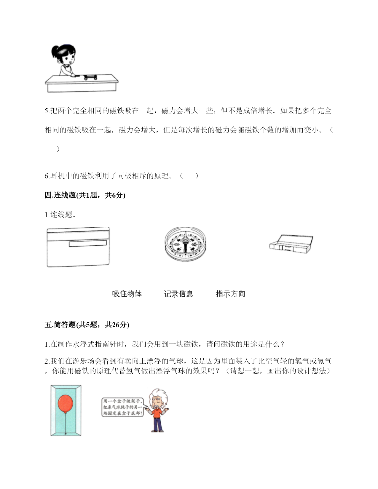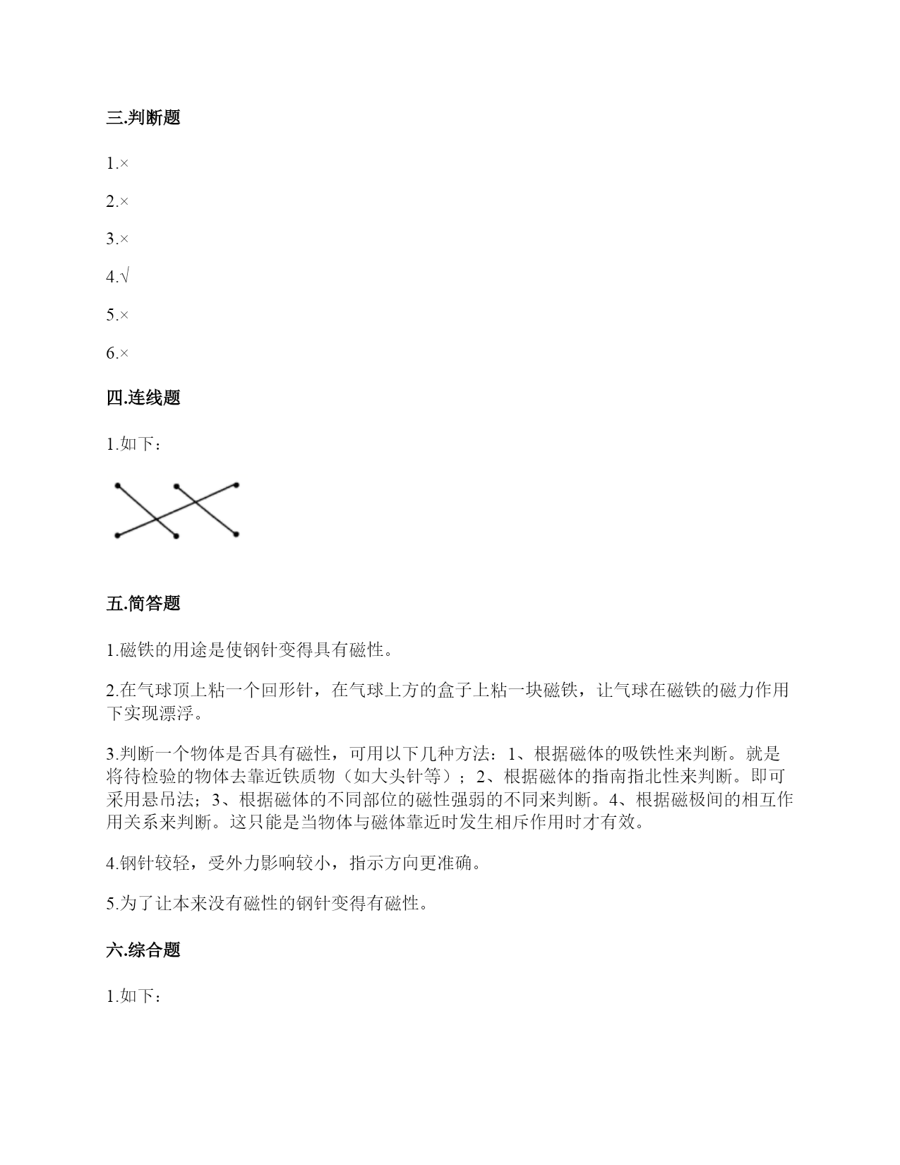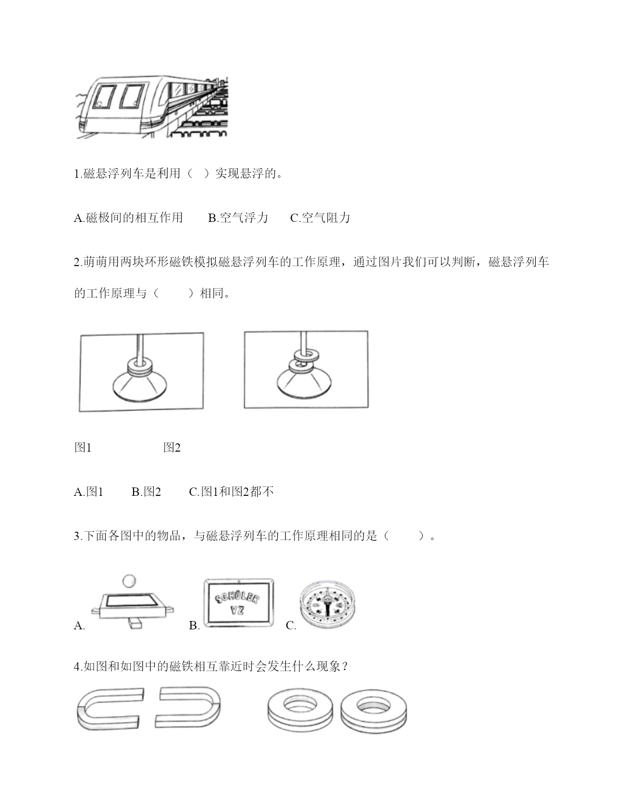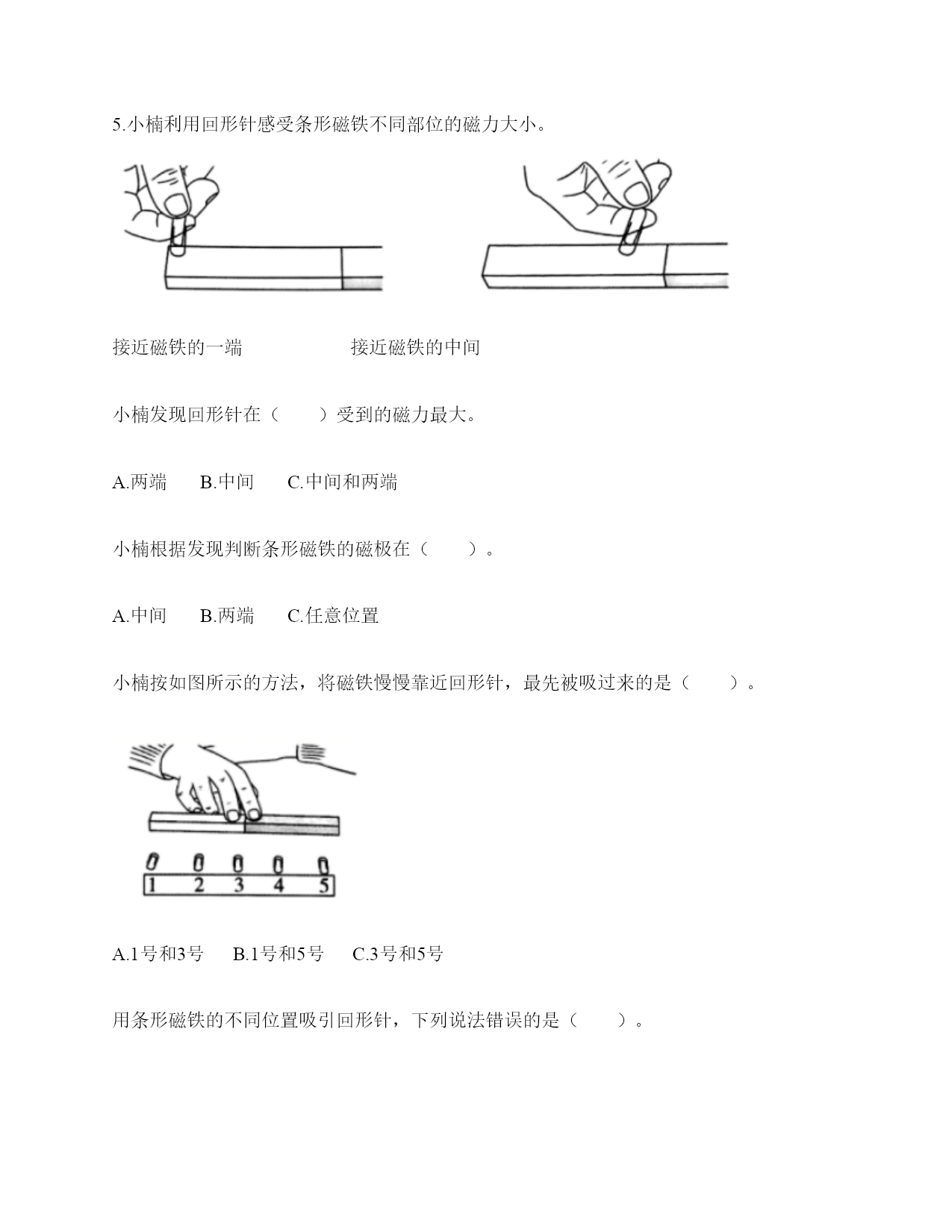 小学科学《磁铁》练习题一.选择题(共6题,共12分)1.如图所示,提出指南针的四种放置方法的科学家是()。A.张衡B.沈括C.祖冲之2.下列物体中,利用磁铁发声的是()A.B.C.3.关于条形磁铁,下列说法正确的是()。A.各个部分的磁力都一样大B.中心的部分叫做磁极C.可以把其他物体也变得具有磁性4.如图的条形磁铁磁力最强的部分是()。A.A和BB.B和CC.C和DD.A和D5.如图的铁粉盒里的磁铁的磁力是()强。A.左端B.右端C.两端6.在做“用磁铁的不同部位接触回形针”的实验时回形针一定要()。A.平覆在桌面上B.排列成一条直线C.怎么排列都可以二.填空题(共6题,共24分)1.磁铁上()的部分叫磁极,磁铁有两个磁极。指北的磁极叫北极(用字母()表示),指南的磁极叫南极(用字母()表示)。2.写出三种不同形状的磁铁的名字:()、()、()。3.()是我国古代四大发明之一,它是根据磁铁能够指示()的特点制成的。4.磁铁能隔着一些物体不太厚的物体也能吸()。5.磁铁的()色部分指向南方,()色部分指向北方。6.磁铁能够吸引()的性质叫磁性。三.判断题(共6题,共12分)1.磁铁可以在很远的地方把小车吸引过来。()2.磁铁同极相吸、异极相斥。()3.耳机中磁铁的主要作用是记录信息。()4.磁铁距离小车过远,不能使小车运动。()5.把两个完全相同的磁铁吸在一起,磁力会增大一些,但不是成倍增长。如果把多个完全相同的磁铁吸在一起,磁力会增大,但是每次增长的磁力会随磁铁个数的增加而变小。()6.耳机中的磁铁利用了同极相斥的原理。()四.连线题(共1题,共6分)1.连线题。五.简答题(共5题,共26分)1.在制作水浮式指南针时,我们会用到一块磁铁,请问磁铁的用途是什么?2.我们在游乐场会看到有卖向上漂浮的气球,这是因为里面装入了比空气轻的氢气或氦气,你能用磁铁的原理代替氢气做出漂浮气球的效果吗?(请想一想,画出你的设计想法)3.怎样检测物品中是否有磁铁?4.制作水浮式指南针时,我们用被磁化的钢针指示南北的。我们是因为钢针具有怎样的特点才选择它的?5.在制作水浮式指南针时,为什么要用磁铁摩擦钢针?六.综合题(共5题,共32分)1.下列哪些物体含有磁铁?把含有磁铁的物体圈出来。2.指南针是我国的四大发明之一,它是利用磁铁能够指示南北方向的特点而制成的。请根据图中指南针所指示的方向,标出四个场所所在的方向。游泳馆()学校()邮局()书店()3.磁悬浮列车由于其轨道的磁力使之悬浮在轨道上,行使时不需接触地面,因此只受来自空气的阻力。磁悬浮列车的最高速度可达每小时603公里。1.磁悬浮列车是利用()实现悬浮的。A.磁极间的相互作用B.空气浮力C.空气阻力2.萌萌用两块环形磁铁模拟磁悬浮列车的工作原理,通过图片我们可以判断,磁悬浮列车的工作原理与()相同。图1图2A.图1B.图2C.图1和图2都不3.下面各图中的物品,与磁悬浮列车的工作原理相同的是()。A.B.C.4.如图和如图中的磁铁相互靠近时会发生什么现象?5.小楠利用回形针感受条形磁铁不同部位的磁力大小。接近磁铁的一端接近磁铁的中间小楠发现回形针在()受到的磁力最大。A.两端B.中间C.中间和两端小楠根据发现判断条形磁铁的磁极在()。A.中间B.两端C.任意位置小楠按如图所示的方法,将磁铁慢慢靠近回形针,最先被吸过来的是()。A.1号和3号B.1号和5号C.3号和5号用条形磁铁的不同位置吸引回形针,下列说法错误的是()。A.a点吸引的回形针数量最少B.a点和e点吸引的回形针数量最多C.b点吸引的回形针数量比e点多参考答案一.选择题1.B2.C3.C4.D5.C6.B二.填空题1.磁力最强;N;S2.条形磁铁;环形磁铁;蹄形磁铁3.指南针;南北4.铁5.蓝;红6.铁三.判断题1.×2.×3.×4.√5.×6.×四.连线题1.如下:五.简答题1.磁铁的用途是使钢针变得具有磁性。2.在气球顶上粘一个回形针,在气球上方的盒子上粘一块磁铁,让气球在磁铁的磁力作用下实现漂浮。3.判断一个物体是否具有磁性,可用以下几种方法:1、根据磁体的吸铁性来判断。就是将待检验的物体去靠近铁质物(如大头针等);2、根据磁体的指南指北性来判断。即可采用悬吊法;3、根据磁体的不同部位的磁性强弱的不同来判断。4、根据磁极间的相互作用关系来判断。这只能是当物体与磁体靠近时发生相斥作用时才有效。4.钢针较轻,受外力影响较小,指示方向更准确。5.为了让本来没有磁性的钢针变得有磁性。六.综合题1.如下:2.东;南;北