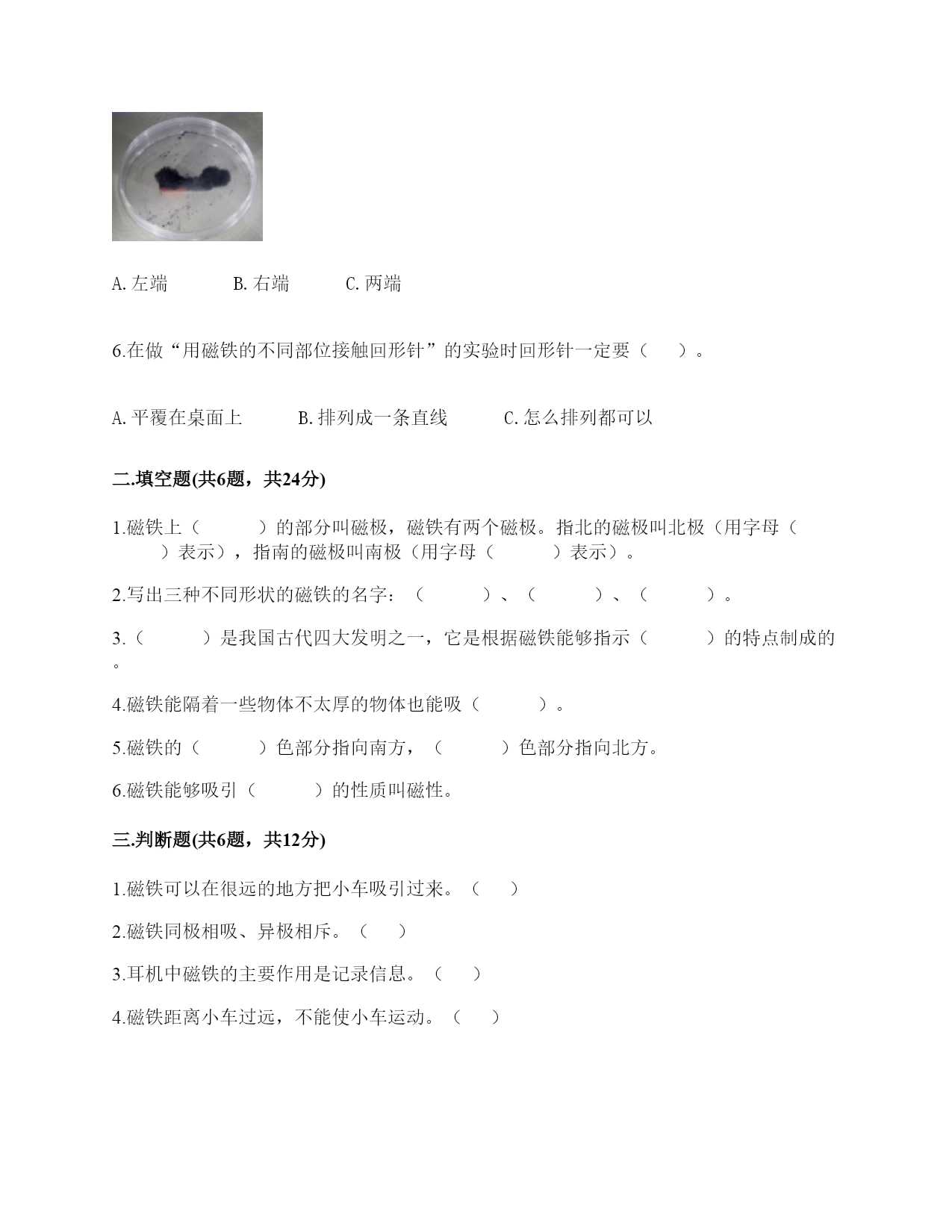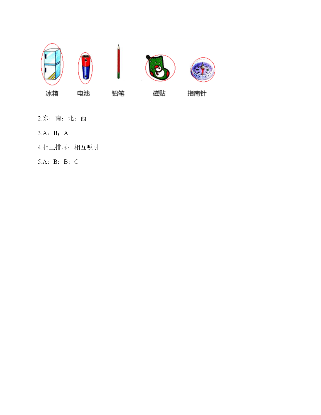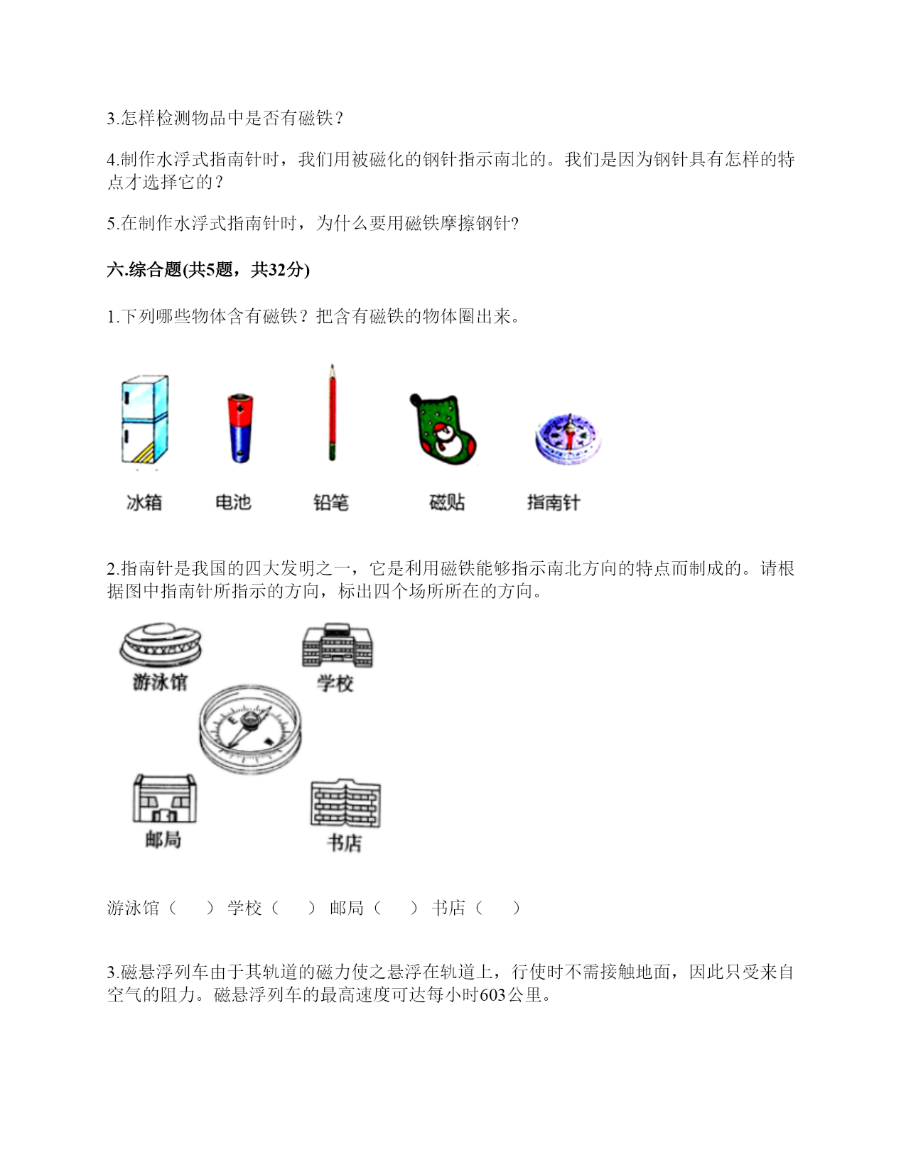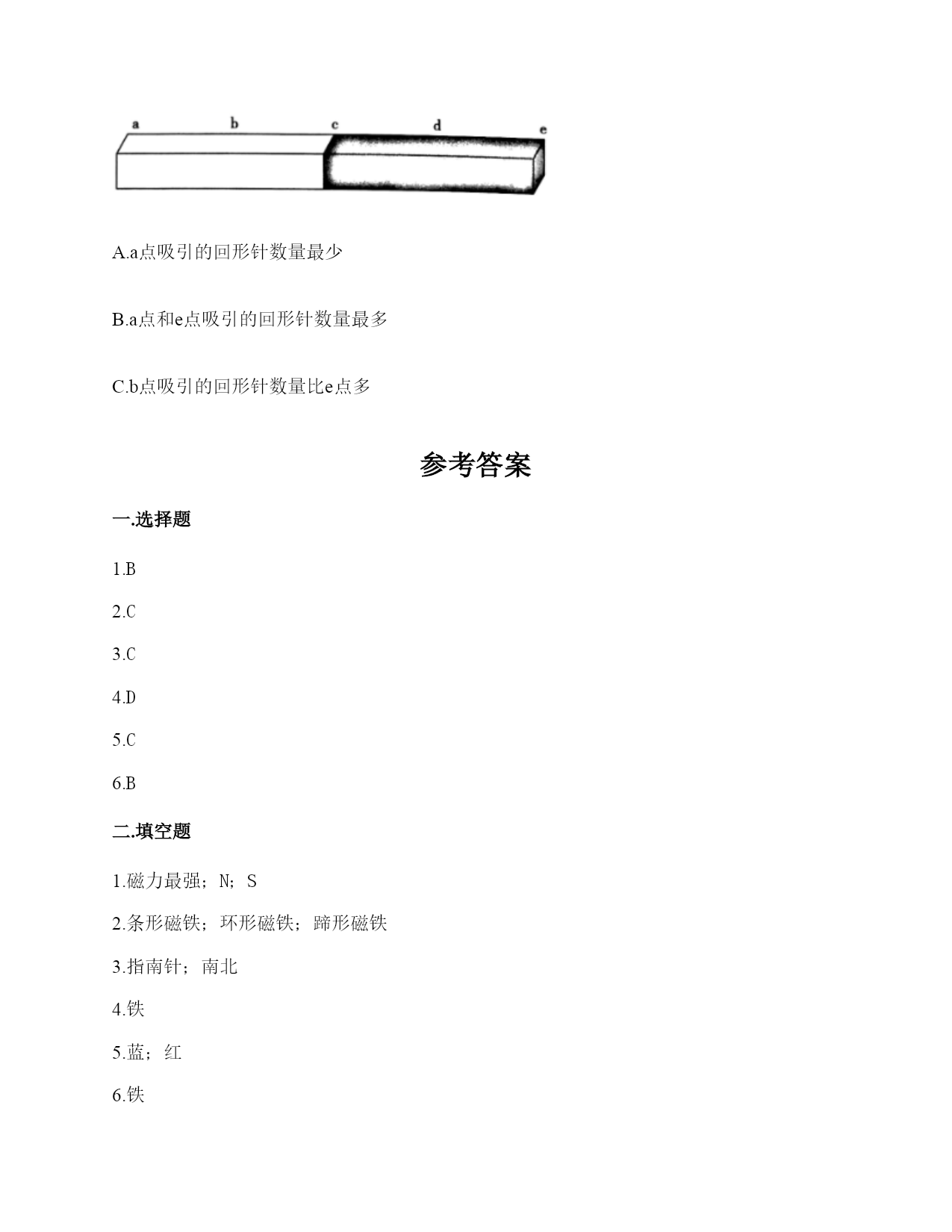 小学科学《磁铁》练习题一.选择题(共6题,共12分)1.如图所示,提出指南针的四种放置方法的科学家是()。A.张衡B.沈括C.祖冲之2.下列物体中,利用磁铁发声的是()A.B.C.3.关于条形磁铁,下列说法正确的是()。A.各个部分的磁力都一样大B.中心的部分叫做磁极C.可以把其他物体也变得具有磁性4.如图的条形磁铁磁力最强的部分是()。A.A和BB.B和CC.C和DD.A和D5.如图的铁粉盒里的磁铁的磁力是()强。A.左端B.右端C.两端6.在做“用磁铁的不同部位接触回形针”的实验时回形针一定要()。A.平覆在桌面上B.排列成一条直线C.怎么排列都可以二.填空题(共6题,共24分)1.磁铁上()的部分叫磁极,磁铁有两个磁极。指北的磁极叫北极(用字母()表示),指南的磁极叫南极(用字母()表示)。2.写出三种不同形状的磁铁的名字:()、()、()。3.()是我国古代四大发明之一,它是根据磁铁能够指示()的特点制成的。4.磁铁能隔着一些物体不太厚的物体也能吸()。5.磁铁的()色部分指向南方,()色部分指向北方。6.磁铁能够吸引()的性质叫磁性。三.判断题(共6题,共12分)1.磁铁可以在很远的地方把小车吸引过来。()2.磁铁同极相吸、异极相斥。()3.耳机中磁铁的主要作用是记录信息。()4.磁铁距离小车过远,不能使小车运动。()5.把两个完全相同的磁铁吸在一起,磁力会增大一些,但不是成倍增长。如果把多个完全相同的磁铁吸在一起,磁力会增大,但是每次增长的磁力会随磁铁个数的增加而变小。()6.耳机中的磁铁利用了同极相斥的原理。()四.连线题(共1题,共6分)1.连线题。五.简答题(共5题,共26分)1.在制作水浮式指南针时,我们会用到一块磁铁,请问磁铁的用途是什么?2.我们在游乐场会看到有卖向上漂浮的气球,这是因为里面装入了比空气轻的氢气或氦气,你能用磁铁的原理代替氢气做出漂浮气球的效果吗?(请想一想,画出你的设计想法)3.怎样检测物品中是否有磁铁?4.制作水浮式指南针时,我们用被磁化的钢针指示南北的。我们是因为钢针具有怎样的特点才选择它的?5.在制作水浮式指南针时,为什么要用磁铁摩擦钢针?六.综合题(共5题,共32分)1.下列哪些物体含有磁铁?把含有磁铁的物体圈出来。2.指南针是我国的四大发明之一,它是利用磁铁能够指示南北方向的特点而制成的。请根据图中指南针所指示的方向,标出四个场所所在的方向。游泳馆()学校()邮局()书店()3.磁悬浮列车由于其轨道的磁力使之悬浮在轨道上,行使时不需接触地面,因此只受来自空气的阻力。磁悬浮列车的最高速度可达每小时603公里。1.磁悬浮列车是利用()实现悬浮的。A.磁极间的相互作用B.空气浮力C.空气阻力2.萌萌用两块环形磁铁模拟磁悬浮列车的工作原理,通过图片我们可以判断,磁悬浮列车的工作原理与()相同。图1图2A.图1B.图2C.图1和图2都不3.下面各图中的物品,与磁悬浮列车的工作原理相同的是()。A.B.C.4.如图和如图中的磁铁相互靠近时会发生什么现象?5.小楠利用回形针感受条形磁铁不同部位的磁力大小。接近磁铁的一端接近磁铁的中间小楠发现回形针在()受到的磁力最大。A.两端B.中间C.中间和两端小楠根据发现判断条形磁铁的磁极在()。A.中间B.两端C.任意位置小楠按如图所示的方法,将磁铁慢慢靠近回形针,最先被吸过来的是()。A.1号和3号B.1号和5号C.3号和5号用条形磁铁的不同位置吸引回形针,下列说法错误的是()。A.a点吸引的回形针数量最少B.a点和e点吸引的回形针数量最多C.b点吸引的回形针数量比e点多参考答案一.选择题1.B2.C3.C4.D5.C6.B二.填空题1.磁力最强;N;S2.条形磁铁;环形磁铁;蹄形磁铁3.指南针;南北4.铁5.蓝;红6.铁三.判断题1.×2.×3.×4.√5.×6.×四.连线题1.如下:五.简答题1.磁铁的用途是使钢针变得具有磁性。2.在气球顶上粘一个回形针,在气球上方的盒子上粘一块磁铁,让气球在磁铁的磁力作用下实现漂浮。3.判断一个物体是否具有磁性,可用以下几种方法:1、根据磁体的吸铁性来判断。就是将待检验的物体去靠近铁质物(如大头针等);2、根据磁体的指南指北性来判断。即可采用悬吊法;3、根据磁体的不同部位的磁性强弱的不同来判断。4、根据磁极间的相互作用关系来判断。这只能是当物体与磁体靠近时发生相斥作用时才有效。4.钢针较轻,受外力影响较小,指示方向更准确。5.为了让本来没有磁性的钢针变得有磁性。六.综合题1.如下:2.东;南;北