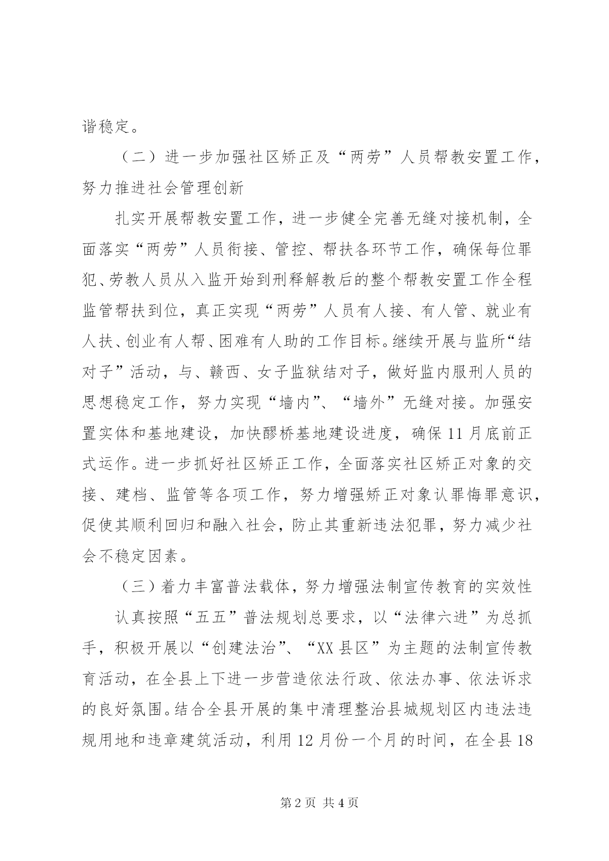 第PAGE\*Arabic\*MERGEFORMAT4页共NUMPAGES\*MERGEFORMAT4页司法局XX县区活动方案一、指导思想坚持以邓小平理论和“三个代表”重要思想为指导,全面落实科学发展观,按照市、县综治委提出的全面建设省级“XX县区”的要求,紧紧围绕县委、县政府的中心工作,充分发挥司法行政职能作用,以加强矛盾纠纷排查调处工作为重点,以提高公众安全感为目标,努力推进司法行政各项工作全面发展,为全县经济发展、社会和谐稳定提供优质高效的法律服务和法律保障。二、工作任务(一)坚持调解优先原则,努力预防化解矛盾纠纷牢固树立调解也是执法的理念,坚持调解优先原则,把矛盾纠纷排查化解的重心放在基层,努力做到“小事不出村,大事不出乡,矛盾不上交”。10月底至11月底,利用一个月的时间,县局组织司法所人员及乡、村人民调解员开展一次矛盾纠纷集中大排查大化解活动,集中人力物力化解一批多年积累及新发生的矛盾纠纷。进一步加强人民调解制度化、规范化、法制化建设,着力提高人民调解质量和公信力,努力构建完善人民、行政、司法三种调解相互衔接配合的大调解工作格局。县局及各乡镇司法所要积极参与全县性的重大矛盾纠纷和医患纠纷调处,积极协助县委、县政府及当地党委、政府妥善处置信访问题和群体性事件,努力把矛盾纠纷排查调处的各项工作落到实处,确保全县社会和谐稳定。(二)进一步加强社区矫正及“两劳”人员帮教安置工作,努力推进社会管理创新扎实开展帮教安置工作,进一步健全完善无缝对接机制,全面落实“两劳”人员衔接、管控、帮扶各环节工作,确保每位罪犯、劳教人员从入监开始到刑释解教后的整个帮教安置工作全程监管帮扶到位,真正实现“两劳”人员有人接、有人管、就业有人扶、创业有人帮、困难有人助的工作目标。继续开展与监所“结对子”活动,与、赣西、女子监狱结对子,做好监内服刑人员的思想稳定工作,努力实现“墙内”、“墙外”无缝对接。加强安置实体和基地建设,加快醪桥基地建设进度,确保11月底前正式运作。进一步抓好社区矫正工作,全面落实社区矫正对象的交接、建档、监管等各项工作,努力增强矫正对象认罪悔罪意识,促使其顺利回归和融入社会,防止其重新违法犯罪,努力减少社会不稳定因素。(三)着力丰富普法载体,努力增强法制宣传教育的实效性认真按照“五五”普法规划总要求,以“法律六进”为总抓手,积极开展以“创建法治”、“XX县区”为主题的法制宣传教育活动,在全县上下进一步营造依法行政、依法办事、依法诉求的良好氛围。结合全县开展的集中清理整治县城规划区内违法违规用地和违章建筑活动,利用12月份一个月的时间,在全县18个乡镇组织开展以“加强法制宣传教育,促进社会矛盾化解”为主题的巡回宣传活动,积极引导广大群众依法表达利益诉求,维护合法权益,促进社会矛盾的化解。进一步加强和完善法制宣传长廊、农村普法图书角等普法阵地,充分发挥各种普法阵地作用,努力扩大法制宣传的受众面和影响力,进一步提高全县广大干部群众的法制观念和法律素质。(四)着力开展公众安全感测评进村入户宣传活动,努力提升群众满意度为进一步提高全县群众对我县政法综治工作的满意度,促进我局及全县公众安全感测评指数在全省排位有较大的前移。自10月25开始至12月上旬,组织全体司法行政系统人员深入全县18个乡镇开展公众安全感测评进村入户宣传活动,并与“三民”活动结合起来,每家每户进行走访,重点走访固定电话户,免费发放宣传资料,主动征求群众意见,帮助群众解决生产、生活中遇到的各种困难和问题,对少数有不满情绪的群众,认真做好宣传教育和疏导解释工作,努力促使我县各种矛盾数量下降,非正常访、集体访数量下降,群众满意度得到更有效的提升。三、组织领导为确保我局创建省级“XX县区”工作的顺利开展,县局成立创建省级“XX县区”工作领导小组,各乡镇司法所也要安排专人具体负责此项工作,确保省级“XX县区”创建工作取得明显成效。