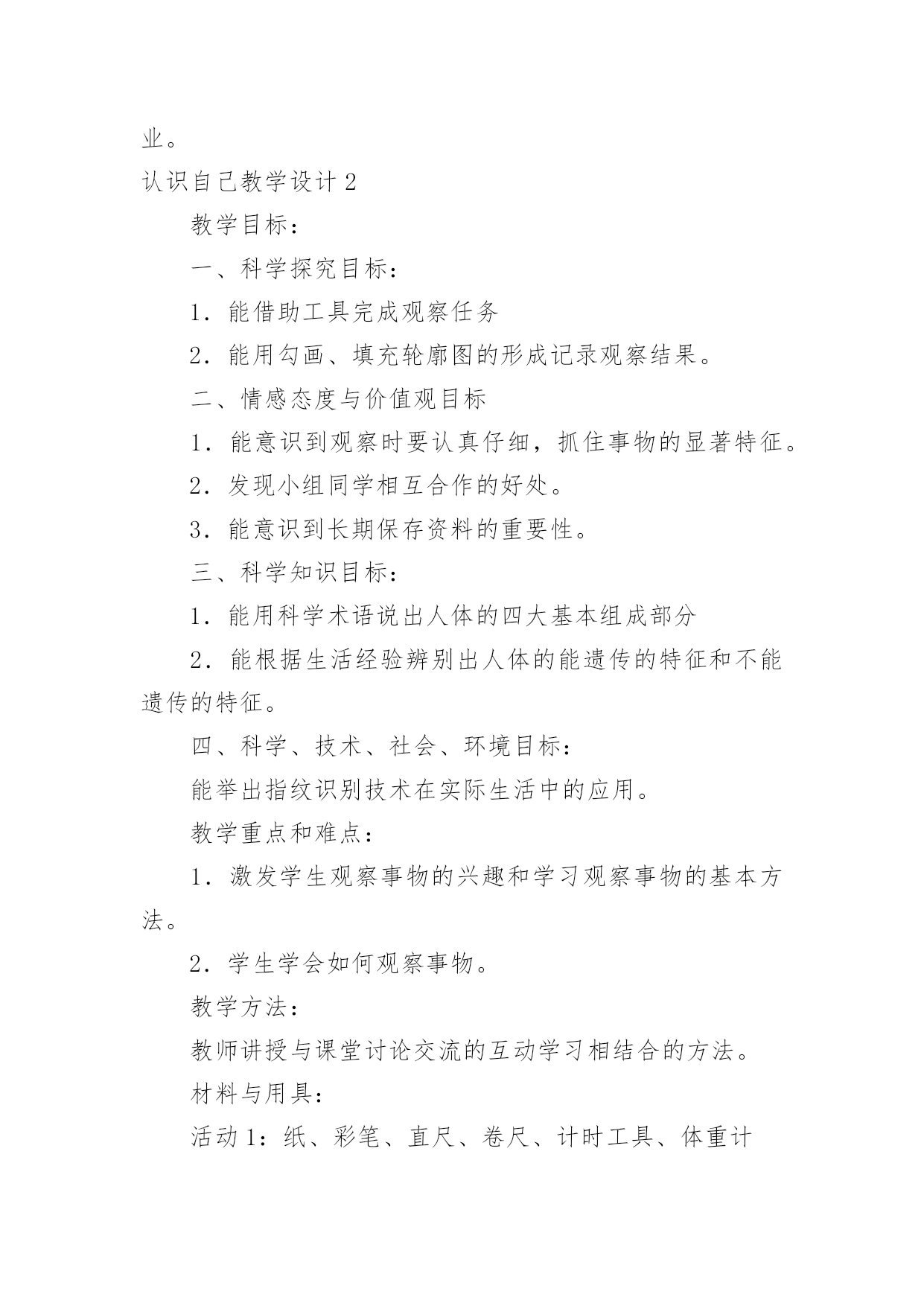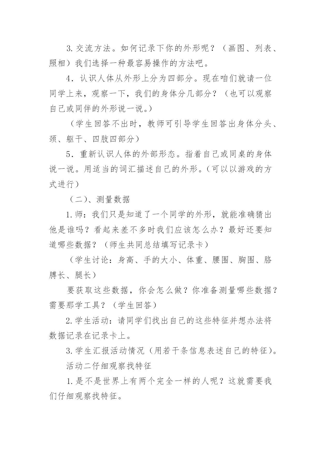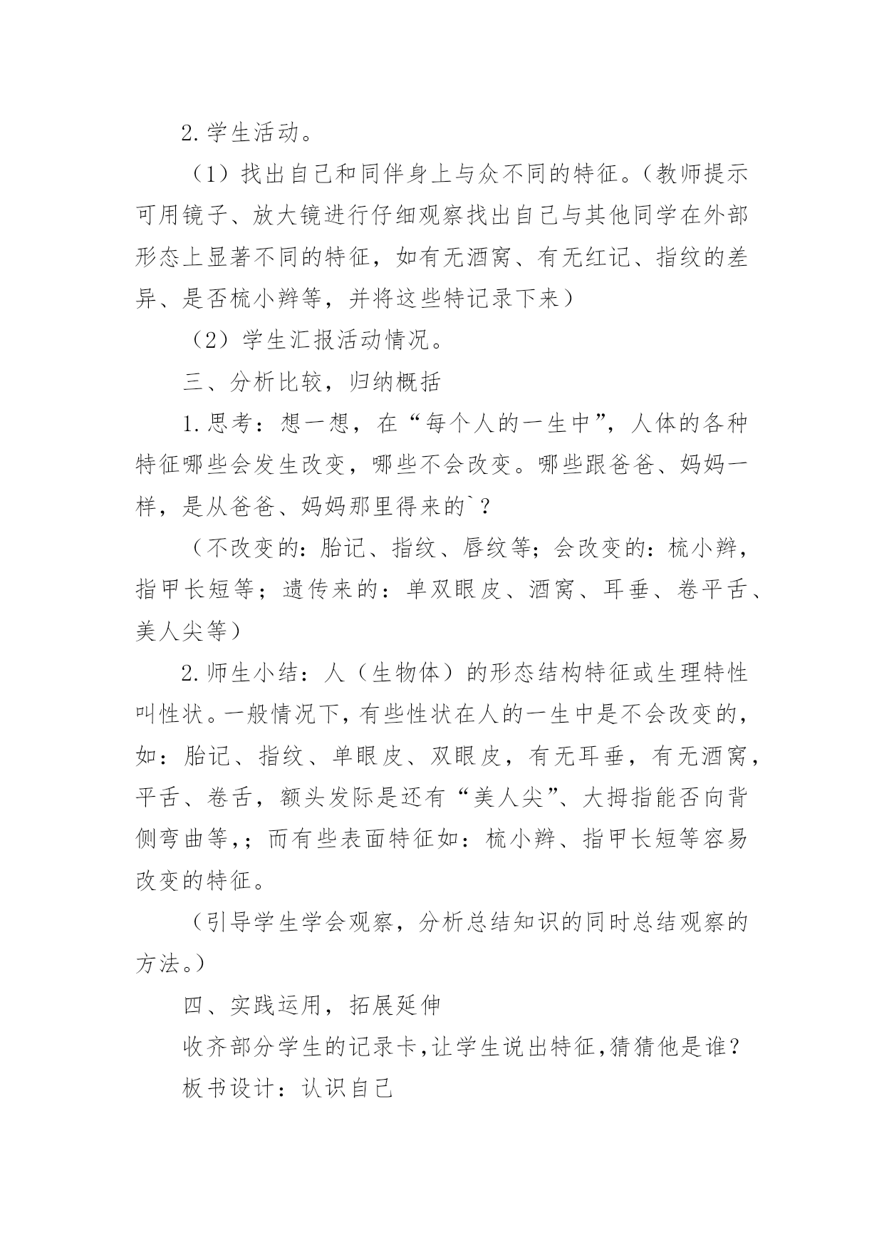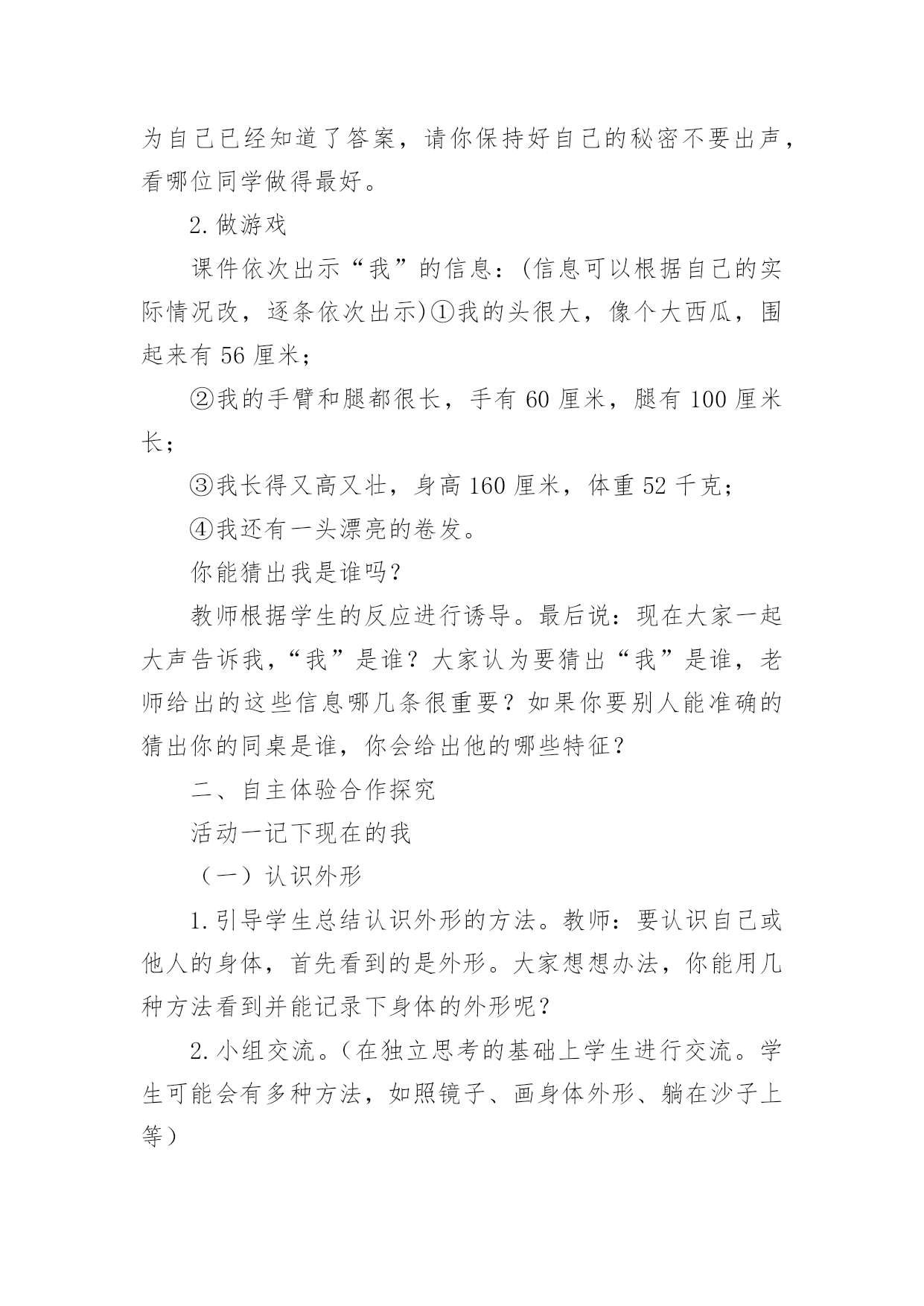 认识自己教学设计认识自己教学设计作为一名专为他人授业解惑的人民教师,通常需要准备好一份教学设计,教学设计要遵循教学过程的基本规律,选择教学目标,以解决教什么的问题。你知道什么样的教学设计才能切实有效地帮助到我们吗?以下是小编收集整理的认识自己教学设计,欢迎大家分享。认识自己教学设计1教材分析本课意在引导学生认识每个人都有巨大的潜能,以帮助学生增强自信心,为达成目标奠定基础,然后通过与学生一起探讨发掘潜能的方法,提高学生实际应用的水平和能力,所以本课教学重点是要学生掌握发掘潜能的方法并在实际生活中学会运用。本课教学的难点是要让学生怎么样才能认识自己的潜能学情分析农村中学的学生留守儿童居多,家庭教育缺失,学生水平参差不齐,好多学生不能正确的认识自己,也总认为自己不如别人,深深地影响了他们的成长,因此通过教学积极引导学生认识到自己巨大的潜在力,给他们更多的信心和勇气从而根据自身实际确定努力目标,并付出实际行动。通过对发掘潜能的.方法的探讨提高学生实际运用的水平,为战胜自我奠定基础。教学目标(一)知识目标:1.了1.了解每个人都有巨大的潜能,且是多方面的。2.掌握发掘潜能的方法。(二)能力目标:1.提高发现1.提高认识和发掘潜能的能力,增强克服困难的能力。2.提高激励自我,超越自我的能力(三)情感、态度、价值观目标:1.通过学习,让他们感受到潜力的巨大,从而树立自尊自信,乐观坚强,积极向上等优秀品质2.通过教学使学生充分的感受到发掘自身潜能的重要性,激发他们战胜自我,超越自我的热情、信心和能力教学重点和难点教学重点:要学生掌握发掘潜能的方法并在实际生活中学会运用教学难点:要让学生怎么样才能认识自己的潜能教学过程新课导入——→通过活动,让学生认识到每个人都有着巨大的潜能,并理解发现潜能是取得成功的重要条件——→然后与学生共同探讨自己具有巨大潜能的科学依据,并进一步掌握一些发掘潜能的方法——→课堂小结——→布置作业。认识自己教学设计2教学目标:一、科学探究目标:1.能借助工具完成观察任务2.能用勾画、填充轮廓图的形成记录观察结果。二、情感态度与价值观目标1.能意识到观察时要认真仔细,抓住事物的显著特征。2.发现小组同学相互合作的好处。3.能意识到长期保存资料的重要性。三、科学知识目标:1.能用科学术语说出人体的四大基本组成部分2.能根据生活经验辨别出人体的能遗传的特征和不能遗传的特征。四、科学、技术、社会、环境目标:能举出指纹识别技术在实际生活中的应用。教学重点和难点:1.激发学生观察事物的兴趣和学习观察事物的基本方法。2.学生学会如何观察事物。教学方法:教师讲授与课堂讨论交流的互动学习相结合的方法。材料与用具:活动1:纸、彩笔、直尺、卷尺、计时工具、体重计活动2:镜子、放大镜课时安排:2课时第一课时教学目标知识与技能1.能借助工具完成观察任务2.能用合适的方法(如勾画轮廓图、科学小卡片等)记录观察结果;情感态度与价值观目标。1.发现小组同学合作的好处2.能意识到观察时要认真仔细,抓住事物的显著特征;3.能意识到长期保存资料的重要性。科学知识目标1.能用科学术语说出人体的四大基本组成部分教学重点、难点1.能意识到观察时要认真仔细,抓住事物的显著特征;2.能较准确的用图和语言文字描述身体的特征,能用合适的形式记录观察结果。教具准备。尺子、镜子、放大镜、台秤、卷尺、绳子、计时工具、体重计教学过程一、创设情境,提出问题利用游戏引入探究,提出探究问题1.游戏简介:今天我们首先来做一个“猜猜我是谁”的游戏(简介游戏内容)。当老师给出某条信息后,如果你认为自己已经知道了答案,请你保持好自己的秘密不要出声,看哪位同学做得最好。2.做游戏课件依次出示“我”的信息:(信息可以根据自己的实际情况改,逐条依次出示)①我的头很大,像个大西瓜,围起来有56厘米;②我的手臂和腿都很长,手有60厘米,腿有100厘米长;③我长得又高又壮,身高160厘米,体重52千克;④我还有一头漂亮的卷发。你能猜出我是谁吗?教师根据学生的反应进行诱导。最后说:现在大家一起大声告诉我,“我”是谁?大家认为要猜出“我”是谁,老师给出的这些信息哪几条很重要?如果你要别人能准确的猜出你的同桌是谁,你会给出他的哪些特征?二、自主体验合作探究活动一记下现在的我(一)认识外形1.引导学生总结认识外形的方法。教师:要认识自己或他人的身体,首先看到的是外形。大家想想办法,你能用几种方法看到并能记录下身体的外形呢?2.小组交流。(在独立思考的基础上学生进行交流。学生可能会有多种方法,如照镜子、画身体外形、躺在沙子上等)3.交流方法。如何记录下你的外形呢?(画图、列表、照相)我们选择一种最容易操作的方法吧。4.认识人体从外形上分为四部分。现在咱们就请一位同学上来,观察一下,我们的身体分几部分?(也可以观
