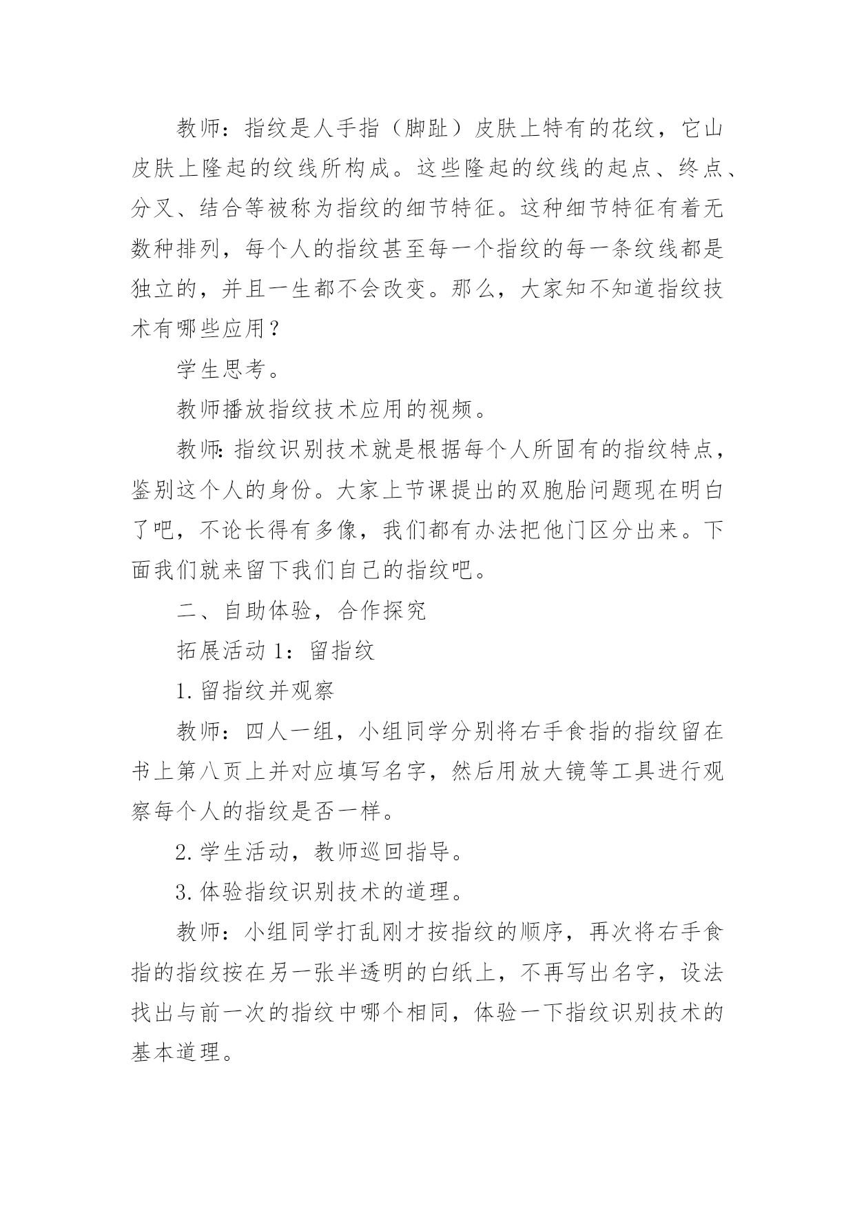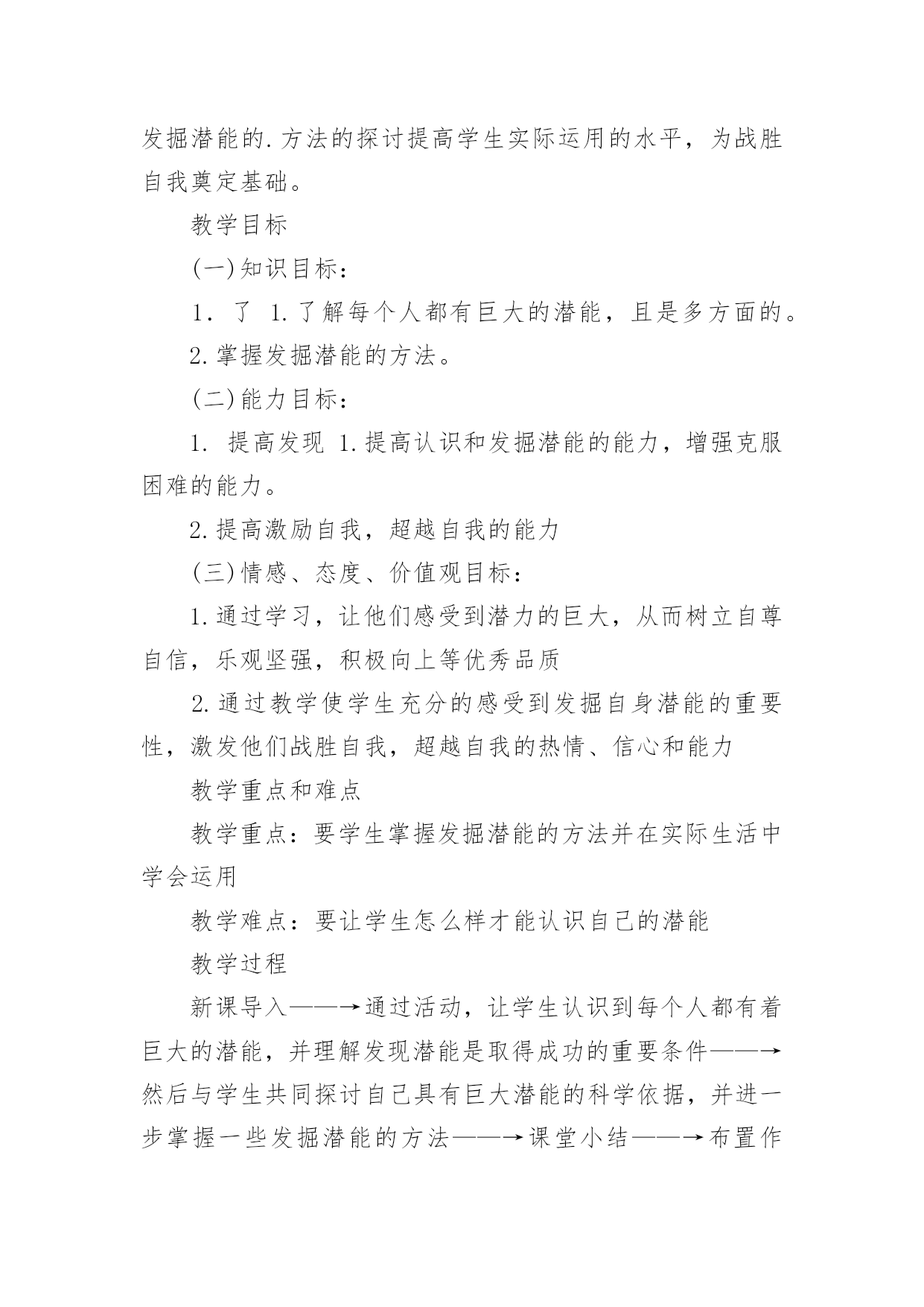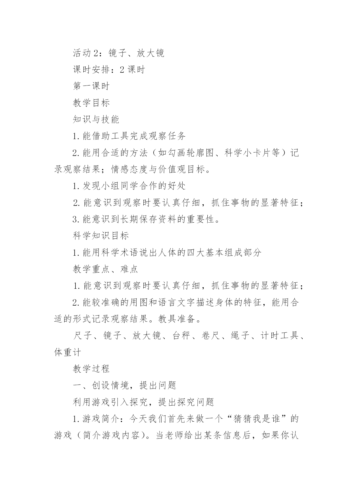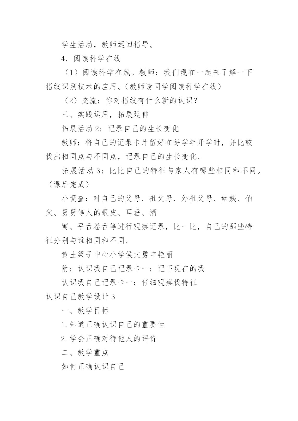 认识自己教学设计认识自己教学设计作为一名专为他人授业解惑的人民教师,通常需要准备好一份教学设计,教学设计要遵循教学过程的基本规律,选择教学目标,以解决教什么的问题。你知道什么样的教学设计才能切实有效地帮助到我们吗?以下是小编收集整理的认识自己教学设计,欢迎大家分享。认识自己教学设计1教材分析本课意在引导学生认识每个人都有巨大的潜能,以帮助学生增强自信心,为达成目标奠定基础,然后通过与学生一起探讨发掘潜能的方法,提高学生实际应用的水平和能力,所以本课教学重点是要学生掌握发掘潜能的方法并在实际生活中学会运用。本课教学的难点是要让学生怎么样才能认识自己的潜能学情分析农村中学的学生留守儿童居多,家庭教育缺失,学生水平参差不齐,好多学生不能正确的认识自己,也总认为自己不如别人,深深地影响了他们的成长,因此通过教学积极引导学生认识到自己巨大的潜在力,给他们更多的信心和勇气从而根据自身实际确定努力目标,并付出实际行动。通过对发掘潜能的.方法的探讨提高学生实际运用的水平,为战胜自我奠定基础。教学目标(一)知识目标:1.了1.了解每个人都有巨大的潜能,且是多方面的。2.掌握发掘潜能的方法。(二)能力目标:1.提高发现1.提高认识和发掘潜能的能力,增强克服困难的能力。2.提高激励自我,超越自我的能力(三)情感、态度、价值观目标:1.通过学习,让他们感受到潜力的巨大,从而树立自尊自信,乐观坚强,积极向上等优秀品质2.通过教学使学生充分的感受到发掘自身潜能的重要性,激发他们战胜自我,超越自我的热情、信心和能力教学重点和难点教学重点:要学生掌握发掘潜能的方法并在实际生活中学会运用教学难点:要让学生怎么样才能认识自己的潜能教学过程新课导入——→通过活动,让学生认识到每个人都有着巨大的潜能,并理解发现潜能是取得成功的重要条件——→然后与学生共同探讨自己具有巨大潜能的科学依据,并进一步掌握一些发掘潜能的方法——→课堂小结——→布置作业。认识自己教学设计2教学目标:一、科学探究目标:1.能借助工具完成观察任务2.能用勾画、填充轮廓图的形成记录观察结果。二、情感态度与价值观目标1.能意识到观察时要认真仔细,抓住事物的显著特征。2.发现小组同学相互合作的好处。3.能意识到长期保存资料的重要性。三、科学知识目标:1.能用科学术语说出人体的四大基本组成部分2.能根据生活经验辨别出人体的能遗传的特征和不能遗传的特征。四、科学、技术、社会、环境目标:能举出指纹识别技术在实际生活中的应用。教学重点和难点:1.激发学生观察事物的兴趣和学习观察事物的基本方法。2.学生学会如何观察事物。教学方法:教师讲授与课堂讨论交流的互动学习相结合的方法。材料与用具:活动1:纸、彩笔、直尺、卷尺、计时工具、体重计活动2:镜子、放大镜课时安排:2课时第一课时教学目标知识与技能1.能借助工具完成观察任务2.能用合适的方法(如勾画轮廓图、科学小卡片等)记录观察结果;情感态度与价值观目标。1.发现小组同学合作的好处2.能意识到观察时要认真仔细,抓住事物的显著特征;3.能意识到长期保存资料的重要性。科学知识目标1.能用科学术语说出人体的四大基本组成部分教学重点、难点1.能意识到观察时要认真仔细,抓住事物的显著特征;2.能较准确的用图和语言文字描述身体的特征,能用合适的形式记录观察结果。教具准备。尺子、镜子、放大镜、台秤、卷尺、绳子、计时工具、体重计教学过程一、创设情境,提出问题利用游戏引入探究,提出探究问题1.游戏简介:今天我们首先来做一个“猜猜我是谁”的游戏(简介游戏内容)。当老师给出某条信息后,如果你认为自己已经知道了答案,请你保持好自己的秘密不要出声,看哪位同学做得最好。2.做游戏课件依次出示“我”的信息:(信息可以根据自己的实际情况改,逐条依次出示)①我的头很大,像个大西瓜,围起来有56厘米;②我的手臂和腿都很长,手有60厘米,腿有100厘米长;③我长得又高又壮,身高160厘米,体重52千克;④我还有一头漂亮的卷发。你能猜出我是谁吗?教师根据学生的反应进行诱导。最后说:现在大家一起大声告诉我,“我”是谁?大家认为要猜出“我”是谁,老师给出的这些信息哪几条很重要?如果你要别人能准确的猜出你的同桌是谁,你会给出他的哪些特征?二、自主体验合作探究活动一记下现在的我(一)认识外形1.引导学生总结认识外形的方法。教师:要认识自己或他人的身体,首先看到的是外形。大家想想办法,你能用几种方法看到并能记录下身体的外形呢?2.小组交流。(在独立思考的基础上学生进行交流。学生可能会有多种方法,如照镜子、画身体外形、躺在沙子上等)3.交流方法。如何记录下你的外形呢?(画图、列表、照相)我们选择一种最容易操作的方法吧。4.认识人体从外形上分为四部分。现在咱们就请一位同学上来,观察一下,我们的身体分几部分?(也可以观