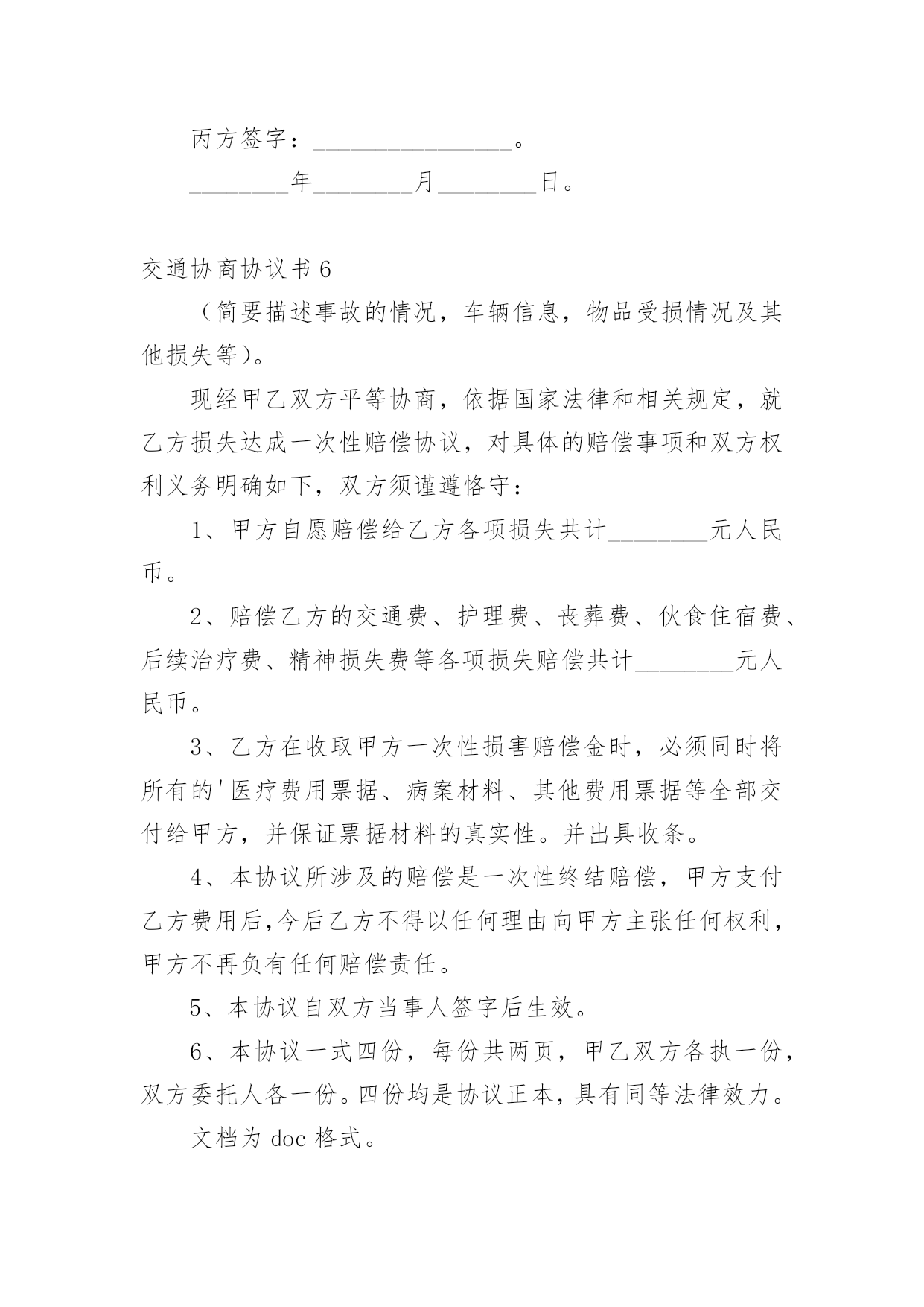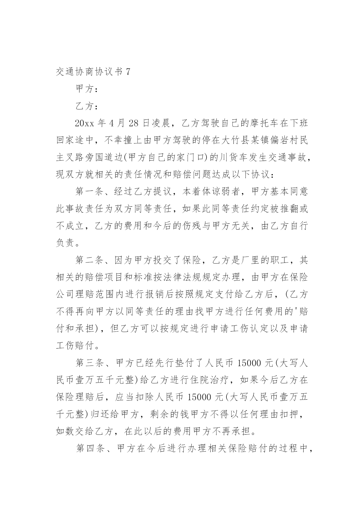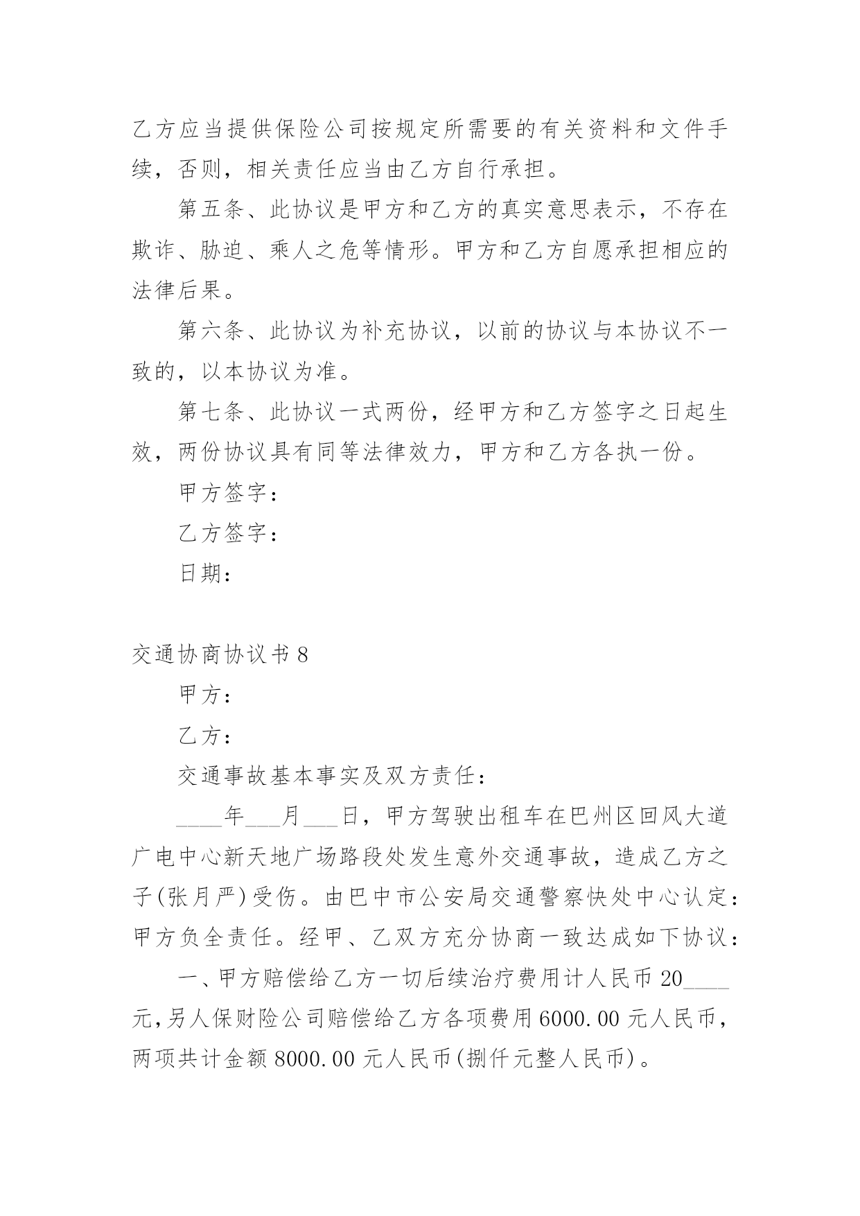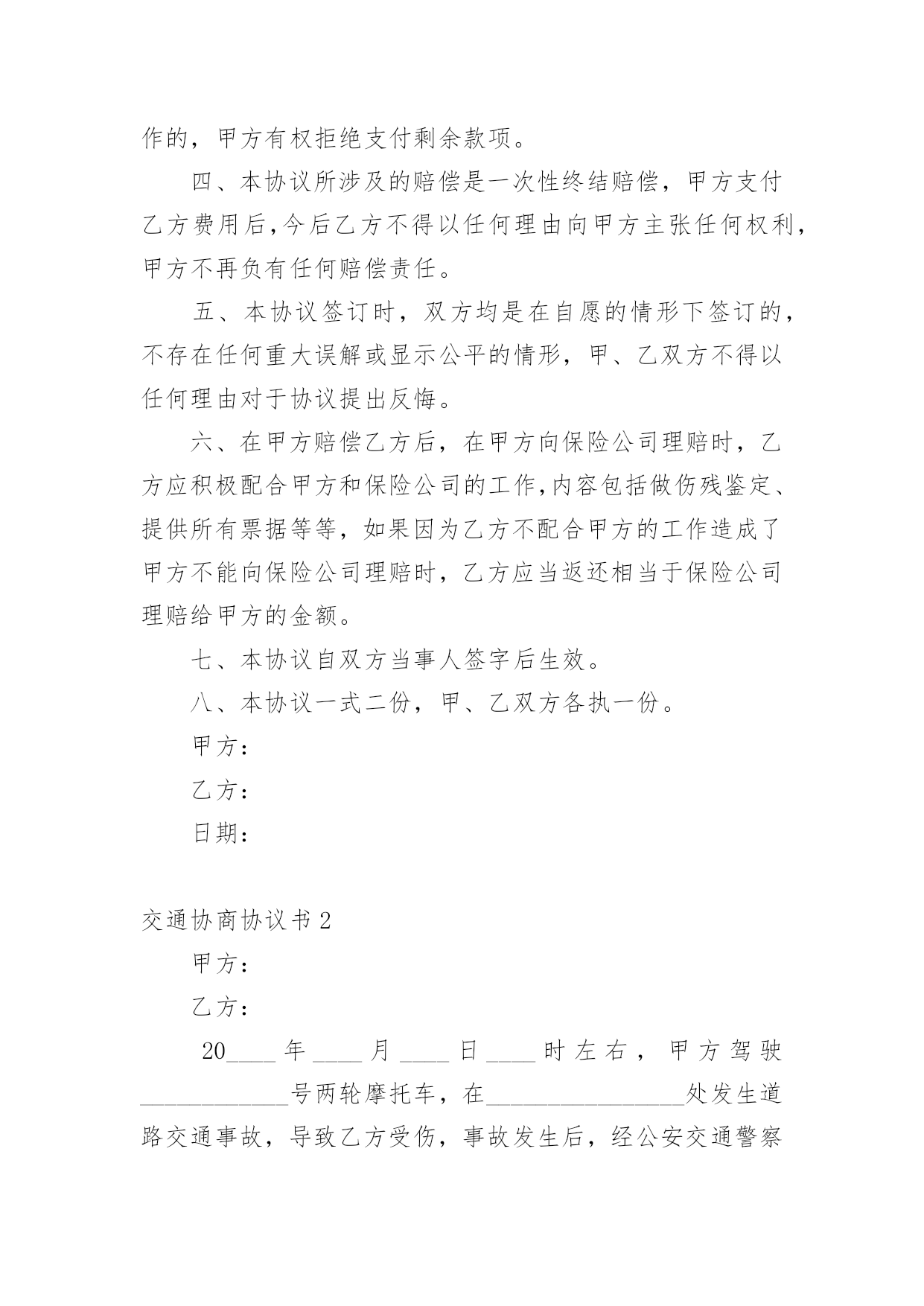 交通协商协议书交通协商协议书经典(11篇)在生活中,协议的使用成为日常生活的常态,协议的签订是双方或数方之间权利义务的最好规范。那么写协议真的很难吗?下面是小编为大家收集的交通协商协议书,仅供参考,欢迎大家阅读。交通协商协议书1甲方:乙方:于xxxx年xx月xx日,甲方驾驶xx号与在xx地段与乙方驾驶的xx号车发生碰撞,造成两车损坏的道路交通事故。现经甲、乙双方充分协商一致达成如下协议:一、元人民币(元)。二、损失赔偿项目包括乙方的医疗费、误工费、护理费、交通费、住宿费、住院期间伙食补助费、营养费、残疾赔偿金、残疾辅助器具费、丧葬费、被扶养人生活费、死亡赔偿金、精神损害抚慰金、等各项损失赔偿。(可按实际情况选择项目)。三、本协议签定时,甲方支付乙方xxxx。xx元,余款在乙方配合甲方向保险公司理赔后,支付给乙方。乙方的'具体配合工作是指本协议第六条的约定。乙方不配合甲方工作的,甲方有权拒绝支付剩余款项。四、本协议所涉及的赔偿是一次性终结赔偿,甲方支付乙方费用后,今后乙方不得以任何理由向甲方主张任何权利,甲方不再负有任何赔偿责任。五、本协议签订时,双方均是在自愿的情形下签订的,不存在任何重大误解或显示公平的情形,甲、乙双方不得以任何理由对于协议提出反悔。六、在甲方赔偿乙方后,在甲方向保险公司理赔时,乙方应积极配合甲方和保险公司的工作,内容包括做伤残鉴定、提供所有票据等等,如果因为乙方不配合甲方的工作造成了甲方不能向保险公司理赔时,乙方应当返还相当于保险公司理赔给甲方的金额。七、本协议自双方当事人签字后生效。八、本协议一式二份,甲、乙双方各执一份。甲方:乙方:日期:交通协商协议书2甲方:乙方:20____年____月____日____时左右,甲方驾驶____________号两轮摩托车,在________________处发生道路交通事故,导致乙方受伤,事故发生后,经公安交通警察大队________号《交通事故认定书》认定:甲方负此事故的主要责任,乙方负此事故的`次要责任。现甲方和乙方经友好协商,本着平等、自愿、公平的原则,达成协议如下:一、甲方一次性赔偿乙方医疗费、误工费、营养费、伙食补助费、交通费、护理费、被抚养人生活费、精神损害抚慰金、一次性伤残赔偿金、后续治疗费等各项赔偿款共计人民币(大写):____________圆整(________________元整)。三、乙方在收取甲方一次性损害赔偿金时,必须同时将所有的医疗费用票据、病案材料、其他费用票据等全部交付给甲方,并保证票据材料的真实性。五、本协议甲乙双方已全文阅读并理解无误,甲乙双方完全明白本协议内容所涉及后果,一经签署甲乙双方均不得反悔。六、本协议一式三份,甲乙双方各执一份,自双方签字按手印后生效。双方均承诺且确认本协议是合法、真实、不可解除、不可撤销的民事合同,受法律保护。七、本协议签署后,本次事故为一次性全部处理终结,以后无论乙方伤情发生任何变化,乙方不得以任何理由就本事故再向甲方主张任何权利或提出任何要求,否则视为违约。甲方:乙方:日期:交通协商协议书3乙方:____________。双方协商一致,现_____________(甲方)与_____________(乙方)就此交通事故赔偿事宜,本着平等、自愿、公平原则,经友好协商,达成如下协议:一、甲方愿一次性赔偿乙方医疗费、误工费、交通费、精神抚慰金等合计_____________元。二、付款时间及办法:三、上述费用支付给乙方后,由乙方内部自行安排分配处理,其分配处理的'方式及后果不再与甲方有任何关系。四、甲方履行赔偿义务后,乙方保证就此事不再以任何形式和理由向甲方提出其他任何赔偿或者补偿费用要求。五、甲方履行赔偿义务后,就此事处理即告终结,甲乙双方不再有任何权利和义务。以后因此次赔偿事故的结果和因此事衍生的结果由乙方自行承担,甲方对此不再承担任何责任。甲方:___________。乙方:___________。____年____月____日。交通协商协议书4乙方:______。事件概括:20____年7月3日22时35分,______(甲方)驾驶小客车由东向西行至______路与______路交叉口西________处时,车辆与骑自行车在机动车道行驶的______相撞,造成______抢救无效死亡。现______(甲方)与______的所有近亲属(乙方)就______死亡赔偿事宜,本着平等、自愿、公平原则,经友好协商,达成如下协议:一、甲方一次性支付给乙方所有近亲属死亡赔偿金、被扶养人生活费、老人赡养费、交通费、误工费、丧葬费、医疗费等共计贰拾贰万元。二、甲方将上述贰拾贰万元于本协议签订后____日内汇入乙方所有近亲属共同指定的.银行帐号。帐号为:三、上述费用支付给乙方所有近亲属后,由乙方所有近亲属内部自