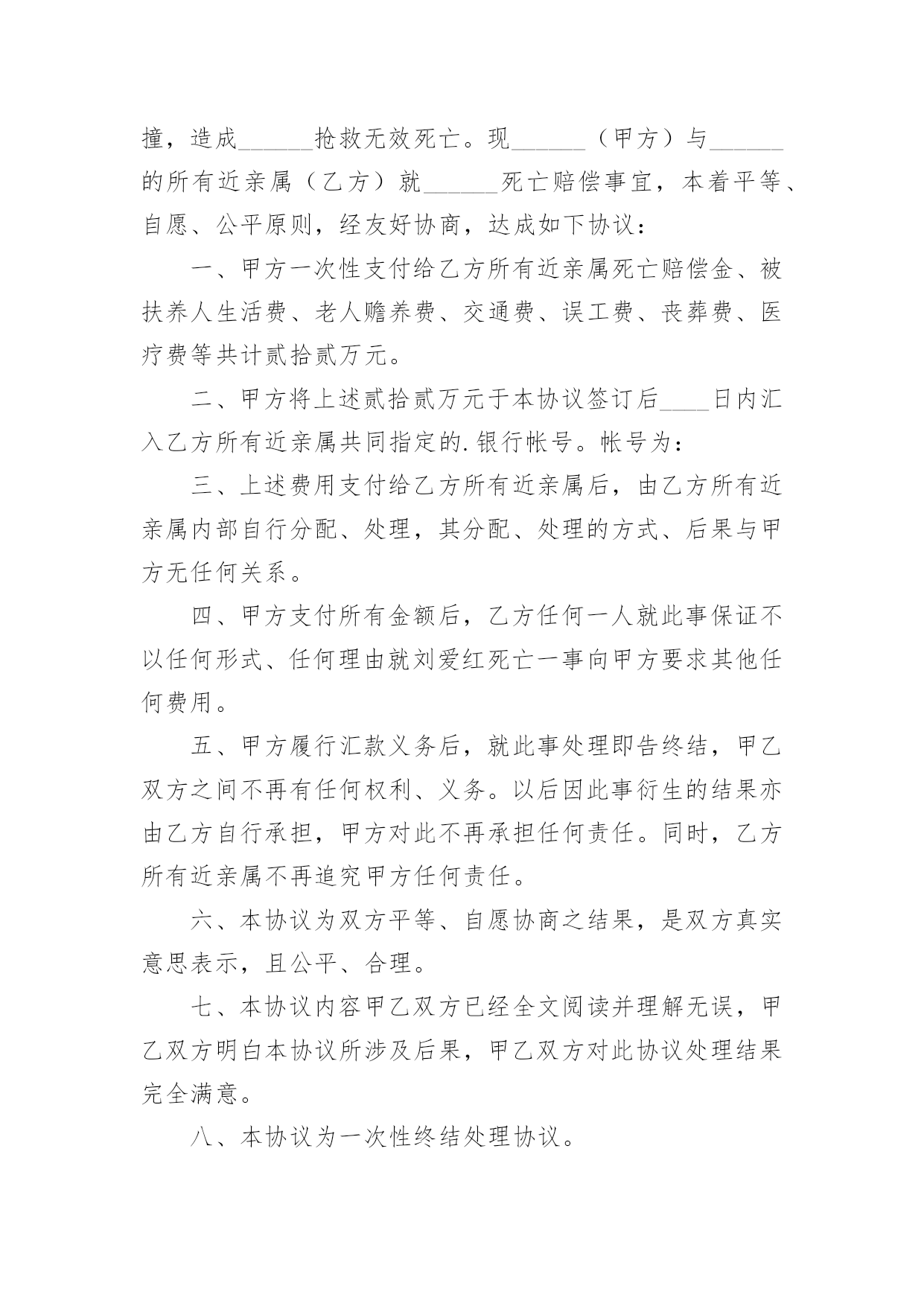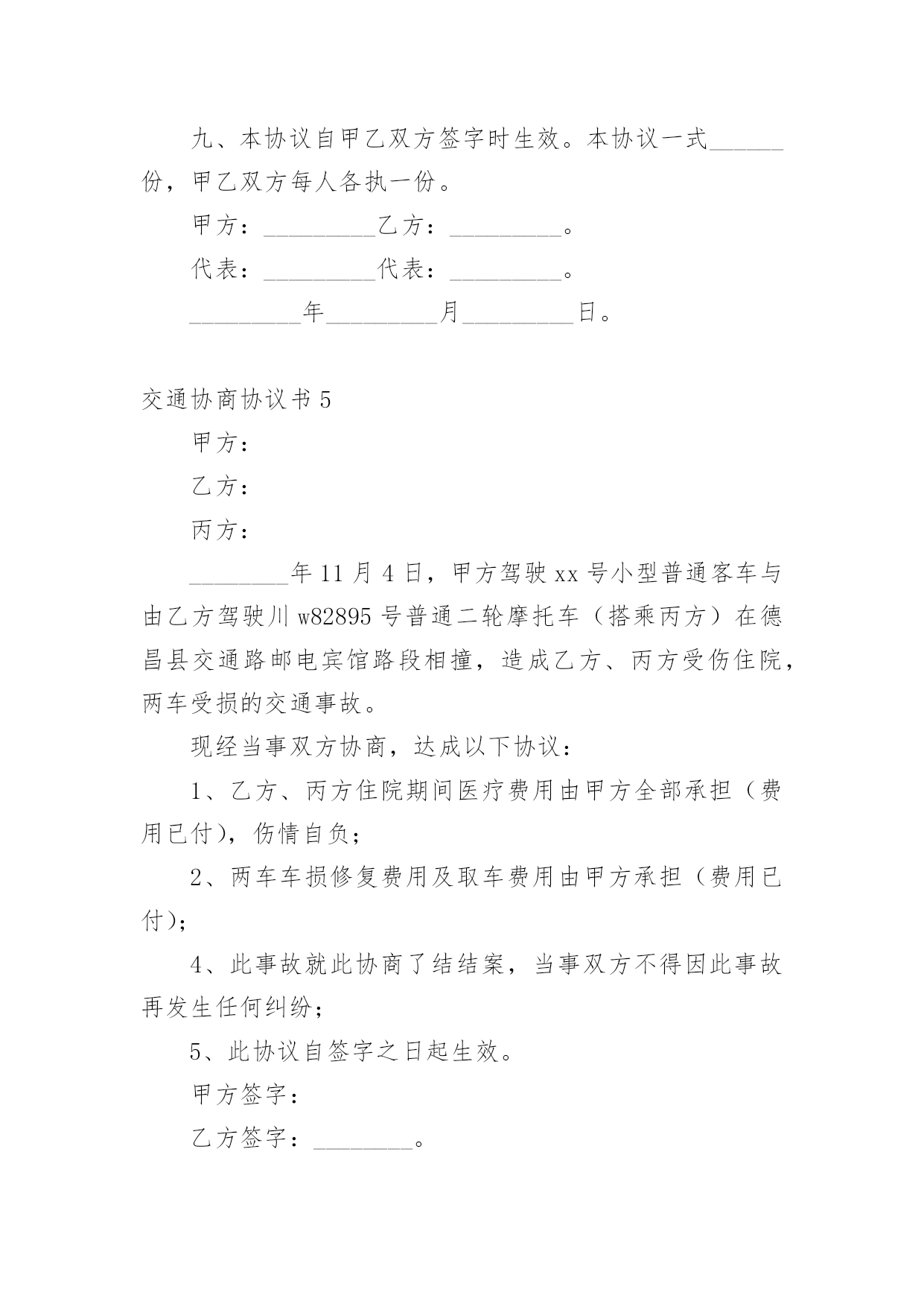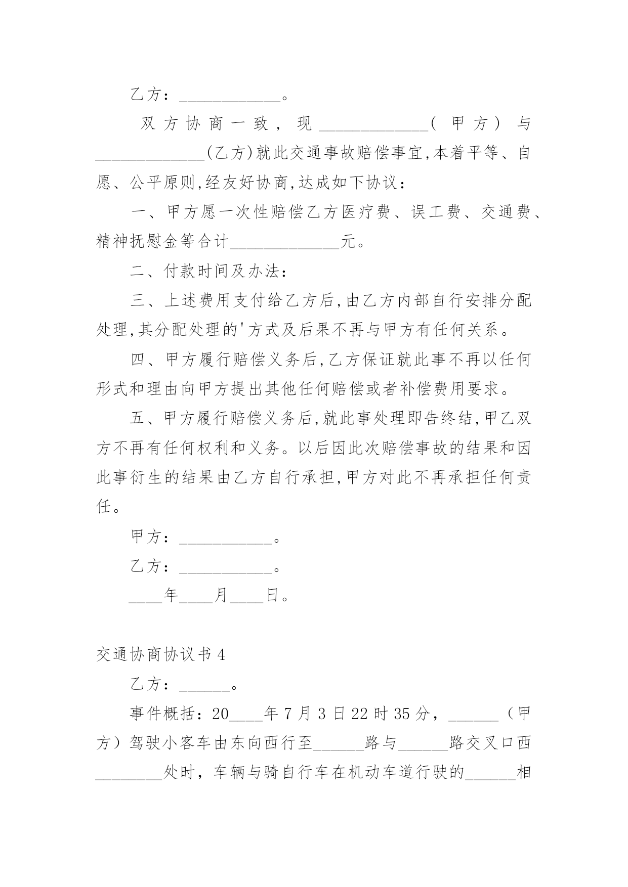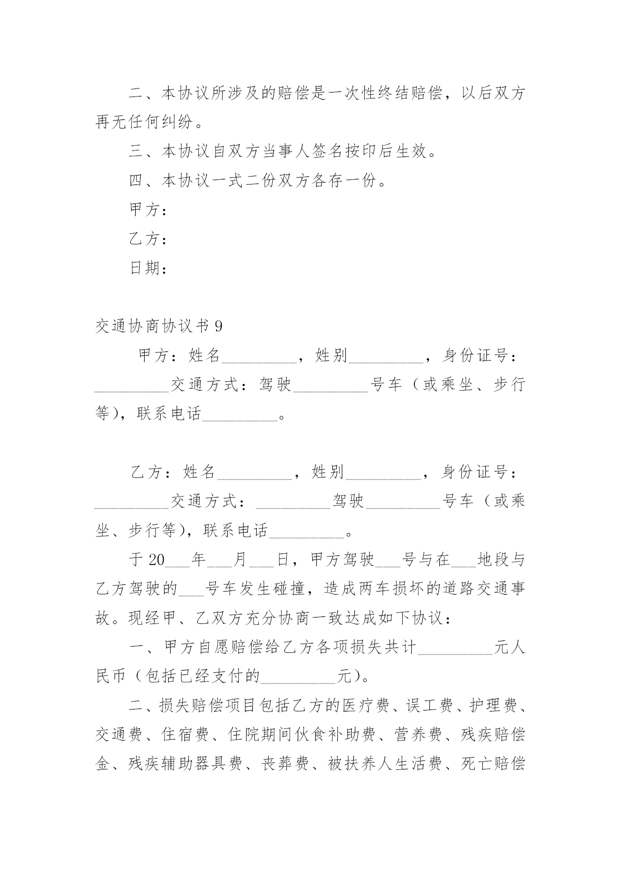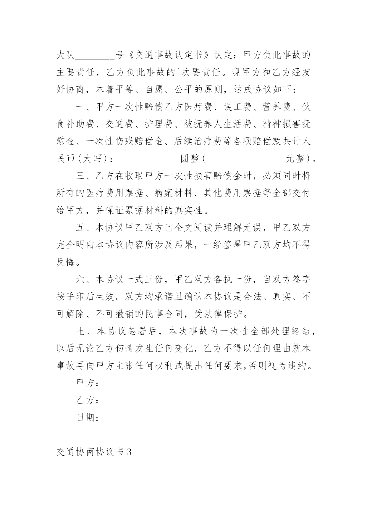 交通协商协议书交通协商协议书经典(11篇)在生活中,协议的使用成为日常生活的常态,协议的签订是双方或数方之间权利义务的最好规范。那么写协议真的很难吗?下面是小编为大家收集的交通协商协议书,仅供参考,欢迎大家阅读。交通协商协议书1甲方:乙方:于xxxx年xx月xx日,甲方驾驶xx号与在xx地段与乙方驾驶的xx号车发生碰撞,造成两车损坏的道路交通事故。现经甲、乙双方充分协商一致达成如下协议:一、元人民币(元)。二、损失赔偿项目包括乙方的医疗费、误工费、护理费、交通费、住宿费、住院期间伙食补助费、营养费、残疾赔偿金、残疾辅助器具费、丧葬费、被扶养人生活费、死亡赔偿金、精神损害抚慰金、等各项损失赔偿。(可按实际情况选择项目)。三、本协议签定时,甲方支付乙方xxxx。xx元,余款在乙方配合甲方向保险公司理赔后,支付给乙方。乙方的'具体配合工作是指本协议第六条的约定。乙方不配合甲方工作的,甲方有权拒绝支付剩余款项。四、本协议所涉及的赔偿是一次性终结赔偿,甲方支付乙方费用后,今后乙方不得以任何理由向甲方主张任何权利,甲方不再负有任何赔偿责任。五、本协议签订时,双方均是在自愿的情形下签订的,不存在任何重大误解或显示公平的情形,甲、乙双方不得以任何理由对于协议提出反悔。六、在甲方赔偿乙方后,在甲方向保险公司理赔时,乙方应积极配合甲方和保险公司的工作,内容包括做伤残鉴定、提供所有票据等等,如果因为乙方不配合甲方的工作造成了甲方不能向保险公司理赔时,乙方应当返还相当于保险公司理赔给甲方的金额。七、本协议自双方当事人签字后生效。八、本协议一式二份,甲、乙双方各执一份。甲方:乙方:日期:交通协商协议书2甲方:乙方:20____年____月____日____时左右,甲方驾驶____________号两轮摩托车,在________________处发生道路交通事故,导致乙方受伤,事故发生后,经公安交通警察大队________号《交通事故认定书》认定:甲方负此事故的主要责任,乙方负此事故的`次要责任。现甲方和乙方经友好协商,本着平等、自愿、公平的原则,达成协议如下:一、甲方一次性赔偿乙方医疗费、误工费、营养费、伙食补助费、交通费、护理费、被抚养人生活费、精神损害抚慰金、一次性伤残赔偿金、后续治疗费等各项赔偿款共计人民币(大写):____________圆整(________________元整)。三、乙方在收取甲方一次性损害赔偿金时,必须同时将所有的医疗费用票据、病案材料、其他费用票据等全部交付给甲方,并保证票据材料的真实性。五、本协议甲乙双方已全文阅读并理解无误,甲乙双方完全明白本协议内容所涉及后果,一经签署甲乙双方均不得反悔。六、本协议一式三份,甲乙双方各执一份,自双方签字按手印后生效。双方均承诺且确认本协议是合法、真实、不可解除、不可撤销的民事合同,受法律保护。七、本协议签署后,本次事故为一次性全部处理终结,以后无论乙方伤情发生任何变化,乙方不得以任何理由就本事故再向甲方主张任何权利或提出任何要求,否则视为违约。甲方:乙方:日期:交通协商协议书3乙方:____________。双方协商一致,现_____________(甲方)与_____________(乙方)就此交通事故赔偿事宜,本着平等、自愿、公平原则,经友好协商,达成如下协议:一、甲方愿一次性赔偿乙方医疗费、误工费、交通费、精神抚慰金等合计_____________元。二、付款时间及办法:三、上述费用支付给乙方后,由乙方内部自行安排分配处理,其分配处理的'方式及后果不再与甲方有任何关系。四、甲方履行赔偿义务后,乙方保证就此事不再以任何形式和理由向甲方提出其他任何赔偿或者补偿费用要求。五、甲方履行赔偿义务后,就此事处理即告终结,甲乙双方不再有任何权利和义务。以后因此次赔偿事故的结果和因此事衍生的结果由乙方自行承担,甲方对此不再承担任何责任。甲方:___________。乙方:___________。____年____月____日。交通协商协议书4乙方:______。事件概括:20____年7月3日22时35分,______(甲方)驾驶小客车由东向西行至______路与______路交叉口西________处时,车辆与骑自行车在机动车道行驶的______相撞,造成______抢救无效死亡。现______(甲方)与______的所有近亲属(乙方)就______死亡赔偿事宜,本着平等、自愿、公平原则,经友好协商,达成如下协议:一、甲方一次性支付给乙方所有近亲属死亡赔偿金、被扶养人生活费、老人赡养费、交通费、误工费、丧葬费、医疗费等共计贰拾贰万元。二、甲方将上述贰拾贰万元于本协议签订后____日内汇入乙方所有近亲属共同指定的.银行帐号。帐号为:三、上述费用支付给乙方所有近亲属后,由乙方所有近亲属内部自