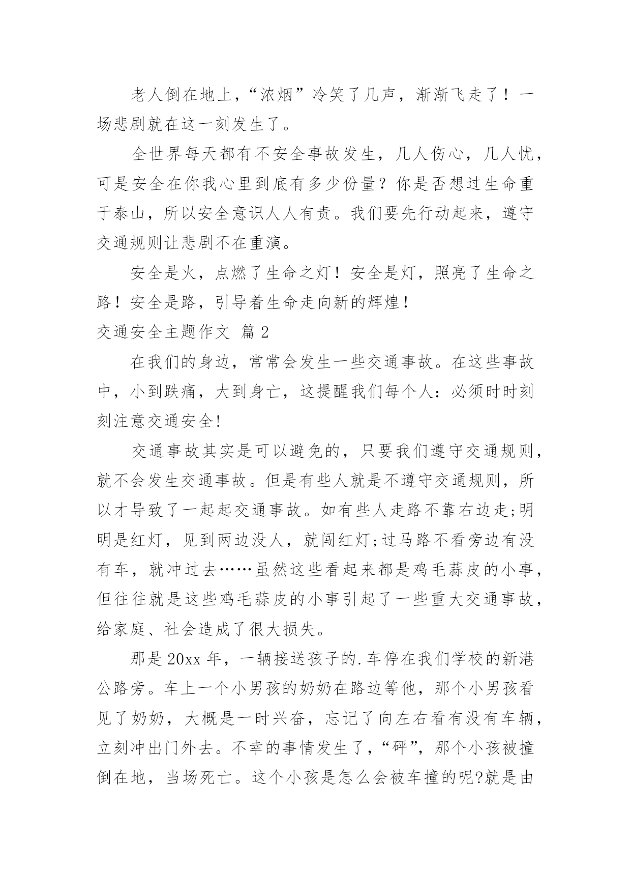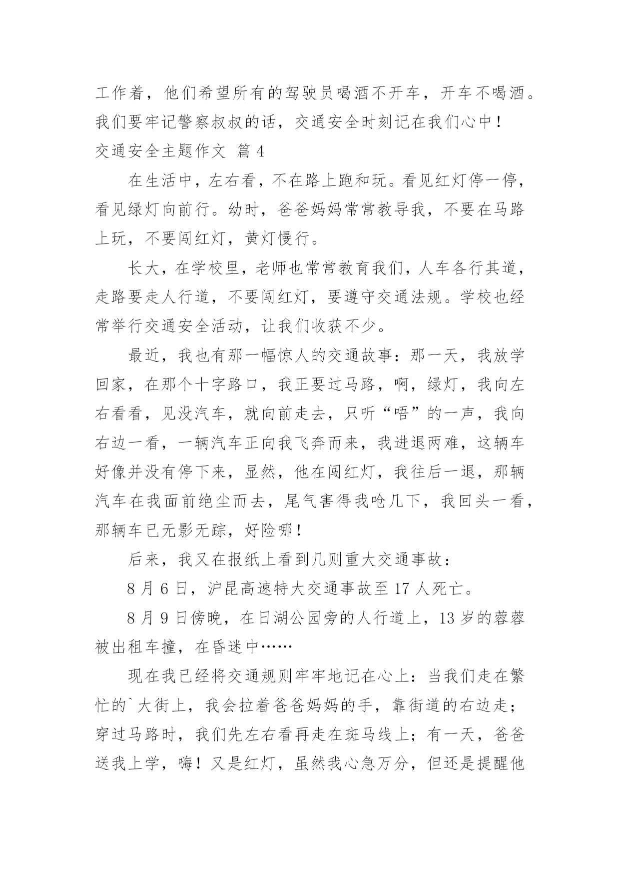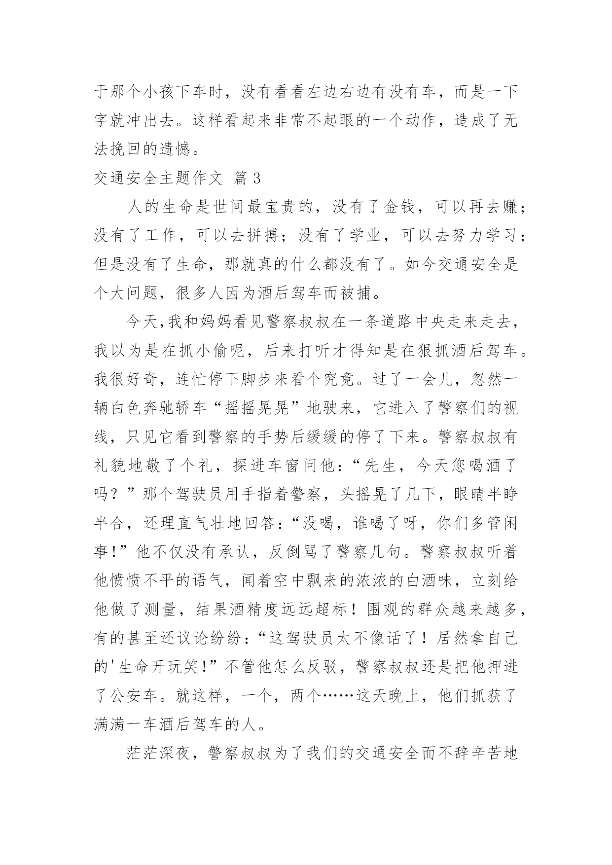 交通安全主题作文[经典]交通安全主题作文4篇在日常学习、工作抑或是生活中,大家对作文都不陌生吧,作文根据体裁的不同可以分为记叙文、说明文、应用文、议论文。作文的注意事项有许多,你确定会写吗?下面是小编帮大家整理的交通安全主题作文4篇,仅供参考,欢迎大家阅读。交通安全主题作文篇1人的生命只有一次,如果我们不珍惜它,它就像一缕烟飘到很远很远的地方……不知道为什么,走在繁华的大街上,望着高楼大厦,马路,匆匆来往的行人,我不禁感叹:这个世界是多么繁华而昌盛,可是不安全事故总会在那一瞬间发生。当我听到急促的刹车声,尖叫声,我不禁颤抖起来。你是否感觉,有一股“浓烟”悄悄进入了这个世界,打破了宁静与美好的社会。那是在一个风和日丽的`下午,一辆红色的轿车在公路上疯狂的飞驰着。一个20多岁的年轻人,斜靠在驾驶座上,从他的身上能闻出酒味,“浓烟”似乎很生气别人喝酒,于是它摇身一变,一位白发苍苍的老人向前走去“啊”一声尖叫,世界在这一瞬间寂静了……血腥味弥漫在空中,换来的是亲人无数的泪水,以及自己年轻的生命……老人倒在地上,“浓烟”冷笑了几声,渐渐飞走了!一场悲剧就在这一刻发生了。全世界每天都有不安全事故发生,几人伤心,几人忧,可是安全在你我心里到底有多少份量?你是否想过生命重于泰山,所以安全意识人人有责。我们要先行动起来,遵守交通规则让悲剧不在重演。安全是火,点燃了生命之灯!安全是灯,照亮了生命之路!安全是路,引导着生命走向新的辉煌!交通安全主题作文篇2在我们的身边,常常会发生一些交通事故。在这些事故中,小到跌痛,大到身亡,这提醒我们每个人:必须时时刻刻注意交通安全!交通事故其实是可以避免的,只要我们遵守交通规则,就不会发生交通事故。但是有些人就是不遵守交通规则,所以才导致了一起起交通事故。如有些人走路不靠右边走;明明是红灯,见到两边没人,就闯红灯;过马路不看旁边有没有车,就冲过去……虽然这些看起来都是鸡毛蒜皮的小事,但往往就是这些鸡毛蒜皮的小事引起了一些重大交通事故,给家庭、社会造成了很大损失。那是20xx年,一辆接送孩子的.车停在我们学校的新港公路旁。车上一个小男孩的奶奶在路边等他,那个小男孩看见了奶奶,大概是一时兴奋,忘记了向左右看有没有车辆,立刻冲出门外去。不幸的事情发生了,“砰”,那个小孩被撞倒在地,当场死亡。这个小孩是怎么会被车撞的呢?就是由于那个小孩下车时,没有看看左边右边有没有车,而是一下字就冲出去。这样看起来非常不起眼的一个动作,造成了无法挽回的遗憾。交通安全主题作文篇3人的生命是世间最宝贵的,没有了金钱,可以再去赚;没有了工作,可以去拼搏;没有了学业,可以去努力学习;但是没有了生命,那就真的什么都没有了。如今交通安全是个大问题,很多人因为酒后驾车而被捕。今天,我和妈妈看见警察叔叔在一条道路中央走来走去,我以为是在抓小偷呢,后来打听才得知是在狠抓酒后驾车。我很好奇,连忙停下脚步来看个究竟。过了一会儿,忽然一辆白色奔驰轿车“摇摇晃晃”地驶来,它进入了警察们的视线,只见它看到警察的手势后缓缓的停了下来。警察叔叔有礼貌地敬了个礼,探进车窗问他:“先生,今天您喝酒了吗?”那个驾驶员用手指着警察,头摇晃了几下,眼睛半睁半合,还理直气壮地回答:“没喝,谁喝了呀,你们多管闲事!”他不仅没有承认,反倒骂了警察几句。警察叔叔听着他愤愤不平的语气,闻着空中飘来的浓浓的白酒味,立刻给他做了测量,结果酒精度远远超标!围观的群众越来越多,有的甚至还议论纷纷:“这驾驶员太不像话了!居然拿自己的'生命开玩笑!”不管他怎么反驳,警察叔叔还是把他押进了公安车。就这样,一个,两个……这天晚上,他们抓获了满满一车酒后驾车的人。茫茫深夜,警察叔叔为了我们的交通安全而不辞辛苦地工作着,他们希望所有的驾驶员喝酒不开车,开车不喝酒。我们要牢记警察叔叔的话,交通安全时刻记在我们心中!交通安全主题作文篇4在生活中,左右看,不在路上跑和玩。看见红灯停一停,看见绿灯向前行。幼时,爸爸妈妈常常教导我,不要在马路上玩,不要闯红灯,黄灯慢行。长大,在学校里,老师也常常教育我们,人车各行其道,走路要走人行道,不要闯红灯,要遵守交通法规。学校也经常举行交通安全活动,让我们收获不少。最近,我也有那一幅惊人的交通故事:那一天,我放学回家,在那个十字路口,我正要过马路,啊,绿灯,我向左右看看,见没汽车,就向前走去,只听“唔”的一声,我向右边一看,一辆汽车正向我飞奔而来,我进退两难,这辆车好像并没有停下来,显然,他在闯红灯,我往后一退,那辆汽车在我面前绝尘而去,尾气害得我呛几下,我回头一看,那辆车已无影无踪,好险哪!后来,我又在报纸上看到几则重大交通事故:8月6日,沪昆高速特大交通事故至17人死亡。8月9日傍晚,在日湖公园旁的人行道上,13岁的蓉蓉被出租车撞,在昏迷中……现在我已经将交通规则牢牢
