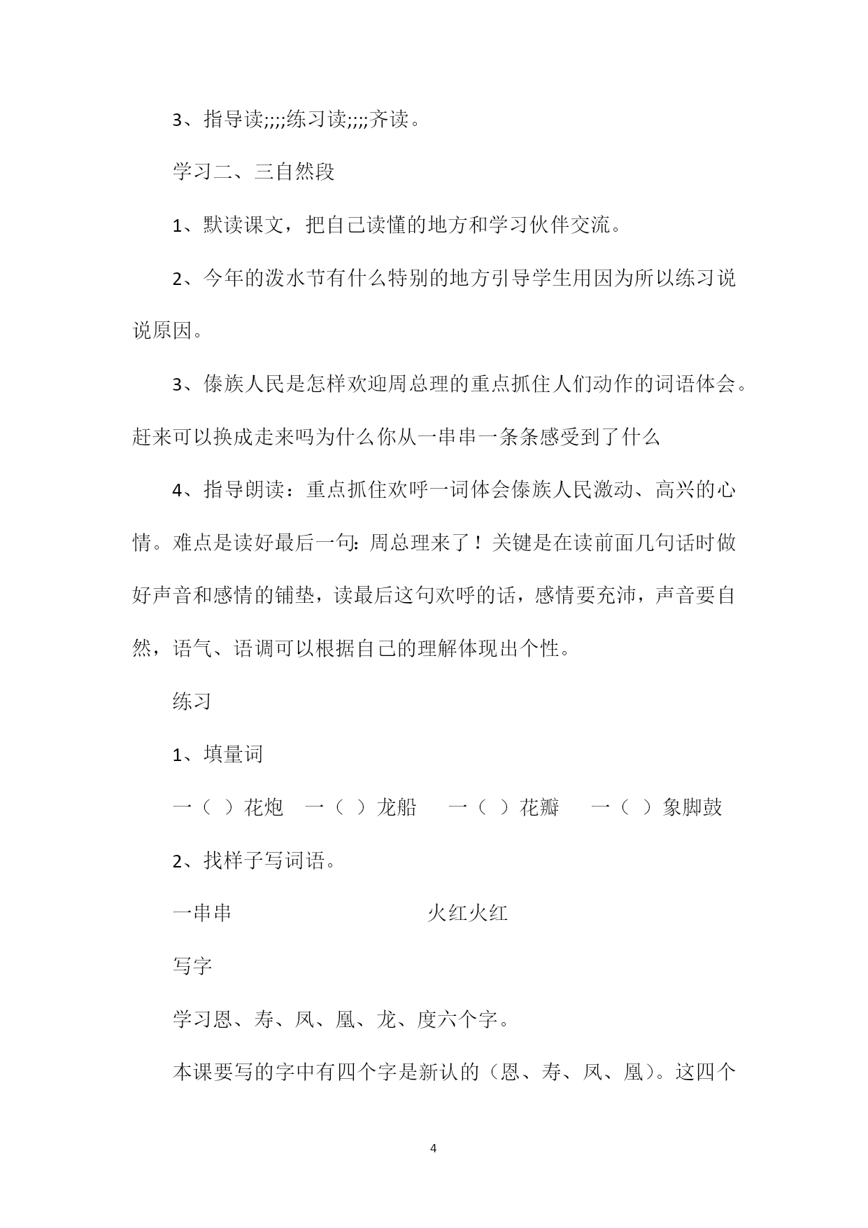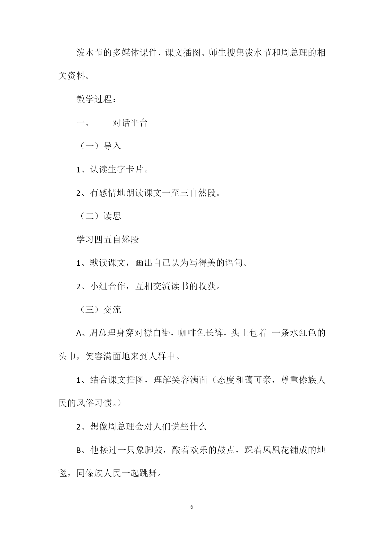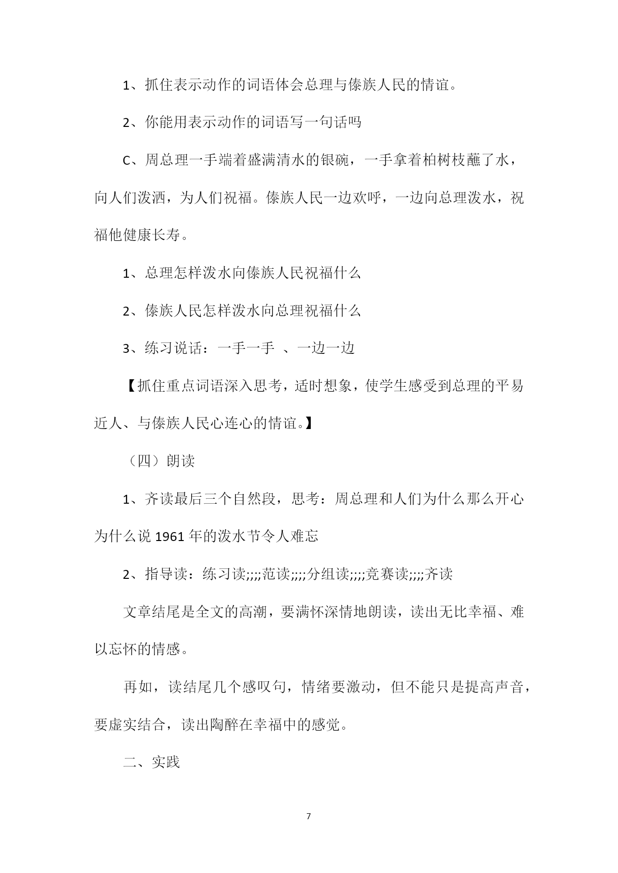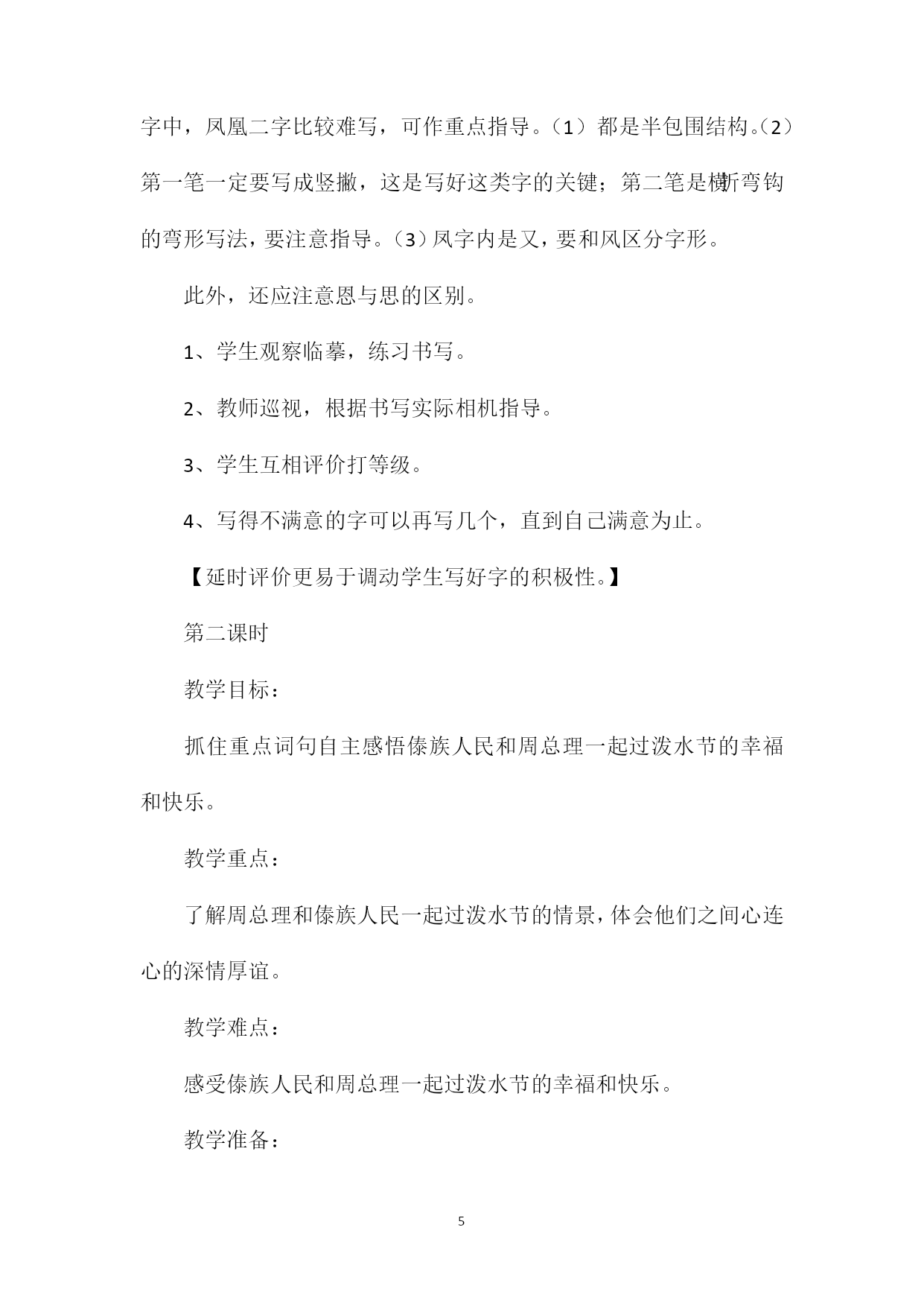 PAGEPAGE10难忘的泼水节教学设计与教学反思资料教学目标:1、会认12个生字,会写12个字。2、抓住重点词句自主感悟傣族人民和周总理一起过泼水节的幸福和快乐。正确、流利、有感情地朗读课文。3、对周总理和人民心连心有一定的认识,对傣族人民的泼水节有初步感受。教学重点:了解周总理和傣族人民一起过泼水节的情景,体会他们之间心连心的深情厚谊。教学难点:感受傣族人民和周总理一起过泼水节的幸福和快乐。教学准备:生字卡片、泼水节的多媒体课件、课文插图、师生搜集泼水节和周总理的相关资料。课时安排:两课时第一课时教学目标:会认12个生字,会写12个字。正确、流利、有感情地朗读课文。教学重点:会认12个生字,会写12个字。教学难点:能流利地朗读课文。教学准备:生字卡片、泼水节的多媒体课件、课文插图教学过程:一、切入举偶1、谈话导入。中国是由56个民族组成的大家庭,除了汉族外还有55个少数民族,而少数民族都有自己独特的风俗习惯。今天我要带领大家一起去参加傣族的泼水节。(板书课题)教师或学生简单介绍傣族泼水节的习俗。2、图片激趣。出示课文插图,图上的人们在干什么(人们和周总理在一起过泼水节)(板书:泼水节)然后在前面加上难忘二字:为什么说是难忘的泼水节呢学习课文我们就会知道。二、对话平台(一)自读1、自由读课文,初步感受泼水节的难忘。2、再次读课文,圈画生字,把生字多读几遍。3、限定时间,练习把课文读正确、读流利。4、接龙读检查读文情况。【识字和朗读是低年级的重点。此环节采用多种形式,充分发挥学生的主体地位,有效地提高读书效率。】(二)识字1、小组合作检查生字读音,注意瓣读ban,在句子中读花瓣时要加儿化音花瓣儿。因为的为读wegrave;i。翘舌音有蘸、寿,平舌音有踩。2、交流识字方法。小组内说说自己是怎样认字的,然后全班推荐好的识字方法。3、游戏检查识字:抓特务、对号入座、购买门票【本课有些生字在生活中跟学生见面的机会较少,字形比较复杂,字音难点较多。教学时,要努力调动学生内在的学习积极性,增强学习的趣味性,使学生在轻松愉悦的气氛中识字。】(三)读思学习第一自然段1、指名读课文,说说你读懂了什么2、换词比较:火红火红的可以换成红色的吗(突出凤凰花的艳丽,烘托了喜庆祥和的气氛。)还有什么事物也是火红火红的(此处如果有条件可以播放傣族人民泼水节的录象,感受节日的喜庆和热烈。)3、指导读;;;;练习读;;;;齐读。学习二、三自然段1、默读课文,把自己读懂的地方和学习伙伴交流。2、今年的泼水节有什么特别的地方引导学生用因为所以练习说说原因。3、傣族人民是怎样欢迎周总理的重点抓住人们动作的词语体会。赶来可以换成走来吗为什么你从一串串一条条感受到了什么4、指导朗读:重点抓住欢呼一词体会傣族人民激动、高兴的心情。难点是读好最后一句:周总理来了!关键是在读前面几句话时做好声音和感情的铺垫,读最后这句欢呼的话,感情要充沛,声音要自然,语气、语调可以根据自己的理解体现出个性。练习1、填量词一()花炮一()龙船一()花瓣一()象脚鼓2、找样子写词语。一串串火红火红写字学习恩、寿、凤、凰、龙、度六个字。本课要写的字中有四个字是新认的(恩、寿、凤、凰)。这四个字中,凤凰二字比较难写,可作重点指导。(1)都是半包围结构。(2)第一笔一定要写成竖撇,这是写好这类字的关键;第二笔是横折弯钩的弯形写法,要注意指导。(3)凤字内是又,要和风区分字形。此外,还应注意恩与思的区别。1、学生观察临摹,练习书写。2、教师巡视,根据书写实际相机指导。3、学生互相评价打等级。4、写得不满意的字可以再写几个,直到自己满意为止。【延时评价更易于调动学生写好字的积极性。】第二课时教学目标:抓住重点词句自主感悟傣族人民和周总理一起过泼水节的幸福和快乐。教学重点:了解周总理和傣族人民一起过泼水节的情景,体会他们之间心连心的深情厚谊。教学难点:感受傣族人民和周总理一起过泼水节的幸福和快乐。教学准备:泼水节的多媒体课件、课文插图、师生搜集泼水节和周总理的相关资料。教学过程:一、对话平台(一)导入1、认读生字卡片。2、有感情地朗读课文一至三自然段。(二)读思学习四五自然段1、默读课文,画出自己认为写得美的语句。2、小组合作,互相交流读书的收获。(三)交流A、周总理身穿对襟白褂,咖啡色长裤,头上包着一条水红色的头巾,笑容满面地来到人群中。1、结合课文插图,理解笑容满面(态度和蔼可亲,尊重傣族人民的风俗习惯。)2、想像周总理会对人们说些什么B、他接过一只象脚鼓,敲着欢乐的鼓点,踩着凤凰花铺成的地毯,同傣族人民一起跳舞。