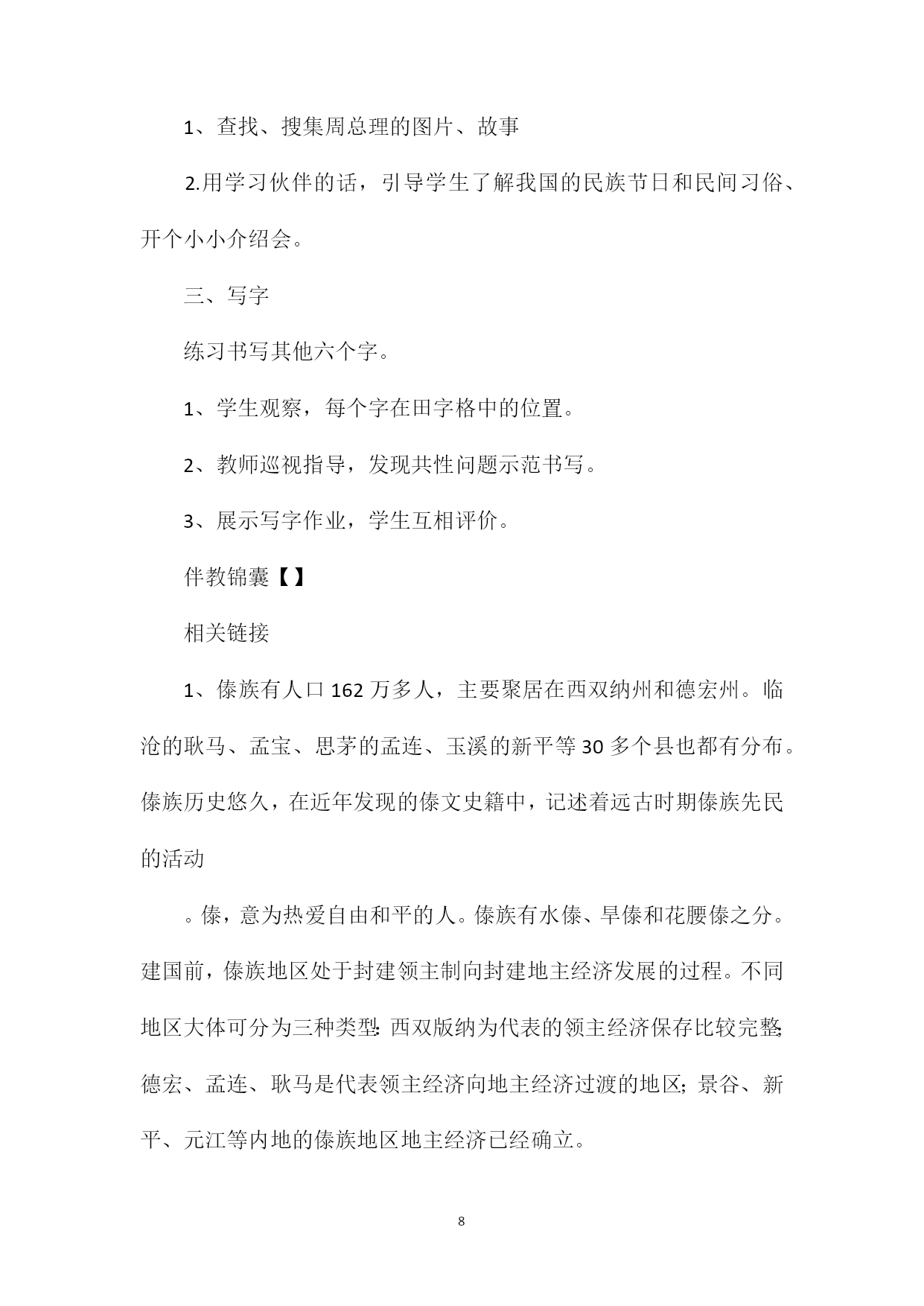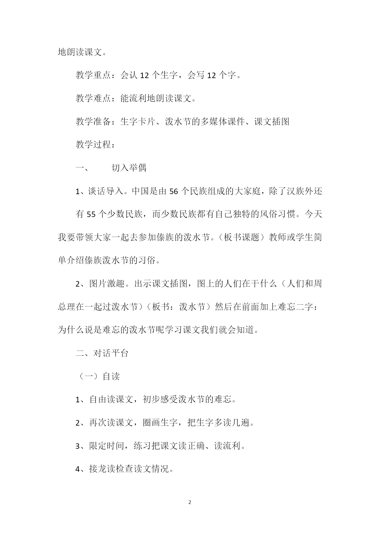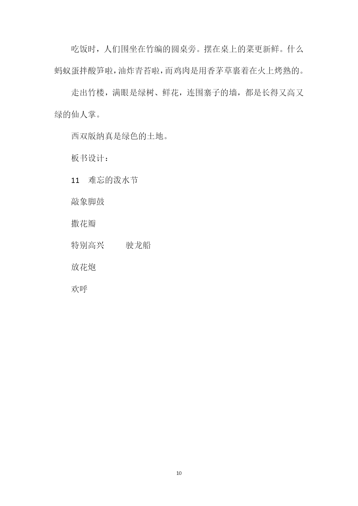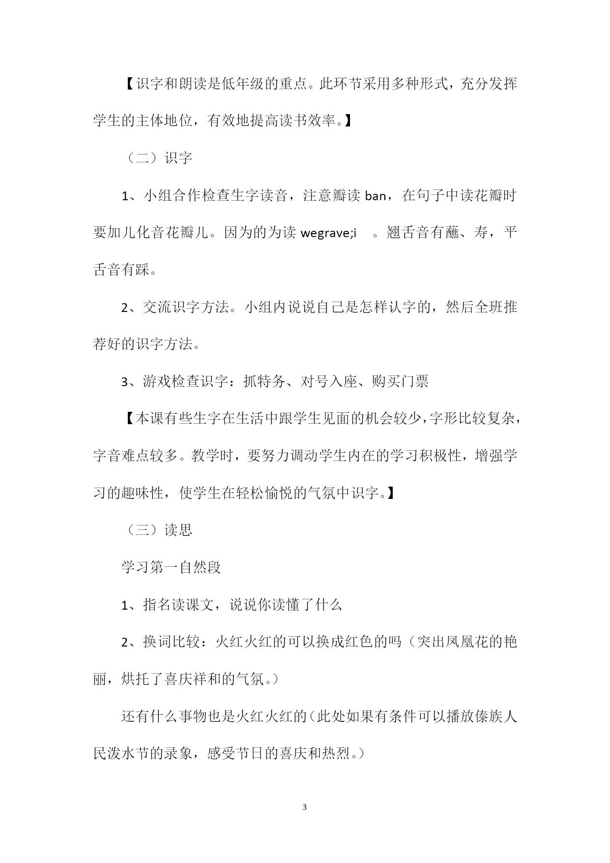 PAGEPAGE10难忘的泼水节教学设计与教学反思资料教学目标:1、会认12个生字,会写12个字。2、抓住重点词句自主感悟傣族人民和周总理一起过泼水节的幸福和快乐。正确、流利、有感情地朗读课文。3、对周总理和人民心连心有一定的认识,对傣族人民的泼水节有初步感受。教学重点:了解周总理和傣族人民一起过泼水节的情景,体会他们之间心连心的深情厚谊。教学难点:感受傣族人民和周总理一起过泼水节的幸福和快乐。教学准备:生字卡片、泼水节的多媒体课件、课文插图、师生搜集泼水节和周总理的相关资料。课时安排:两课时第一课时教学目标:会认12个生字,会写12个字。正确、流利、有感情地朗读课文。教学重点:会认12个生字,会写12个字。教学难点:能流利地朗读课文。教学准备:生字卡片、泼水节的多媒体课件、课文插图教学过程:一、切入举偶1、谈话导入。中国是由56个民族组成的大家庭,除了汉族外还有55个少数民族,而少数民族都有自己独特的风俗习惯。今天我要带领大家一起去参加傣族的泼水节。(板书课题)教师或学生简单介绍傣族泼水节的习俗。2、图片激趣。出示课文插图,图上的人们在干什么(人们和周总理在一起过泼水节)(板书:泼水节)然后在前面加上难忘二字:为什么说是难忘的泼水节呢学习课文我们就会知道。二、对话平台(一)自读1、自由读课文,初步感受泼水节的难忘。2、再次读课文,圈画生字,把生字多读几遍。3、限定时间,练习把课文读正确、读流利。4、接龙读检查读文情况。【识字和朗读是低年级的重点。此环节采用多种形式,充分发挥学生的主体地位,有效地提高读书效率。】(二)识字1、小组合作检查生字读音,注意瓣读ban,在句子中读花瓣时要加儿化音花瓣儿。因为的为读wegrave;i。翘舌音有蘸、寿,平舌音有踩。2、交流识字方法。小组内说说自己是怎样认字的,然后全班推荐好的识字方法。3、游戏检查识字:抓特务、对号入座、购买门票【本课有些生字在生活中跟学生见面的机会较少,字形比较复杂,字音难点较多。教学时,要努力调动学生内在的学习积极性,增强学习的趣味性,使学生在轻松愉悦的气氛中识字。】(三)读思学习第一自然段1、指名读课文,说说你读懂了什么2、换词比较:火红火红的可以换成红色的吗(突出凤凰花的艳丽,烘托了喜庆祥和的气氛。)还有什么事物也是火红火红的(此处如果有条件可以播放傣族人民泼水节的录象,感受节日的喜庆和热烈。)3、指导读;;;;练习读;;;;齐读。学习二、三自然段1、默读课文,把自己读懂的地方和学习伙伴交流。2、今年的泼水节有什么特别的地方引导学生用因为所以练习说说原因。3、傣族人民是怎样欢迎周总理的重点抓住人们动作的词语体会。赶来可以换成走来吗为什么你从一串串一条条感受到了什么4、指导朗读:重点抓住欢呼一词体会傣族人民激动、高兴的心情。难点是读好最后一句:周总理来了!关键是在读前面几句话时做好声音和感情的铺垫,读最后这句欢呼的话,感情要充沛,声音要自然,语气、语调可以根据自己的理解体现出个性。练习1、填量词一()花炮一()龙船一()花瓣一()象脚鼓2、找样子写词语。一串串火红火红写字学习恩、寿、凤、凰、龙、度六个字。本课要写的字中有四个字是新认的(恩、寿、凤、凰)。这四个字中,凤凰二字比较难写,可作重点指导。(1)都是半包围结构。(2)第一笔一定要写成竖撇,这是写好这类字的关键;第二笔是横折弯钩的弯形写法,要注意指导。(3)凤字内是又,要和风区分字形。此外,还应注意恩与思的区别。1、学生观察临摹,练习书写。2、教师巡视,根据书写实际相机指导。3、学生互相评价打等级。4、写得不满意的字可以再写几个,直到自己满意为止。【延时评价更易于调动学生写好字的积极性。】第二课时教学目标:抓住重点词句自主感悟傣族人民和周总理一起过泼水节的幸福和快乐。教学重点:了解周总理和傣族人民一起过泼水节的情景,体会他们之间心连心的深情厚谊。教学难点:感受傣族人民和周总理一起过泼水节的幸福和快乐。教学准备:泼水节的多媒体课件、课文插图、师生搜集泼水节和周总理的相关资料。教学过程:一、对话平台(一)导入1、认读生字卡片。2、有感情地朗读课文一至三自然段。(二)读思学习四五自然段1、默读课文,画出自己认为写得美的语句。2、小组合作,互相交流读书的收获。(三)交流A、周总理身穿对襟白褂,咖啡色长裤,头上包着一条水红色的头巾,笑容满面地来到人群中。1、结合课文插图,理解笑容满面(态度和蔼可亲,尊重傣族人民的风俗习惯。)2、想像周总理会对人们说些什么B、他接过一只象脚鼓,敲着欢乐的鼓点,踩着凤凰花铺成的地毯,同傣族人民一起跳舞。