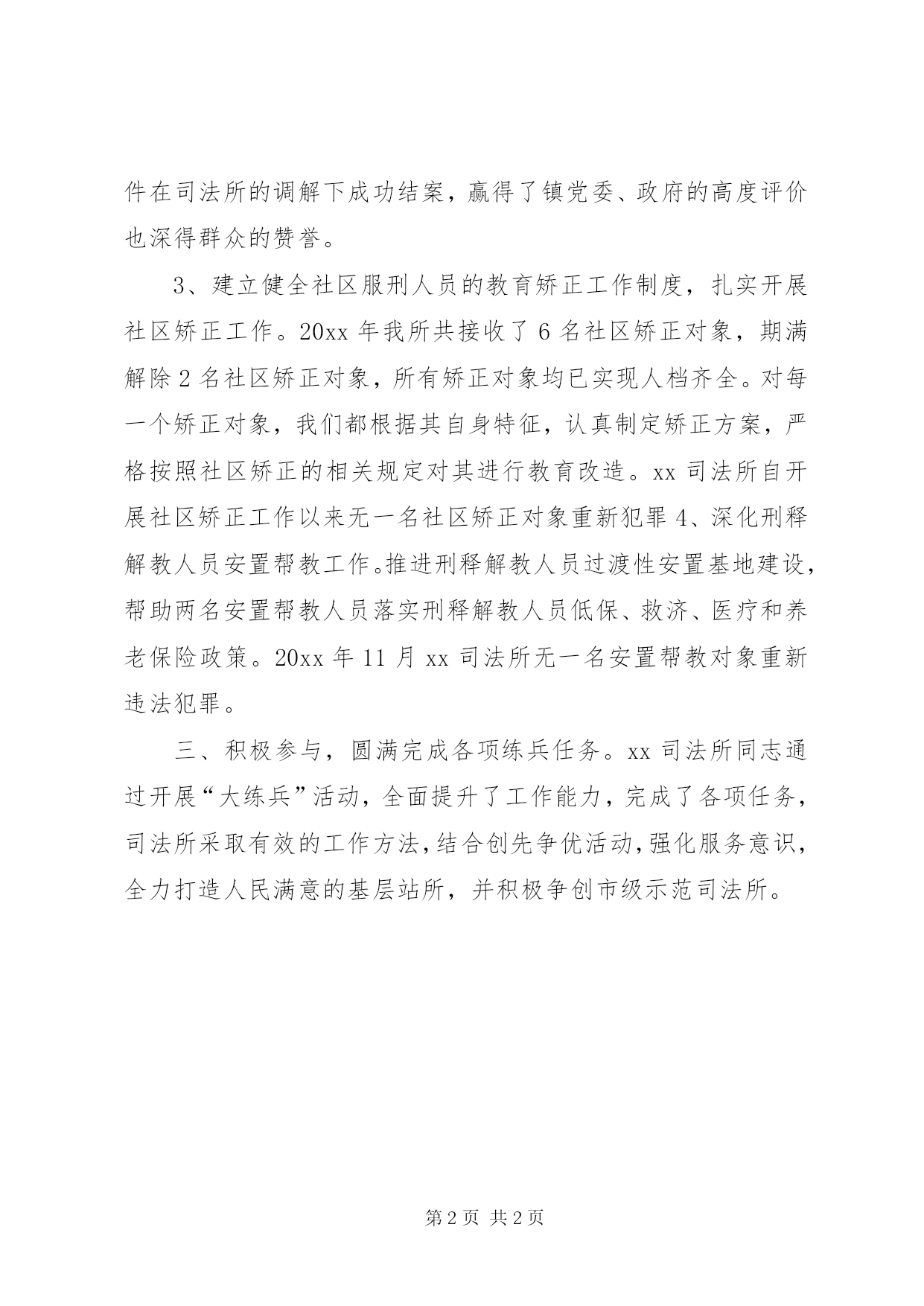 第PAGE\*Arabic\*MERGEFORMAT2页共NUMPAGES\*MERGEFORMAT2页基层司法所岗位练兵活动总结20xx年全省司法所大练兵活动中,我所在县局的正确领导下,按照上级安排部署,结合自身工作实际,认真学习,刻苦训练,坚持不懈,狠抓落实,较好完成了领导交办的各项任务。一、端正思想,充分认识开展大练兵活动的重要性。在练兵活动中更要先学一步,学深一层。通过学习省厅大练兵视频会议精神,深刻领会开展大练兵活动的重要意义。思想上的提高促进行动上的进步,通过学习,进一步端正态度,提高认识,更加积极的投身到大练兵活动中去。二、精心组织,切实提高大练兵活动的效果。1、今年的重点工作是开展“深化三项重点工作实战大练兵”活动,xx司法所在深入领会这一活动的实质后,成立了大练兵活动领导组,印发了xx司法所“实战大练兵”活动实施方案,并将“实战大练兵”活动融入到司法所的各项基础工作当中。2、扎实开展人民调解及矛盾纠纷排查工作。司法所制定了每周一次定期进行矛盾纠纷排查,对排查出来的矛盾纠纷,逐一建立台账,会同村调委会及相关部门及时进行依法调解,对排查出来的重大矛盾纠纷,及时报党委政府协同处理。今年以来,我所共进行矛盾纠纷排查20次,排查出矛盾纠纷14起,全部进行了调处,目前调结12起,2起正在调处中,制定调解协议书的均得到了很好的履行。特别是一起涉及30多人的农民工讨薪案件在司法所的调解下成功结案,赢得了镇党委、政府的高度评价也深得群众的赞誉。3、建立健全社区服刑人员的教育矫正工作制度,扎实开展社区矫正工作。20xx年我所共接收了6名社区矫正对象,期满解除2名社区矫正对象,所有矫正对象均已实现人档齐全。对每一个矫正对象,我们都根据其自身特征,认真制定矫正方案,严格按照社区矫正的相关规定对其进行教育改造。xx司法所自开展社区矫正工作以来无一名社区矫正对象重新犯罪4、深化刑释解教人员安置帮教工作。推进刑释解教人员过渡性安置基地建设,帮助两名安置帮教人员落实刑释解教人员低保、救济、医疗和养老保险政策。20xx年11月xx司法所无一名安置帮教对象重新违法犯罪。三、积极参与,圆满完成各项练兵任务。xx司法所同志通过开展“大练兵”活动,全面提升了工作能力,完成了各项任务,司法所采取有效的工作方法,结合创先争优活动,强化服务意识,全力打造人民满意的基层站所,并积极争创市级示范司法所。