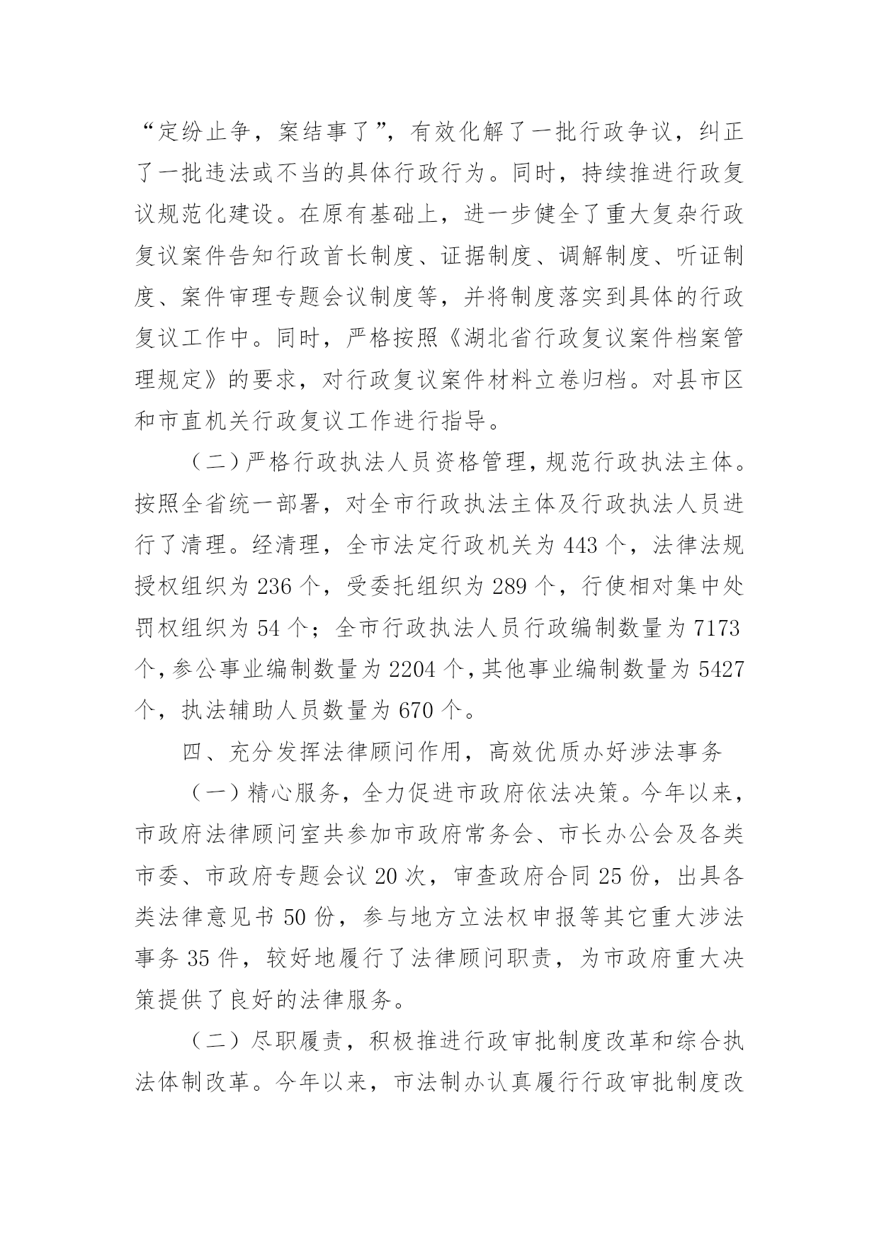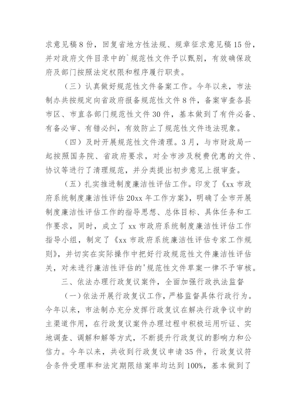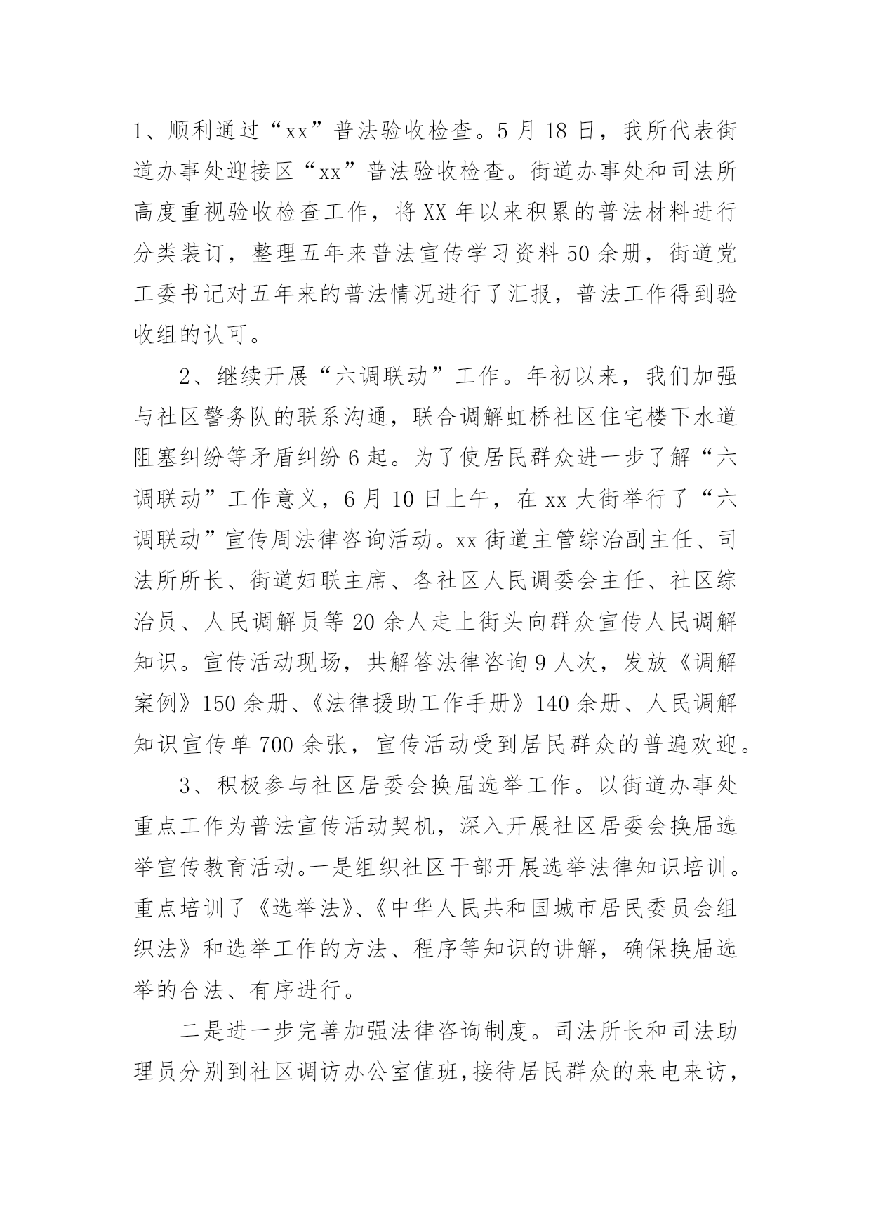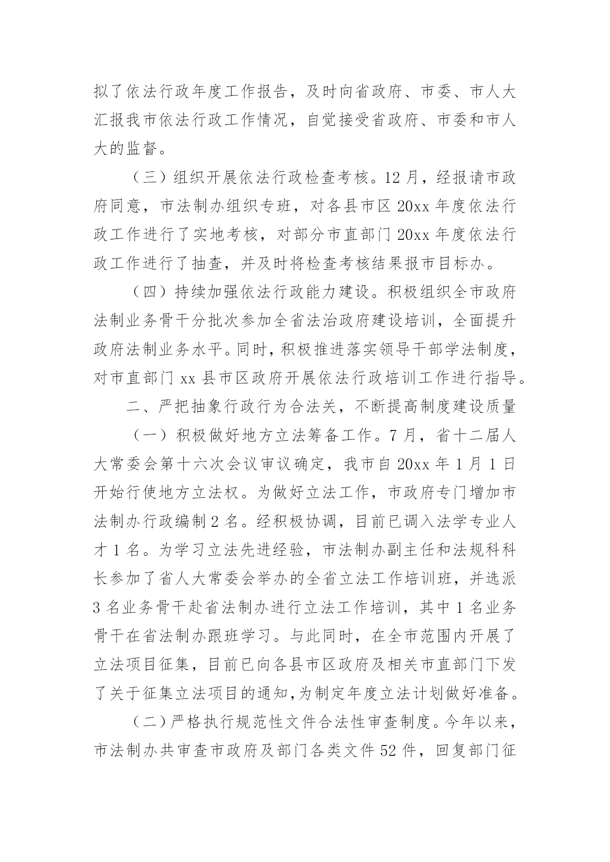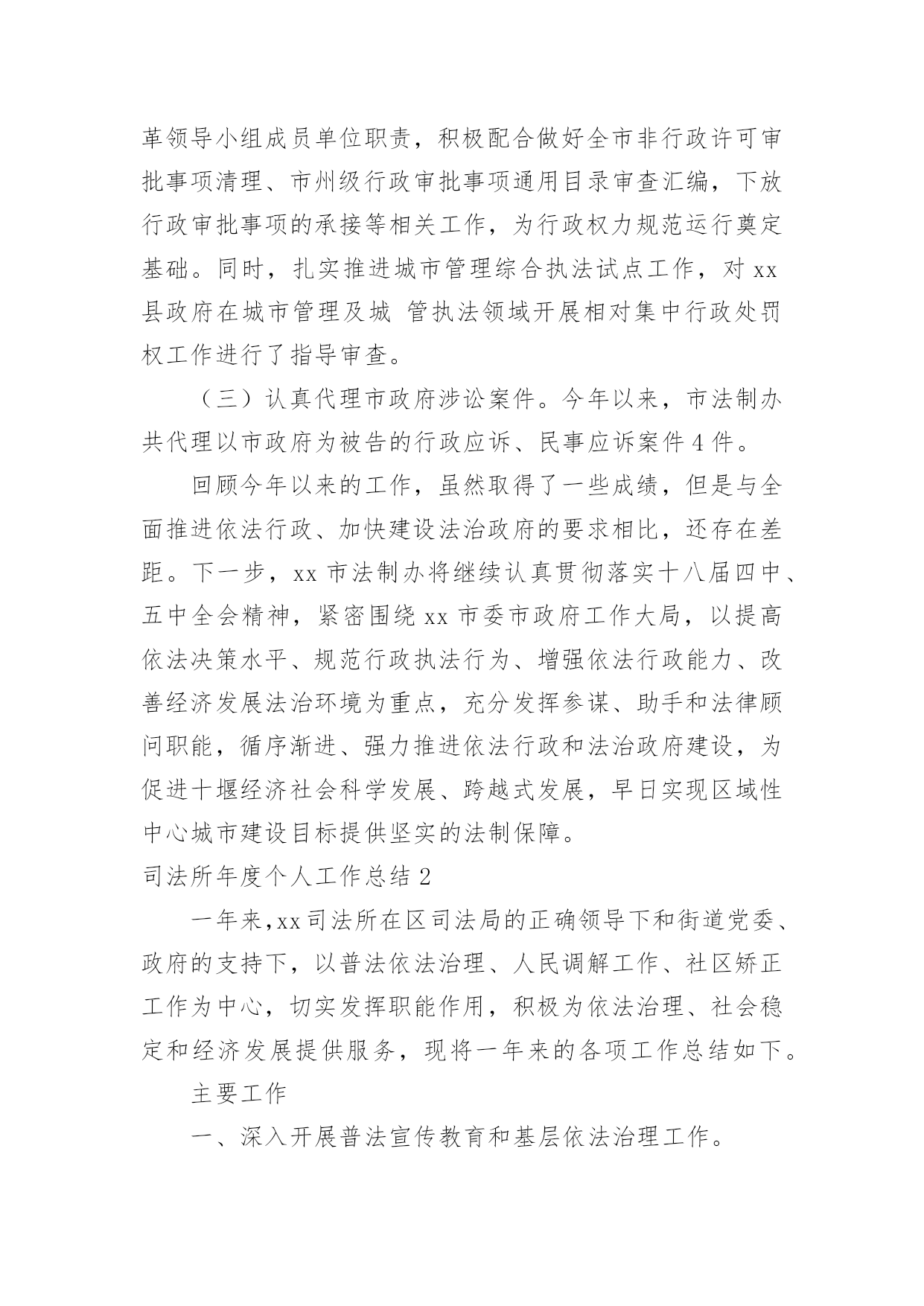 司法所年度个人工作总结总结是在某一时期、某一项目或某些工作告一段落或者全部完成后进行回顾检查、分析评价,从而得出教训和一些规律性认识的一种书面材料,它能帮我们理顺知识结构,突出重点,突破难点,快快来写一份总结吧。总结怎么写才是正确的呢?以下是小编帮大家整理的司法所年度个人工作总结,仅供参考,大家一起来看看吧。司法所年度个人工作总结120xx年,市法制办认真贯彻落实十八届四中全会精神,以推进依法行政,加快建设法治政府为核心,积极作为,扎实工作,认真履行在依法行政方面的参谋、助手和法律顾问职责,取得了良好成效。一、夯实基础工作,持续推进依法行政(一)合理安排依法行政工作计划。在认真研究全市依法行政工作的基础上,制发了20xx年工作要点,从提高规范性文件质量、加强行政执法监督、完善依法行政考核机制、提高依法决策水平、严肃责任追究等方面明确了全年重点工作。8月,根据法治十堰建设工作安排和全省法治政府建设总体部署,结合全市法治政府建设工作实际,起草了《xx市法治政府建设规划(20xx—20xx)》,并经市政府常务会议审议通过印发执行。(二)认真落实依法行政报告制度。年初,代市政府草拟了依法行政年度工作报告,及时向省政府、市委、市人大汇报我市依法行政工作情况,自觉接受省政府、市委和市人大的监督。(三)组织开展依法行政检查考核。12月,经报请市政府同意,市法制办组织专班,对各县市区20xx年度依法行政工作进行了实地考核,对部分市直部门20xx年度依法行政工作进行了抽查,并及时将检查考核结果报市目标办。(四)持续加强依法行政能力建设。积极组织全市政府法制业务骨干分批次参加全省法治政府建设培训,全面提升政府法制业务水平。同时,积极推进落实领导干部学法制度,对市直部门xx县市区政府开展依法行政培训工作进行指导。二、严把抽象行政行为合法关,不断提高制度建设质量(一)积极做好地方立法筹备工作。7月,省十二届人大常委会第十六次会议审议确定,我市自20xx年1月1日开始行使地方立法权。为做好立法工作,市政府专门增加市法制办行政编制2名。经积极协调,目前已调入法学专业人才1名。为学习立法先进经验,市法制办副主任和法规科科长参加了省人大常委会举办的全省立法工作培训班,并选派3名业务骨干赴省法制办进行立法工作培训,其中1名业务骨干在省法制办跟班学习。与此同时,在全市范围内开展了立法项目征集,目前已向各县市区政府及相关市直部门下发了关于征集立法项目的通知,为制定年度立法计划做好准备。(二)严格执行规范性文件合法性审查制度。今年以来,市法制办共审查市政府及部门各类文件52件,回复部门征求意见稿8份,回复省地方性法规、规章征求意见稿15份,并对政府文件目录中的`规范性文件予以甄别,有效确保政府及部门按照法定权限和程序履行职责。(三)认真做好规范性文件备案工作。今年以来,市法制办共按规定向省政府报备规范性文件8件,备案审查各县市区、市直各部门规范性文件30件,基本做到了有件必备、有备必审、有错必纠,有效防止了规范性文件违法现象。(四)及时开展规范性文件清理。3月,与市财政局一起按照国务院、省政府要求,对全市涉及税费优惠的文件、协议等进行了清理规范,并分类提出初步意见上报审查。(五)扎实推进制度廉洁性评估工作。印发了《xx市政府系统制度廉洁性评估20xx年工作方案》,明确了全市开展制度廉洁性评估工作的指导思想、总体目标、具体任务和工作要求,同时,成立了xx市政府系统制度廉洁性评估工作指导小组,制定了《xx市政府系统廉洁性评估专家工作规则》,并切实在实际操作中把好行政规范性文件廉洁性评估关,对未进行廉洁性评估的'规范性文件草案一律不予审核。三、依法办理行政复议案件,全面加强行政执法监督(一)依法开展行政复议工作,严格监督具体行政行为。今年以来,市法制办充分发挥行政复议在解决行政争议中的主渠道作用,在行政复议案件办理过程中积极运用听证、实地调查、调解和解等方式,不断提升行政复议的影响力和公信力。今年以来,共收到行政复议申请35件,行政复议符合条件受理率和法定期限结案率均达到100%,基本做到了“定纷止争,案结事了”,有效化解了一批行政争议,纠正了一批违法或不当的具体行政行为。同时,持续推进行政复议规范化建设。在原有基础上,进一步健全了重大复杂行政复议案件告知行政首长制度、证据制度、调解制度、听证制度、案件审理专题会议制度等,并将制度落实到具体的行政复议工作中。同时,严格按照《湖北省行政复议案件档案管理规定》的要求,对行政复议案件材料立卷归档。对县市区和市直机关行政复议工作进行指导。(二)严格行政执法人员资格管理,规范行政执法主体。按照全省统一部署,对全市行政执法主体及行政执法人员进行了清理。经清理,全市法定行政机关为443个,法律法规授权组织为236个,受委托组织为28