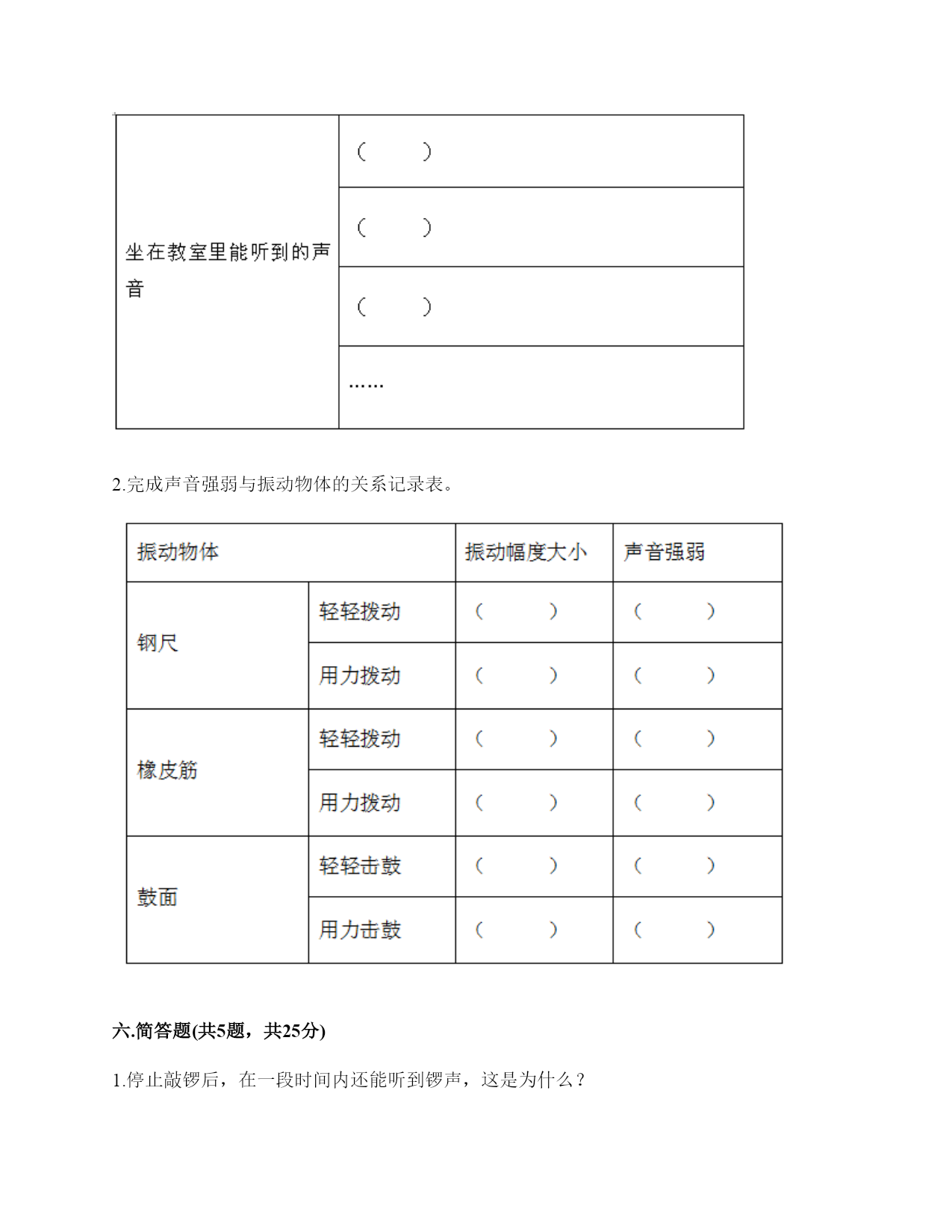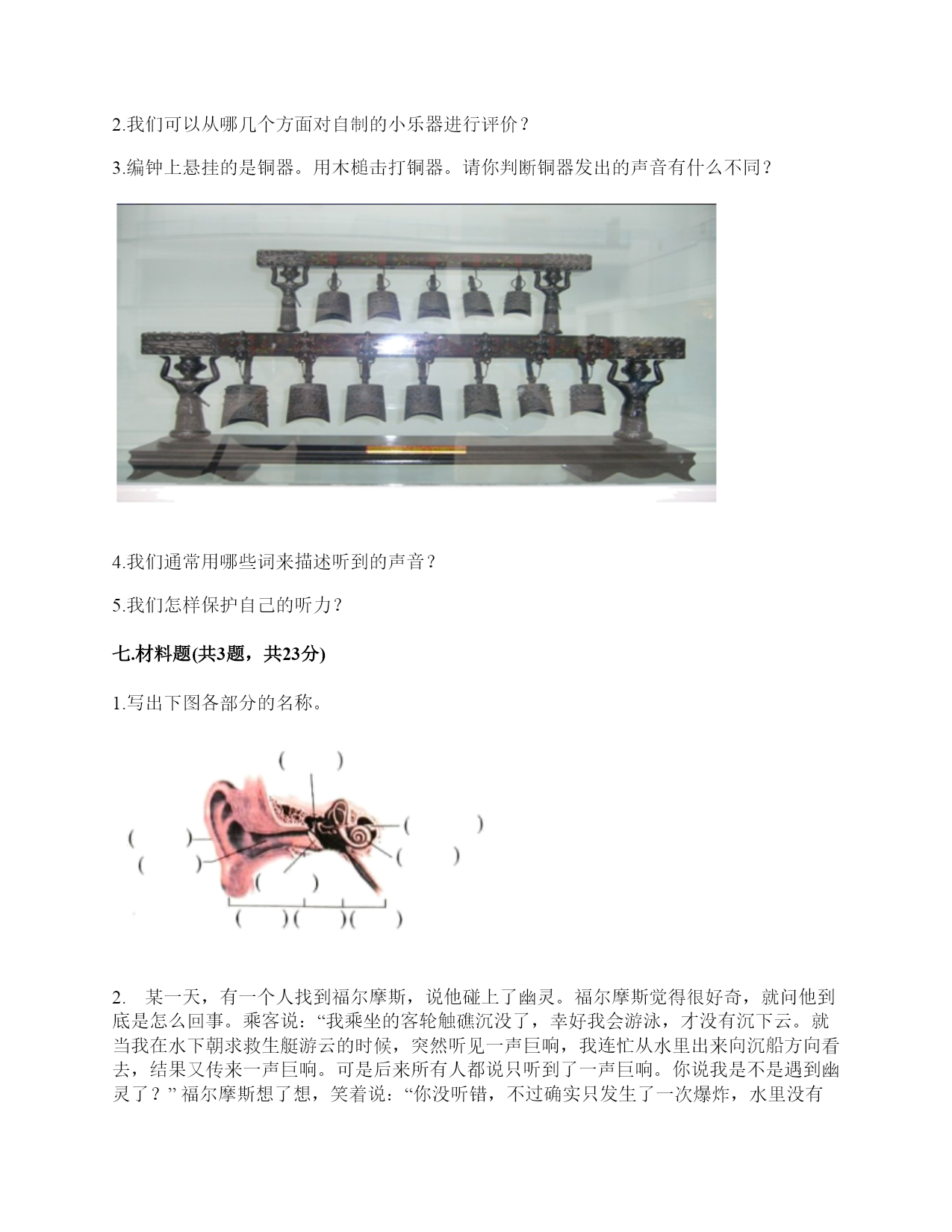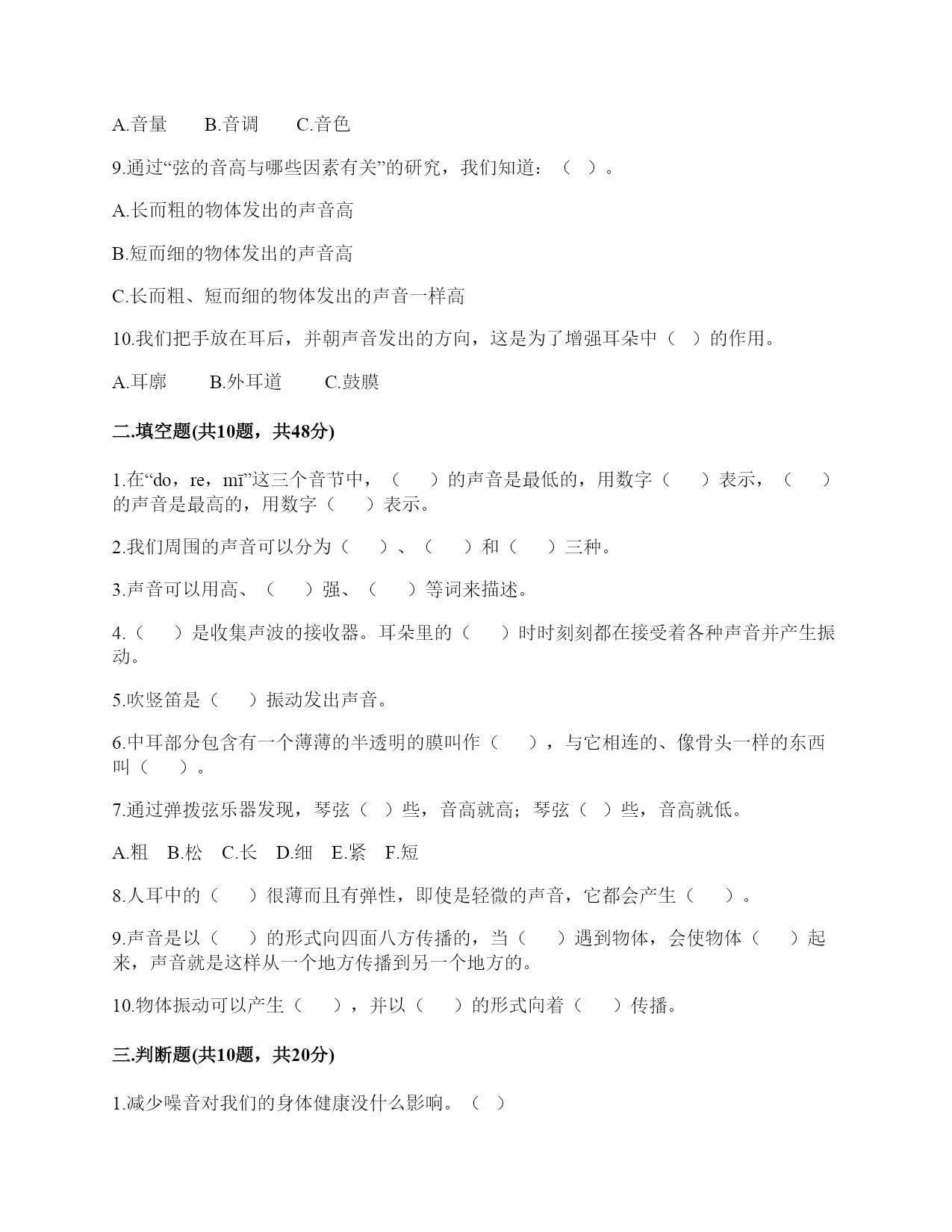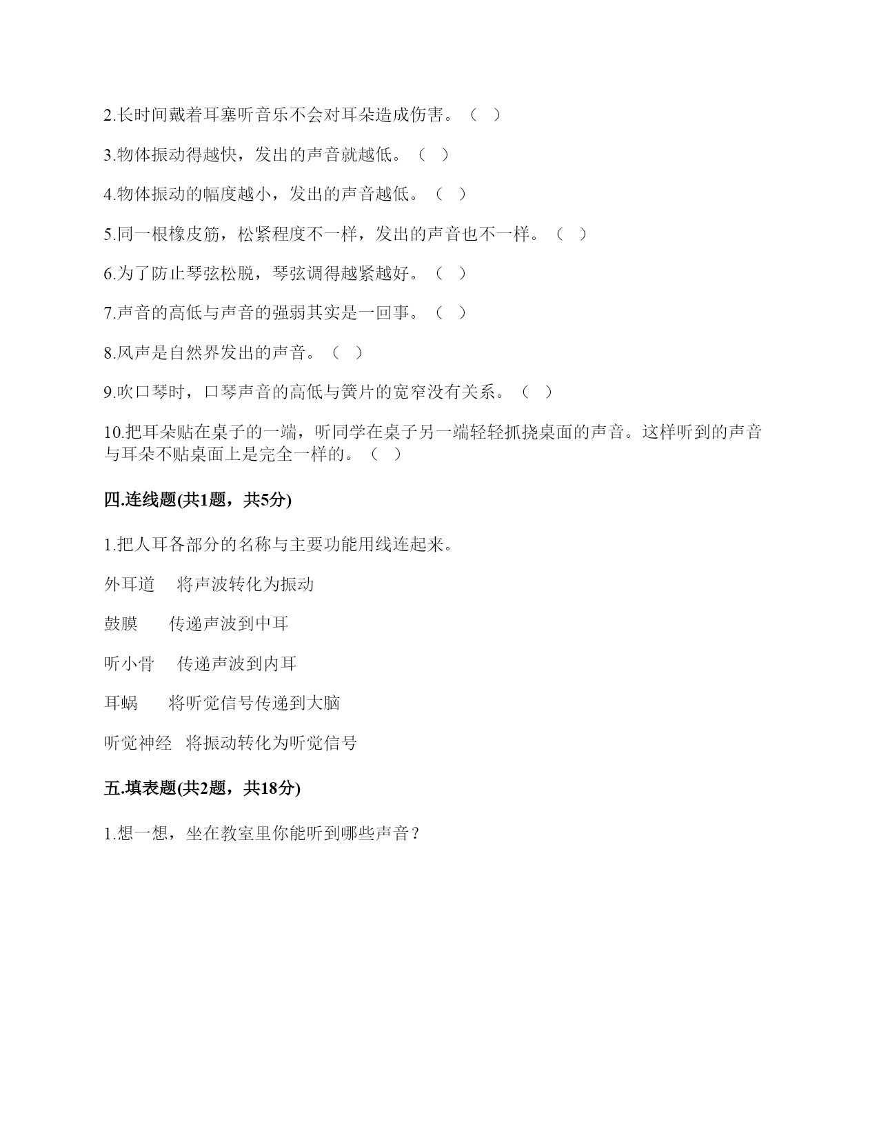 小学科学《声音》练习题一.选择题(共10题,共20分)1.下列描述声音的词语不合适的一组是()。A.高低、高兴B.悦耳、动听C.刺耳、难听2.我们读书时发出的声音是()振动而产生的。A.舌头B.嘴唇C.声带3.不能影响弦乐器音调高低的因素有()。A.音色B.松紧C.长短D.粗细4.声音不能在()中传播。A.真空B.固体C.液体5.如图是我国古代的乐器编钟,用小锤敲击它们,会发出悦耳的声音。我们发现,当小锤敲击时,越小的编钟发出的声音()。A.越高B.越强C.越低6.下列关于声音说法正确的是()。A.敲鼓时鼓面振动幅度大,声音越高B.乐器振动的越快,声音越强C.蚊子发出的声音比牛发出的声音音量弱7.平常所说的声音的强弱、大小、轻重,都是指()。A.音量B.音高C.音色8.调节电视机的声音旋钮,改变的是声音的()。A.音量B.音调C.音色9.通过“弦的音高与哪些因素有关”的研究,我们知道:()。A.长而粗的物体发出的声音高B.短而细的物体发出的声音高C.长而粗、短而细的物体发出的声音一样高10.我们把手放在耳后,并朝声音发出的方向,这是为了增强耳朵中()的作用。A.耳廓B.外耳道C.鼓膜二.填空题(共10题,共48分)1.在“do,re,mī”这三个音节中,()的声音是最低的,用数字()表示,()的声音是最高的,用数字()表示。2.我们周围的声音可以分为()、()和()三种。3.声音可以用高、()强、()等词来描述。4.()是收集声波的接收器。耳朵里的()时时刻刻都在接受着各种声音并产生振动。5.吹竖笛是()振动发出声音。6.中耳部分包含有一个薄薄的半透明的膜叫作(),与它相连的、像骨头一样的东西叫()。7.通过弹拨弦乐器发现,琴弦()些,音高就高;琴弦()些,音高就低。A.粗B.松C.长D.细E.紧F.短8.人耳中的()很薄而且有弹性,即使是轻微的声音,它都会产生()。9.声音是以()的形式向四面八方传播的,当()遇到物体,会使物体()起来,声音就是这样从一个地方传播到另一个地方的。10.物体振动可以产生(),并以()的形式向着()传播。三.判断题(共10题,共20分)1.减少噪音对我们的身体健康没什么影响。()2.长时间戴着耳塞听音乐不会对耳朵造成伤害。()3.物体振动得越快,发出的声音就越低。()4.物体振动的幅度越小,发出的声音越低。()5.同一根橡皮筋,松紧程度不一样,发出的声音也不一样。()6.为了防止琴弦松脱,琴弦调得越紧越好。()7.声音的高低与声音的强弱其实是一回事。()8.风声是自然界发出的声音。()9.吹口琴时,口琴声音的高低与簧片的宽窄没有关系。()10.把耳朵贴在桌子的一端,听同学在桌子另一端轻轻抓挠桌面的声音。这样听到的声音与耳朵不贴桌面上是完全一样的。()四.连线题(共1题,共5分)1.把人耳各部分的名称与主要功能用线连起来。外耳道将声波转化为振动鼓膜传递声波到中耳听小骨传递声波到内耳耳蜗将听觉信号传递到大脑听觉神经将振动转化为听觉信号五.填表题(共2题,共18分)1.想一想,坐在教室里你能听到哪些声音?2.完成声音强弱与振动物体的关系记录表。六.简答题(共5题,共25分)1.停止敲锣后,在一段时间内还能听到锣声,这是为什么?2.我们可以从哪几个方面对自制的小乐器进行评价?3.编钟上悬挂的是铜器。用木槌击打铜器。请你判断铜器发出的声音有什么不同?4.我们通常用哪些词来描述听到的声音?5.我们怎样保护自己的听力?七.材料题(共3题,共23分)1.写出下图各部分的名称。2.某一天,有一个人找到福尔摩斯,说他碰上了幽灵。福尔摩斯觉得很好奇,就问他到底是怎么回事。乘客说:“我乘坐的客轮触礁沉没了,幸好我会游泳,才没有沉下云。就当我在水下朝求救生艇游云的时候,突然听见一声巨响,我连忙从水里出来向沉船方向看去,结果又传来一声巨响。可是后来所有人都说只听到了一声巨响。你说我是不是遇到幽灵了?”福尔摩斯想了想,笑着说:“你没听错,不过确实只发生了一次爆炸,水里没有幽灵。”你能利用声音传播的知识,替福尔摩斯向这个人解释为什么会听到两次爆炸的声音吗?3.夏天的夜晚,我们经常能听到蟋蟀的叫声,可是,你知道吗?只有雄性蟋蟀会叫,雌性是不会叫的。而且,蟋蟀的叫声不是从口中发出的,而是靠翅膀的摩擦来发声的。在雄性蟋蟀的前翅上,有旋涡纹状的翅膜,一边翅膀长着锉刀状的翅膜——弦器,另一边翅膀长着较硬的翅膜——弹器。当这两种发音器相互摩擦时,就能发出声音。蟋蟀称得上是昆虫界里一名优秀的小提琴师。你还听见过哪些动物的叫声?试写出5种。八.综合题(共5题,共37分)1.如图,鼓面上放少量的碎纸屑
