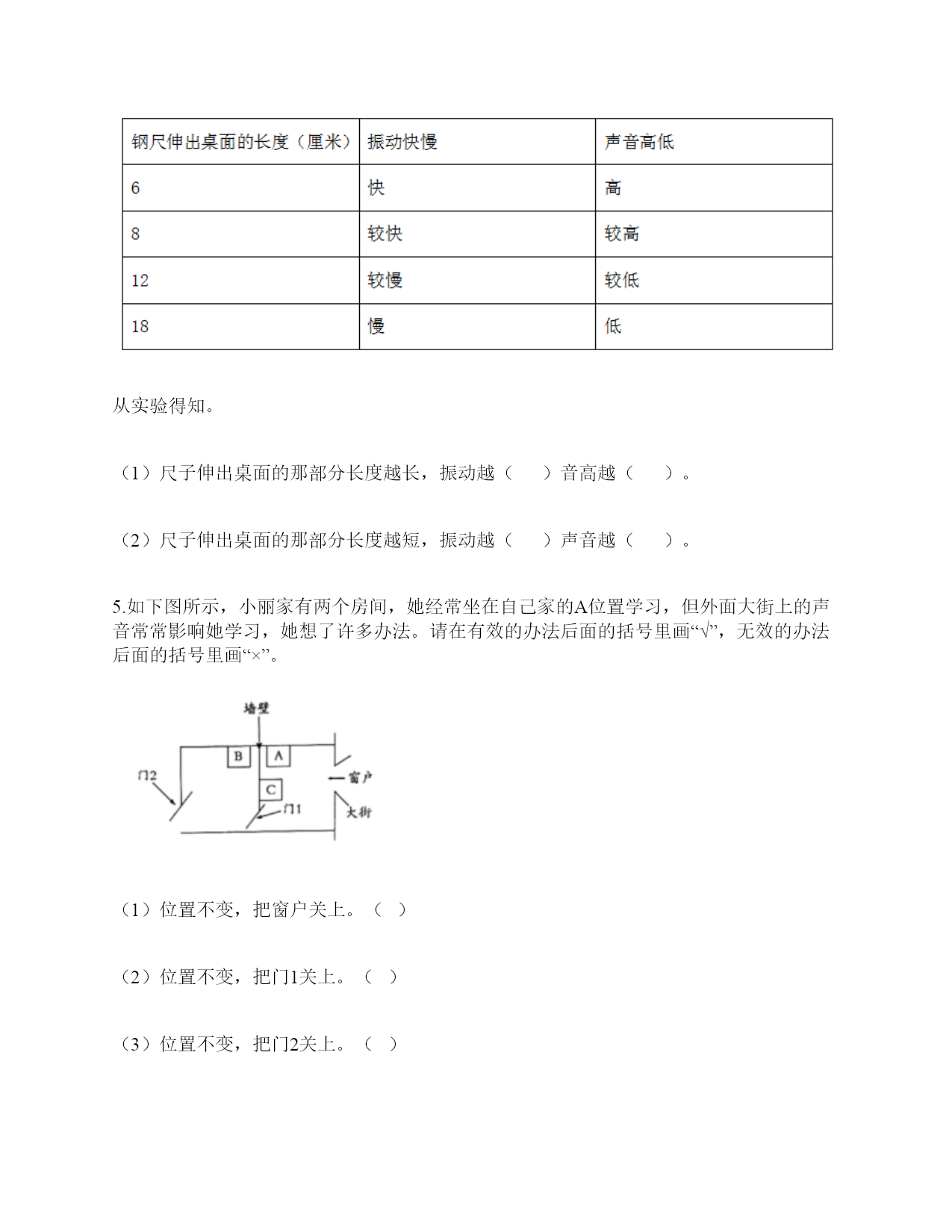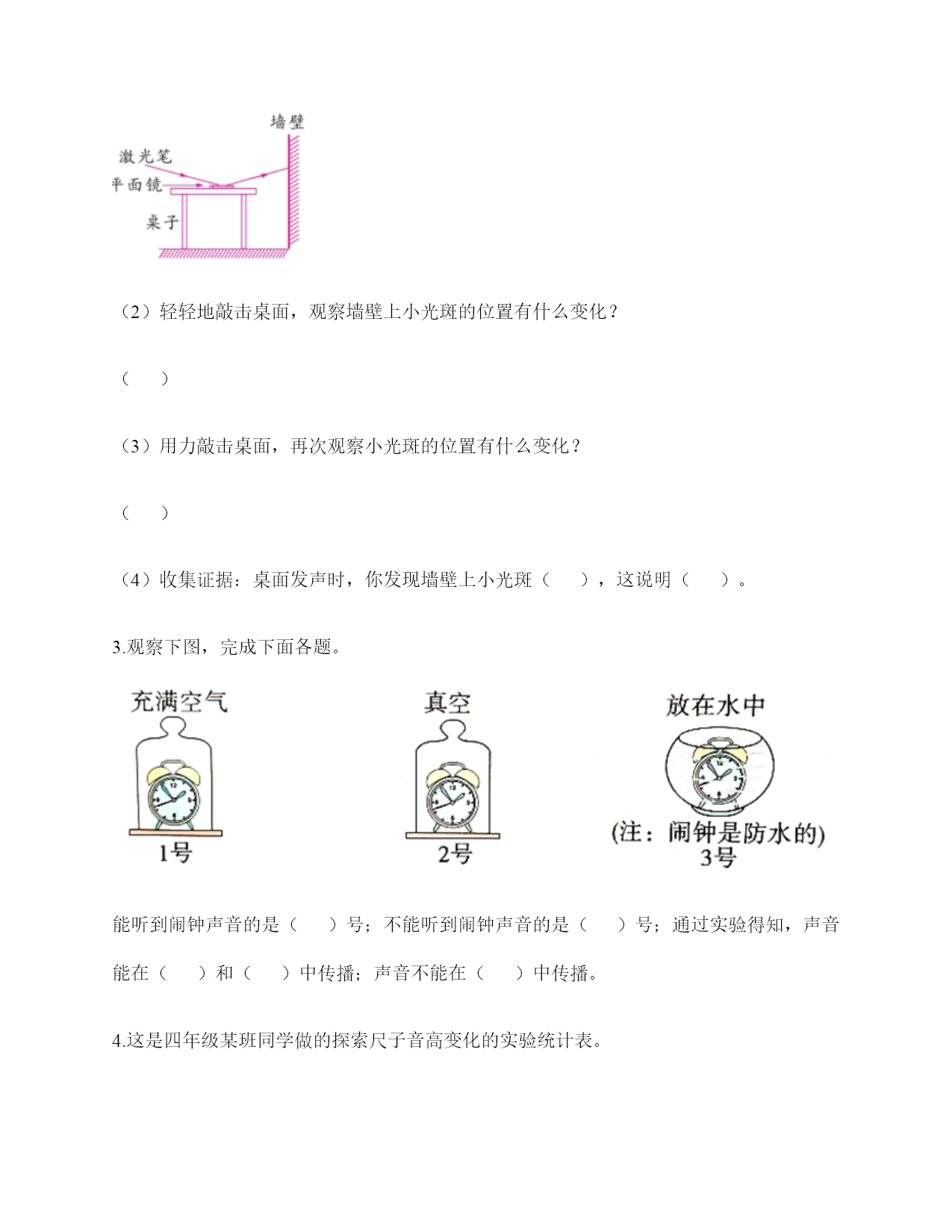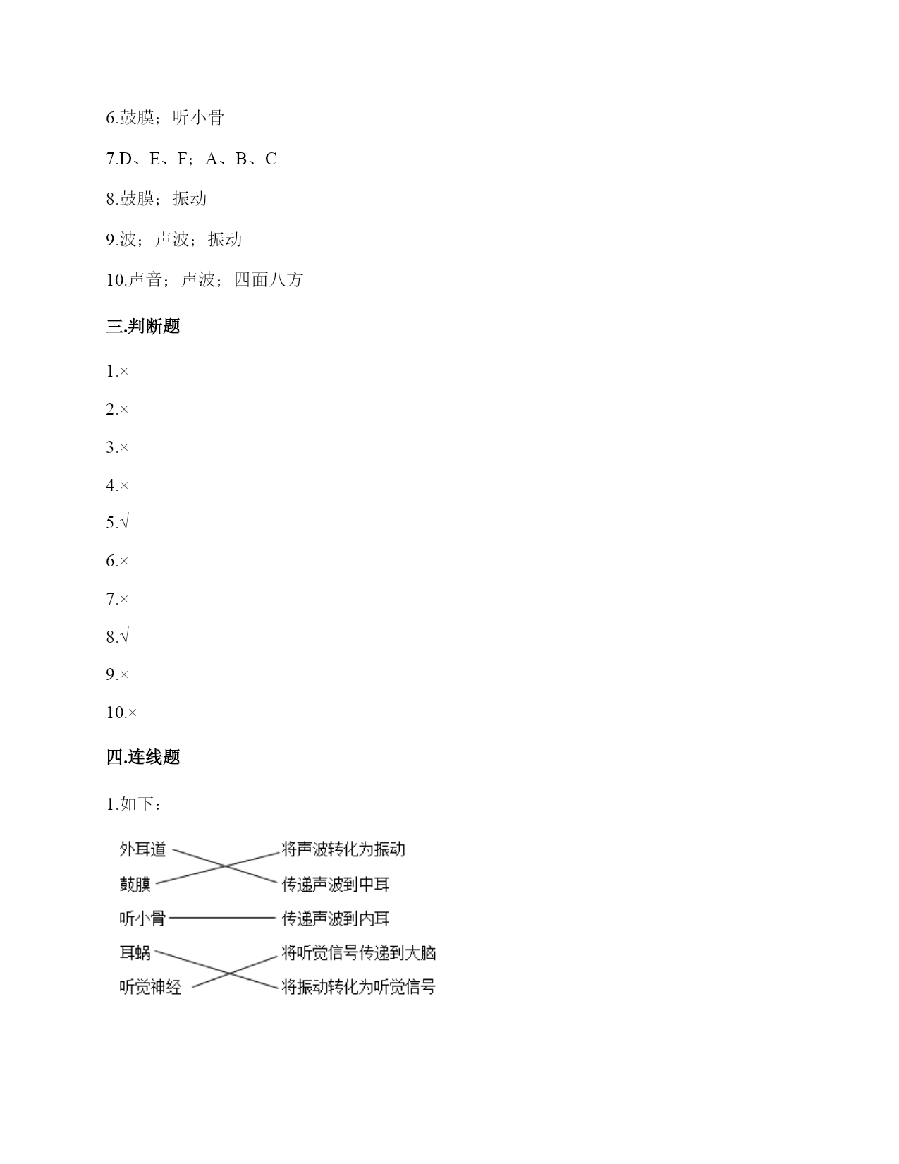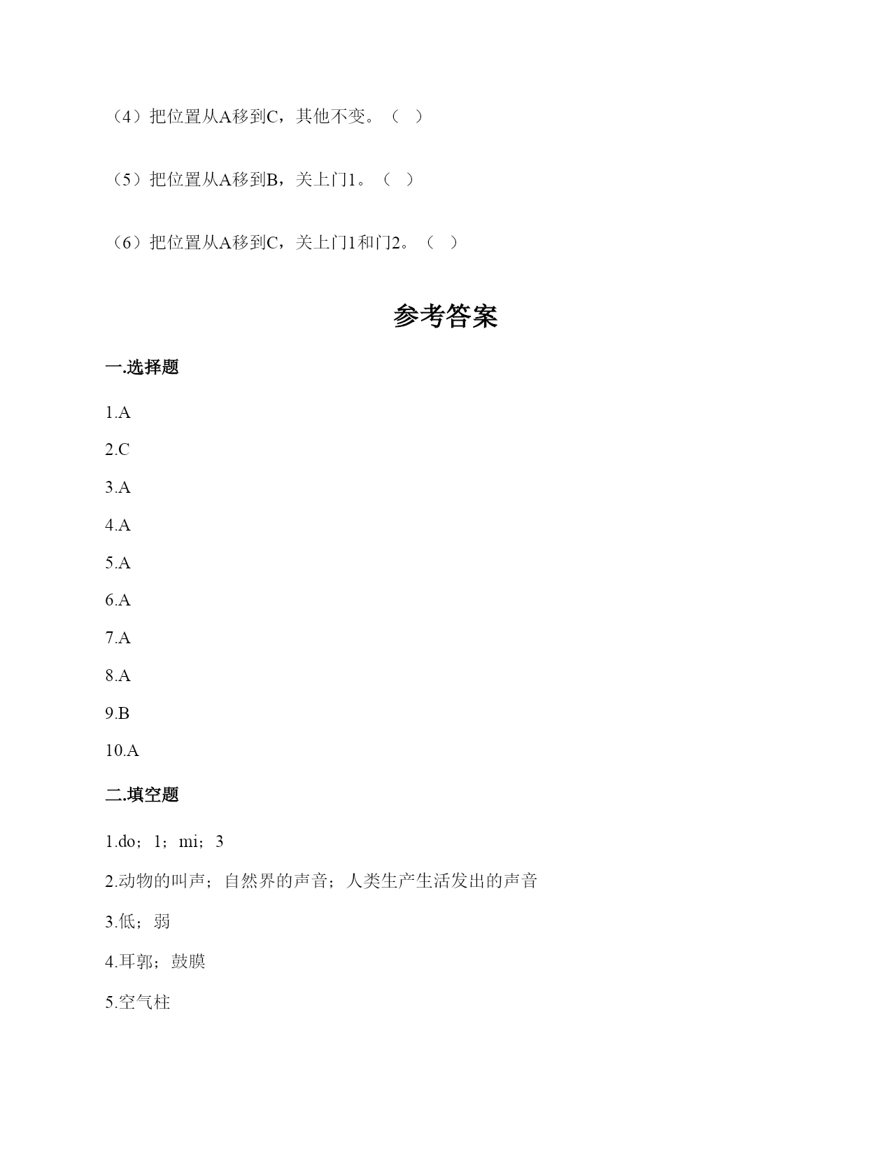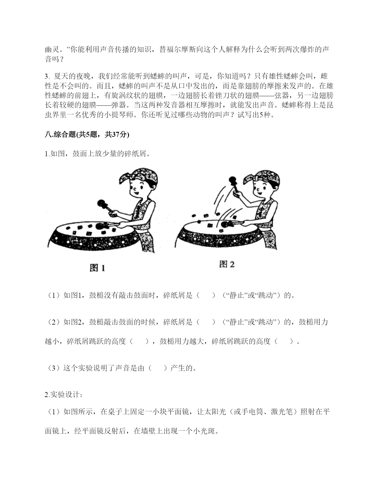 小学科学《声音》练习题一.选择题(共10题,共20分)1.下列描述声音的词语不合适的一组是()。A.高低、高兴B.悦耳、动听C.刺耳、难听2.我们读书时发出的声音是()振动而产生的。A.舌头B.嘴唇C.声带3.不能影响弦乐器音调高低的因素有()。A.音色B.松紧C.长短D.粗细4.声音不能在()中传播。A.真空B.固体C.液体5.如图是我国古代的乐器编钟,用小锤敲击它们,会发出悦耳的声音。我们发现,当小锤敲击时,越小的编钟发出的声音()。A.越高B.越强C.越低6.下列关于声音说法正确的是()。A.敲鼓时鼓面振动幅度大,声音越高B.乐器振动的越快,声音越强C.蚊子发出的声音比牛发出的声音音量弱7.平常所说的声音的强弱、大小、轻重,都是指()。A.音量B.音高C.音色8.调节电视机的声音旋钮,改变的是声音的()。A.音量B.音调C.音色9.通过“弦的音高与哪些因素有关”的研究,我们知道:()。A.长而粗的物体发出的声音高B.短而细的物体发出的声音高C.长而粗、短而细的物体发出的声音一样高10.我们把手放在耳后,并朝声音发出的方向,这是为了增强耳朵中()的作用。A.耳廓B.外耳道C.鼓膜二.填空题(共10题,共48分)1.在“do,re,mī”这三个音节中,()的声音是最低的,用数字()表示,()的声音是最高的,用数字()表示。2.我们周围的声音可以分为()、()和()三种。3.声音可以用高、()强、()等词来描述。4.()是收集声波的接收器。耳朵里的()时时刻刻都在接受着各种声音并产生振动。5.吹竖笛是()振动发出声音。6.中耳部分包含有一个薄薄的半透明的膜叫作(),与它相连的、像骨头一样的东西叫()。7.通过弹拨弦乐器发现,琴弦()些,音高就高;琴弦()些,音高就低。A.粗B.松C.长D.细E.紧F.短8.人耳中的()很薄而且有弹性,即使是轻微的声音,它都会产生()。9.声音是以()的形式向四面八方传播的,当()遇到物体,会使物体()起来,声音就是这样从一个地方传播到另一个地方的。10.物体振动可以产生(),并以()的形式向着()传播。三.判断题(共10题,共20分)1.减少噪音对我们的身体健康没什么影响。()2.长时间戴着耳塞听音乐不会对耳朵造成伤害。()3.物体振动得越快,发出的声音就越低。()4.物体振动的幅度越小,发出的声音越低。()5.同一根橡皮筋,松紧程度不一样,发出的声音也不一样。()6.为了防止琴弦松脱,琴弦调得越紧越好。()7.声音的高低与声音的强弱其实是一回事。()8.风声是自然界发出的声音。()9.吹口琴时,口琴声音的高低与簧片的宽窄没有关系。()10.把耳朵贴在桌子的一端,听同学在桌子另一端轻轻抓挠桌面的声音。这样听到的声音与耳朵不贴桌面上是完全一样的。()四.连线题(共1题,共5分)1.把人耳各部分的名称与主要功能用线连起来。外耳道将声波转化为振动鼓膜传递声波到中耳听小骨传递声波到内耳耳蜗将听觉信号传递到大脑听觉神经将振动转化为听觉信号五.填表题(共2题,共18分)1.想一想,坐在教室里你能听到哪些声音?2.完成声音强弱与振动物体的关系记录表。六.简答题(共5题,共25分)1.停止敲锣后,在一段时间内还能听到锣声,这是为什么?2.我们可以从哪几个方面对自制的小乐器进行评价?3.编钟上悬挂的是铜器。用木槌击打铜器。请你判断铜器发出的声音有什么不同?4.我们通常用哪些词来描述听到的声音?5.我们怎样保护自己的听力?七.材料题(共3题,共23分)1.写出下图各部分的名称。2.某一天,有一个人找到福尔摩斯,说他碰上了幽灵。福尔摩斯觉得很好奇,就问他到底是怎么回事。乘客说:“我乘坐的客轮触礁沉没了,幸好我会游泳,才没有沉下云。就当我在水下朝求救生艇游云的时候,突然听见一声巨响,我连忙从水里出来向沉船方向看去,结果又传来一声巨响。可是后来所有人都说只听到了一声巨响。你说我是不是遇到幽灵了?”福尔摩斯想了想,笑着说:“你没听错,不过确实只发生了一次爆炸,水里没有幽灵。”你能利用声音传播的知识,替福尔摩斯向这个人解释为什么会听到两次爆炸的声音吗?3.夏天的夜晚,我们经常能听到蟋蟀的叫声,可是,你知道吗?只有雄性蟋蟀会叫,雌性是不会叫的。而且,蟋蟀的叫声不是从口中发出的,而是靠翅膀的摩擦来发声的。在雄性蟋蟀的前翅上,有旋涡纹状的翅膜,一边翅膀长着锉刀状的翅膜——弦器,另一边翅膀长着较硬的翅膜——弹器。当这两种发音器相互摩擦时,就能发出声音。蟋蟀称得上是昆虫界里一名优秀的小提琴师。你还听见过哪些动物的叫声?试写出5种。八.综合题(共5题,共37分)1.如图,鼓面上放少量的碎纸屑