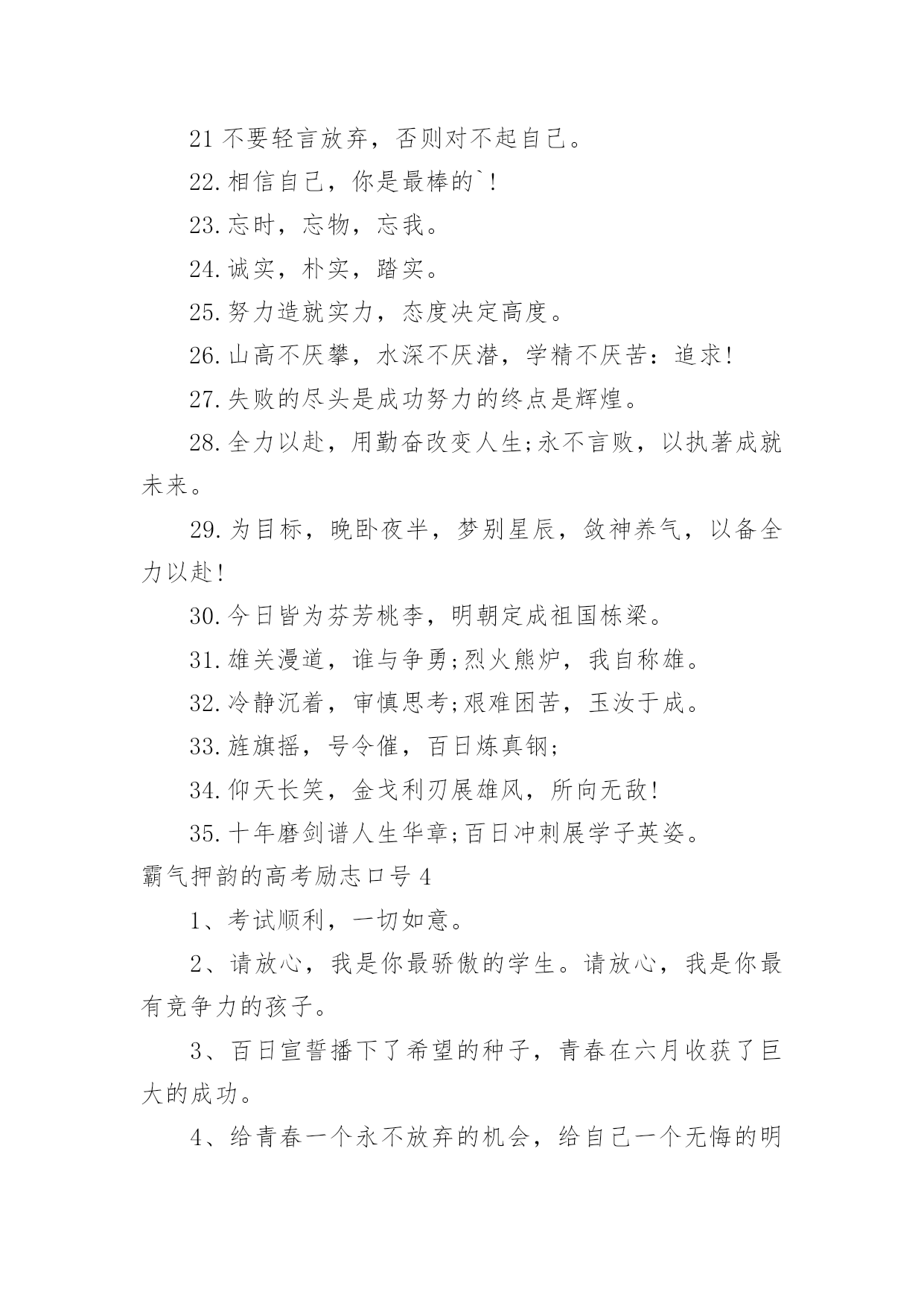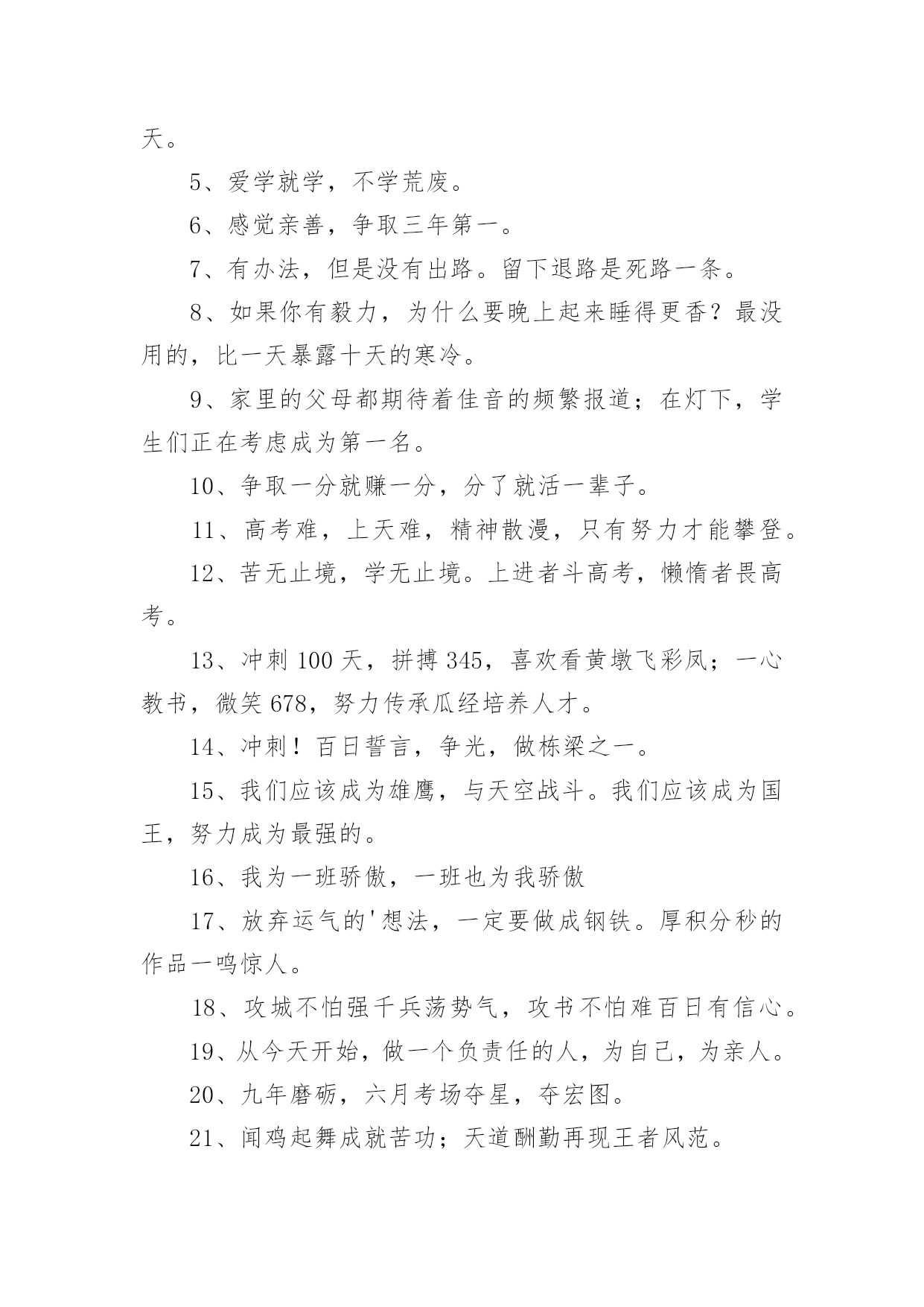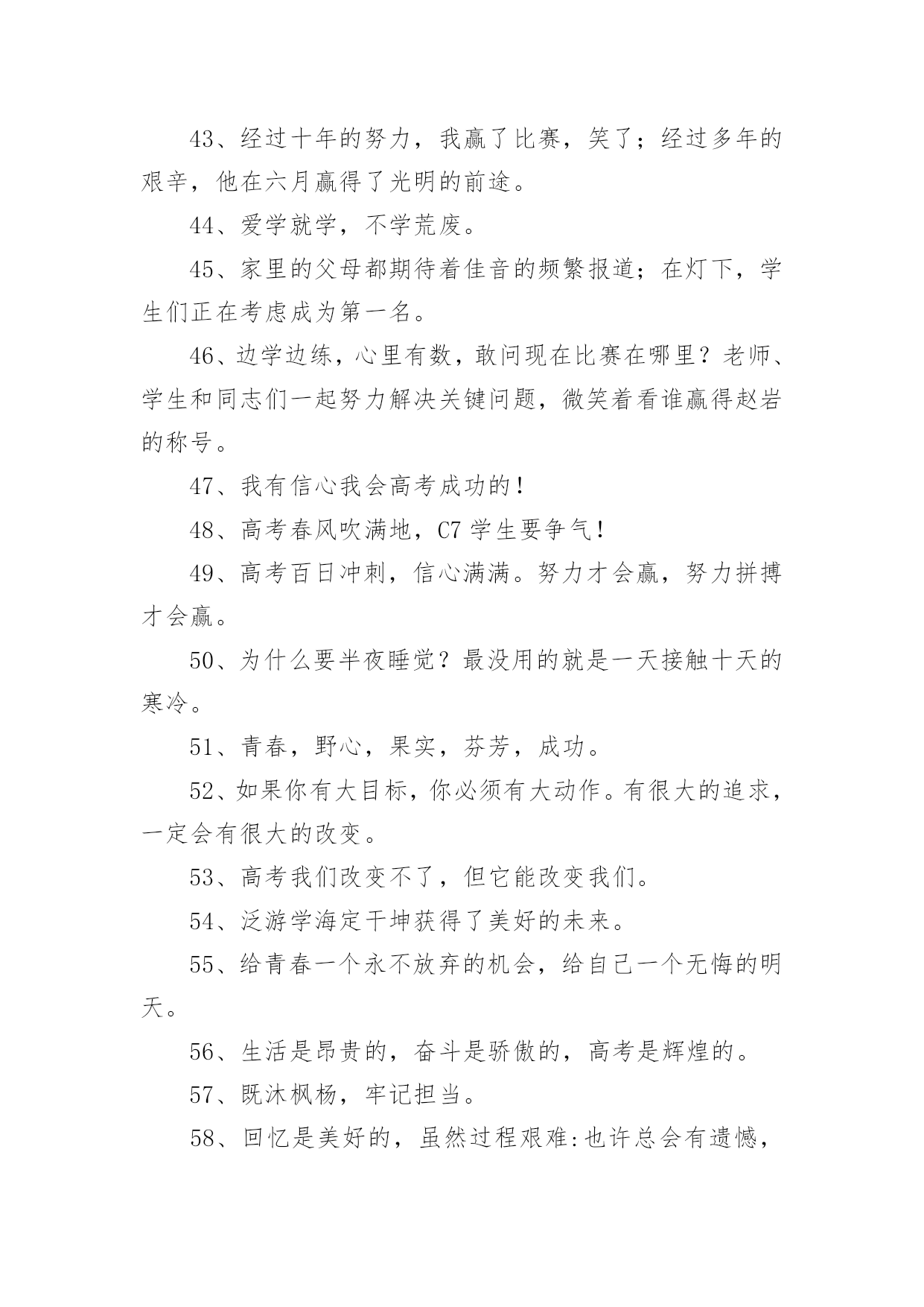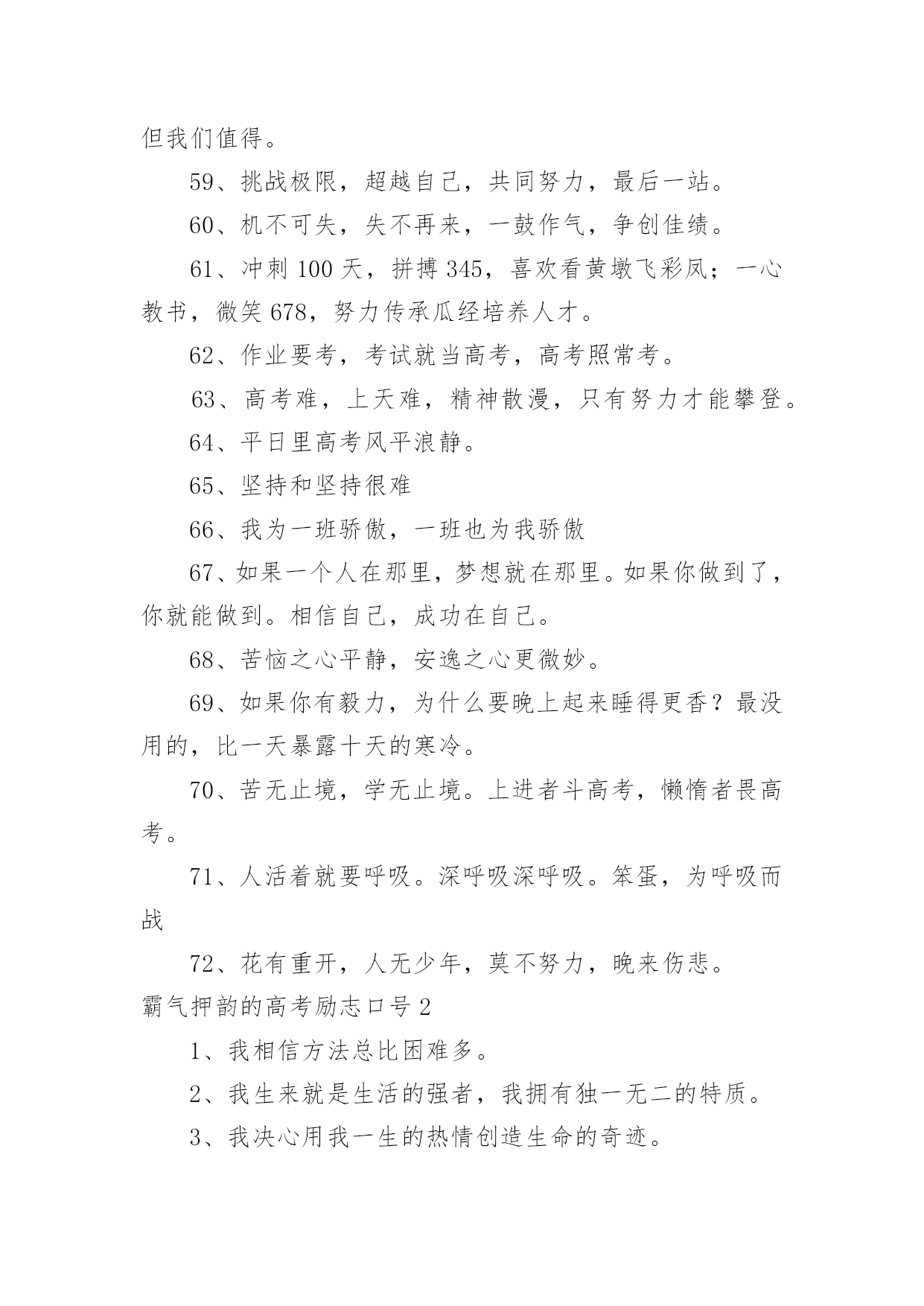 霸气押韵的高考励志口号霸气押韵的高考励志口号在日常生活或是工作学习中,大家都接触过比较经典的口号吧,口号在句式上,除了简短,容易记忆之外,还要容易念,容易传。你知道什么样的口号才能称之为经典吗?下面是小编精心整理的霸气押韵的高考励志口号,欢迎大家借鉴与参考,希望对大家有所帮助。霸气押韵的高考励志口号11、汗水洒出来,换来的是硕果累累的芬芳。争取明天。2、高三没有苦,没有累,没有味道。高中不打不打白活。3、一百天还短,一分钟精心安排还长。4、风雨同舟。从这个时候开始,成败就在今年了。5、十年苦读一朝决胜负换来笑逐颜开;数载艰辛六月定乾坤赢得似锦前程。高考励志口号简短霸气6、奖励老师们再多一百天,赢得光明的未来。7、不三思,不求教,不动笔墨,不读书,人生难得有几场争斗。8、做题会出问题,一个问题决定命运。9、从今天开始,做一个负责任的人,为自己,为亲人。10、当你在戴月佩戴星星的时候,你会向书学习,向书学习。11、号角已经吹响,胜利就在前方。以青春的名义宣誓:继续战斗。12、放弃运气的想法,一定要做成钢铁。厚积分秒的作品一鸣惊人。13、百日高考是一场战斗,振奋精神,充满信心,赢得努力。努力,斗志昂扬,生活中的每一次努力,如果你热爱战斗,都会胜利。14、感觉亲善,争取三年第一。15、决定心理的那片天空就是否阴霾甚至就是乌云密布的因素就是你自己,不能让自己永远有一个阳光灿烂的心情的人本身就就是一个失败。16、勇敢攀登书山,实现心中的梦想。17、攻城不怕强千兵荡势气,攻书不怕难百日有信心。18、我们应该成为雄鹰,与天空战斗。我们应该成为国王,努力成为最强的。19、卧虎藏龙,壮烈干云,马兵皆露;戴上戴月的星星,学业就成功了。20、永远赢,永远存。21、闻鸡起舞成就苦功;天道酬勤再现王者风范。22、累了就累了,就不会落后,就很难再放弃23、挑战极限,无怨无悔的活着。努力奋斗奋进,谱写壮丽篇章。24、对命运的承诺和对承诺的`责任25、百日宣誓播下了希望的种子,青春在六月收获了巨大的成功。26、考试顺利,一切如意。27、争取一分就赚一分,分了就活一辈子。28、头挂梁,锥咬,女写奇书;夜灯,五更鸡,大胡子写华章。29、我们要做雄鹰,搏击长空。我们要做王者,争做最强。30、九年磨砺,六月考场夺星,夺宏图。31、一百天,梦想启航。一百天,努力奋斗。一百天,放下梦想。32、风雨,夏秋冬,十年磨一剑。用自己的智慧实现梦想。33、努力工作,你就会成功。坚持才能胜利。34、我们不能改变艺考,但艺考可以改变我们。35、不学?将来别人壁咚的墙就是你砌的!36、有办法,但是没有出路。留下退路是死路一条。37、成千上万的诗歌和书籍充满了才华。谁是世界之王?38、高考励志学生的标语39、请放心,我是你最骄傲的学生。请放心,我是你最有竞争力的孩子。40、我是一个豪情万丈,志存高远的英雄。41、要成功,就要疯狂,下定决心勇往直前!42、忘记事情的时候就忘记事情。诚实,简单,实用。43、经过十年的努力,我赢了比赛,笑了;经过多年的艰辛,他在六月赢得了光明的前途。44、爱学就学,不学荒废。45、家里的父母都期待着佳音的频繁报道;在灯下,学生们正在考虑成为第一名。46、边学边练,心里有数,敢问现在比赛在哪里?老师、学生和同志们一起努力解决关键问题,微笑着看谁赢得赵岩的称号。47、我有信心我会高考成功的!48、高考春风吹满地,C7学生要争气!49、高考百日冲刺,信心满满。努力才会赢,努力拼搏才会赢。50、为什么要半夜睡觉?最没用的就是一天接触十天的寒冷。51、青春,野心,果实,芬芳,成功。52、如果你有大目标,你必须有大动作。有很大的追求,一定会有很大的改变。53、高考我们改变不了,但它能改变我们。54、泛游学海定干坤获得了美好的未来。55、给青春一个永不放弃的机会,给自己一个无悔的明天。56、生活是昂贵的,奋斗是骄傲的,高考是辉煌的。57、既沐枫杨,牢记担当。58、回忆是美好的,虽然过程艰难:也许总会有遗憾,但我们值得。59、挑战极限,超越自己,共同努力,最后一站。60、机不可失,失不再来,一鼓作气,争创佳绩。61、冲刺100天,拼搏345,喜欢看黄墩飞彩凤;一心教书,微笑678,努力传承瓜经培养人才。62、作业要考,考试就当高考,高考照常考。63、高考难,上天难,精神散漫,只有努力才能攀登。64、平日里高考风平浪静。65、坚持和坚持很难66、我为一班骄傲,一班也为我骄傲67、如果一个人在那里,梦想就在那里。如果你做到了,你就能做到。相信自己,成功在自己。68、苦恼之心平静,安逸之心更微妙。69、如果你有毅力,为什么要晚上起来睡得更香?最没用的,比一天暴露十天的寒冷。70、苦无止境,学无止境。上进者斗高考,懒惰者畏高考。71、人活着就要呼吸。深呼吸深呼吸。笨蛋,为呼吸而战7