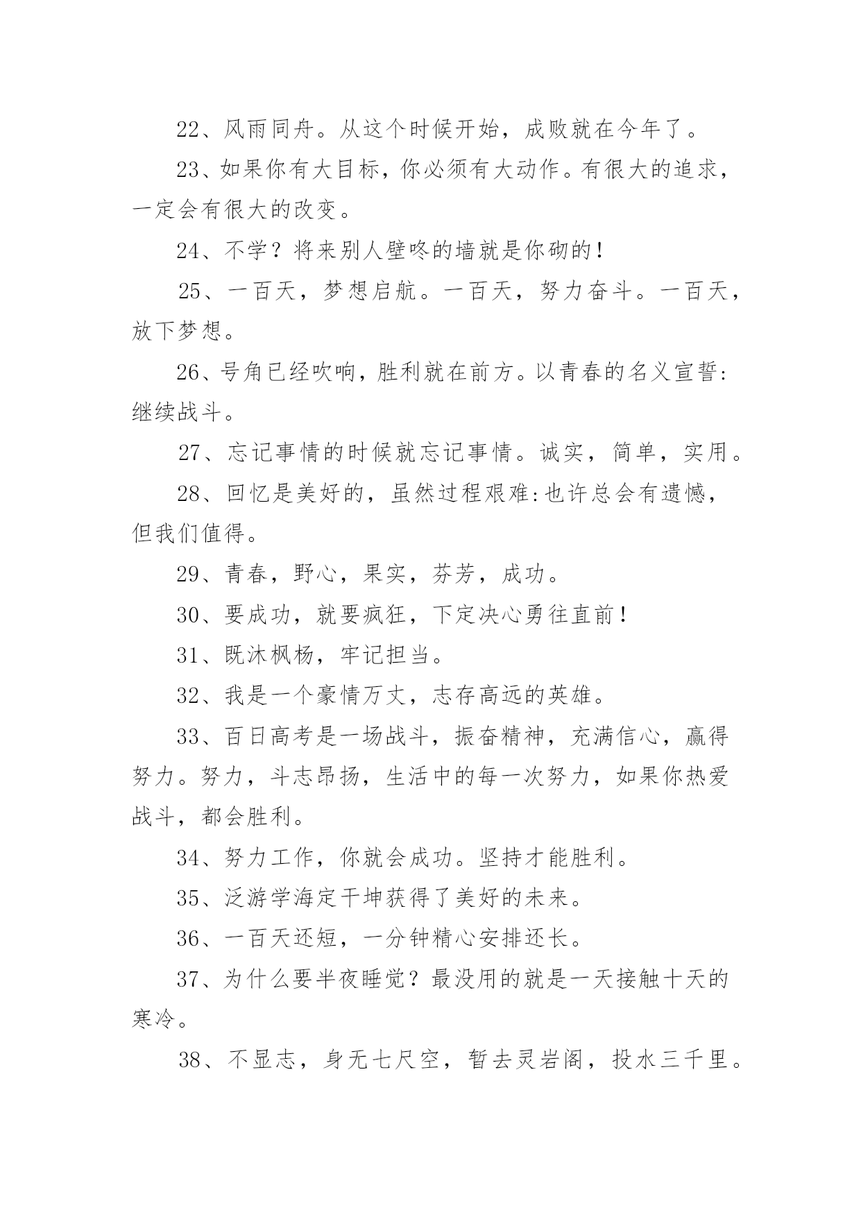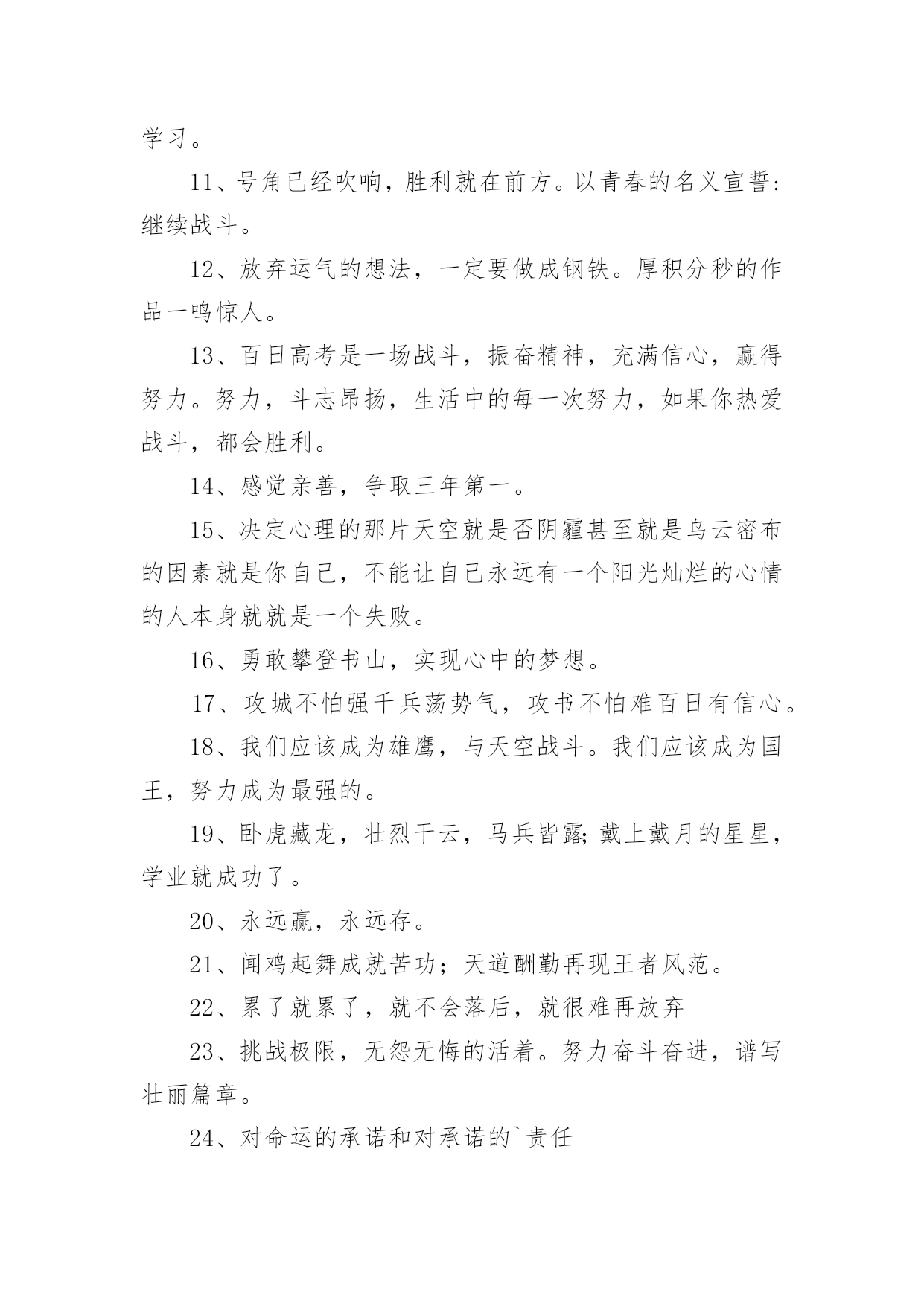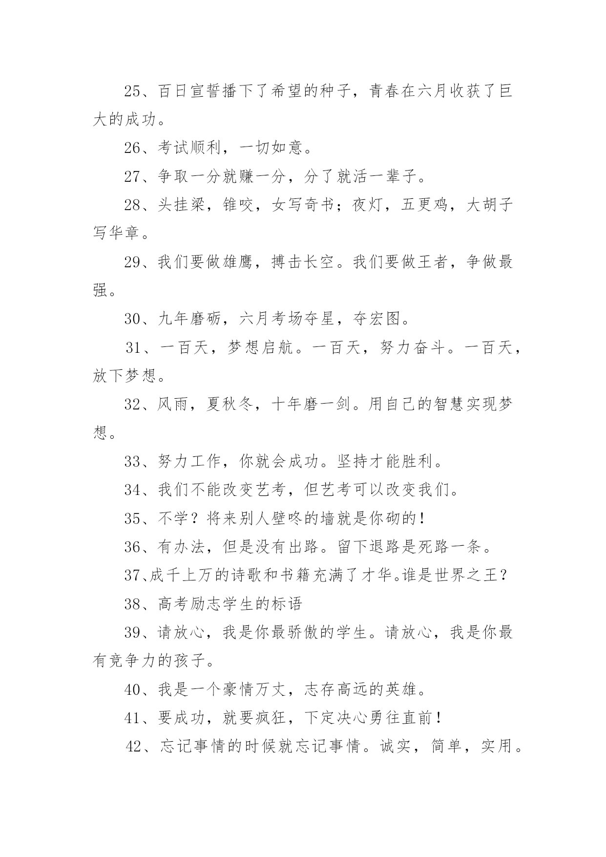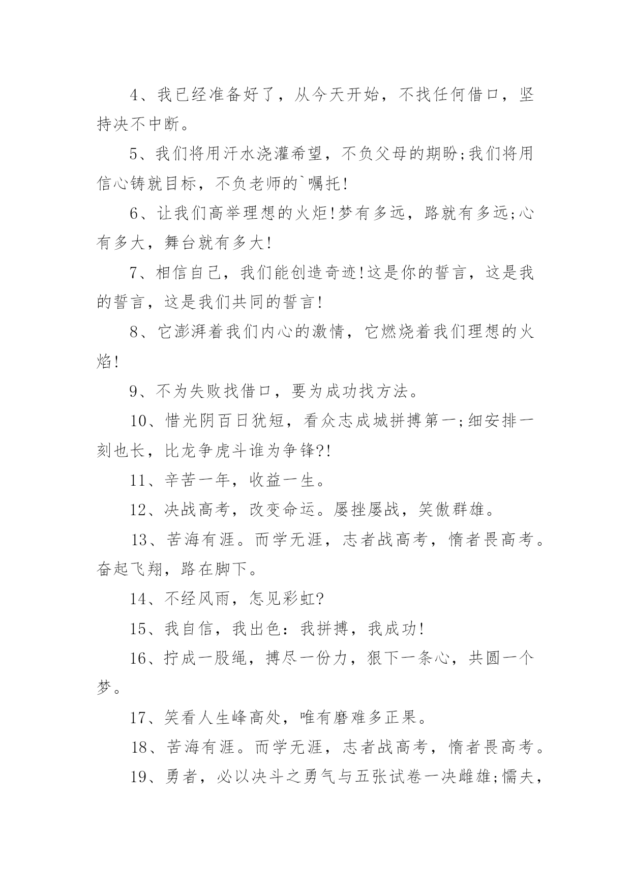 霸气押韵的高考励志口号霸气押韵的高考励志口号在日常生活或是工作学习中,大家都接触过比较经典的口号吧,口号在句式上,除了简短,容易记忆之外,还要容易念,容易传。你知道什么样的口号才能称之为经典吗?下面是小编精心整理的霸气押韵的高考励志口号,欢迎大家借鉴与参考,希望对大家有所帮助。霸气押韵的高考励志口号11、汗水洒出来,换来的是硕果累累的芬芳。争取明天。2、高三没有苦,没有累,没有味道。高中不打不打白活。3、一百天还短,一分钟精心安排还长。4、风雨同舟。从这个时候开始,成败就在今年了。5、十年苦读一朝决胜负换来笑逐颜开;数载艰辛六月定乾坤赢得似锦前程。高考励志口号简短霸气6、奖励老师们再多一百天,赢得光明的未来。7、不三思,不求教,不动笔墨,不读书,人生难得有几场争斗。8、做题会出问题,一个问题决定命运。9、从今天开始,做一个负责任的人,为自己,为亲人。10、当你在戴月佩戴星星的时候,你会向书学习,向书学习。11、号角已经吹响,胜利就在前方。以青春的名义宣誓:继续战斗。12、放弃运气的想法,一定要做成钢铁。厚积分秒的作品一鸣惊人。13、百日高考是一场战斗,振奋精神,充满信心,赢得努力。努力,斗志昂扬,生活中的每一次努力,如果你热爱战斗,都会胜利。14、感觉亲善,争取三年第一。15、决定心理的那片天空就是否阴霾甚至就是乌云密布的因素就是你自己,不能让自己永远有一个阳光灿烂的心情的人本身就就是一个失败。16、勇敢攀登书山,实现心中的梦想。17、攻城不怕强千兵荡势气,攻书不怕难百日有信心。18、我们应该成为雄鹰,与天空战斗。我们应该成为国王,努力成为最强的。19、卧虎藏龙,壮烈干云,马兵皆露;戴上戴月的星星,学业就成功了。20、永远赢,永远存。21、闻鸡起舞成就苦功;天道酬勤再现王者风范。22、累了就累了,就不会落后,就很难再放弃23、挑战极限,无怨无悔的活着。努力奋斗奋进,谱写壮丽篇章。24、对命运的承诺和对承诺的`责任25、百日宣誓播下了希望的种子,青春在六月收获了巨大的成功。26、考试顺利,一切如意。27、争取一分就赚一分,分了就活一辈子。28、头挂梁,锥咬,女写奇书;夜灯,五更鸡,大胡子写华章。29、我们要做雄鹰,搏击长空。我们要做王者,争做最强。30、九年磨砺,六月考场夺星,夺宏图。31、一百天,梦想启航。一百天,努力奋斗。一百天,放下梦想。32、风雨,夏秋冬,十年磨一剑。用自己的智慧实现梦想。33、努力工作,你就会成功。坚持才能胜利。34、我们不能改变艺考,但艺考可以改变我们。35、不学?将来别人壁咚的墙就是你砌的!36、有办法,但是没有出路。留下退路是死路一条。37、成千上万的诗歌和书籍充满了才华。谁是世界之王?38、高考励志学生的标语39、请放心,我是你最骄傲的学生。请放心,我是你最有竞争力的孩子。40、我是一个豪情万丈,志存高远的英雄。41、要成功,就要疯狂,下定决心勇往直前!42、忘记事情的时候就忘记事情。诚实,简单,实用。43、经过十年的努力,我赢了比赛,笑了;经过多年的艰辛,他在六月赢得了光明的前途。44、爱学就学,不学荒废。45、家里的父母都期待着佳音的频繁报道;在灯下,学生们正在考虑成为第一名。46、边学边练,心里有数,敢问现在比赛在哪里?老师、学生和同志们一起努力解决关键问题,微笑着看谁赢得赵岩的称号。47、我有信心我会高考成功的!48、高考春风吹满地,C7学生要争气!49、高考百日冲刺,信心满满。努力才会赢,努力拼搏才会赢。50、为什么要半夜睡觉?最没用的就是一天接触十天的寒冷。51、青春,野心,果实,芬芳,成功。52、如果你有大目标,你必须有大动作。有很大的追求,一定会有很大的改变。53、高考我们改变不了,但它能改变我们。54、泛游学海定干坤获得了美好的未来。55、给青春一个永不放弃的机会,给自己一个无悔的明天。56、生活是昂贵的,奋斗是骄傲的,高考是辉煌的。57、既沐枫杨,牢记担当。58、回忆是美好的,虽然过程艰难:也许总会有遗憾,但我们值得。59、挑战极限,超越自己,共同努力,最后一站。60、机不可失,失不再来,一鼓作气,争创佳绩。61、冲刺100天,拼搏345,喜欢看黄墩飞彩凤;一心教书,微笑678,努力传承瓜经培养人才。62、作业要考,考试就当高考,高考照常考。63、高考难,上天难,精神散漫,只有努力才能攀登。64、平日里高考风平浪静。65、坚持和坚持很难66、我为一班骄傲,一班也为我骄傲67、如果一个人在那里,梦想就在那里。如果你做到了,你就能做到。相信自己,成功在自己。68、苦恼之心平静,安逸之心更微妙。69、如果你有毅力,为什么要晚上起来睡得更香?最没用的,比一天暴露十天的寒冷。70、苦无止境,学无止境。上进者斗高考,懒惰者畏高考。71、人活着就要呼吸。深呼吸深呼吸。笨蛋,为呼吸而战7