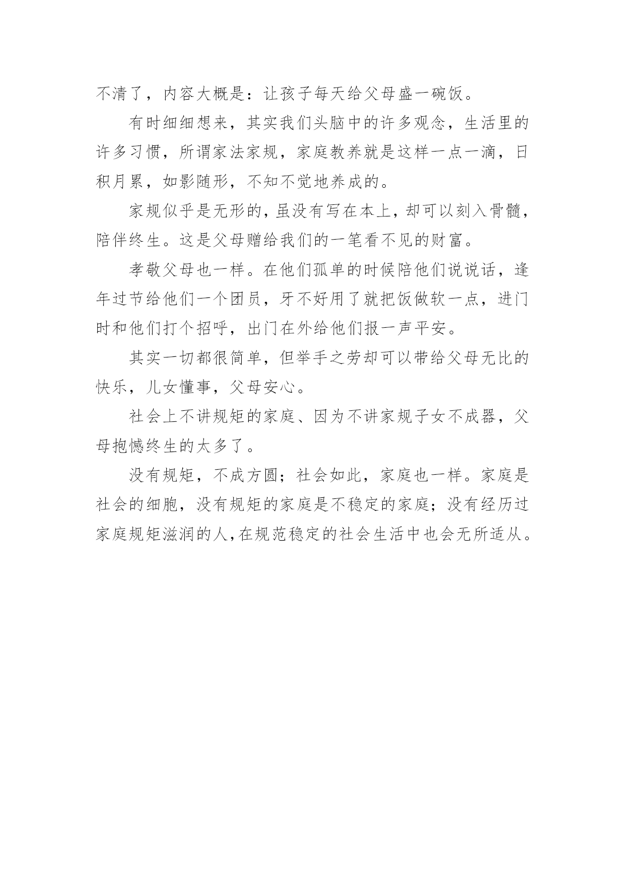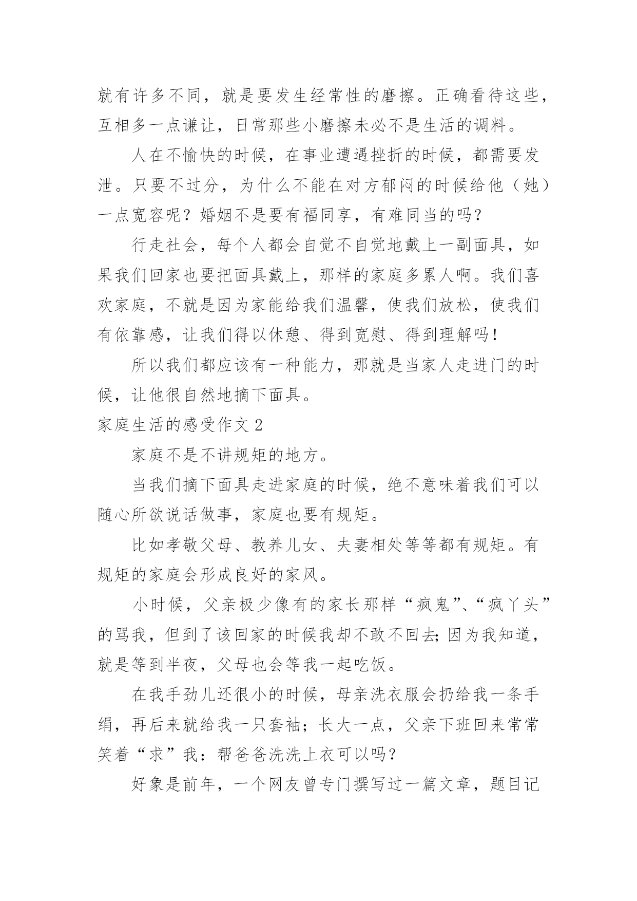 家庭生活的感受作文家庭生活的感受作文家庭生活的感受作文1人是种很奇怪的动物。家庭是给我们贡献最多、温暖最多的,但一旦我们喜欢上了某种工作或者说事业,我们首先忽略的就是家庭,还有亲人。人生几十年,回过头去才发现锅碗瓢盆交响曲,俗人俗事平凡人生其实也蕴涵着许多规律。正如有的网友说的:家不是讲理的地方。人在精神上常常有两种表现:常态和非常态。正常情况下,家里人累,烦了,不舒服了,我们都会嘘寒问暖,体贴倍至。但如果我们也烦了,就会忽略他人的感受,甚至淡漠他们的存在。换一种情况,日常生活中,多数人不会把外面的烦恼带回家里,但如果情况比较严重,就很难说。这种情况下,常常会爆发家庭战争;即使没有战争也常常会造成误解。还有一种情况,即使没有外在因素,因为家庭生活习惯、思维方式的`不同,夫妻之间也常常会有让对方很难理解,很难接受的时候。这或许就是婚姻危险期出现的部分原因吧。其实细细想来,当一个家庭组成之后,一个人的肩上其实承担的是两个人的命运。唯有相互理解,相互体贴,相互关照,家庭生活才会幸福美满。在现实生活中,两个家庭的信仰、习惯、生活方式本来就有许多不同,就是要发生经常性的磨擦。正确看待这些,互相多一点谦让,日常那些小磨擦未必不是生活的调料。人在不愉快的时候,在事业遭遇挫折的时候,都需要发泄。只要不过分,为什么不能在对方郁闷的时候给他(她)一点宽容呢?婚姻不是要有福同享,有难同当的吗?行走社会,每个人都会自觉不自觉地戴上一副面具,如果我们回家也要把面具戴上,那样的家庭多累人啊。我们喜欢家庭,不就是因为家能给我们温馨,使我们放松,使我们有依靠感,让我们得以休憩、得到宽慰、得到理解吗!所以我们都应该有一种能力,那就是当家人走进门的时候,让他很自然地摘下面具。家庭生活的感受作文2家庭不是不讲规矩的地方。当我们摘下面具走进家庭的时候,绝不意味着我们可以随心所欲说话做事,家庭也要有规矩。比如孝敬父母、教养儿女、夫妻相处等等都有规矩。有规矩的家庭会形成良好的家风。小时候,父亲极少像有的家长那样“疯鬼”、“疯丫头”的骂我,但到了该回家的时候我却不敢不回去;因为我知道,就是等到半夜,父母也会等我一起吃饭。在我手劲儿还很小的时候,母亲洗衣服会扔给我一条手绢,再后来就给我一只套袖;长大一点,父亲下班回来常常笑着“求”我:帮爸爸洗洗上衣可以吗?好象是前年,一个网友曾专门撰写过一篇文章,题目记不清了,内容大概是:让孩子每天给父母盛一碗饭。有时细细想来,其实我们头脑中的许多观念,生活里的许多习惯,所谓家法家规,家庭教养就是这样一点一滴,日积月累,如影随形,不知不觉地养成的。家规似乎是无形的,虽没有写在本上,却可以刻入骨髓,陪伴终生。这是父母赠给我们的一笔看不见的财富。孝敬父母也一样。在他们孤单的时候陪他们说说话,逢年过节给他们一个团员,牙不好用了就把饭做软一点,进门时和他们打个招呼,出门在外给他们报一声平安。其实一切都很简单,但举手之劳却可以带给父母无比的快乐,儿女懂事,父母安心。社会上不讲规矩的家庭、因为不讲家规子女不成器,父母抱憾终生的太多了。没有规矩,不成方圆;社会如此,家庭也一样。家庭是社会的细胞,没有规矩的家庭是不稳定的家庭;没有经历过家庭规矩滋润的人,在规范稳定的社会生活中也会无所适从。