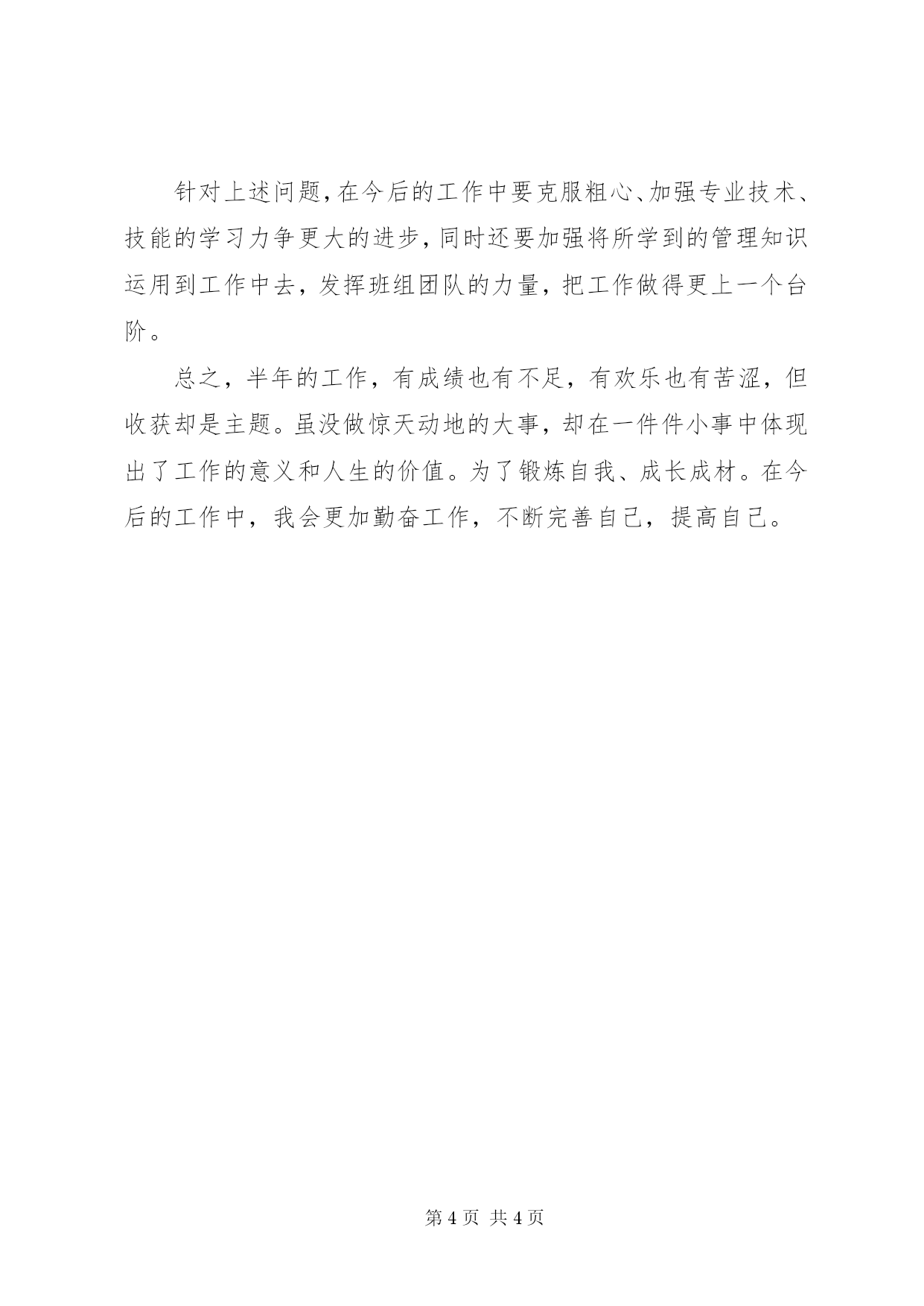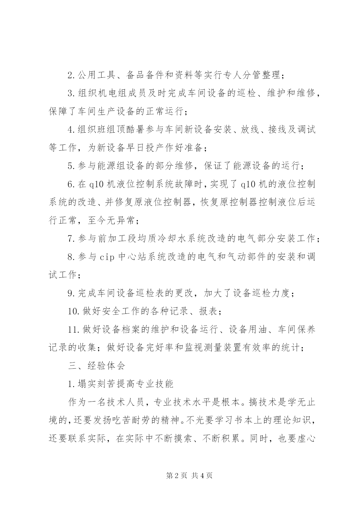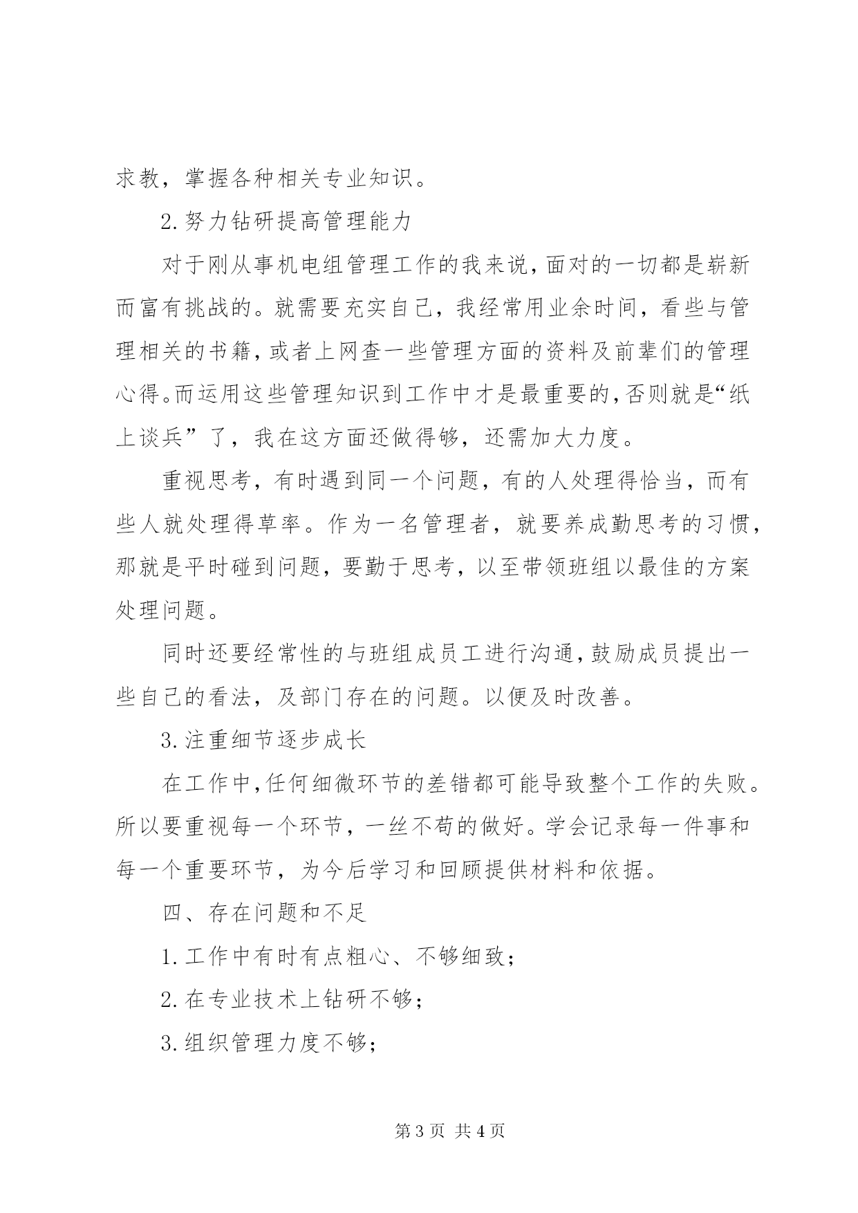 第PAGE\*Arabic\*MERGEFORMAT4页共NUMPAGES\*MERGEFORMAT4页机电设备管理部门述职报告时光飞逝,转眼间从配电室调出来工作已近半年。在这半年里,我在厂部和科室的正确领导和关心支持下,本着积极的工作态度和热情的服务精神,一边尽己所能的工作,一边虚心的学习新知识。为机电组和科室做了一些实实在在的事情,取得了一定的成绩。但还存在一些不足,有待提高和改进。一、工作内容我的工作内容大致分为机电组工作和设备科科室工作。机电组工作:1.组织班组成员做好车间设备的巡检、维护和维修工作;2.参与巡检和重点维护、维修工作;3.负责机电组和变配电室的现场规范和管理;科室工作:1.安全工作:填写安全检查记录、安全整改记录、安全月报表、安全季报表;2.质量工作:整理维护设备档案资料;收集整理冰机、锅炉、变配电运行记录、设备用油记录和车间设备保养记录;统计设备完好率和监视测量装置有效率;3.完成领导安排的其他工作;二、主要成绩1.在机电组规范了个人用品的摆放,如:茶杯、工作鞋等;2.公用工具、备品备件和资料等实行专人分管整理;3.组织机电组成员及时完成车间设备的巡检、维护和维修,保障了车间生产设备的正常运行;4.组织班组顶酷暑参与车间新设备安装、放线、接线及调试等工作,为新设备早日投产作好准备;5.参与能源组设备的部分维修,保证了能源设备的运行;6.在q10机液位控制系统故障时,实现了q10机的液位控制系统的改造、并修复原液位控制器,恢复原控制器控制液位后运行正常,至今无异常;7.参与前加工段均质冷却水系统改造的电气部分安装工作;8.参与cip中心站系统改造的电气和气动部件的安装和调试工作;9.完成车间设备巡检表的更改,加大了设备巡检力度;10.做好安全工作的各种记录、报表;11.做好设备档案的维护和设备运行、设备用油、车间保养记录的收集;做好设备完好率和监视测量装置有效率的统计;三、经验体会1.塌实刻苦提高专业技能作为一名技术人员,专业技术水平是根本。搞技术是学无止境的,还要发扬吃苦耐劳的精神。不光要学习书本上的理论知识,还要联系实际,在实际中不断摸索、不断积累。同时,也要虚心求教,掌握各种相关专业知识。2.努力钻研提高管理能力对于刚从事机电组管理工作的我来说,面对的一切都是崭新而富有挑战的。就需要充实自己,我经常用业余时间,看些与管理相关的书籍,或者上网查一些管理方面的资料及前辈们的管理心得。而运用这些管理知识到工作中才是最重要的,否则就是“纸上谈兵”了,我在这方面还做得够,还需加大力度。重视思考,有时遇到同一个问题,有的人处理得恰当,而有些人就处理得草率。作为一名管理者,就要养成勤思考的习惯,那就是平时碰到问题,要勤于思考,以至带领班组以最佳的方案处理问题。同时还要经常性的与班组成员工进行沟通,鼓励成员提出一些自己的看法,及部门存在的问题。以便及时改善。3.注重细节逐步成长在工作中,任何细微环节的差错都可能导致整个工作的失败。所以要重视每一个环节,一丝不苟的做好。学会记录每一件事和每一个重要环节,为今后学习和回顾提供材料和依据。四、存在问题和不足1.工作中有时有点粗心、不够细致;2.在专业技术上钻研不够;3.组织管理力度不够;针对上述问题,在今后的工作中要克服粗心、加强专业技术、技能的学习力争更大的进步,同时还要加强将所学到的管理知识运用到工作中去,发挥班组团队的力量,把工作做得更上一个台阶。总之,半年的工作,有成绩也有不足,有欢乐也有苦涩,但收获却是主题。虽没做惊天动地的大事,却在一件件小事中体现出了工作的意义和人生的价值。为了锻炼自我、成长成材。在今后的工作中,我会更加勤奋工作,不断完善自己,提高自己。