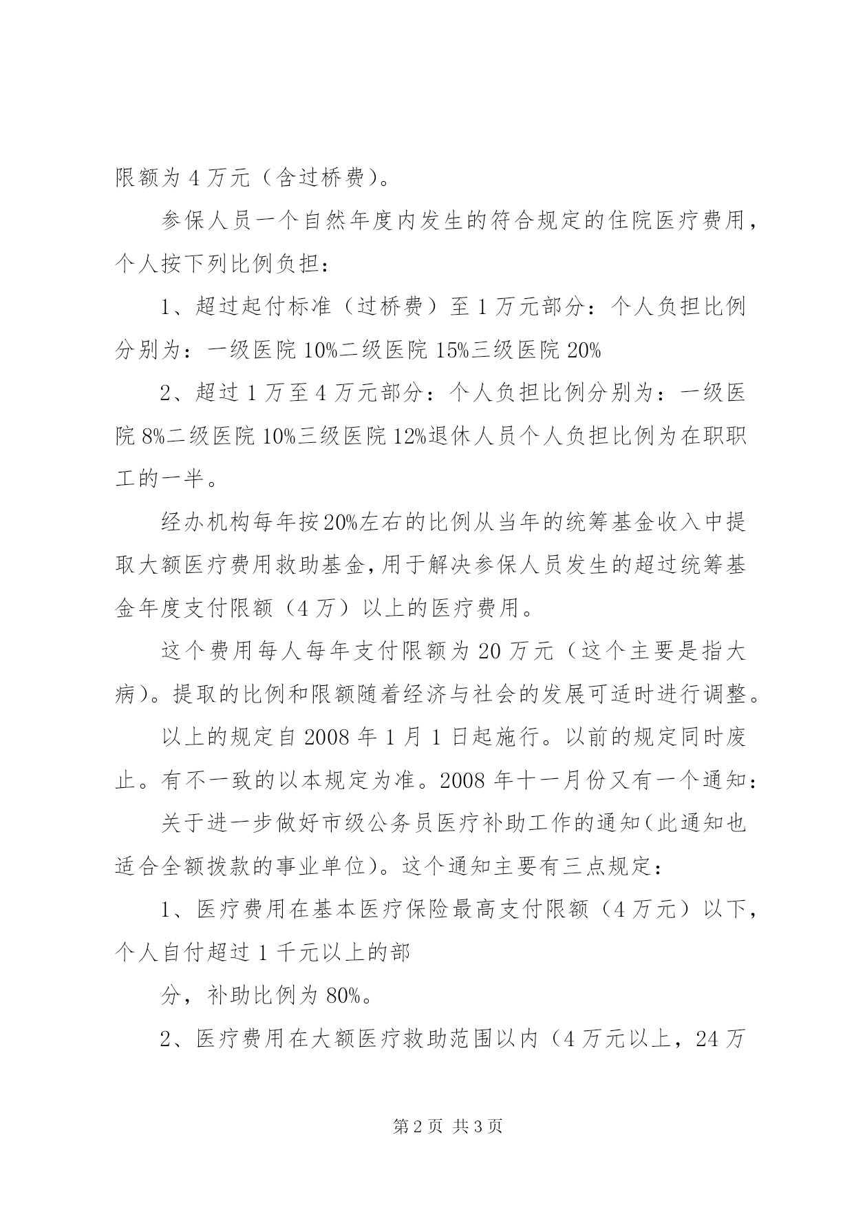 第PAGE\*Arabic\*MERGEFORMAT3页共NUMPAGES\*MERGEFORMAT3页医疗保险稽查工作规定医疗保险的缴费基数,用人单位(财政)按8%的比例缴纳,个人按2%的比例缴纳(直接在工资单里扣),总共给医保是10%,医保用这10%成立了两个账户,一个是医疗保险个人账户,二是统筹基金账户。这10%按如下比例计入个人账户,不满46周岁的按1.5%计入,46周岁以上的按2%计入。剩下的计入医疗保险统筹基金账户,由经办机构统一管理和支付。社会上的灵活就业人员(没有单位的人员)10%都是自己缴纳。计入个人账户的比例是不满46周岁的按3.5%计入,46周岁以上的按4%计入,剩下的计入统筹基金账户。退休人员(不分机关、事业单位还是灵活就业人员)都是按照本人上年度退休费总额的7%计入个人账户。下面讲一下统筹基金的用途:统筹基金用来支付参保人员的住院医疗费用和门诊慢性病医疗费用。统筹基金支付住院费用设置了起付标准(过桥费)一级医院400元(乡镇医院),二级医院700元,三级医院900元(市里医院),在一个自然年度内,参保人员第一、二次住院需要交过桥费,第三次就不用交了。年度支付限额为4万元(含过桥费)。参保人员一个自然年度内发生的符合规定的住院医疗费用,个人按下列比例负担:1、超过起付标准(过桥费)至1万元部分:个人负担比例分别为:一级医院10%二级医院15%三级医院20%2、超过1万至4万元部分:个人负担比例分别为:一级医院8%二级医院10%三级医院12%退休人员个人负担比例为在职职工的一半。经办机构每年按20%左右的比例从当年的统筹基金收入中提取大额医疗费用救助基金,用于解决参保人员发生的超过统筹基金年度支付限额(4万)以上的医疗费用。这个费用每人每年支付限额为20万元(这个主要是指大病)。提取的比例和限额随着经济与社会的发展可适时进行调整。以上的规定自2008年1月1日起施行。以前的规定同时废止。有不一致的以本规定为准。2008年十一月份又有一个通知:关于进一步做好市级公务员医疗补助工作的通知(此通知也适合全额拨款的事业单位)。这个通知主要有三点规定:1、医疗费用在基本医疗保险最高支付限额(4万元)以下,个人自付超过1千元以上的部分,补助比例为80%。2、医疗费用在大额医疗救助范围以内(4万元以上,24万元以下),个人自付比例为90%。3、医疗费用在大额医疗救助最高支付限额(24万元)以上,个人自付比例为100%这三条规定自2009年1月1日起执行。(当年的费用要等到来年再报销)