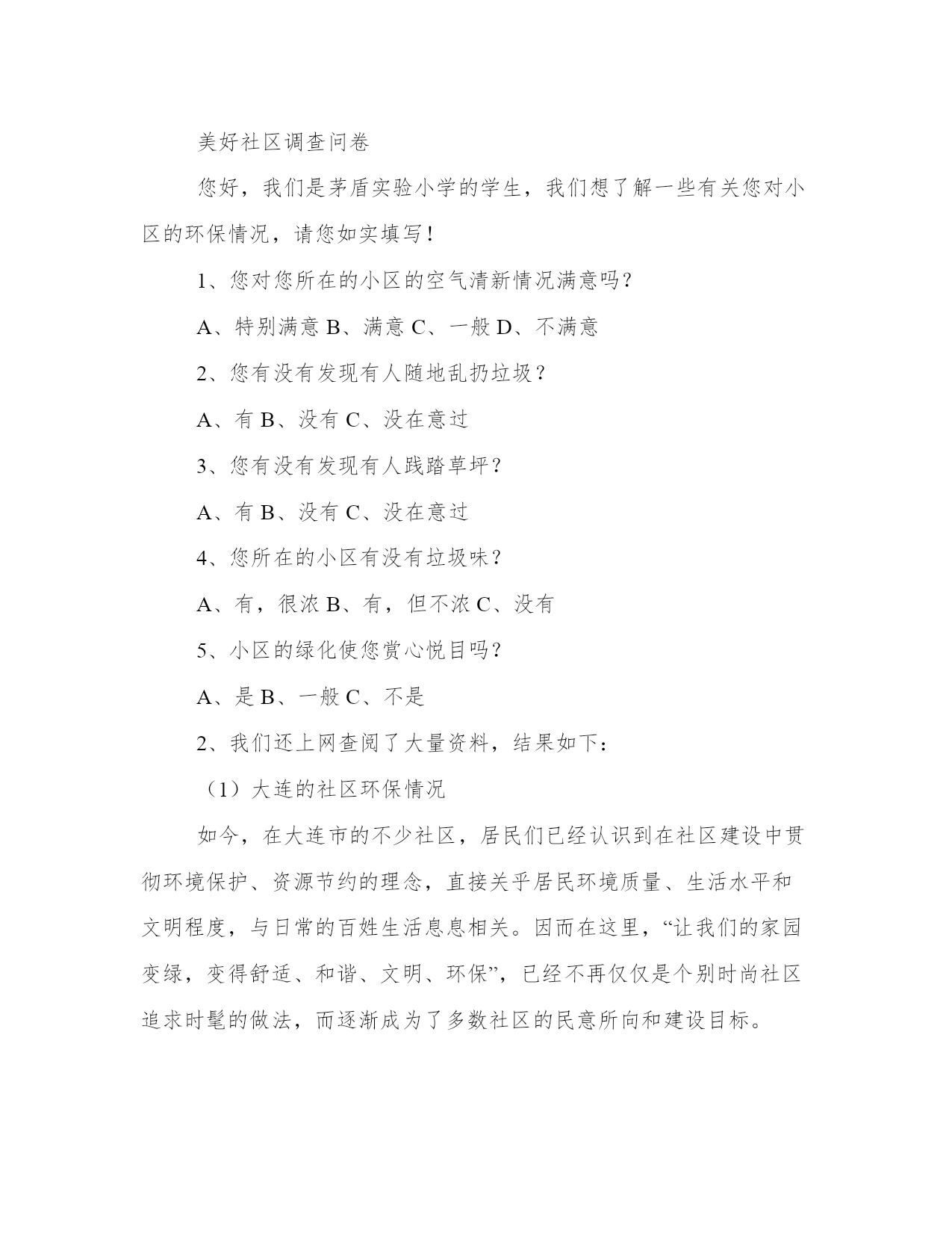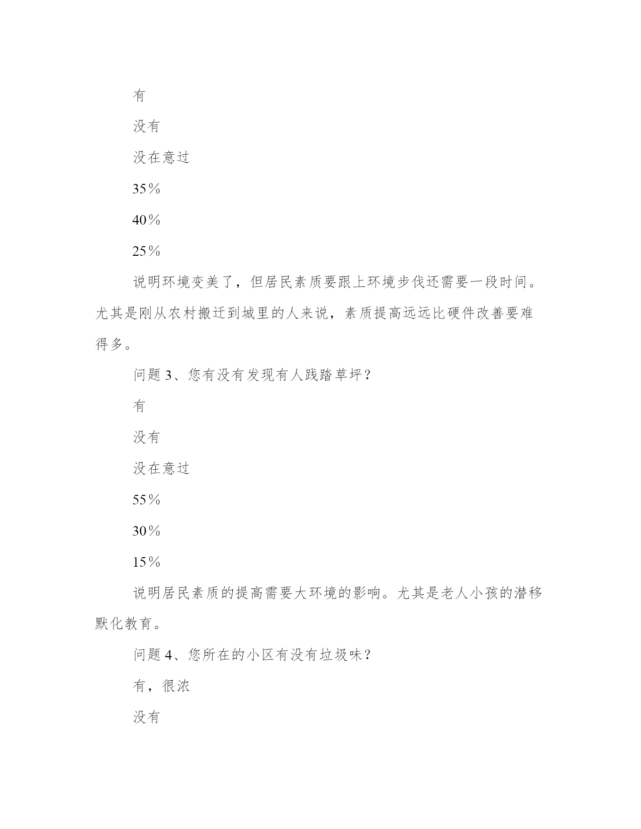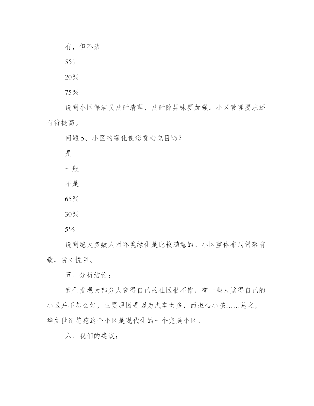 小区环保的调查报告二、课题的提出:1、随着人们生活水平的提高,入住小区的居民越来越多。小区的配套设施也越来越完善。小区生活环境受到人们的普遍关注;2、环保问题与人们的健康息息相关,在人们普遍追求生活质量的今天,已越来越受到人们的重视;3、综合课上,老师介绍了桐乡小区的发展情况,并对带领我们走进了小区,进行实地调查。使我们对小区环保问题产生了浓厚的兴趣。三、小组成员与分工:组长:吕舒力主要负责:分工及打印问卷。成员:施李佳、黄恺瑜主要负责:发问卷及查资料。成员:周伊蕾、沈凯杰主要负责:调查采访、分发问卷。成员:李瑶主要负责:资料整理与打印。课题指导老师:杨建伟四、分析过程:(一)调查:1、在老师的带领下,我们一起到华立世纪花苑实地参观,我们参观后向居民分发调查问卷。问卷如下:美好社区调查问卷您好,我们是茅盾实验小学的学生,我们想了解一些有关您对小区的环保情况,请您如实填写!1、您对您所在的小区的空气清新情况满意吗?A、特别满意B、满意C、一般D、不满意2、您有没有发现有人随地乱扔垃圾?A、有B、没有C、没在意过3、您有没有发现有人践踏草坪?A、有B、没有C、没在意过4、您所在的小区有没有垃圾味?A、有,很浓B、有,但不浓C、没有5、小区的绿化使您赏心悦目吗?A、是B、一般C、不是2、我们还上网查阅了大量资料,结果如下:(1)大连的社区环保情况如今,在大连市的不少社区,居民们已经认识到在社区建设中贯彻环境保护、资源节约的理念,直接关乎居民环境质量、生活水平和文明程度,与日常的百姓生活息息相关。因而在这里,“让我们的家园变绿,变得舒适、和谐、文明、环保”,已经不再仅仅是个别时尚社区追求时髦的做法,而逐渐成为了多数社区的民意所向和建设目标。创建绿色社区,硬件先行。特别是一些新建成的社区,率先引进ISO9001、ISO14001国际管理模式,建立科学、规范、完整的社区质量管理体系和环境管理体系,形成智能型管理机制,把环保理念贯穿于社区建设、管理的全过程。从小区规划、建筑设计时就考虑与环境协调,在建造中使用环保建筑材料;再到垃圾分类、节水、节能、自然降水的储存和利用,以及小区噪声控制等都尽其所能地体现了环保特点。如青云林海、星海人家等社区引入环境管理体系,使社区环境因素的识别进一步细化,并形成长效的环境管理机制,随时查找家庭、社区和社区外的环境问题,并依据环境保护的法律法规,制定出居民环保公约,规范居民的行为,完善规范的绿色社区档案,使各项环保措施的落实有了可靠的保障,成为大连市有名的人与环境和谐的生态社区。同时,社区的管理者和居民也认识到,把可持续的理念、文化根植于社区,并能很好地传承,是构建和谐绿色社区的根本所在。为此,大连市委宣传部、市人大环资城建委、市民政局、市文化局、市环境保护局、市环保志愿者协会联合发起了“五个一”环境文化进社区活动。20多个管理规范、环境和群众基础好的社区,把“五个一”引入了社区:即在社区设置一块环保专栏或橱窗,向居民宣传环保知识;组织居民开展一次垃圾分类回收、植树护绿、节能节水等环保公益活动;组织一台以环保内容为主的文化娱乐晚会;搞一次保护环境、减少污染为主题的摄影、绘画、书法展;请环保志愿者或社区工作人员为居民讲一次环保知识课。地区环保局还向社区居民发放了上万本的市民环保手册,指导居民的衣、食、住、行。“五个一”活动的开展,使居民更加亲密地接触环境文化。如泉水友好园的居民,创作出环保法绘画摄影作品,周日向社区居民展出;老社区林茂盛社区的退休老人发挥余热,自编自演环保快板、相声、小品等节目,向社区居民宣传节水、节电、环境保护等,现在自觉护绿、一水多用、监督污染已经成为社区居民的共同习惯;有的社区,还在休息日开展了“旧物交换”和“旧物捐困”活动,让废旧物品再次发挥作用。“绿色”文明开始在一个又一个的社区蔓延。为了深入了解社情民意,听取进言献策,解决实际问题,大连市环保局西岗分局设立了“便民服务流动站”,轮流进入辖区7个街道的社区,现场听取群众声音,为业主提供政策咨询服务,解决社区环境难题。“便民服务流动站”对新、改、扩建设项目现场申报、勘验;对已核准项目的有关批示文件上门送达;对群众反映的环境信访案件现场接待、现场监察处理;对严重扰民的项目依法取缔。同时宣传有关环保法律法规和行政许可规定,让群众懂法知法,使群众运用法律的武器来维护自己的环境权益并监督政府的行政行为。为了减少社区经营户污染扰民,环保工作人员还把致辖区经营业户的一封公开信送到了每一个业户手中,提醒并告知业户,做好自检工作,对容易产生噪声、废气等环境污染的设备和治理设施进行检查维修,对不当的管理方式加以整改。让可能发生污染扰民的隐患消灭在萌芽当中图片,如下:给人的视觉效果是