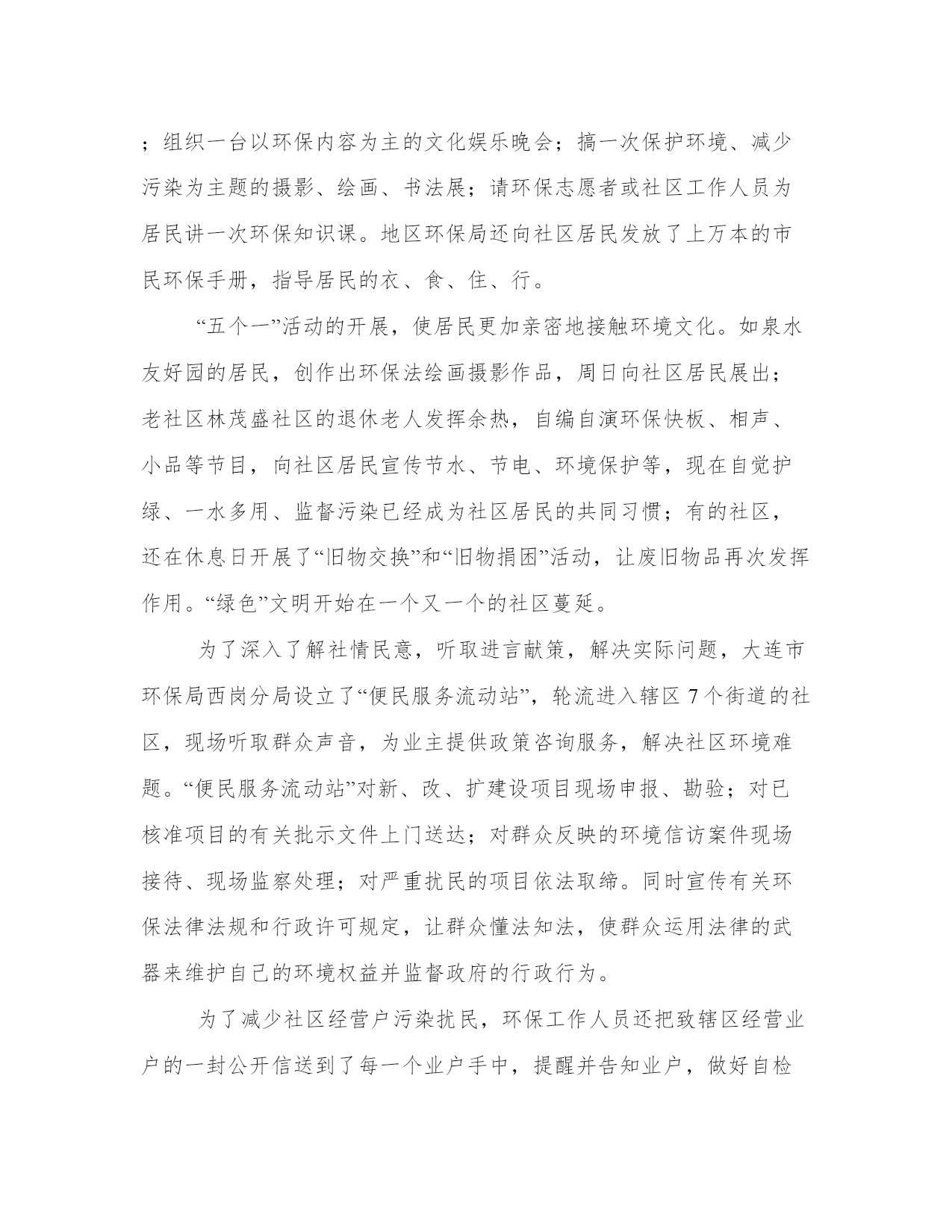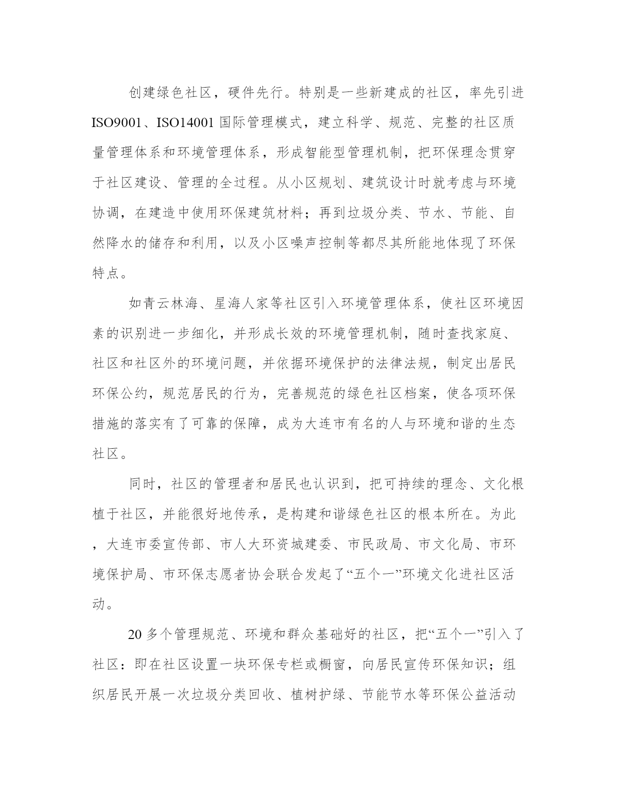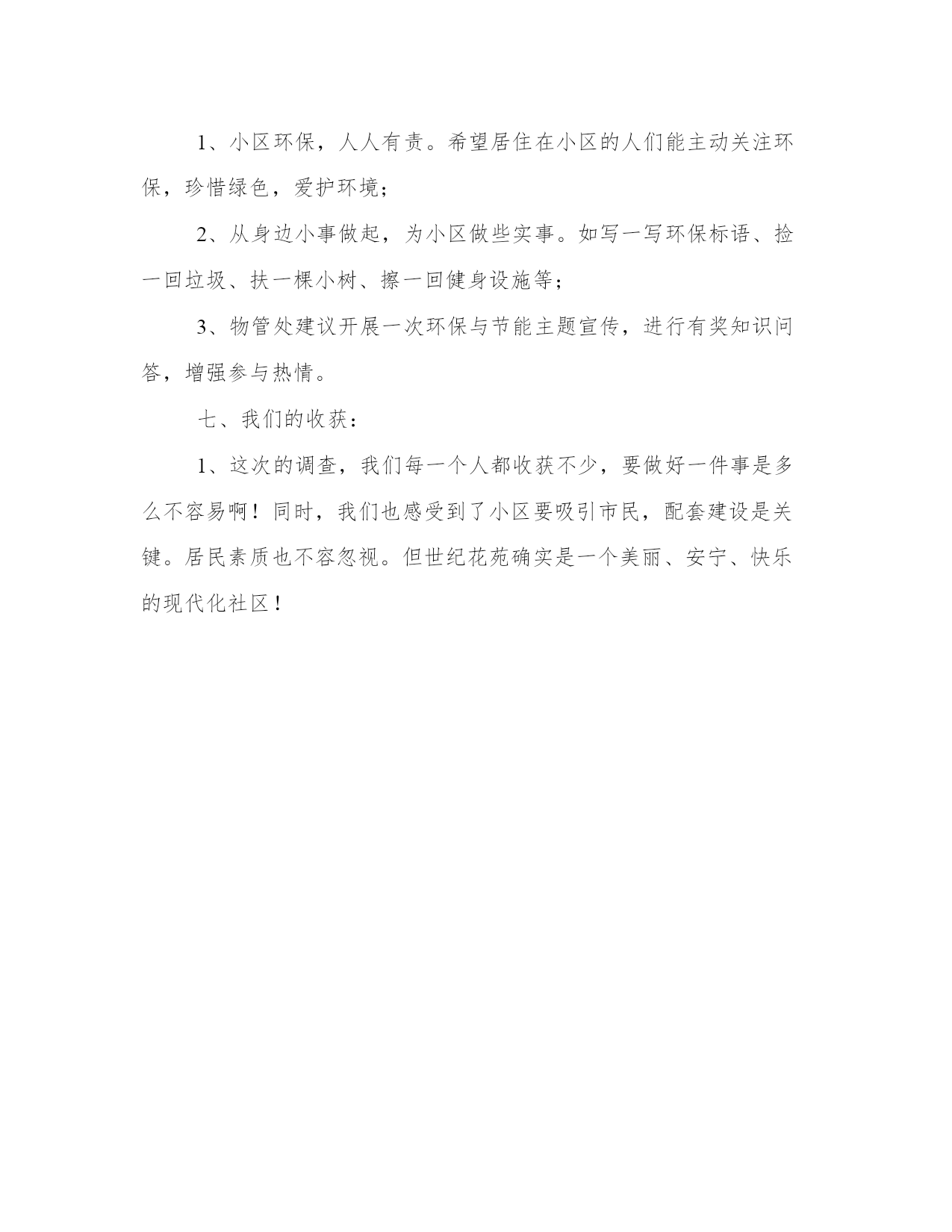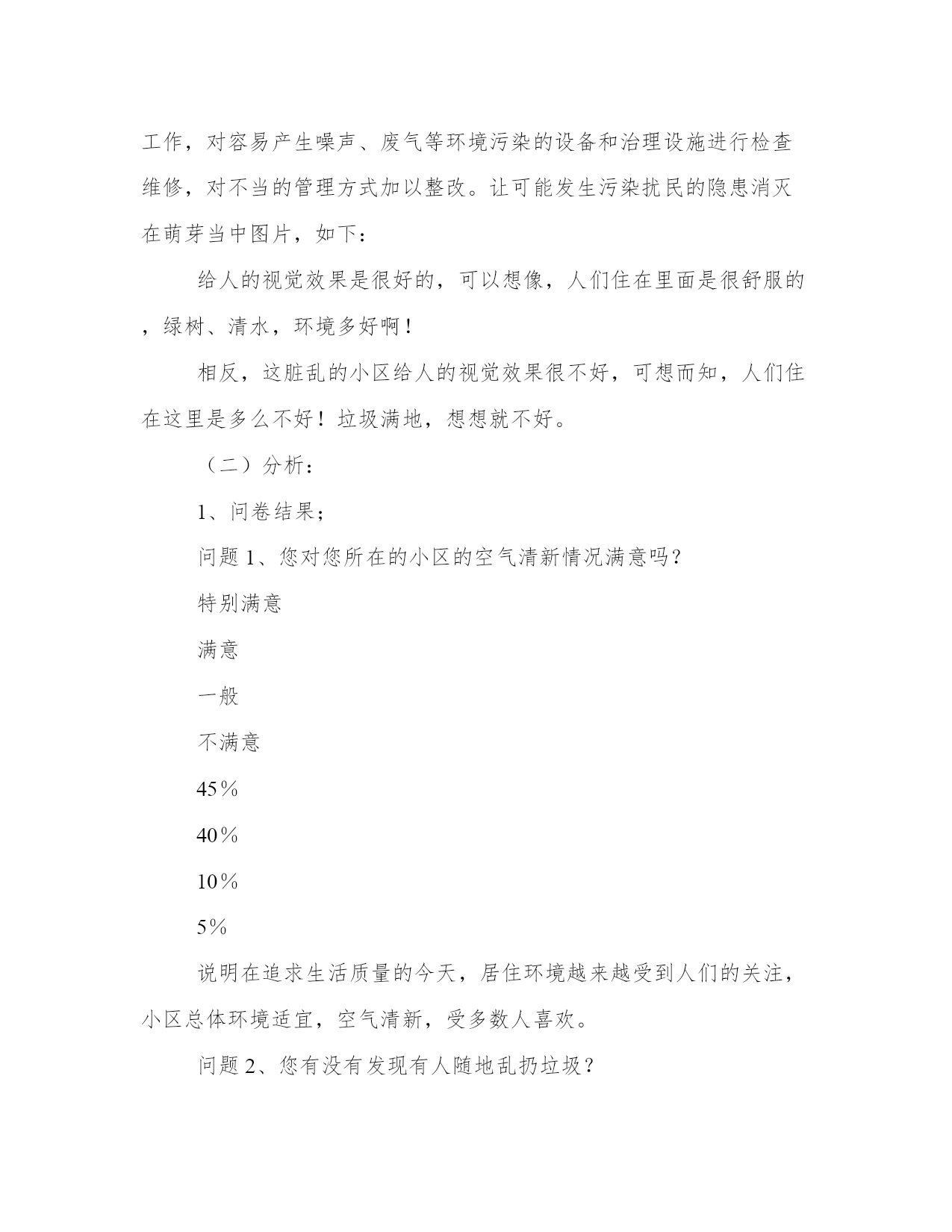 小区环保的调查报告二、课题的提出:1、随着人们生活水平的提高,入住小区的居民越来越多。小区的配套设施也越来越完善。小区生活环境受到人们的普遍关注;2、环保问题与人们的健康息息相关,在人们普遍追求生活质量的今天,已越来越受到人们的重视;3、综合课上,老师介绍了桐乡小区的发展情况,并对带领我们走进了小区,进行实地调查。使我们对小区环保问题产生了浓厚的兴趣。三、小组成员与分工:组长:吕舒力主要负责:分工及打印问卷。成员:施李佳、黄恺瑜主要负责:发问卷及查资料。成员:周伊蕾、沈凯杰主要负责:调查采访、分发问卷。成员:李瑶主要负责:资料整理与打印。课题指导老师:杨建伟四、分析过程:(一)调查:1、在老师的带领下,我们一起到华立世纪花苑实地参观,我们参观后向居民分发调查问卷。问卷如下:美好社区调查问卷您好,我们是茅盾实验小学的学生,我们想了解一些有关您对小区的环保情况,请您如实填写!1、您对您所在的小区的空气清新情况满意吗?A、特别满意B、满意C、一般D、不满意2、您有没有发现有人随地乱扔垃圾?A、有B、没有C、没在意过3、您有没有发现有人践踏草坪?A、有B、没有C、没在意过4、您所在的小区有没有垃圾味?A、有,很浓B、有,但不浓C、没有5、小区的绿化使您赏心悦目吗?A、是B、一般C、不是2、我们还上网查阅了大量资料,结果如下:(1)大连的社区环保情况如今,在大连市的不少社区,居民们已经认识到在社区建设中贯彻环境保护、资源节约的理念,直接关乎居民环境质量、生活水平和文明程度,与日常的百姓生活息息相关。因而在这里,“让我们的家园变绿,变得舒适、和谐、文明、环保”,已经不再仅仅是个别时尚社区追求时髦的做法,而逐渐成为了多数社区的民意所向和建设目标。创建绿色社区,硬件先行。特别是一些新建成的社区,率先引进ISO9001、ISO14001国际管理模式,建立科学、规范、完整的社区质量管理体系和环境管理体系,形成智能型管理机制,把环保理念贯穿于社区建设、管理的全过程。从小区规划、建筑设计时就考虑与环境协调,在建造中使用环保建筑材料;再到垃圾分类、节水、节能、自然降水的储存和利用,以及小区噪声控制等都尽其所能地体现了环保特点。如青云林海、星海人家等社区引入环境管理体系,使社区环境因素的识别进一步细化,并形成长效的环境管理机制,随时查找家庭、社区和社区外的环境问题,并依据环境保护的法律法规,制定出居民环保公约,规范居民的行为,完善规范的绿色社区档案,使各项环保措施的落实有了可靠的保障,成为大连市有名的人与环境和谐的生态社区。同时,社区的管理者和居民也认识到,把可持续的理念、文化根植于社区,并能很好地传承,是构建和谐绿色社区的根本所在。为此,大连市委宣传部、市人大环资城建委、市民政局、市文化局、市环境保护局、市环保志愿者协会联合发起了“五个一”环境文化进社区活动。20多个管理规范、环境和群众基础好的社区,把“五个一”引入了社区:即在社区设置一块环保专栏或橱窗,向居民宣传环保知识;组织居民开展一次垃圾分类回收、植树护绿、节能节水等环保公益活动;组织一台以环保内容为主的文化娱乐晚会;搞一次保护环境、减少污染为主题的摄影、绘画、书法展;请环保志愿者或社区工作人员为居民讲一次环保知识课。地区环保局还向社区居民发放了上万本的市民环保手册,指导居民的衣、食、住、行。“五个一”活动的开展,使居民更加亲密地接触环境文化。如泉水友好园的居民,创作出环保法绘画摄影作品,周日向社区居民展出;老社区林茂盛社区的退休老人发挥余热,自编自演环保快板、相声、小品等节目,向社区居民宣传节水、节电、环境保护等,现在自觉护绿、一水多用、监督污染已经成为社区居民的共同习惯;有的社区,还在休息日开展了“旧物交换”和“旧物捐困”活动,让废旧物品再次发挥作用。“绿色”文明开始在一个又一个的社区蔓延。为了深入了解社情民意,听取进言献策,解决实际问题,大连市环保局西岗分局设立了“便民服务流动站”,轮流进入辖区7个街道的社区,现场听取群众声音,为业主提供政策咨询服务,解决社区环境难题。“便民服务流动站”对新、改、扩建设项目现场申报、勘验;对已核准项目的有关批示文件上门送达;对群众反映的环境信访案件现场接待、现场监察处理;对严重扰民的项目依法取缔。同时宣传有关环保法律法规和行政许可规定,让群众懂法知法,使群众运用法律的武器来维护自己的环境权益并监督政府的行政行为。为了减少社区经营户污染扰民,环保工作人员还把致辖区经营业户的一封公开信送到了每一个业户手中,提醒并告知业户,做好自检工作,对容易产生噪声、废气等环境污染的设备和治理设施进行检查维修,对不当的管理方式加以整改。让可能发生污染扰民的隐患消灭在萌芽当中图片,如下:给人的视觉效果是