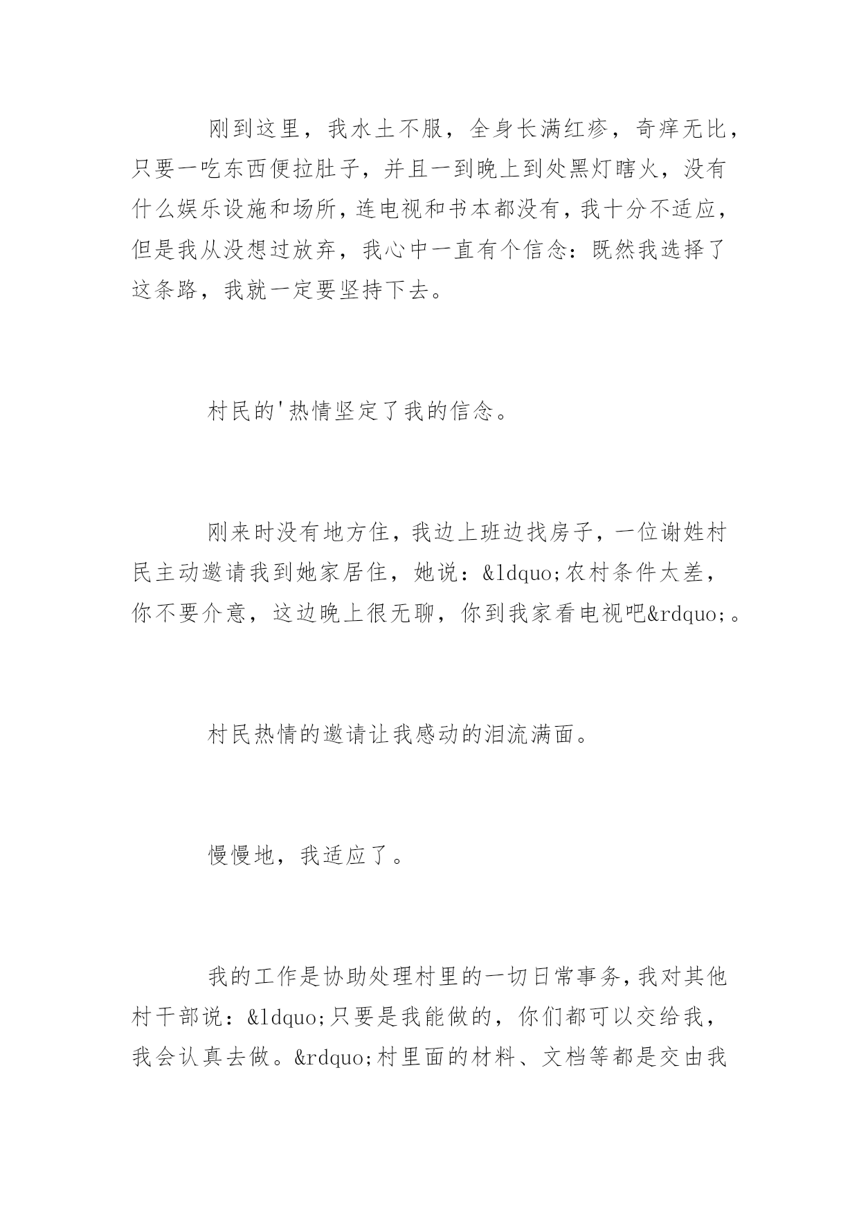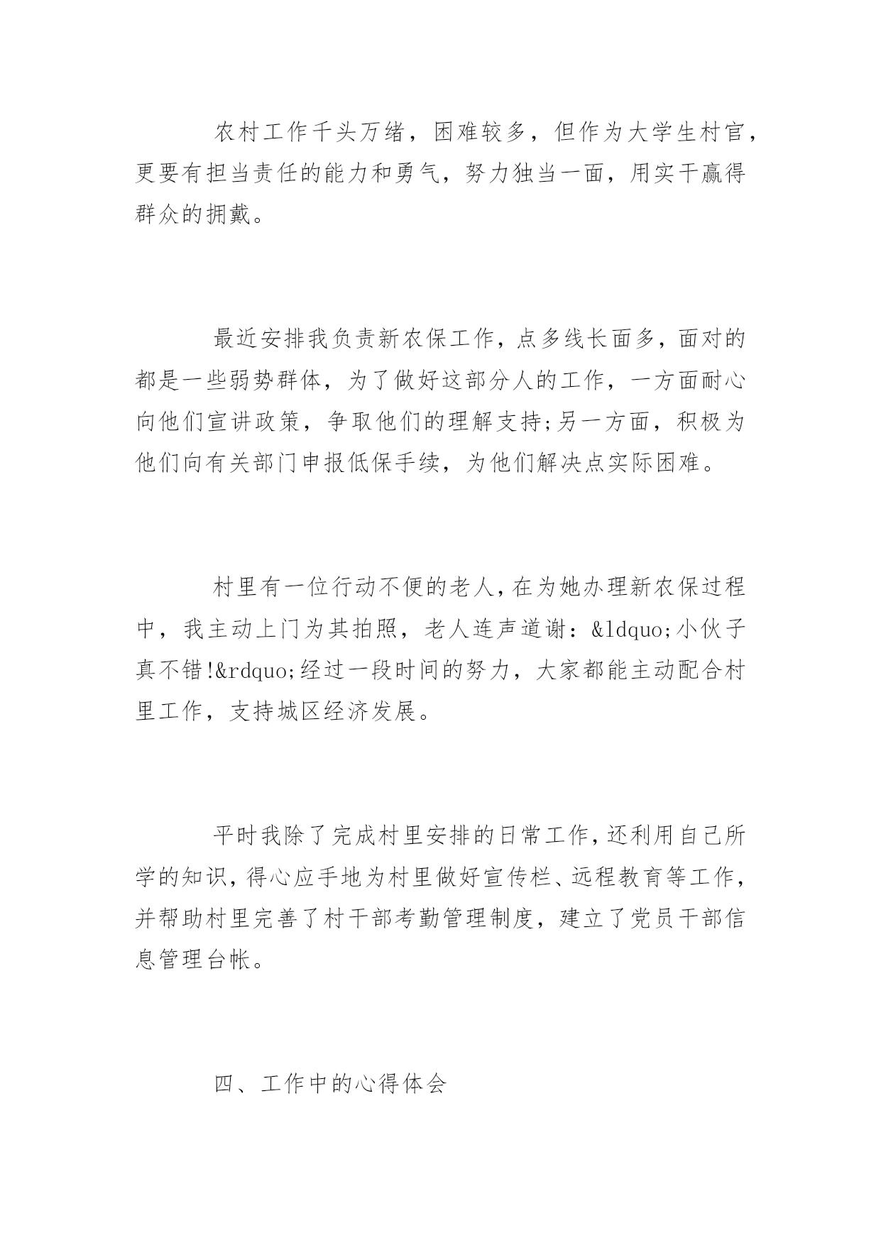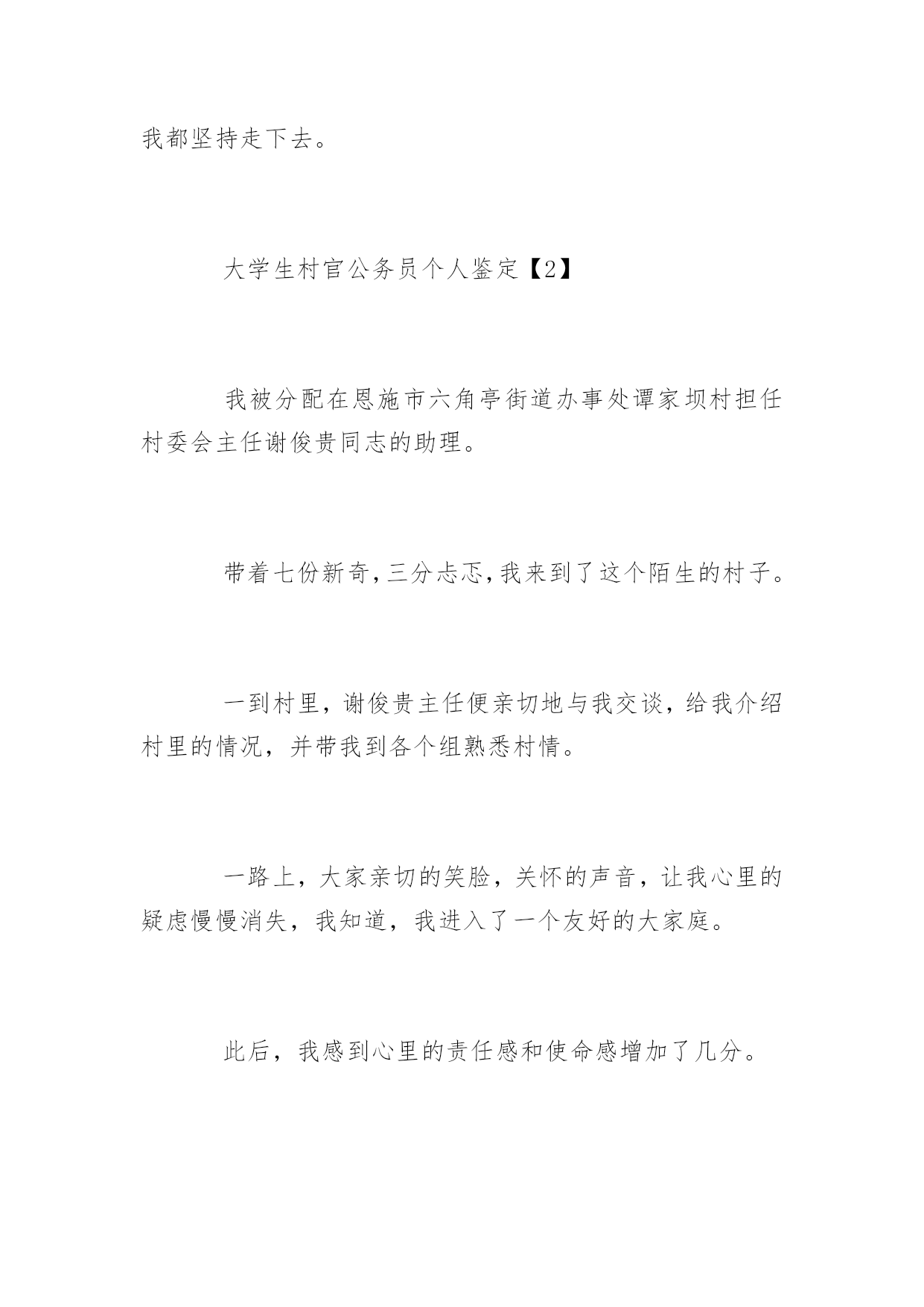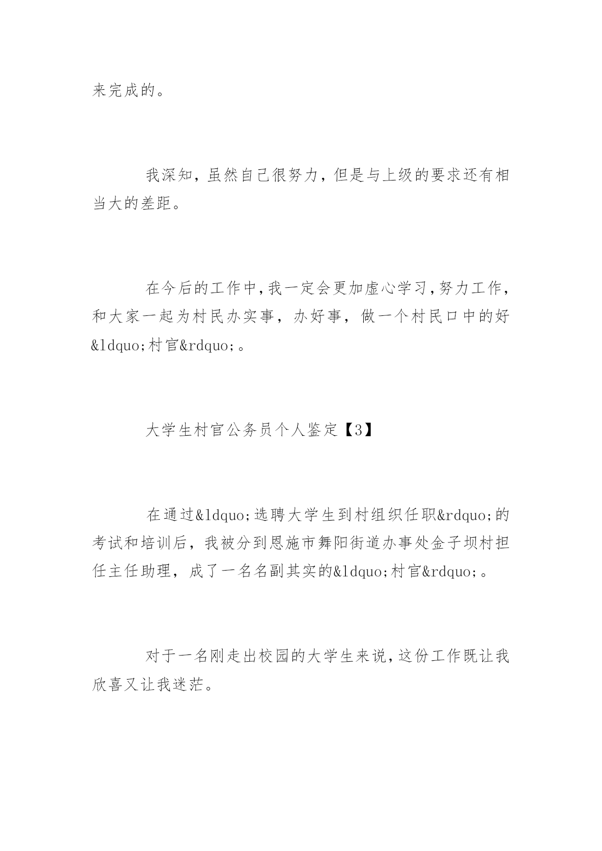 大学生村官公务员个人鉴定大学生村官公务员个人鉴定大学生村官公务员个人鉴定怎么写?下面是小编整理的关于大学生村官公务员个人鉴定范文,欢迎阅读。大学生村官公务员个人鉴定【1】今年5月份,我作为到农村任职大学生中的一员,怀揣着激情与梦想,来到了四棵树村,担任村主任助理。回想起这段时间,自己经历的憧憬与迷茫,并最终找到了前进的方向,感慨颇多。一、理想与现实带来的思考经常有人问我这样一个问题,为什么选择在村上工作?我毫不犹豫地告诉他,这缘自我对农村那份情有独钟的热爱!从小在农村长大的我对于农村更有感情,更能体会到农民生活的艰辛。客观地讲,这种感受曾有过梦想与现实的困惑、交锋。像很多大学生一样,当初我也是带着美好愿望和满腔热血到农村轰轰烈烈干一番事业的,可却发现对农村的梦想与现状有较大差距,日复一日平凡琐碎的工作内容,偏僻简陋的工作环境,再加上一些同学在大城市享受优越工作环境和经济待遇的刺激,我的自信心受到前所未有的强烈打击,不知不觉中产生了心理落差。”一次有位村民请我帮忙解决一件事情,将此事转告给村主任之后,村主任问起该村民的姓名,我发现自己居然忘了问。而且诸如“当村官没什么前途,以后也不一定能转成公务员”、“一个大学生怎么天天做些端茶送水的小事,太浪费了,干什么不好非干这个?”等负面言论也接踵而至,更让我感到了迷茫和困惑,于是我开始思考来这里的真正目的。二、积极端正态度“首先端正态度,我是来干事创业的,而不是单纯为了就业”,想干出样子就要勤于学习,努力当好“小学生”,尽快实现学生到村官、学校到农村、以学习理论为主到以实践为主的三个大转变。很快,我坚定了自己最初的信念。扎根基层,创业农村,服务群众,如果说不艰苦,那是言不由衷的话。刚到村里的第一个晚上我彻底失眠了,那段时间我依然把自己放在父母的骄子,学校优等生的角色上面,面对什么都需要靠双手打拼,一切重新开始,感觉很无助,只是被动的看待所处环境。在认清问题症结所在后,我便主动利用空闲时间,大量学习经济、科技、管理、法律等方面的知识,走出去向镇村干部、老党员和群众学习社会知识、人际关系、处事方法,坚持以村干部的标准来设计自己、要求自己、锤炼自己,力争在最短时间内、最大程度地融入到实际工作中去。现在回想起来,觉得这个转变角色的过程实际上就是不断学习,不断适应农村环境,不断提升工作能力的过程。通过自身努力,我的潜力和能力得到挖掘和提升,村干部和群众都对我开始刮目相看。半年后,村里让我负责全村低保申办、企业安全监管及远程教育等工作,虽然事情比较杂,既要面对个体,又要面对群体,还有充满时代气息的远程教育工作,但我基本上能做到合理安排,统筹兼顾,不再是以前那个不知所措的毛头小伙子了。三、提高自身工作能力农村工作千头万绪,困难较多,但作为大学生村官,更要有担当责任的能力和勇气,努力独当一面,用实干赢得群众的拥戴。最近安排我负责新农保工作,点多线长面多,面对的都是一些弱势群体,为了做好这部分人的工作,一方面耐心向他们宣讲政策,争取他们的理解支持;另一方面,积极为他们向有关部门申报低保手续,为他们解决点实际困难。村里有一位行动不便的老人,在为她办理新农保过程中,我主动上门为其拍照,老人连声道谢:“小伙子真不错!”经过一段时间的努力,大家都能主动配合村里工作,支持城区经济发展。平时我除了完成村里安排的日常工作,还利用自己所学的知识,得心应手地为村里做好宣传栏、远程教育等工作,并帮助村里完善了村干部考勤管理制度,建立了党员干部信息管理台帐。四、工作中的心得体会有人认为大学生村官并不能为农村作出多大的改变,甚至有媒体也认为“村官无职无权很难发挥什么作用。赋予他们的这个身份很虚,没有话语权,很多建议都不能提出来。”其实,我认为作为一个刚走出校门不久的大学生,当村官是带着一份青涩来学习和积累经验、怀着一份激情来践行理想的,有没有话语权并非关键。农村太渴望人才,太需要大学生了。大学生来到农村,虽然一无经验,二无资金,干的事也很简单平凡,但决非一无是处。相对而言,我们不仅有知识和技术优势,能够利用所学知识为村里的工作提供具有可行性的建议,努力改善群众生产生活,还具有一种昂然的开拓精神和为群众增收致富而披荆斩棘的信心,这些却正是农村所稀缺的。只要舍得付出、愿意吃苦、守住寂寞,用积极的态度、满腔的热情融入到老百姓中去,和他们交朋友,用真心去对待农民,为农民办事,他们就会主动接纳和信服我们,而我们在艰苦环境中脚踏实地磨练自己,在零距离倾听民意、直面民生中增长才干,在与人民群众的血肉联系中干事创业,也必然能够
