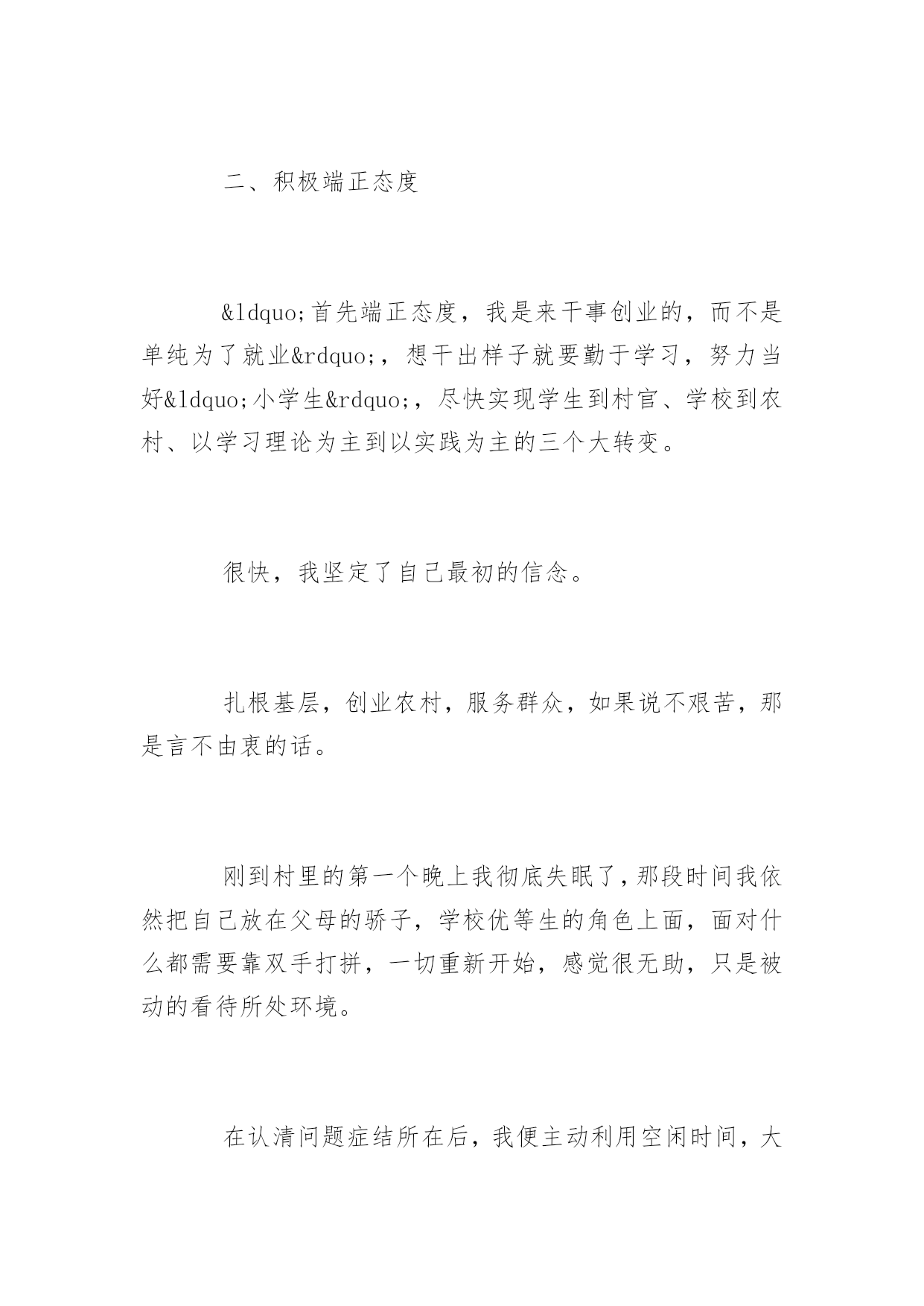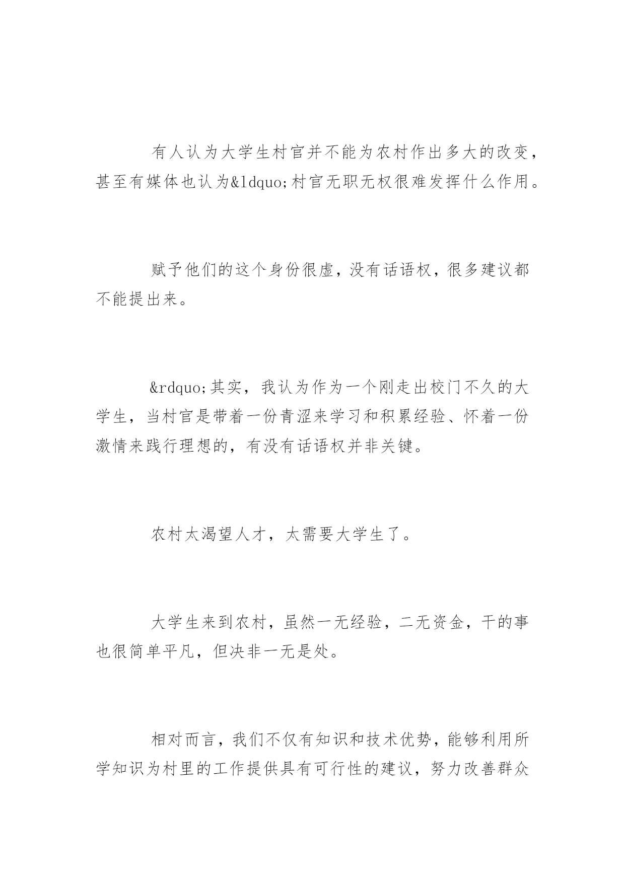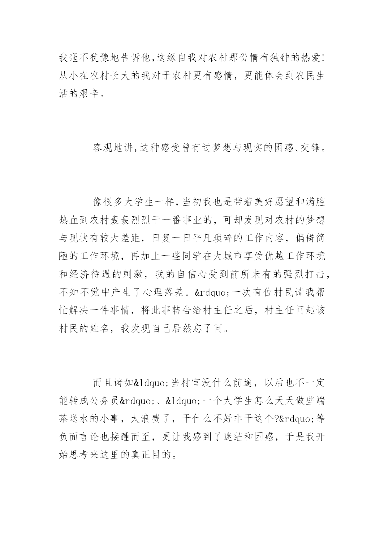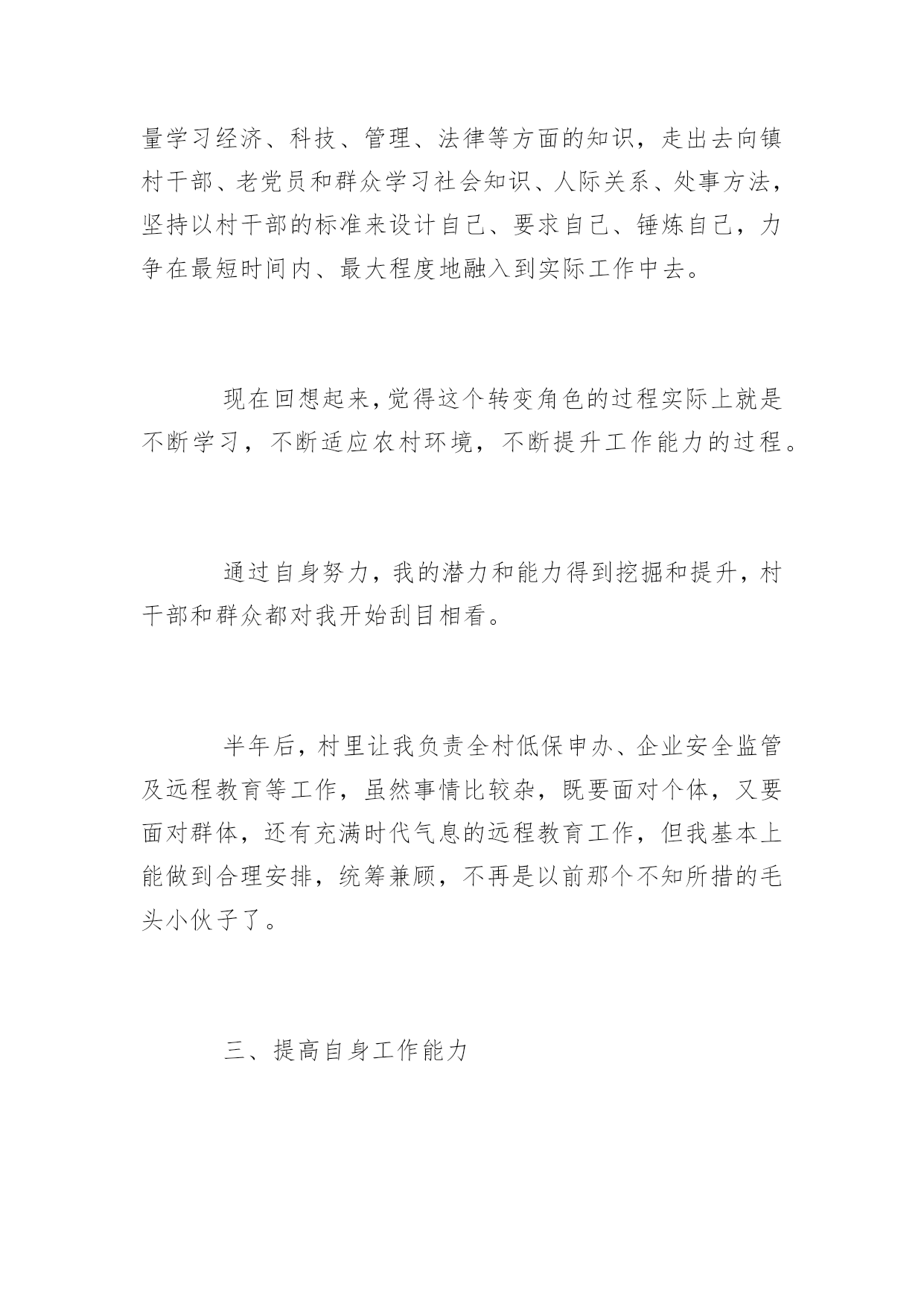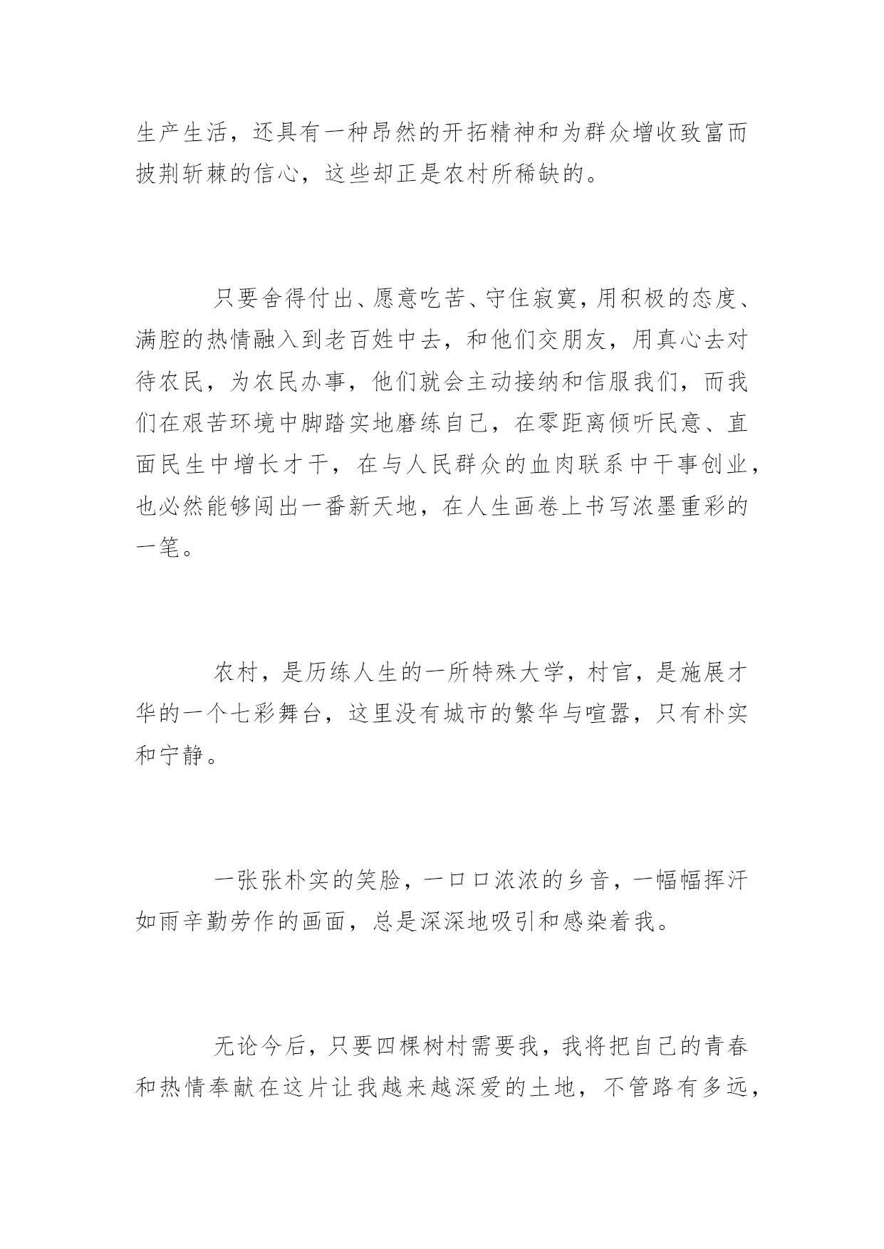 大学生村官公务员个人鉴定大学生村官公务员个人鉴定大学生村官公务员个人鉴定怎么写?下面是小编整理的关于大学生村官公务员个人鉴定范文,欢迎阅读。大学生村官公务员个人鉴定【1】今年5月份,我作为到农村任职大学生中的一员,怀揣着激情与梦想,来到了四棵树村,担任村主任助理。回想起这段时间,自己经历的憧憬与迷茫,并最终找到了前进的方向,感慨颇多。一、理想与现实带来的思考经常有人问我这样一个问题,为什么选择在村上工作?我毫不犹豫地告诉他,这缘自我对农村那份情有独钟的热爱!从小在农村长大的我对于农村更有感情,更能体会到农民生活的艰辛。客观地讲,这种感受曾有过梦想与现实的困惑、交锋。像很多大学生一样,当初我也是带着美好愿望和满腔热血到农村轰轰烈烈干一番事业的,可却发现对农村的梦想与现状有较大差距,日复一日平凡琐碎的工作内容,偏僻简陋的工作环境,再加上一些同学在大城市享受优越工作环境和经济待遇的刺激,我的自信心受到前所未有的强烈打击,不知不觉中产生了心理落差。”一次有位村民请我帮忙解决一件事情,将此事转告给村主任之后,村主任问起该村民的姓名,我发现自己居然忘了问。而且诸如“当村官没什么前途,以后也不一定能转成公务员”、“一个大学生怎么天天做些端茶送水的小事,太浪费了,干什么不好非干这个?”等负面言论也接踵而至,更让我感到了迷茫和困惑,于是我开始思考来这里的真正目的。二、积极端正态度“首先端正态度,我是来干事创业的,而不是单纯为了就业”,想干出样子就要勤于学习,努力当好“小学生”,尽快实现学生到村官、学校到农村、以学习理论为主到以实践为主的三个大转变。很快,我坚定了自己最初的信念。扎根基层,创业农村,服务群众,如果说不艰苦,那是言不由衷的话。刚到村里的第一个晚上我彻底失眠了,那段时间我依然把自己放在父母的骄子,学校优等生的角色上面,面对什么都需要靠双手打拼,一切重新开始,感觉很无助,只是被动的看待所处环境。在认清问题症结所在后,我便主动利用空闲时间,大量学习经济、科技、管理、法律等方面的知识,走出去向镇村干部、老党员和群众学习社会知识、人际关系、处事方法,坚持以村干部的标准来设计自己、要求自己、锤炼自己,力争在最短时间内、最大程度地融入到实际工作中去。现在回想起来,觉得这个转变角色的过程实际上就是不断学习,不断适应农村环境,不断提升工作能力的过程。通过自身努力,我的潜力和能力得到挖掘和提升,村干部和群众都对我开始刮目相看。半年后,村里让我负责全村低保申办、企业安全监管及远程教育等工作,虽然事情比较杂,既要面对个体,又要面对群体,还有充满时代气息的远程教育工作,但我基本上能做到合理安排,统筹兼顾,不再是以前那个不知所措的毛头小伙子了。三、提高自身工作能力农村工作千头万绪,困难较多,但作为大学生村官,更要有担当责任的能力和勇气,努力独当一面,用实干赢得群众的拥戴。最近安排我负责新农保工作,点多线长面多,面对的都是一些弱势群体,为了做好这部分人的工作,一方面耐心向他们宣讲政策,争取他们的理解支持;另一方面,积极为他们向有关部门申报低保手续,为他们解决点实际困难。村里有一位行动不便的老人,在为她办理新农保过程中,我主动上门为其拍照,老人连声道谢:“小伙子真不错!”经过一段时间的努力,大家都能主动配合村里工作,支持城区经济发展。平时我除了完成村里安排的日常工作,还利用自己所学的知识,得心应手地为村里做好宣传栏、远程教育等工作,并帮助村里完善了村干部考勤管理制度,建立了党员干部信息管理台帐。四、工作中的心得体会有人认为大学生村官并不能为农村作出多大的改变,甚至有媒体也认为“村官无职无权很难发挥什么作用。赋予他们的这个身份很虚,没有话语权,很多建议都不能提出来。”其实,我认为作为一个刚走出校门不久的大学生,当村官是带着一份青涩来学习和积累经验、怀着一份激情来践行理想的,有没有话语权并非关键。农村太渴望人才,太需要大学生了。大学生来到农村,虽然一无经验,二无资金,干的事也很简单平凡,但决非一无是处。相对而言,我们不仅有知识和技术优势,能够利用所学知识为村里的工作提供具有可行性的建议,努力改善群众生产生活,还具有一种昂然的开拓精神和为群众增收致富而披荆斩棘的信心,这些却正是农村所稀缺的。只要舍得付出、愿意吃苦、守住寂寞,用积极的态度、满腔的热情融入到老百姓中去,和他们交朋友,用真心去对待农民,为农民办事,他们就会主动接纳和信服我们,而我们在艰苦环境中脚踏实地磨练自己,在零距离倾听民意、直面民生中增长才干,在与人民群众的血肉联系中干事创业,也必然能够