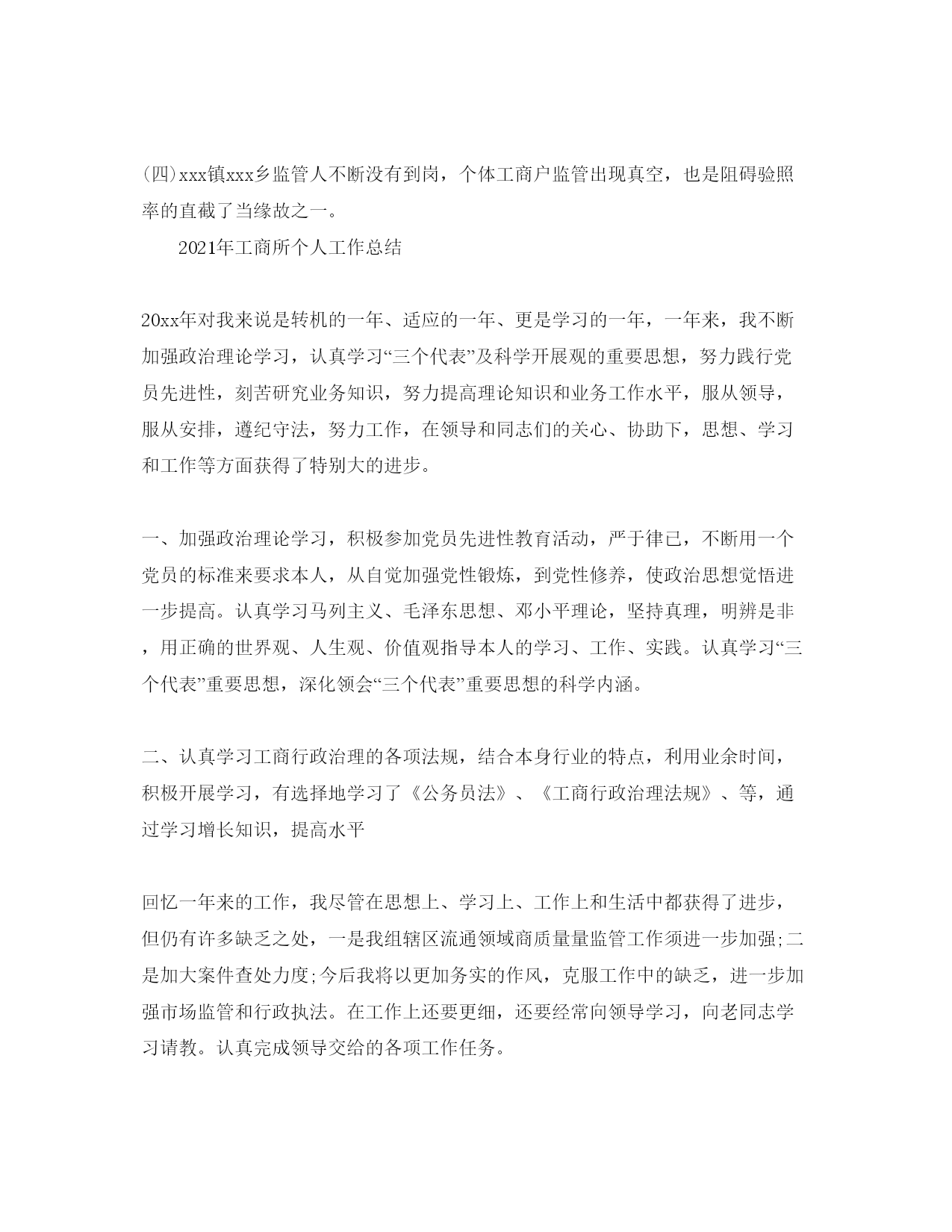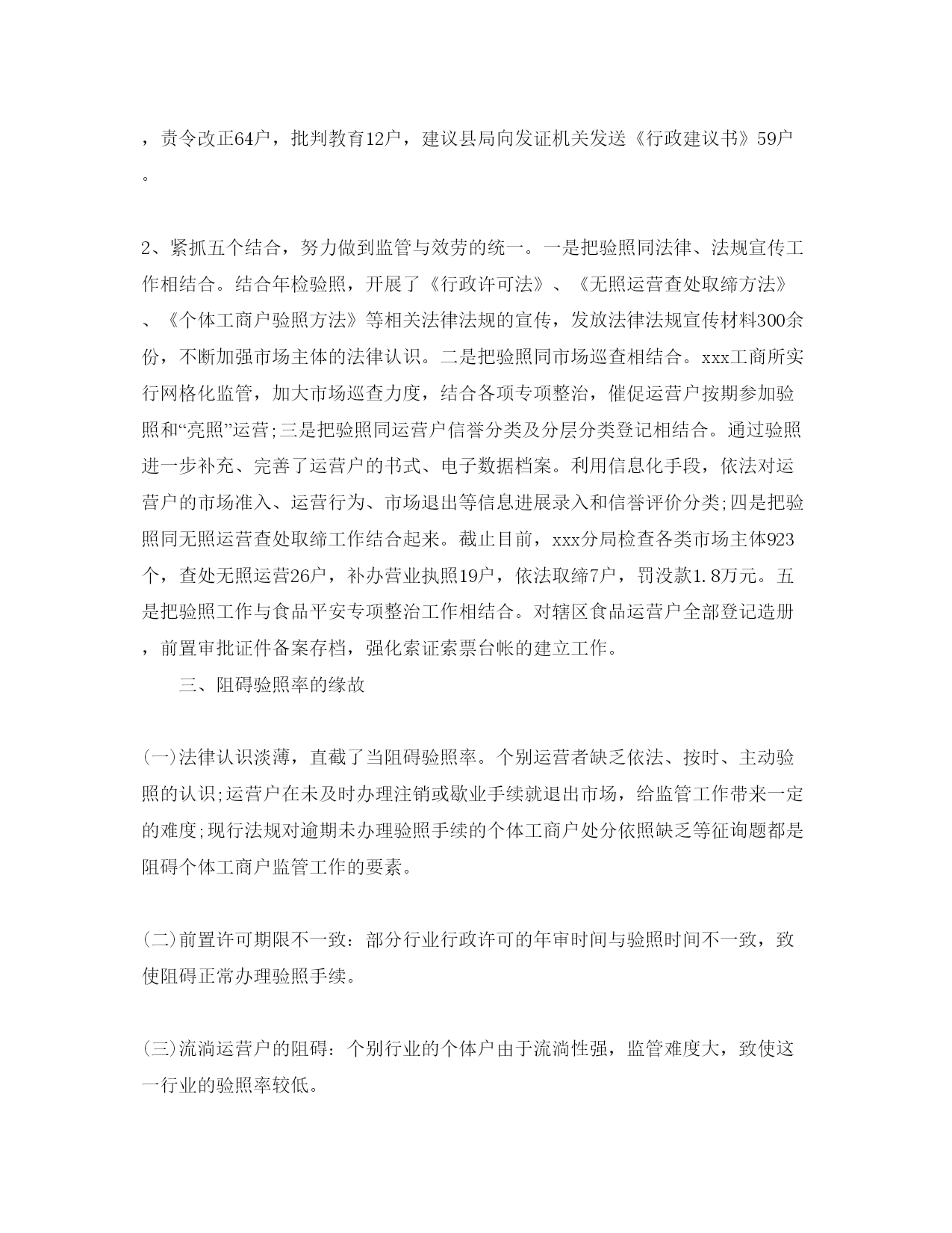 2021年工商所工作参考总结2021年工商所个人工作总结20xx年团风县工商局xxx工商所按照《行政许可法》、《城乡个体工商户治理暂行条例》、《个体工商户验照方法》等法律法规规定和团风县工商局的安排部署,结合xxx实际,突出效劳科学开展主题,坚持“两个第一”、落实“五个更加”,深化施行“市场主体增量”,加快推进传统粗放型治理向现代高效治理型晋级,探究监管效劳新方式,较好地完成了20xx年度个体工商户验照工作。一、20xx年度验照根本情况xxx镇辖区共有个体工商户1202户,(xxx有个体工商户215户)其中查无下落个体工商户283户,办理注销登记87户,应验照832户,已验照607户,验照率73%,比上一年度提高了5.07%.二、主要做法(一)加强组织领导,全面推进验照工作。为做好2021年度个体工商户验照工作,xxx工商所在2021年1月组织全体干部职工学习了《行政许可法》、《城乡个体工商户治理暂行条例》、《个体工商户验照方法》等法律法规,詹应华同志召开专题会议,进一步加强个体工商户验照工作必要性。xxx工商所把个体工商户验照工作作为工商部门为运营户集中提供效劳的过程,作为加强机关效能建立、转变工作作风、改良工作方法、完善效劳环境、提高办事效率的过程,不断提高验照率和亮照率;工商所成立领导小组,由詹应华所长负总责,副所长亲身抓,各组监管人详细抓,注册室抓落实和各组协调配合的工作方式,采取自上而下“逐级治理、分级负责”的原则,稳定有序地开展了个体工商户验照工作(二)创新效劳方式,树立工商部门形象.1、加强宣传方式,为个体工商户验照工作营建良好的言论气氛。团风县工商局xxx工商所向辖区内运营户发出了一封温馨的提示信,告知个体工商户验照工作的时间、需要提交的材料,以及本卷须知,以人性化的治理来促进今年的个体工商户验照工作。在个体工商户验照工作立即完毕时,对没有及时参加验照的运营户,组织力量挨门逐户进展检查催促,查找未按时参加验照的缘故,下发催促验照通知,催促尽快办理验照手续,确保验照工作按期完成。2、转变验照方式,落实工作考核机制。xxx工商所加强工作指导的同时,各监管组采取有力措施提高效率,最大限度的方便运营户验照;结合xxx实际,采取公开验照事项、落实验照工作责任到人,使验照工作实现标准化和标准化,加强对验照工作的催促和监视,保证验照工作顺利开展。3、加强效能建立,提高验照效率。xxx工商所各组在验照工作中强化效劳,严格执行效能建立和党风廉政建立各项制度规定和验照程序规定,遵守国家局六项禁令和省局八项禁令规定,认真执行首征询首办责任制、预定效劳制、上门验照、当场办理等工作制度,坚持落实征询解答“一口清”;对乡下偏远、交通不便和验照有困难的上门效劳;充分发挥“绿色通道”作用,对大学生、回乡创业、下岗职工、退役军人及特困户、残疾人优先受理,通过多层次、多渠道的验照效劳,极大地点便了群众,提高了验照效率。(三)加强监管执法,确保验照质量。1、严格审查,确保验照质量。团风县工商局xxx工商所在验照工作中加大对运营户的审查力度,一是通过验照进展“三看”:看前置许但是否真实有效、看运营者主体是否发生改变、看运营场所是否发生变化;二是对正在处理之中和这次验照中觉察有违法运营行为的个体工商户,暂不通过验照;三是建立违法运营户的档案,实行公开处分。在验照中查处擅自改变登记注册事项的76户,前置许可到期64户,责令改正64户,批判教育12户,建议县局向发证机关发送《行政建议书》59户。2、紧抓五个结合,努力做到监管与效劳的统一。一是把验照同法律、法规宣传工作相结合。结合年检验照,开展了《行政许可法》、《无照运营查处取缔方法》、《个体工商户验照方法》等相关法律法规的宣传,发放法律法规宣传材料300余份,不断加强市场主体的法律认识。二是把验照同市场巡查相结合。xxx工商所实行网格化监管,加大市场巡查力度,结合各项专项整治,催促运营户按期参加验照和“亮照”运营;三是把验照同运营户信誉分类及分层分类登记相结合。通过验照进一步补充、完善了运营户的书式、电子数据档案。利用信息化手段,依法对运营户的市场准入、运营行为、市场退出等信息进展录入和信誉评价分类;四是把验照同无照运营查处取缔工作结合起来。截止目前,xxx分局检查各类市场主体923个,查处无照运营26户,补办营业执照19户,依法取缔7户,罚没款1.8万元。五是把验照工作与食品平安专项整治工作相结合。对辖区食品运营户全部登记造册,前置审批证件备案存档,强化索证索票台帐的建立工作。三、阻碍验照率的缘故(一)法律认识淡薄,直截了当阻碍验照率。个别运营者缺乏依法、按时、主动验照的认识;运营户在未及时办理注销或歇业手续就退出市场,给监管工作带来一定的难度;现行法规对逾期未办理验照手