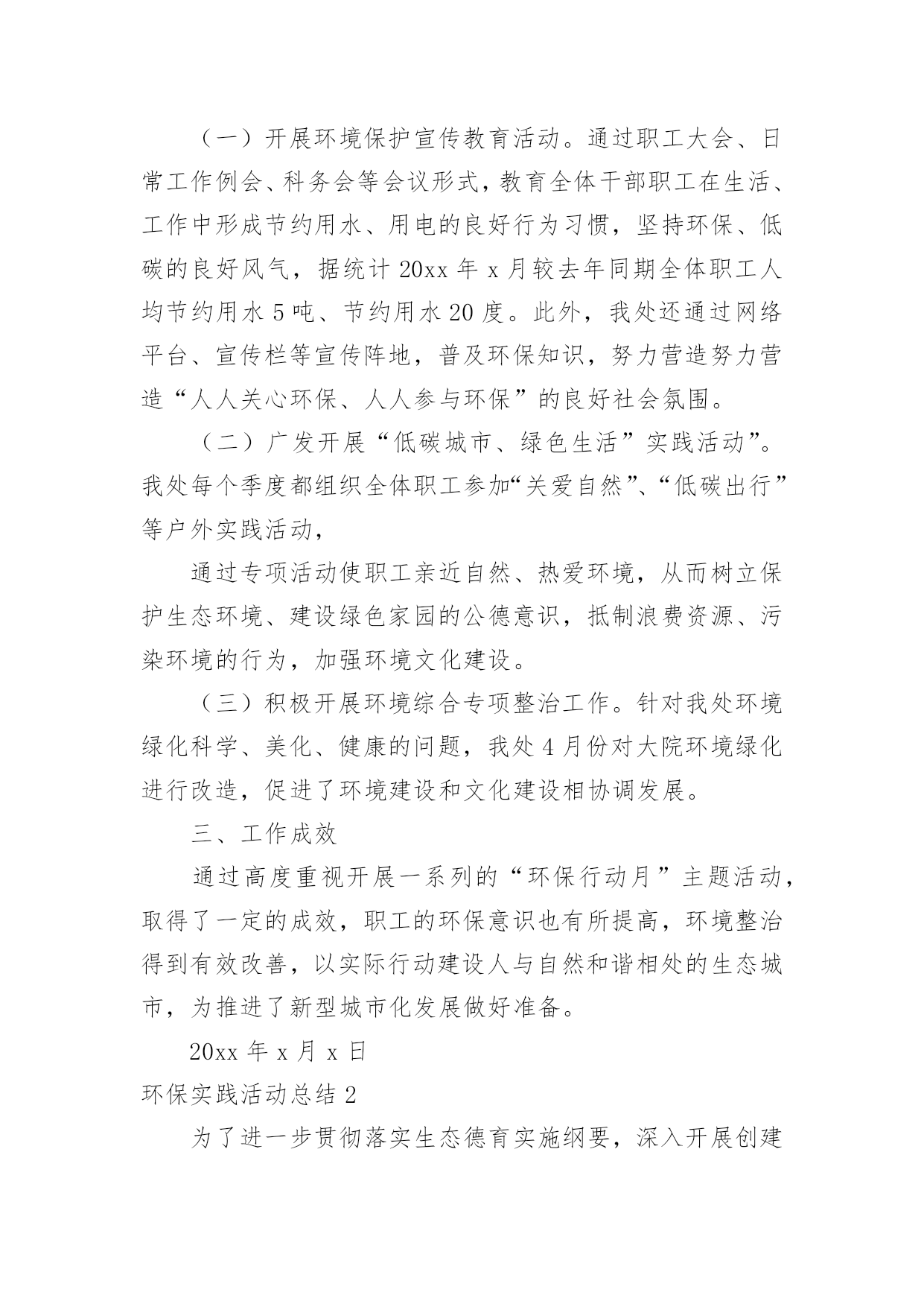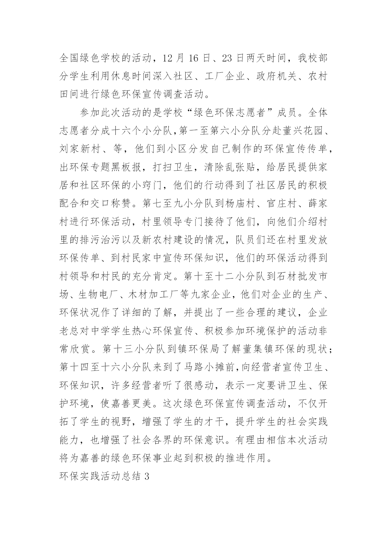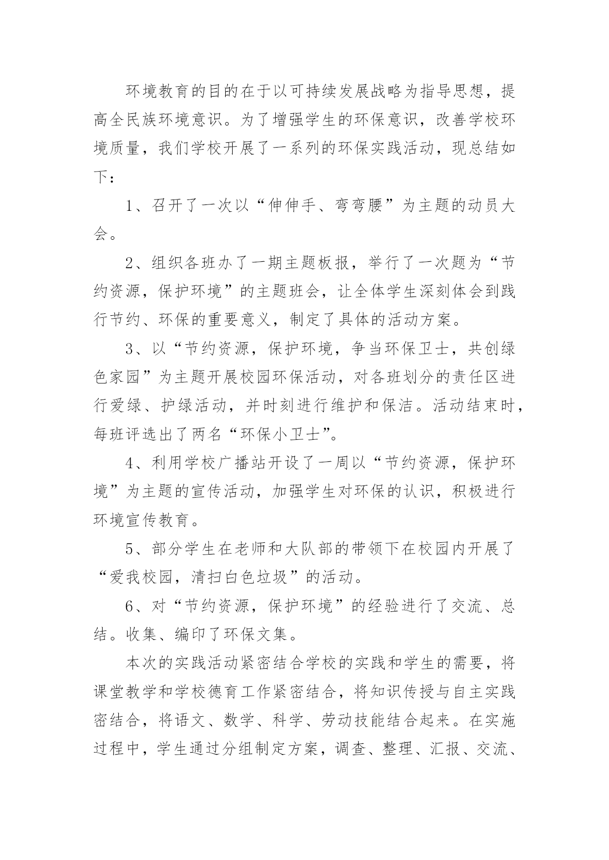 环保实践活动总结环保实践活动总结15篇总结是指对某一阶段的工作、学习或思想中的经验或情况加以总结和概括的书面材料,通过它可以全面地、系统地了解以往的学习和工作情况,不妨让我们认真地完成总结吧。你想知道总结怎么写吗?以下是小编帮大家整理的环保实践活动总结,希望能够帮助到大家。环保实践活动总结1根据**市**局《关于组织开展“环保行动月”主题实践活动的通知》要求,为更好地建设人与自然和谐相处的生态城市,推进新型城市化发展,我室结合实际,在4月份开展了“环保行动月”主题实践活动,现将活动情况总结如下:一、领导重视,提高环保意识为确保单位环保工作由计划、有效的开展,我处领导非常重视单位环境与人的和谐,通过开展“环保行动月”主题活动,进一步增强职工的环保意识,持续推进以空气环境、水环境、人居环境等为重点的环境综合整治,巩固单位环境改善成果,动员全体干部职工积极支持、参与环境综合整治工作,进一步形成保护环境、节约资源、低碳减排的社会风尚,为建设生态城市营造良好的氛围。二、结合单位实际,开展“环保”活动(一)开展环境保护宣传教育活动。通过职工大会、日常工作例会、科务会等会议形式,教育全体干部职工在生活、工作中形成节约用水、用电的良好行为习惯,坚持环保、低碳的良好风气,据统计20xx年x月较去年同期全体职工人均节约用水5吨、节约用水20度。此外,我处还通过网络平台、宣传栏等宣传阵地,普及环保知识,努力营造努力营造“人人关心环保、人人参与环保”的良好社会氛围。(二)广发开展“低碳城市、绿色生活”实践活动”。我处每个季度都组织全体职工参加“关爱自然”、“低碳出行”等户外实践活动,通过专项活动使职工亲近自然、热爱环境,从而树立保护生态环境、建设绿色家园的公德意识,抵制浪费资源、污染环境的行为,加强环境文化建设。(三)积极开展环境综合专项整治工作。针对我处环境绿化科学、美化、健康的问题,我处4月份对大院环境绿化进行改造,促进了环境建设和文化建设相协调发展。三、工作成效通过高度重视开展一系列的“环保行动月”主题活动,取得了一定的成效,职工的环保意识也有所提高,环境整治得到有效改善,以实际行动建设人与自然和谐相处的生态城市,为推进了新型城市化发展做好准备。20xx年x月x日环保实践活动总结2为了进一步贯彻落实生态德育实施纲要,深入开展创建全国绿色学校的活动,12月16日、23日两天时间,我校部分学生利用休息时间深入社区、工厂企业、政府机关、农村田间进行绿色环保宣传调查活动。参加此次活动的是学校“绿色环保志愿者”成员。全体志愿者分成十六个小分队,第一至第六小分队分赴董兴花园、刘家新村、等,他们到小区分发自己制作的环保宣传传单,出环保专题黑板报,打扫卫生,清除乱张贴,给居民提供家居和社区环保的小窍门,他们的行动得到了社区居民的积极配合和交口称赞。第七至九小分队到杨庙村、官庄村、薛家村进行环保活动,村里领导专门接待了他们,向他们介绍村里的排污治污以及新农村建设的情况,队员们还在村里发放环保传单、到村民家中宣传环保知识,他们的环保活动得到村领导和村民的充分肯定。第十至十二小分队到石材批发市场、生物电厂、木材加工厂等九家企业,他们对企业的生产、环保状况作了详细的了解,并提出了一些合理的建议,企业老总对中学学生热心环保宣传、积极参加环境保护的活动非常欣赏。第十三小分队到镇环保局了解董集镇环保的现状;第十四至十六小分队来到了马路小摊前,向经营者宣传卫生、环保知识,许多经营者听了很感动,表示一定要讲卫生、保护环境,使嘉善更美。这次绿色环保宣传调查活动,不仅开拓了学生的视野,增强了学生的才干,提升学生的社会实践能力,也增强了社会各界的环保意识。有理由相信本次活动将为嘉善的绿色环保事业起到积极的推进作用。环保实践活动总结3环境教育的目的在于以可持续发展战略为指导思想,提高全民族环境意识。为了增强学生的环保意识,改善学校环境质量,我们学校开展了一系列的环保实践活动,现总结如下:1、召开了一次以“伸伸手、弯弯腰”为主题的动员大会。2、组织各班办了一期主题板报,举行了一次题为“节约资源,保护环境”的主题班会,让全体学生深刻体会到践行节约、环保的重要意义,制定了具体的活动方案。3、以“节约资源,保护环境,争当环保卫士,共创绿色家园”为主题开展校园环保活动,对各班划分的责任区进行爱绿、护绿活动,并时刻进行维护和保洁。活动结束时,每班评选出了两名“环保小卫士”。4、利用学校广播站开设了一周以“节约资源,保护环境”为主题的宣传活动,加强学生对环保的认识,积极进行环境宣传教育。5、部分学生在老师和大队部的带领下在校园内开展了“爱我校园,清扫白色垃圾”的活动。6、对“节约资源,保护环境”的经验进行了交流、总结。收集、编印了环保文集。本次的实践活动紧密结合学校的实践和学生的需要,将课堂教学