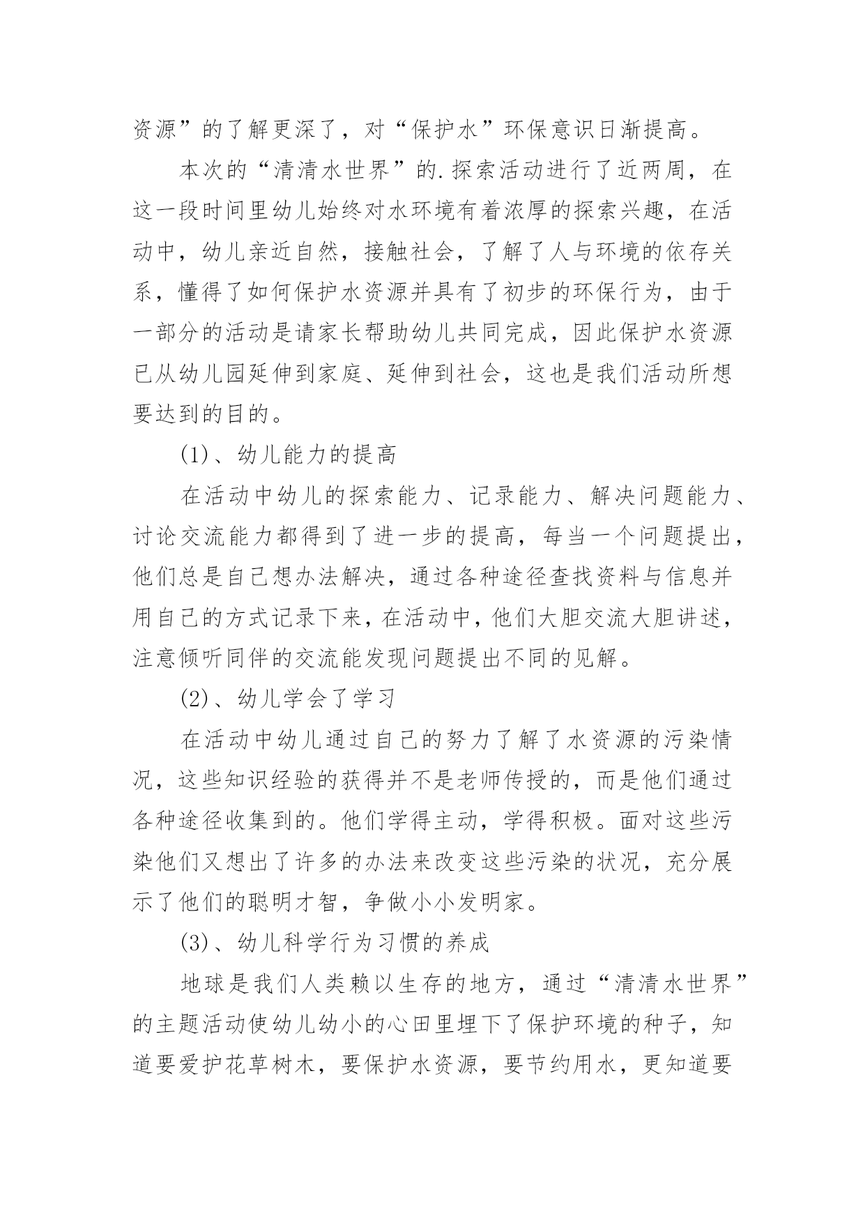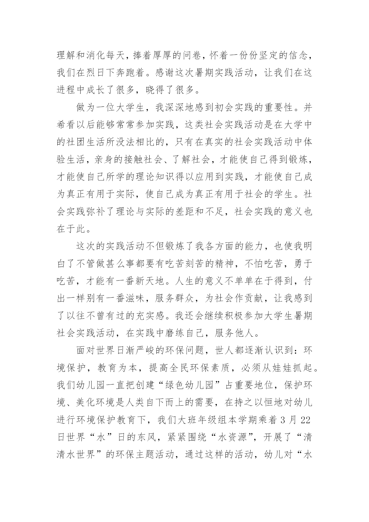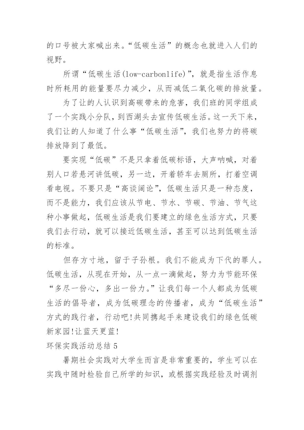 环保实践活动总结环保实践活动总结15篇总结是指对某一阶段的工作、学习或思想中的经验或情况加以总结和概括的书面材料,通过它可以全面地、系统地了解以往的学习和工作情况,不妨让我们认真地完成总结吧。你想知道总结怎么写吗?以下是小编帮大家整理的环保实践活动总结,希望能够帮助到大家。环保实践活动总结1根据**市**局《关于组织开展“环保行动月”主题实践活动的通知》要求,为更好地建设人与自然和谐相处的生态城市,推进新型城市化发展,我室结合实际,在4月份开展了“环保行动月”主题实践活动,现将活动情况总结如下:一、领导重视,提高环保意识为确保单位环保工作由计划、有效的开展,我处领导非常重视单位环境与人的和谐,通过开展“环保行动月”主题活动,进一步增强职工的环保意识,持续推进以空气环境、水环境、人居环境等为重点的环境综合整治,巩固单位环境改善成果,动员全体干部职工积极支持、参与环境综合整治工作,进一步形成保护环境、节约资源、低碳减排的社会风尚,为建设生态城市营造良好的氛围。二、结合单位实际,开展“环保”活动(一)开展环境保护宣传教育活动。通过职工大会、日常工作例会、科务会等会议形式,教育全体干部职工在生活、工作中形成节约用水、用电的良好行为习惯,坚持环保、低碳的良好风气,据统计20xx年x月较去年同期全体职工人均节约用水5吨、节约用水20度。此外,我处还通过网络平台、宣传栏等宣传阵地,普及环保知识,努力营造努力营造“人人关心环保、人人参与环保”的良好社会氛围。(二)广发开展“低碳城市、绿色生活”实践活动”。我处每个季度都组织全体职工参加“关爱自然”、“低碳出行”等户外实践活动,通过专项活动使职工亲近自然、热爱环境,从而树立保护生态环境、建设绿色家园的公德意识,抵制浪费资源、污染环境的行为,加强环境文化建设。(三)积极开展环境综合专项整治工作。针对我处环境绿化科学、美化、健康的问题,我处4月份对大院环境绿化进行改造,促进了环境建设和文化建设相协调发展。三、工作成效通过高度重视开展一系列的“环保行动月”主题活动,取得了一定的成效,职工的环保意识也有所提高,环境整治得到有效改善,以实际行动建设人与自然和谐相处的生态城市,为推进了新型城市化发展做好准备。20xx年x月x日环保实践活动总结2为了进一步贯彻落实生态德育实施纲要,深入开展创建全国绿色学校的活动,12月16日、23日两天时间,我校部分学生利用休息时间深入社区、工厂企业、政府机关、农村田间进行绿色环保宣传调查活动。参加此次活动的是学校“绿色环保志愿者”成员。全体志愿者分成十六个小分队,第一至第六小分队分赴董兴花园、刘家新村、等,他们到小区分发自己制作的环保宣传传单,出环保专题黑板报,打扫卫生,清除乱张贴,给居民提供家居和社区环保的小窍门,他们的行动得到了社区居民的积极配合和交口称赞。第七至九小分队到杨庙村、官庄村、薛家村进行环保活动,村里领导专门接待了他们,向他们介绍村里的排污治污以及新农村建设的情况,队员们还在村里发放环保传单、到村民家中宣传环保知识,他们的环保活动得到村领导和村民的充分肯定。第十至十二小分队到石材批发市场、生物电厂、木材加工厂等九家企业,他们对企业的生产、环保状况作了详细的了解,并提出了一些合理的建议,企业老总对中学学生热心环保宣传、积极参加环境保护的活动非常欣赏。第十三小分队到镇环保局了解董集镇环保的现状;第十四至十六小分队来到了马路小摊前,向经营者宣传卫生、环保知识,许多经营者听了很感动,表示一定要讲卫生、保护环境,使嘉善更美。这次绿色环保宣传调查活动,不仅开拓了学生的视野,增强了学生的才干,提升学生的社会实践能力,也增强了社会各界的环保意识。有理由相信本次活动将为嘉善的绿色环保事业起到积极的推进作用。环保实践活动总结3环境教育的目的在于以可持续发展战略为指导思想,提高全民族环境意识。为了增强学生的环保意识,改善学校环境质量,我们学校开展了一系列的环保实践活动,现总结如下:1、召开了一次以“伸伸手、弯弯腰”为主题的动员大会。2、组织各班办了一期主题板报,举行了一次题为“节约资源,保护环境”的主题班会,让全体学生深刻体会到践行节约、环保的重要意义,制定了具体的活动方案。3、以“节约资源,保护环境,争当环保卫士,共创绿色家园”为主题开展校园环保活动,对各班划分的责任区进行爱绿、护绿活动,并时刻进行维护和保洁。活动结束时,每班评选出了两名“环保小卫士”。4、利用学校广播站开设了一周以“节约资源,保护环境”为主题的宣传活动,加强学生对环保的认识,积极进行环境宣传教育。5、部分学生在老师和大队部的带领下在校园内开展了“爱我校园,清扫白色垃圾”的活动。6、对“节约资源,保护环境”的经验进行了交流、总结。收集、编印了环保文集。本次的实践活动紧密结合学校的实践和学生的需要,将课堂教学