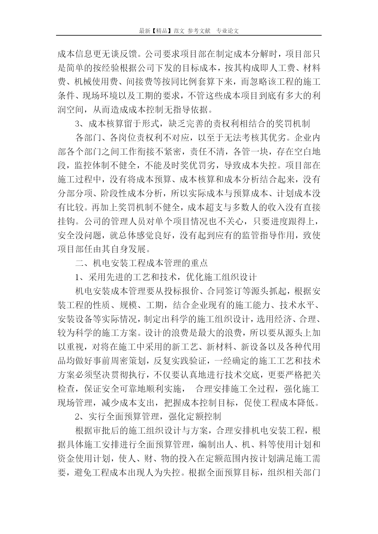 最新【精品】范文参考文献专业论文浅析矿山机电安装工程成本管理浅析矿山机电安装工程成本管理摘要:矿山机电安装工程成本管理纵向贯穿工程投标、施工、竣工结算等全过程,横向涉及计划、技术、物资、财务等职能部门。矿山机电安装工程存在专业种类多、系统复杂性高、施工过程影响因素多等特点,给成本管理带来了一定的困难。随着市场竞争日趋激烈,要想立于不败之地,降低机电安装工程项目成本,提高经济效益,已成为机电安装企业的当务之急。关键字:机电安装工程成本管理现状重点中图分类号:TU85文献标识码:A一、矿山机电安装工程成本管理的现状1、成本管理意识不强,没有形成全员参与的成本管理观念在矿山机电安装项目成本管理中,项目部经理成员成本管理意识不强,分工职责不明确。虽然公司要求项目部在机电安装管理中要做到先算后做,但实际上项目部在具体管理中是边干边算,甚至干了再算。项目部虽都配有预算人员,但责任落实不到位,合同预算与材料、财务等部门工作脱节,有预算无核算,大部分项目无经济分析,没有具体的节超建议和措施。隐蔽工程或合同外工程找业主办理签证手续不及时,如遇到业主不愿签或有意拖的情况,不能及时采取措施,拖拉作风严重,从而造成部分干的工程结算不来。部分负责生产的领导者,只重视工程进度、质量与安全,不关心成本控制,认为成本管理是预算与财务人员的事情。部分项目经理对成本管理工作重视不够,简单地将项目成本管理交给财务人员,忽视事前、事中、事后控制。2、缺乏可操作的工程成本控制依据矿山机电安装企业没有形成系统的成本控制体系,基础管理存在漏洞。部分项目经理管理方法陈旧,跟不上形势的发展。比如在控制人工成本时一味缩减各环节的管理人员,一人身兼数职,各控制环节混乱,致使不能完整的提供真实的成本资料。部分项目即使能够提供其成本账册,充其量也就是个流水帐,一些成本资料不能真实体现,成本信息更无谈反馈。公司要求项目部在制定成本分解时,项目部只是简单的按经验根据公司下发的目标成本,按其构成即人工费、材料费、机械使用费、间接费等按同比例套算下来,而忽略该工程的施工条件、现场环境以及工期的要求,不管这些成本项目到底有多大的利润空间,从而造成成本控制无指导依据。3、成本核算留于形式,缺乏完善的责权利相结合的奖罚机制各部门、各岗位责权利不对应,以至于无法考核其优劣。企业内部各个部门之间工作衔接不紧密,责任不清,各管一块,存在空白地段,监控体制不健全,不能及时奖优罚劣,导致成本失控。项目部在施工过程中,没有将成本预算、成本核算和成本分析结合起来,没有分部分项、阶段性成本分析,所以实际成本与预算成本、计划成本没有比较。再加上奖罚机制不健全,成本超支与多数人的收入没有直接挂钩。公司的管理人员对单个项目情况也不关心,只要进度跟得上,安全没问题,就总体感觉良好,没有起到应有的监管指导作用,致使项目部任由其自身发展。二、机电安装工程成本管理的重点1、采用先进的工艺和技术,优化施工组织设计机电安装成本管理要从投标报价、合同签订等源头抓起,根据安装工程的性质、规模、工期,结合企业现有的施工能力、技术水平、安装设备等实际情况,制定出科学的施工组织设计,选用经济、合理、较为科学的施工方案。设计的浪费是最大的浪费,所以要从源头上加以重视,对将在施工中采用的新工艺、新材料、新设备以及各种代用品均做好事前周密策划,反复实践验证,一经确定的施工工艺和技术方案必须坚决贯彻执行,不仅要认真地进行技术交底,更要严格把关检查,保证安全可靠地顺利实施,合理安排施工全过程,强化施工现场管理,减少成本支出,把握成本控制目标,促使工程成本降低。2、实行全面预算管理,强化定额控制根据审批后的施工组织设计与方案,合理安排机电安装工程,根据具体施工安排进行全面预算管理,编制出人、机、料等使用计划和资金使用计划,使人、财、物的投入在定额范围内按计划满足施工需要,避免工程成本出现人为失控。根据全面预算目标,组织相关部门与人员分部分项、分阶段进行成本核算,将实际成本与预算成本进行比较并分析,当出现偏差时,必须查明原因,对负偏差制定出纠偏措施,并进行重点跟踪,以便尽快回到正常轨道。3、加强人员管理,做好人工成本的有效控制机电安装合同签订后,要选配有经验能胜任的项目经理部成员。机电安装要求安装操作人员的技术水平相对较高,特殊工种需持证上岗并应定期复审,为保证工作效率,要择优筛选技术好、素质高、工作稳定、作风顽强的成建制的劳务队伍,实行动态管理。合理安排好机电安装各作业面,严格按计划任务分解到人,认真考核,实行多劳多得。在施工中,要做好工种之间、工序之间的衔接,提高劳动生产率,降低工资费用。劳动生产率的提高意味着单位工程的用工减少,单位时间内完成工程数量增加,这样不仅能够减少成本中的人工费,而且还相应地降低其他