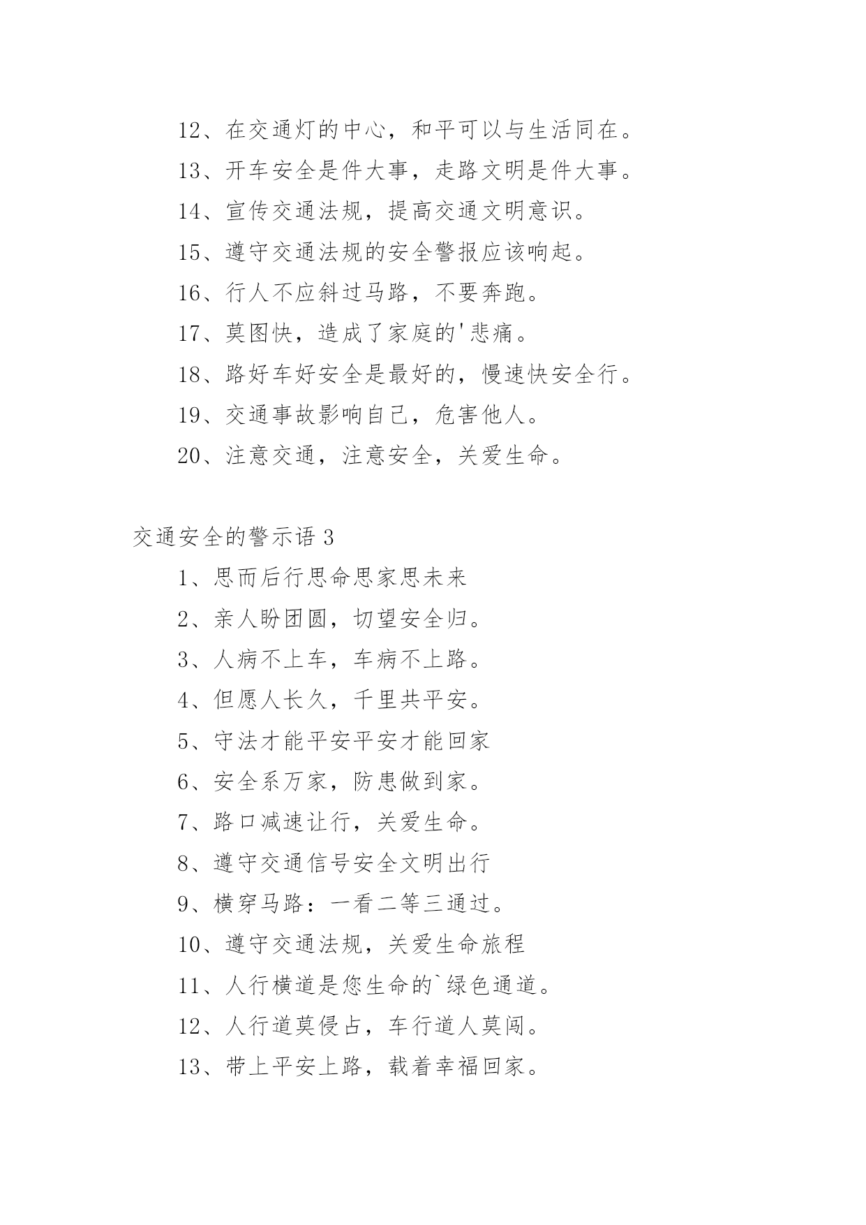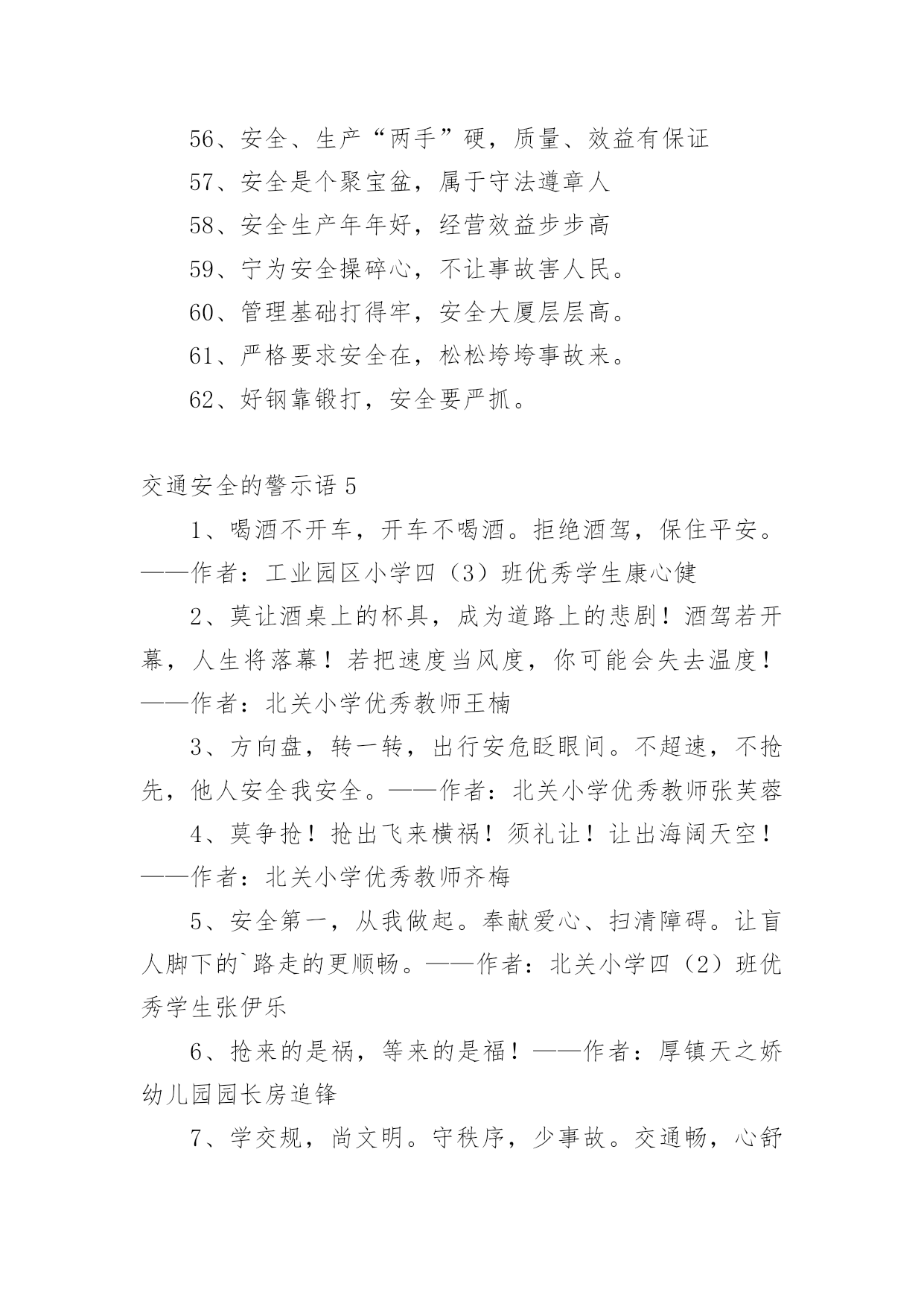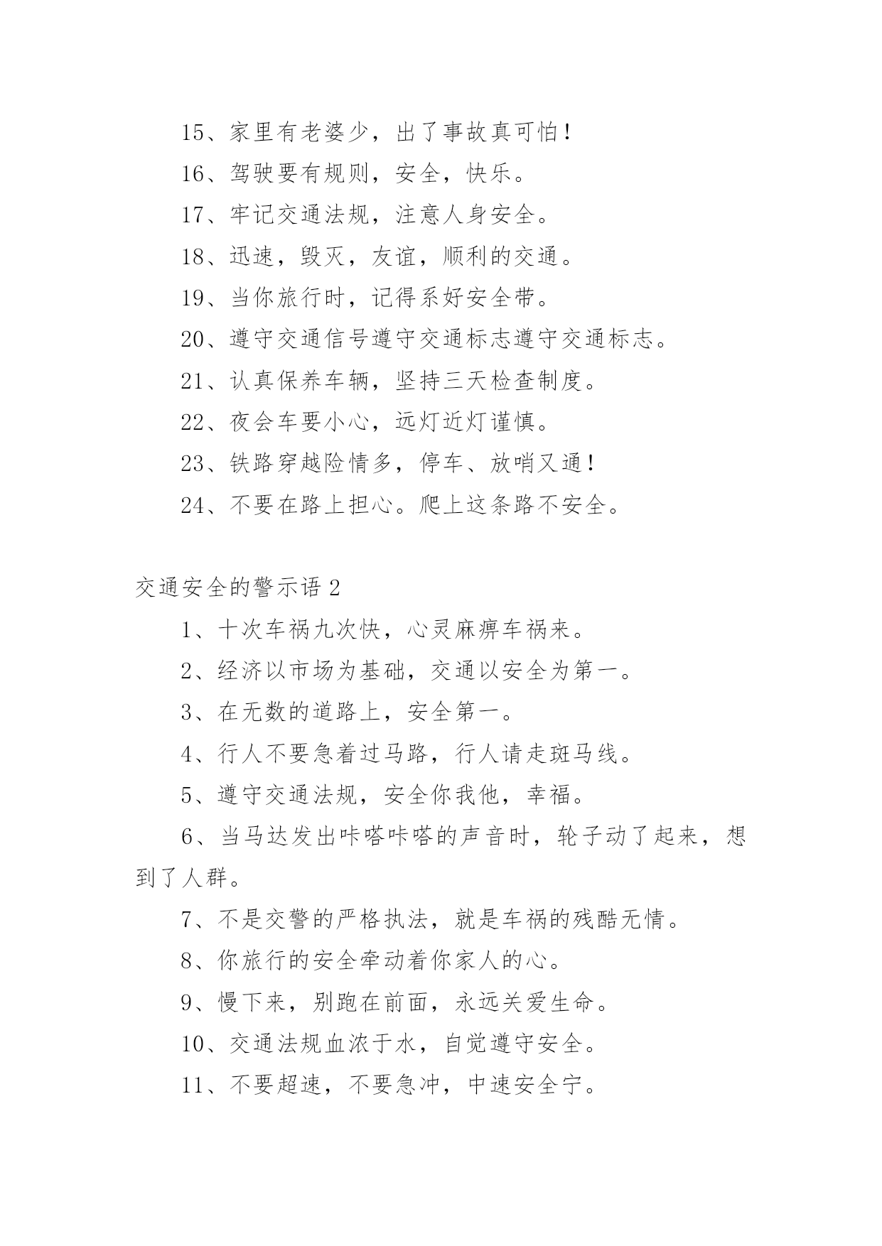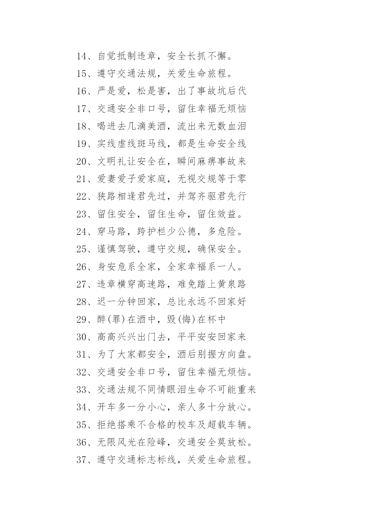 交通安全的警示语交通安全的警示语(必备)无论是身处学校还是步入社会,大家总免不了要接触或使用警示语吧,运用经典短句、诗词、名言、歇后语、成语等作为警示语。那么,怎么去写警示语呢?以下是小编为大家收集的交通安全的警示语,欢迎阅读与收藏。交通安全的警示语11、管理基础牢固,安全楼层层高。2、文明远行万里聚会,遵纪守法团圆。3、让和平出来,抢夺邪恶的结局。4、司机同志:你我以后的生活,握在你的'手里。5、你遵守交通规则,我遵守,大家遵守。6、人生只有一次,安全相伴一生。7、不要让瓶子带着你在路上,交通安全一定要靠你和我来维护。8、安全与生活是一条线索,幸福与安全息息相关。9、在机场乘车时请戴上安全帽。10、小心驾驶,永远安全;有麻烦。11、灾害预防以和平为宗旨,以和平为规则。12、旅行安全是金,开车小心是福。13、开车和说话,隐患接踵而至。14、虽然为了道路的速度,放弃纵向的捷径来停止。15、家里有老婆少,出了事故真可怕!16、驾驶要有规则,安全,快乐。17、牢记交通法规,注意人身安全。18、迅速,毁灭,友谊,顺利的交通。19、当你旅行时,记得系好安全带。20、遵守交通信号遵守交通标志遵守交通标志。21、认真保养车辆,坚持三天检查制度。22、夜会车要小心,远灯近灯谨慎。23、铁路穿越险情多,停车、放哨又通!24、不要在路上担心。爬上这条路不安全。交通安全的警示语21、十次车祸九次快,心灵麻痹车祸来。2、经济以市场为基础,交通以安全为第一。3、在无数的道路上,安全第一。4、行人不要急着过马路,行人请走斑马线。5、遵守交通法规,安全你我他,幸福。6、当马达发出咔嗒咔嗒的声音时,轮子动了起来,想到了人群。7、不是交警的严格执法,就是车祸的残酷无情。8、你旅行的安全牵动着你家人的心。9、慢下来,别跑在前面,永远关爱生命。10、交通法规血浓于水,自觉遵守安全。11、不要超速,不要急冲,中速安全宁。12、在交通灯的中心,和平可以与生活同在。13、开车安全是件大事,走路文明是件大事。14、宣传交通法规,提高交通文明意识。15、遵守交通法规的安全警报应该响起。16、行人不应斜过马路,不要奔跑。17、莫图快,造成了家庭的'悲痛。18、路好车好安全是最好的,慢速快安全行。19、交通事故影响自己,危害他人。20、注意交通,注意安全,关爱生命。交通安全的警示语31、思而后行思命思家思未来2、亲人盼团圆,切望安全归。3、人病不上车,车病不上路。4、但愿人长久,千里共平安。5、守法才能平安平安才能回家6、安全系万家,防患做到家。7、路口减速让行,关爱生命。8、遵守交通信号安全文明出行9、横穿马路:一看二等三通过。10、遵守交通法规,关爱生命旅程11、人行横道是您生命的`绿色通道。12、人行道莫侵占,车行道人莫闯。13、带上平安上路,载着幸福回家。14、自觉抵制违章,安全长抓不懈。15、遵守交通法规,关爱生命旅程。16、严是爱,松是害,出了事故坑后代17、交通安全非口号,留住幸福无烦恼18、喝进去几滴美酒,流出来无数血泪19、实线虚线斑马线,都是生命安全线20、文明礼让安全在,瞬间麻痹事故来21、爱妻爱子爱家庭,无视交规等于零22、狭路相逢君先过,并驾齐驱君先行23、留住安全,留住生命,留住效益。24、穿马路,跨护栏少公德,多危险。25、谨慎驾驶,遵守交规,确保安全。26、身安危系全家,全家幸福系一人。27、违章横穿高速路,难免踏上黄泉路28、迟一分钟回家,总比永远不回家好29、醉(罪)在酒中,毁(悔)在杯中30、高高兴兴出门去,平平安安回家来31、为了大家都安全,酒后别握方向盘。32、交通安全非口号,留住幸福无烦恼。33、交通法规不同情眼泪生命不可能重来34、开车多一分小心,亲人多十分放心。35、拒绝搭乘不合格的校车及超载车辆。36、无限风光在险峰,交通安全莫放松。37、遵守交通标志标线,关爱生命旅程。38、高高兴兴出行来,平平安安回家去!39、麻痹大意酿事故,用心驾驶保安全。40、安全险于粗心大意,细心周全等于安全。41、对行人多一秒等待,对生命多一分关爱!42、幸福与安全两相连,生命与守法一线牵。43、支路进主路,减速(停车)让行保安全。44、自觉遵守交通法规,确保春运路畅民安。45、上班安全,下班安心,安全一生,幸福一世。46、不超速,不超员,不酒后驾驶,不疲劳驾驶。47、要交警事事宽容你吗?死神可对谁都不客气!48、安全工作必须讲实干实用实效;力戒表面表演。49、春运交通安全从我做起,自觉抵制交通违法行为!50、严禁超速超载超员疲劳和酒后驾驶等严重违法行为。交通安全的警示语41、醉(罪)在酒中,毁(悔)在杯中。2、十次肇事九次快,莫和死神去比赛。3、文明礼让安全在,瞬间麻痹事故来。4、人要安全靠右行,车要安全靠慢行。5、实线虚线斑马线,都是生命安全