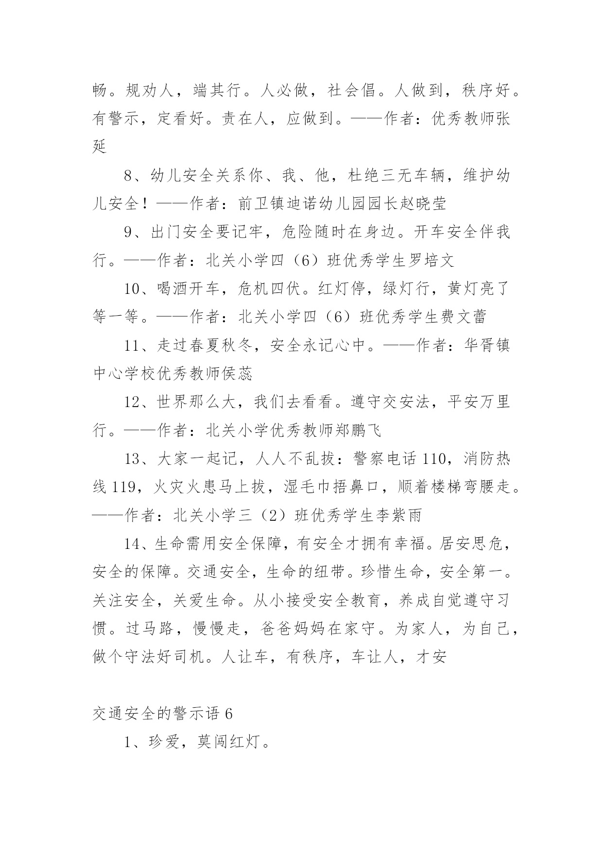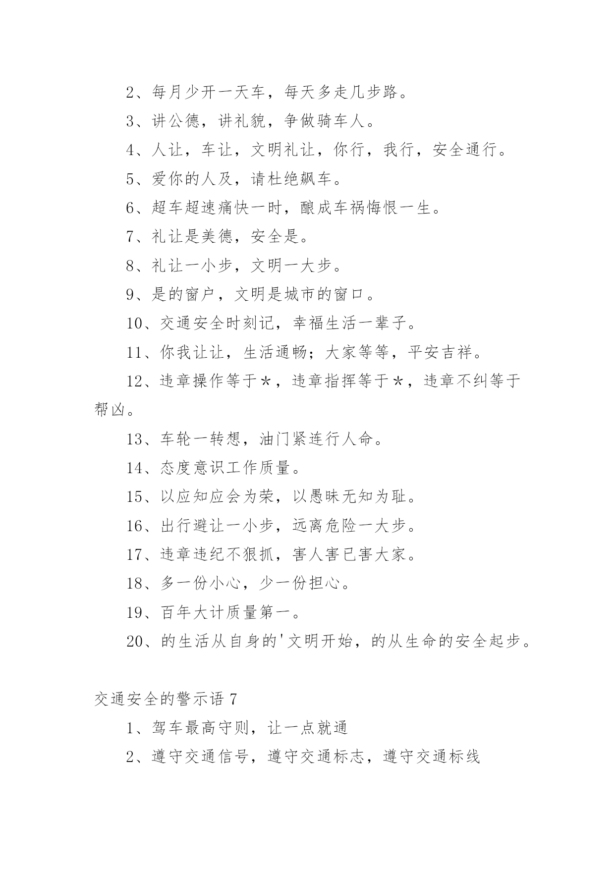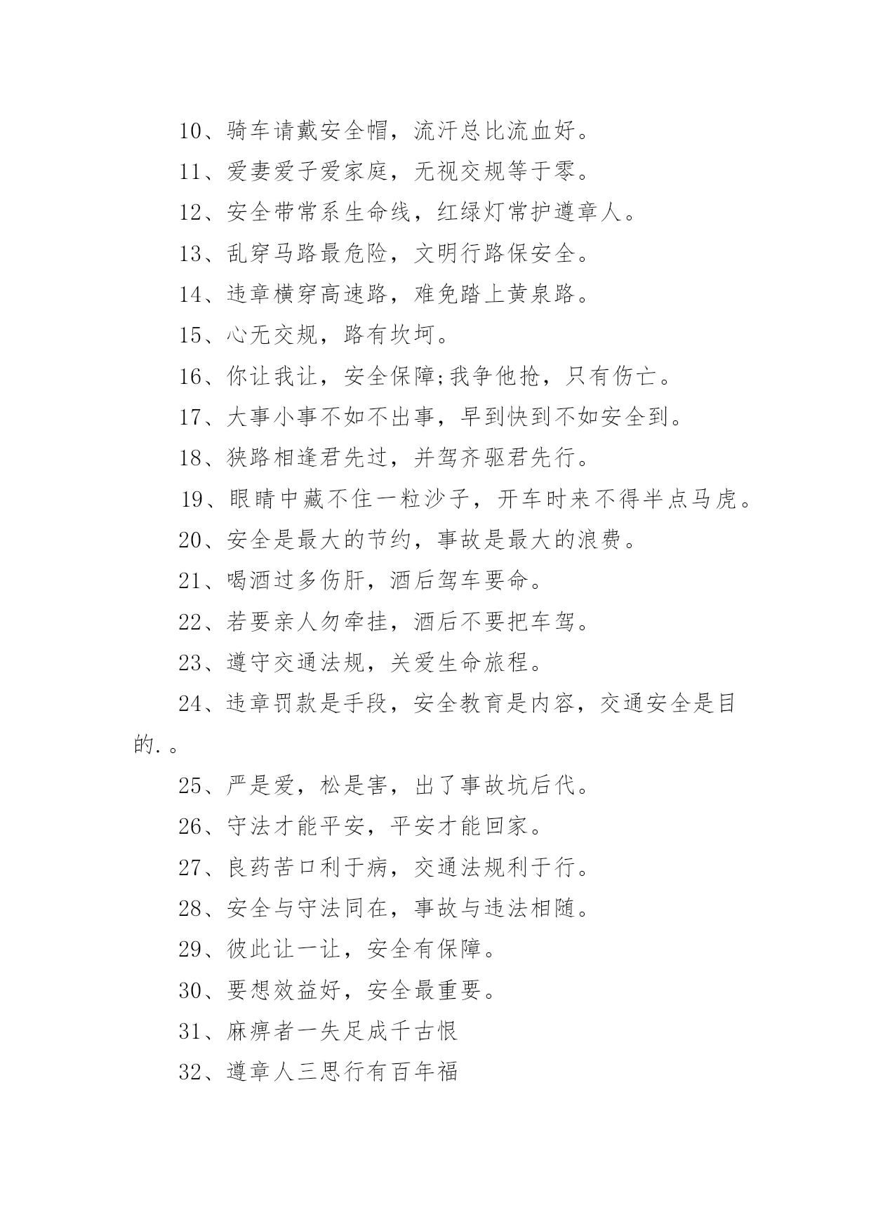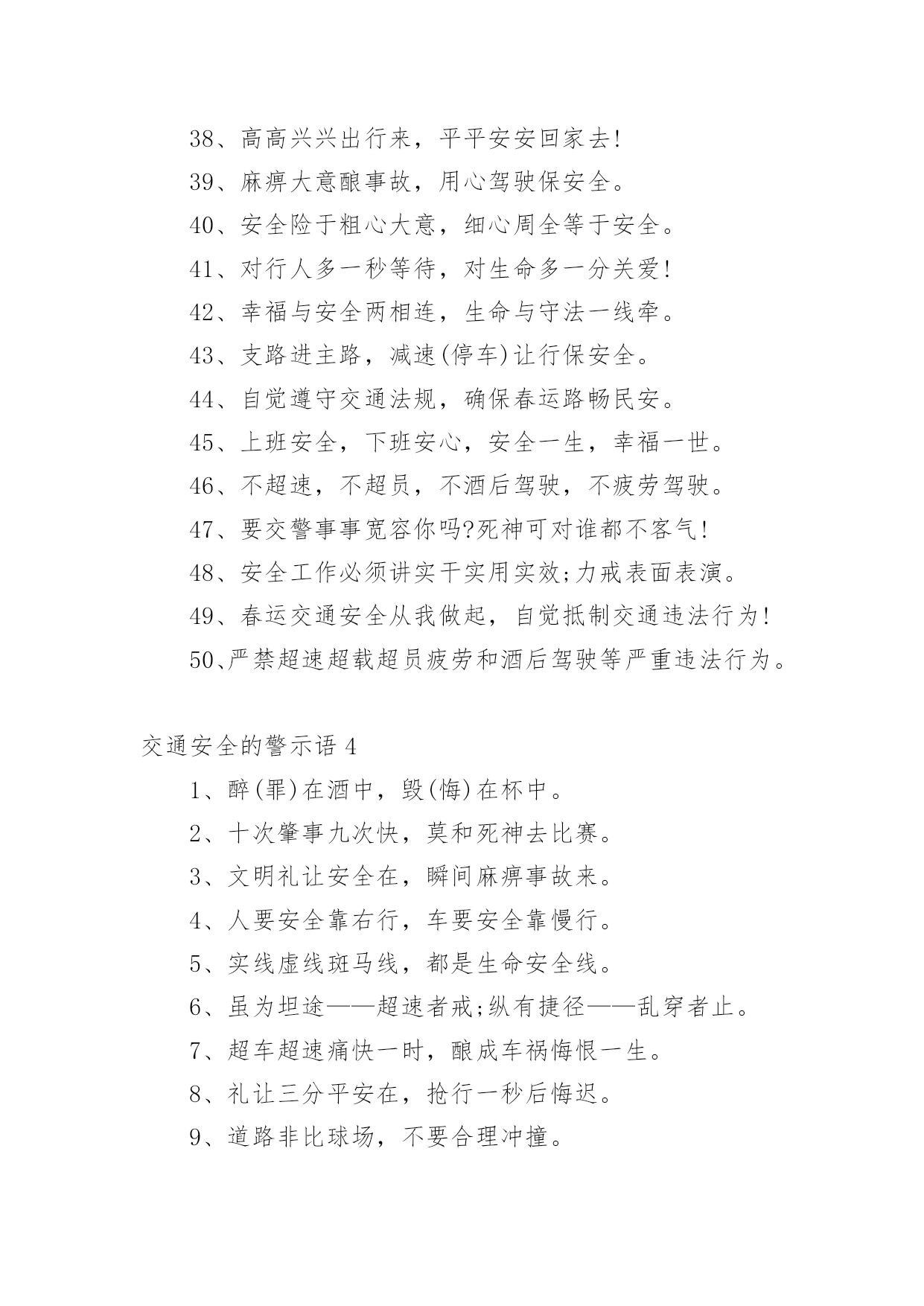 交通安全的警示语交通安全的警示语(必备)无论是身处学校还是步入社会,大家总免不了要接触或使用警示语吧,运用经典短句、诗词、名言、歇后语、成语等作为警示语。那么,怎么去写警示语呢?以下是小编为大家收集的交通安全的警示语,欢迎阅读与收藏。交通安全的警示语11、管理基础牢固,安全楼层层高。2、文明远行万里聚会,遵纪守法团圆。3、让和平出来,抢夺邪恶的结局。4、司机同志:你我以后的生活,握在你的'手里。5、你遵守交通规则,我遵守,大家遵守。6、人生只有一次,安全相伴一生。7、不要让瓶子带着你在路上,交通安全一定要靠你和我来维护。8、安全与生活是一条线索,幸福与安全息息相关。9、在机场乘车时请戴上安全帽。10、小心驾驶,永远安全;有麻烦。11、灾害预防以和平为宗旨,以和平为规则。12、旅行安全是金,开车小心是福。13、开车和说话,隐患接踵而至。14、虽然为了道路的速度,放弃纵向的捷径来停止。15、家里有老婆少,出了事故真可怕!16、驾驶要有规则,安全,快乐。17、牢记交通法规,注意人身安全。18、迅速,毁灭,友谊,顺利的交通。19、当你旅行时,记得系好安全带。20、遵守交通信号遵守交通标志遵守交通标志。21、认真保养车辆,坚持三天检查制度。22、夜会车要小心,远灯近灯谨慎。23、铁路穿越险情多,停车、放哨又通!24、不要在路上担心。爬上这条路不安全。交通安全的警示语21、十次车祸九次快,心灵麻痹车祸来。2、经济以市场为基础,交通以安全为第一。3、在无数的道路上,安全第一。4、行人不要急着过马路,行人请走斑马线。5、遵守交通法规,安全你我他,幸福。6、当马达发出咔嗒咔嗒的声音时,轮子动了起来,想到了人群。7、不是交警的严格执法,就是车祸的残酷无情。8、你旅行的安全牵动着你家人的心。9、慢下来,别跑在前面,永远关爱生命。10、交通法规血浓于水,自觉遵守安全。11、不要超速,不要急冲,中速安全宁。12、在交通灯的中心,和平可以与生活同在。13、开车安全是件大事,走路文明是件大事。14、宣传交通法规,提高交通文明意识。15、遵守交通法规的安全警报应该响起。16、行人不应斜过马路,不要奔跑。17、莫图快,造成了家庭的'悲痛。18、路好车好安全是最好的,慢速快安全行。19、交通事故影响自己,危害他人。20、注意交通,注意安全,关爱生命。交通安全的警示语31、思而后行思命思家思未来2、亲人盼团圆,切望安全归。3、人病不上车,车病不上路。4、但愿人长久,千里共平安。5、守法才能平安平安才能回家6、安全系万家,防患做到家。7、路口减速让行,关爱生命。8、遵守交通信号安全文明出行9、横穿马路:一看二等三通过。10、遵守交通法规,关爱生命旅程11、人行横道是您生命的`绿色通道。12、人行道莫侵占,车行道人莫闯。13、带上平安上路,载着幸福回家。14、自觉抵制违章,安全长抓不懈。15、遵守交通法规,关爱生命旅程。16、严是爱,松是害,出了事故坑后代17、交通安全非口号,留住幸福无烦恼18、喝进去几滴美酒,流出来无数血泪19、实线虚线斑马线,都是生命安全线20、文明礼让安全在,瞬间麻痹事故来21、爱妻爱子爱家庭,无视交规等于零22、狭路相逢君先过,并驾齐驱君先行23、留住安全,留住生命,留住效益。24、穿马路,跨护栏少公德,多危险。25、谨慎驾驶,遵守交规,确保安全。26、身安危系全家,全家幸福系一人。27、违章横穿高速路,难免踏上黄泉路28、迟一分钟回家,总比永远不回家好29、醉(罪)在酒中,毁(悔)在杯中30、高高兴兴出门去,平平安安回家来31、为了大家都安全,酒后别握方向盘。32、交通安全非口号,留住幸福无烦恼。33、交通法规不同情眼泪生命不可能重来34、开车多一分小心,亲人多十分放心。35、拒绝搭乘不合格的校车及超载车辆。36、无限风光在险峰,交通安全莫放松。37、遵守交通标志标线,关爱生命旅程。38、高高兴兴出行来,平平安安回家去!39、麻痹大意酿事故,用心驾驶保安全。40、安全险于粗心大意,细心周全等于安全。41、对行人多一秒等待,对生命多一分关爱!42、幸福与安全两相连,生命与守法一线牵。43、支路进主路,减速(停车)让行保安全。44、自觉遵守交通法规,确保春运路畅民安。45、上班安全,下班安心,安全一生,幸福一世。46、不超速,不超员,不酒后驾驶,不疲劳驾驶。47、要交警事事宽容你吗?死神可对谁都不客气!48、安全工作必须讲实干实用实效;力戒表面表演。49、春运交通安全从我做起,自觉抵制交通违法行为!50、严禁超速超载超员疲劳和酒后驾驶等严重违法行为。交通安全的警示语41、醉(罪)在酒中,毁(悔)在杯中。2、十次肇事九次快,莫和死神去比赛。3、文明礼让安全在,瞬间麻痹事故来。4、人要安全靠右行,车要安全靠慢行。5、实线虚线斑马线,都是生命安全