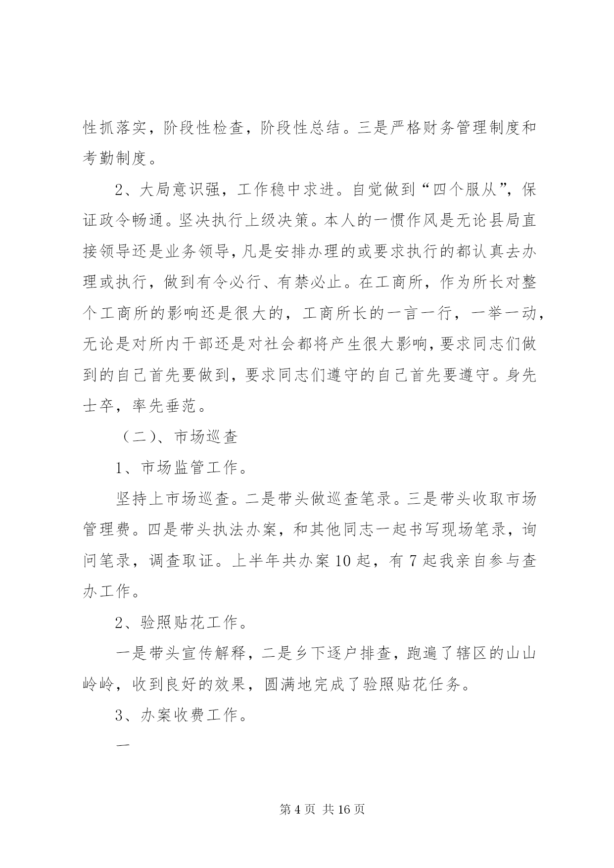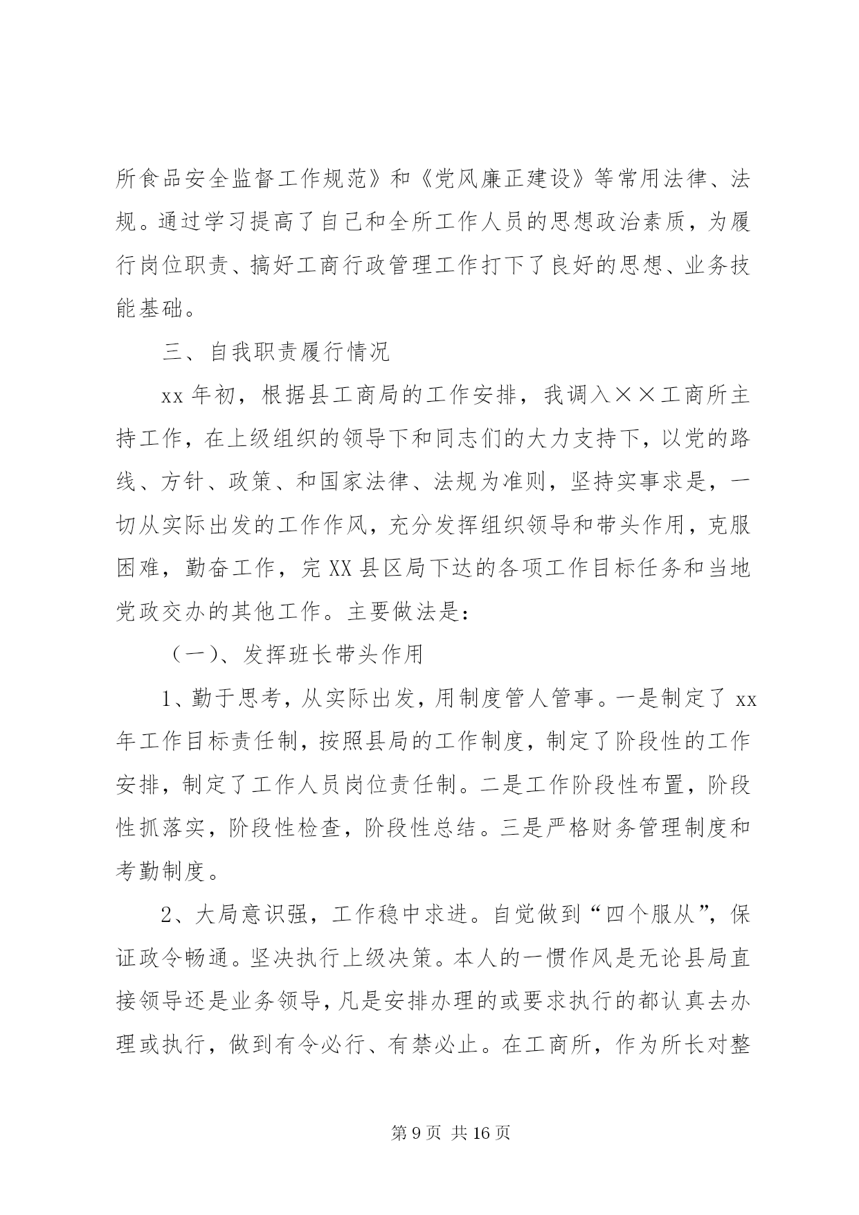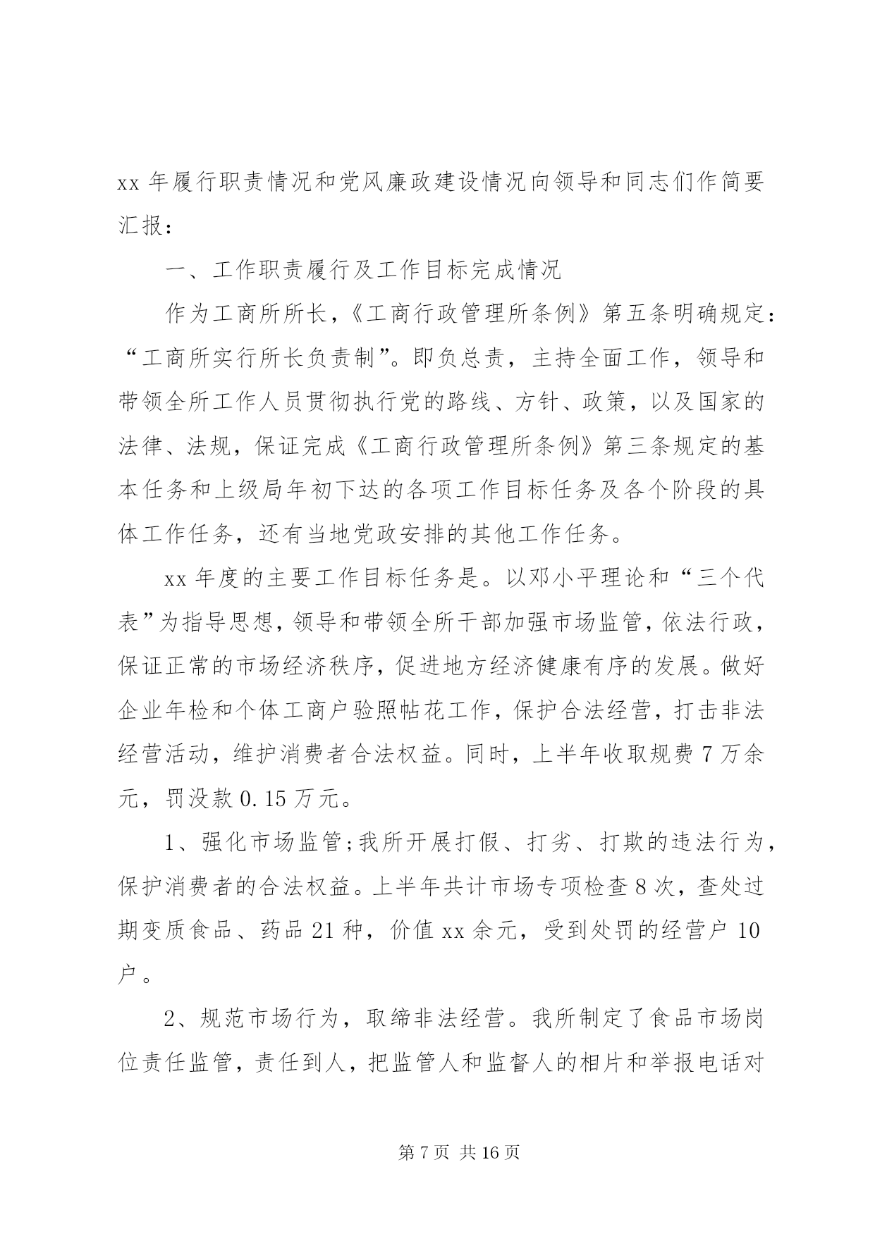 第PAGE\*Arabic\*MERGEFORMAT16页共NUMPAGES\*MERGEFORMAT16页工商所所长述职述廉报告述职述廉报告——**工商所所长***各位领导、各位业户代表:我叫***,根据县局工作的需要负责**工商所工作。现将2007年履行职责情况和党风廉政建设情况向领导和同志们作简要汇报:一、工作职责履行及工作目标完成情况作为工商所所长,《工商行政管理所条例》第五条明确规定。“工商所实行所长负责制”。即负总责,主持全面工作,领导和带领全所工作人员贯彻执行党的路线、方针、政策,以及国家的法律、法规,保证完成《工商行政管理所条例》第三条规定的基本任务和上级局年初下达的各项工作目标任务及各个阶段的具体工作任务,还有当地党政安排的其他工作任务。2007年度的主要工作目标任务是。以邓小平理论和“三个代表”为指导思想,领导和带领全所干部加强市场监管,依法行政,保证正常的市场经济秩序,促进地方经济健康有序的发展。做好企业年检和个体工商户验照帖花工作,保护合法经营,打击非法经营活动,维护消费者合法权益。同时,上半年收取规费7万余元,罚没款0.15万元。1、强化市场监管;我所开展打假、打劣、打欺的违法行为,保护消费者的合法权益。上半年共计市场专项检查8次,查处过期变质食品、药品21种,价值2000余元,受到处罚的经营户10户。2、规范市场行为,取缔非法经营。我所制定了食品市场岗位责任监管,责任到人,把监管人和监督人的相片和举报电话对外公布。在我所辖区内建立消费者投诉站3个。让消费者举报方便快捷,使消费者放心消费。3、执法办案;上半年我所共办理案件10起,法没款0.15万元。完成目标任务的百分之五十。4、年检、验照帖花。积极督促、指导辖区内企业、个体工商户年检、验照帖花工作。此项工作任务已按时完成,该验照的达百分之百。上半年新发展个体工商户25户,企业变更3户,个体歇业15户,经济户口和监管档案全部建立。5、“阳光收费”。自开展“阳光收费”工作以来,成立“阳光收费”领导小组,上半年收取规费7万余元,完成全年目标任务的百分之七十。6、积极配合当地党政和有关部门的工作,充分发挥工商所党支部的积极性。二、加强法律、法规、业务技能的学习,努力提高全员综合素质。今年以来,我所的工商管理工作,以不断提高全体工作人员思想政治素质,依法、执法水平,工商业务技能和信息化应用能力的提升为基准点,积极参加上级组织的法律、法规学习,并参加登记注册、监管执法、案件办理、微机操作等业务技能培训。我所还自行组织职工学习《行政许可法》、《城乡个体工商户管理暂行条例》、《公司法》、《消费者权益保护法》、《工商行政管理所食品安全监督工作规范》和《党风廉正建设》等常用法律、法规。通过学习提高了自己和全所工作人员的思想政治素质,为履行岗位职责、搞好工商行政管理工作打下了良好的思想、业务技能基础。三、自我职责履行情况2007年初,根据县工商局的工作安排,我调入**工商所主持工作,在上级组织的领导下和同志们的大力支持下,以党的路线、方针、政策、和国家法律、法规为准则,坚持实事求是,一切从实际出发的工作作风,充分发挥组织领导和带头作用,克服困难,勤奋工作,完XX县区局下达的各项工作目标任务和当地党政交办的其他工作。主要做法是:(一)、发挥班长带头作用1、勤于思考,从实际出发,用制度管人管事。一是制定了2007年工作目标责任制,按照县局的工作制度,制定了阶段性的工作安排,制定了工作人员岗位责任制。二是工作阶段性布置,阶段性抓落实,阶段性检查,阶段性总结。三是严格财务管理制度和考勤制度。2、大局意识强,工作稳中求进。自觉做到“四个服从”,保证政令畅通。坚决执行上级决策。本人的一惯作风是无论县局直接领导还是业务领导,凡是安排办理的或要求执行的都认真去办理或执行,做到有令必行、有禁必止。在工商所,作为所长对整个工商所的影响还是很大的,工商所长的一言一行,一举一动,无论是对所内干部还是对社会都将产生很大影响,要求同志们做到的自己首先要做到,要求同志们遵守的自己首先要遵守。身先士卒,率先垂范。(二)、市场巡查1、市场监管工作。坚持上市场巡查。二是带头做巡查笔录。三是带头收取市场管理费。四是带头执法办案,和其他同志一起书写现场笔录,询问笔录,调查取证。上半年共办案10起,有7起我亲自参与查办工作。2、验照贴花工作。一是带头宣传解释,二是乡下逐户排查,跑遍了辖区的山山岭岭,收到良好的效果,圆满地完成了验照贴花任务。3、办案收费工作。一是带头摸底了解实际情况,组织评费、定费,推行“阳光收费”工作,发放“阳光收费”手册。二是带头执行定费规定,从不擅自做主,随意升级定费额。三是带头征收两费,将辖区内的欠费户、纳费户时常计在心上,以便安排职工去分组完成。不论是巡查发现还