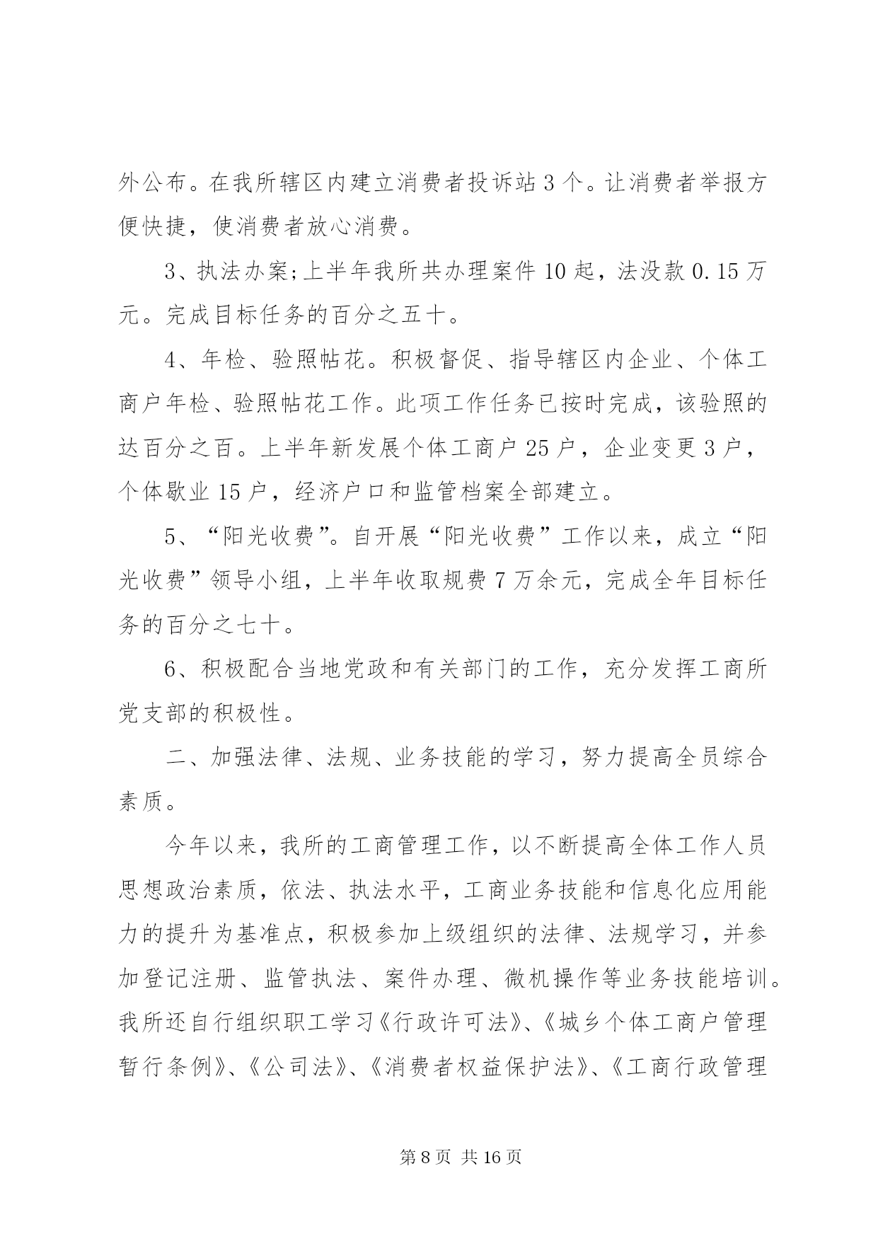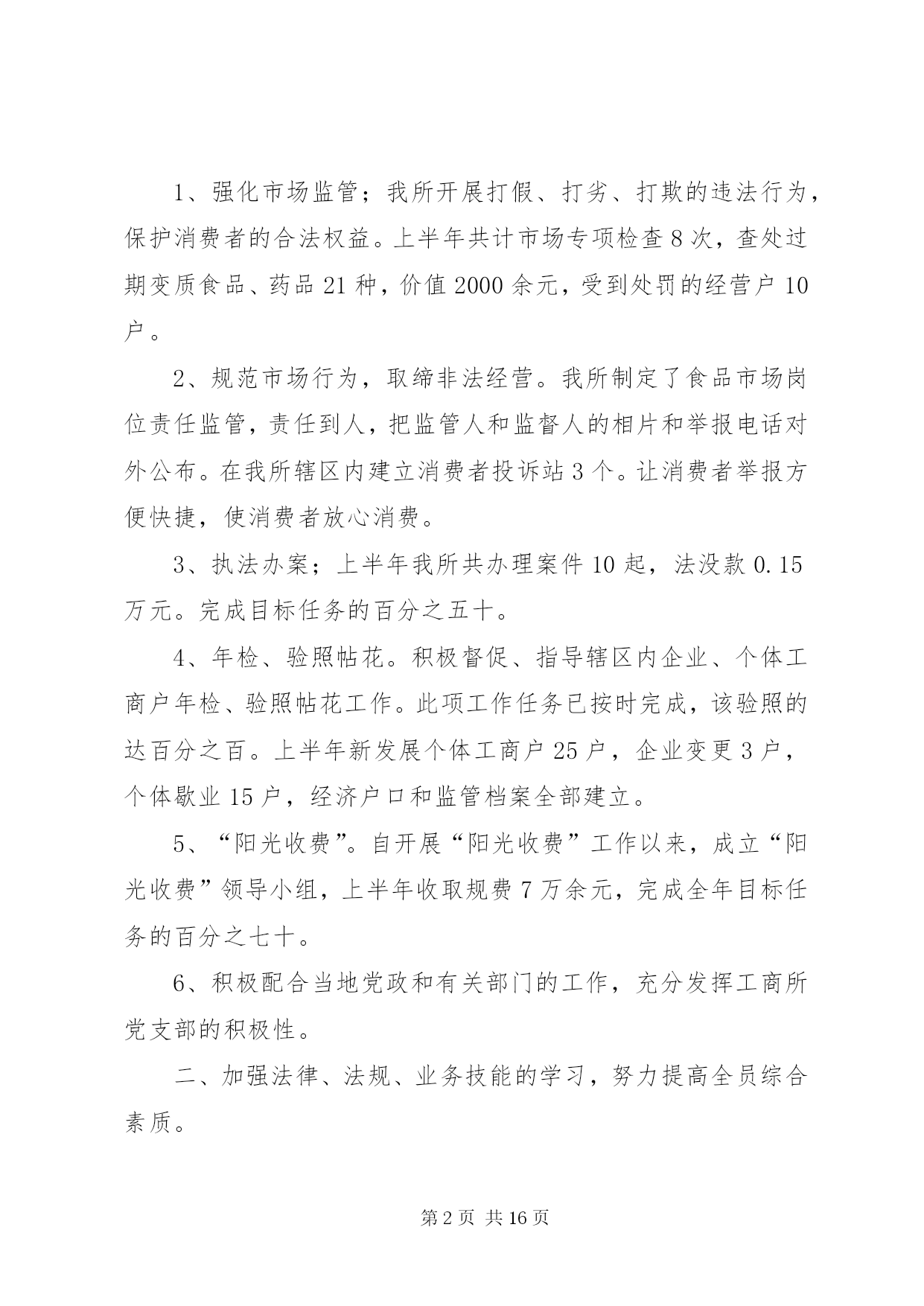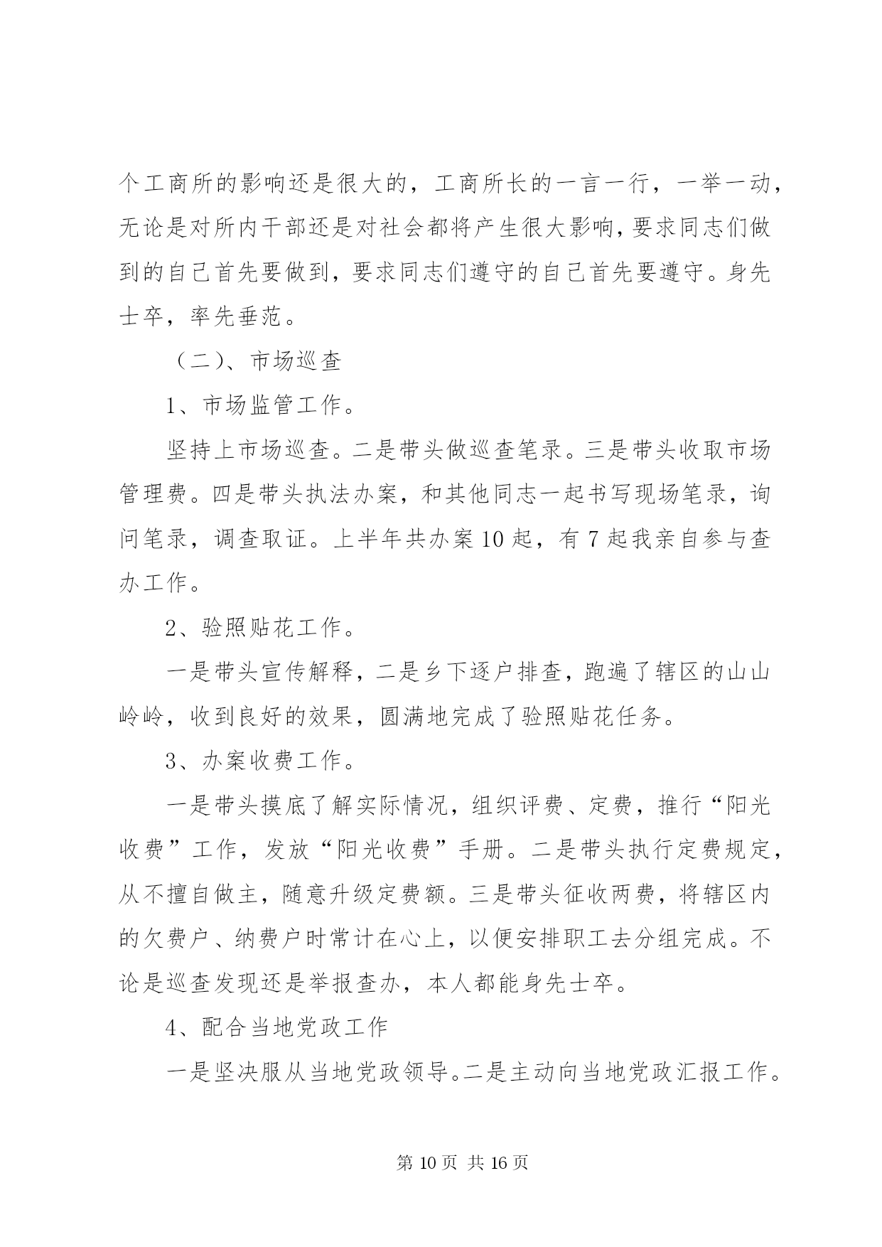 第PAGE\*Arabic\*MERGEFORMAT16页共NUMPAGES\*MERGEFORMAT16页工商所所长述职述廉报告述职述廉报告——**工商所所长***各位领导、各位业户代表:我叫***,根据县局工作的需要负责**工商所工作。现将2007年履行职责情况和党风廉政建设情况向领导和同志们作简要汇报:一、工作职责履行及工作目标完成情况作为工商所所长,《工商行政管理所条例》第五条明确规定。“工商所实行所长负责制”。即负总责,主持全面工作,领导和带领全所工作人员贯彻执行党的路线、方针、政策,以及国家的法律、法规,保证完成《工商行政管理所条例》第三条规定的基本任务和上级局年初下达的各项工作目标任务及各个阶段的具体工作任务,还有当地党政安排的其他工作任务。2007年度的主要工作目标任务是。以邓小平理论和“三个代表”为指导思想,领导和带领全所干部加强市场监管,依法行政,保证正常的市场经济秩序,促进地方经济健康有序的发展。做好企业年检和个体工商户验照帖花工作,保护合法经营,打击非法经营活动,维护消费者合法权益。同时,上半年收取规费7万余元,罚没款0.15万元。1、强化市场监管;我所开展打假、打劣、打欺的违法行为,保护消费者的合法权益。上半年共计市场专项检查8次,查处过期变质食品、药品21种,价值2000余元,受到处罚的经营户10户。2、规范市场行为,取缔非法经营。我所制定了食品市场岗位责任监管,责任到人,把监管人和监督人的相片和举报电话对外公布。在我所辖区内建立消费者投诉站3个。让消费者举报方便快捷,使消费者放心消费。3、执法办案;上半年我所共办理案件10起,法没款0.15万元。完成目标任务的百分之五十。4、年检、验照帖花。积极督促、指导辖区内企业、个体工商户年检、验照帖花工作。此项工作任务已按时完成,该验照的达百分之百。上半年新发展个体工商户25户,企业变更3户,个体歇业15户,经济户口和监管档案全部建立。5、“阳光收费”。自开展“阳光收费”工作以来,成立“阳光收费”领导小组,上半年收取规费7万余元,完成全年目标任务的百分之七十。6、积极配合当地党政和有关部门的工作,充分发挥工商所党支部的积极性。二、加强法律、法规、业务技能的学习,努力提高全员综合素质。今年以来,我所的工商管理工作,以不断提高全体工作人员思想政治素质,依法、执法水平,工商业务技能和信息化应用能力的提升为基准点,积极参加上级组织的法律、法规学习,并参加登记注册、监管执法、案件办理、微机操作等业务技能培训。我所还自行组织职工学习《行政许可法》、《城乡个体工商户管理暂行条例》、《公司法》、《消费者权益保护法》、《工商行政管理所食品安全监督工作规范》和《党风廉正建设》等常用法律、法规。通过学习提高了自己和全所工作人员的思想政治素质,为履行岗位职责、搞好工商行政管理工作打下了良好的思想、业务技能基础。三、自我职责履行情况2007年初,根据县工商局的工作安排,我调入**工商所主持工作,在上级组织的领导下和同志们的大力支持下,以党的路线、方针、政策、和国家法律、法规为准则,坚持实事求是,一切从实际出发的工作作风,充分发挥组织领导和带头作用,克服困难,勤奋工作,完XX县区局下达的各项工作目标任务和当地党政交办的其他工作。主要做法是:(一)、发挥班长带头作用1、勤于思考,从实际出发,用制度管人管事。一是制定了2007年工作目标责任制,按照县局的工作制度,制定了阶段性的工作安排,制定了工作人员岗位责任制。二是工作阶段性布置,阶段性抓落实,阶段性检查,阶段性总结。三是严格财务管理制度和考勤制度。2、大局意识强,工作稳中求进。自觉做到“四个服从”,保证政令畅通。坚决执行上级决策。本人的一惯作风是无论县局直接领导还是业务领导,凡是安排办理的或要求执行的都认真去办理或执行,做到有令必行、有禁必止。在工商所,作为所长对整个工商所的影响还是很大的,工商所长的一言一行,一举一动,无论是对所内干部还是对社会都将产生很大影响,要求同志们做到的自己首先要做到,要求同志们遵守的自己首先要遵守。身先士卒,率先垂范。(二)、市场巡查1、市场监管工作。坚持上市场巡查。二是带头做巡查笔录。三是带头收取市场管理费。四是带头执法办案,和其他同志一起书写现场笔录,询问笔录,调查取证。上半年共办案10起,有7起我亲自参与查办工作。2、验照贴花工作。一是带头宣传解释,二是乡下逐户排查,跑遍了辖区的山山岭岭,收到良好的效果,圆满地完成了验照贴花任务。3、办案收费工作。一是带头摸底了解实际情况,组织评费、定费,推行“阳光收费”工作,发放“阳光收费”手册。二是带头执行定费规定,从不擅自做主,随意升级定费额。三是带头征收两费,将辖区内的欠费户、纳费户时常计在心上,以便安排职工去分组完成。不论是巡查发现还