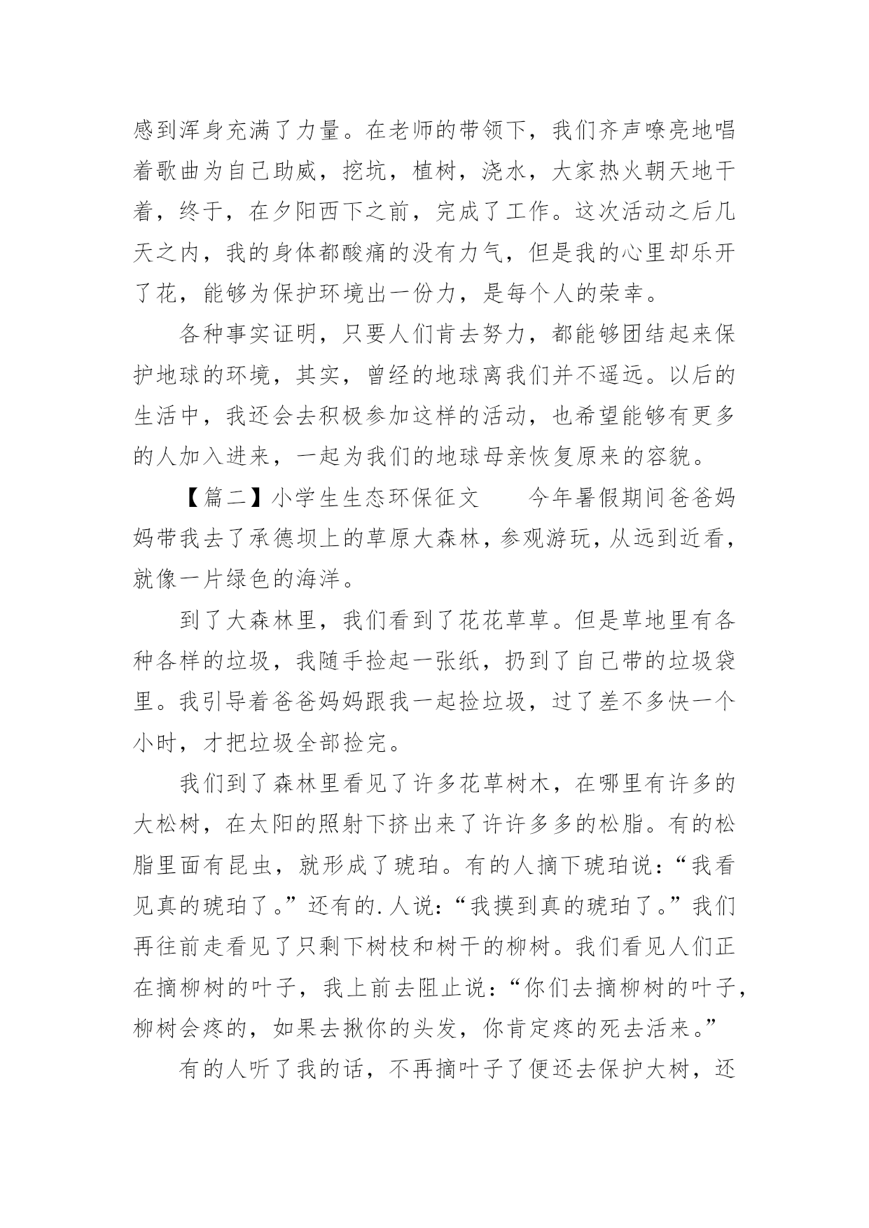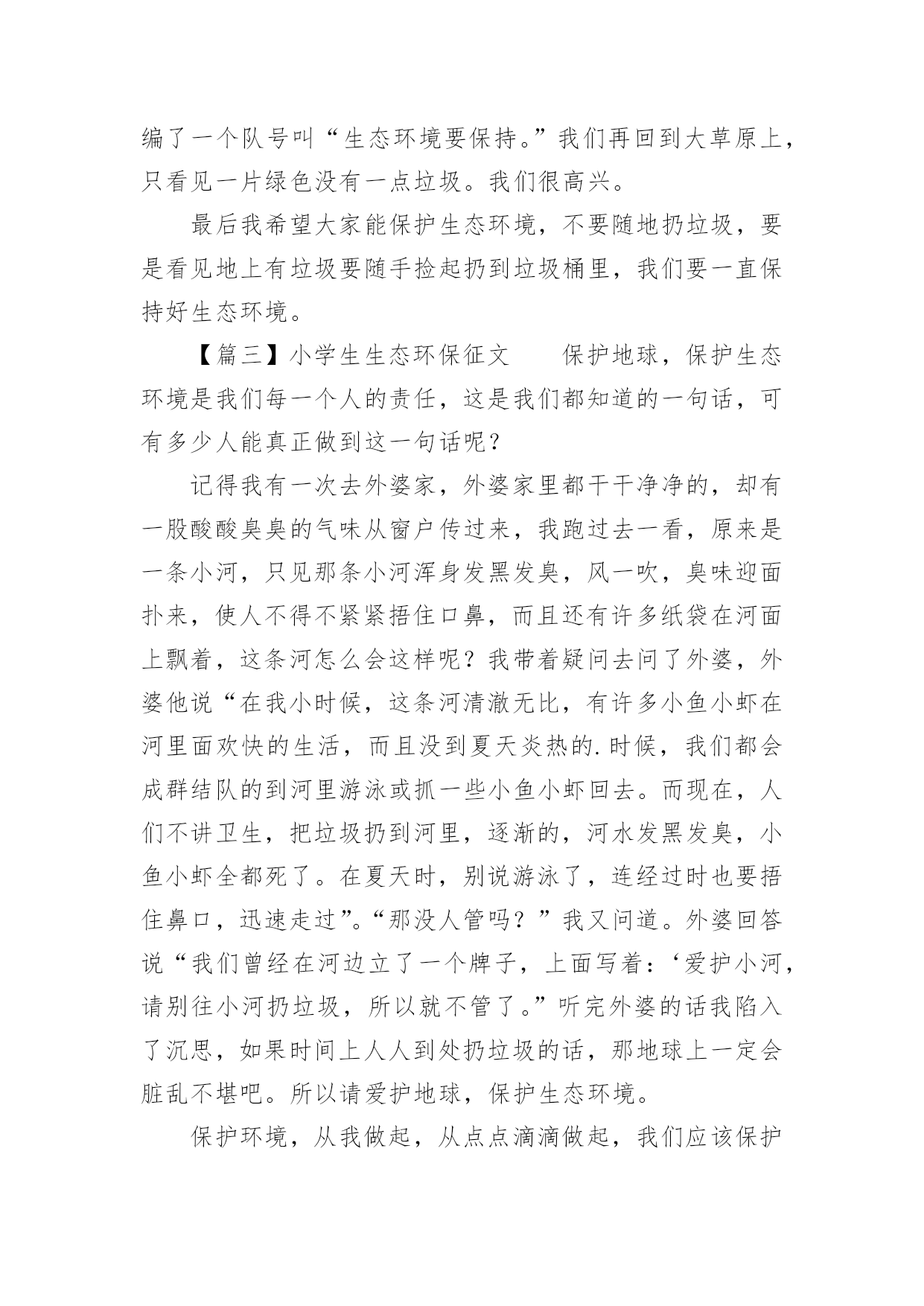 小学生生态环保征文小学生生态环保征文保护地球,从我做起古往今来,地球妈妈用甘甜的乳汁哺育了无数代子孙。原来的她被小辈们装饰得楚楚动人。小编为大家提供小学生生态环保征文,欢迎阅读。【篇一】小学生生态环保征文湛蓝的天空上,不时有鸟儿飞过。四周是漫山遍野的绿色,青翠欲滴,仿佛一片绿色的海洋,即将要流入你的心中。森林里,各种各样的动物在互相嬉戏,享受着这美好且和谐的大自然……这,是曾经的地球。可是如今的地球却与曾经相差如此遥远。绿色在迅速消失,天空也不再蔚蓝,动物们更是我家可归,一切都源于我们人类,而现在,作为罪魁祸首的我们也该为地球做点什么了……那一天,辅导班组织“绿色家园”植树活动,每一个人都积极参加,乘着大巴车,来到了一片开阔的平原上,这里没有一棵树木,有的.只是遍地的杂草。每个人都从车上拿下了自己的树苗,我也不例外,植树,说起来简单,做起来却困难得很。首先,我们要除去这里的杂草,以便影响树苗的生长。每个人都拿起了从没摸过的锄头,便热火朝天的干起来。因为是第一次干活,当笨拙的我们将在草出完的时候,已经是烈日当空了。这仅仅是第一步,大家就累得上气不接下气,我也不例外,坐在地上再也不想站起来了。但是,我们没有放弃,每当想到曾经的地球是那样的美丽,我们就感到浑身充满了力量。在老师的带领下,我们齐声嘹亮地唱着歌曲为自己助威,挖坑,植树,浇水,大家热火朝天地干着,终于,在夕阳西下之前,完成了工作。这次活动之后几天之内,我的身体都酸痛的没有力气,但是我的心里却乐开了花,能够为保护环境出一份力,是每个人的荣幸。各种事实证明,只要人们肯去努力,都能够团结起来保护地球的环境,其实,曾经的地球离我们并不遥远。以后的生活中,我还会去积极参加这样的活动,也希望能够有更多的人加入进来,一起为我们的地球母亲恢复原来的容貌。【篇二】小学生生态环保征文今年暑假期间爸爸妈妈带我去了承德坝上的草原大森林,参观游玩,从远到近看,就像一片绿色的海洋。到了大森林里,我们看到了花花草草。但是草地里有各种各样的垃圾,我随手捡起一张纸,扔到了自己带的垃圾袋里。我引导着爸爸妈妈跟我一起捡垃圾,过了差不多快一个小时,才把垃圾全部捡完。我们到了森林里看见了许多花草树木,在哪里有许多的大松树,在太阳的照射下挤出来了许许多多的松脂。有的松脂里面有昆虫,就形成了琥珀。有的人摘下琥珀说:“我看见真的琥珀了。”还有的.人说:“我摸到真的琥珀了。”我们再往前走看见了只剩下树枝和树干的柳树。我们看见人们正在摘柳树的叶子,我上前去阻止说:“你们去摘柳树的叶子,柳树会疼的,如果去揪你的头发,你肯定疼的死去活来。”有的人听了我的话,不再摘叶子了便还去保护大树,还编了一个队号叫“生态环境要保持。”我们再回到大草原上,只看见一片绿色没有一点垃圾。我们很高兴。最后我希望大家能保护生态环境,不要随地扔垃圾,要是看见地上有垃圾要随手捡起扔到垃圾桶里,我们要一直保持好生态环境。【篇三】小学生生态环保征文保护地球,保护生态环境是我们每一个人的责任,这是我们都知道的一句话,可有多少人能真正做到这一句话呢?记得我有一次去外婆家,外婆家里都干干净净的,却有一股酸酸臭臭的气味从窗户传过来,我跑过去一看,原来是一条小河,只见那条小河浑身发黑发臭,风一吹,臭味迎面扑来,使人不得不紧紧捂住口鼻,而且还有许多纸袋在河面上飘着,这条河怎么会这样呢?我带着疑问去问了外婆,外婆他说“在我小时候,这条河清澈无比,有许多小鱼小虾在河里面欢快的生活,而且没到夏天炎热的.时候,我们都会成群结队的到河里游泳或抓一些小鱼小虾回去。而现在,人们不讲卫生,把垃圾扔到河里,逐渐的,河水发黑发臭,小鱼小虾全都死了。在夏天时,别说游泳了,连经过时也要捂住鼻口,迅速走过”。“那没人管吗?”我又问道。外婆回答说“我们曾经在河边立了一个牌子,上面写着:‘爱护小河,请别往小河扔垃圾,所以就不管了。”听完外婆的话我陷入了沉思,如果时间上人人到处扔垃圾的话,那地球上一定会脏乱不堪吧。所以请爱护地球,保护生态环境。保护环境,从我做起,从点点滴滴做起,我们应该保护花草树木,珍稀水质源。如果每个人都少用一滴水,那一定能使一条条干枯的小河重获升级。为了地球的明天,人类的未来,让我们行动起来,节约能源,保卫家园,从我们身边做起。