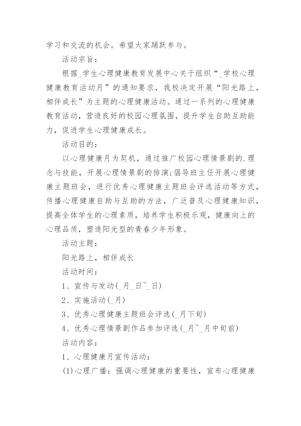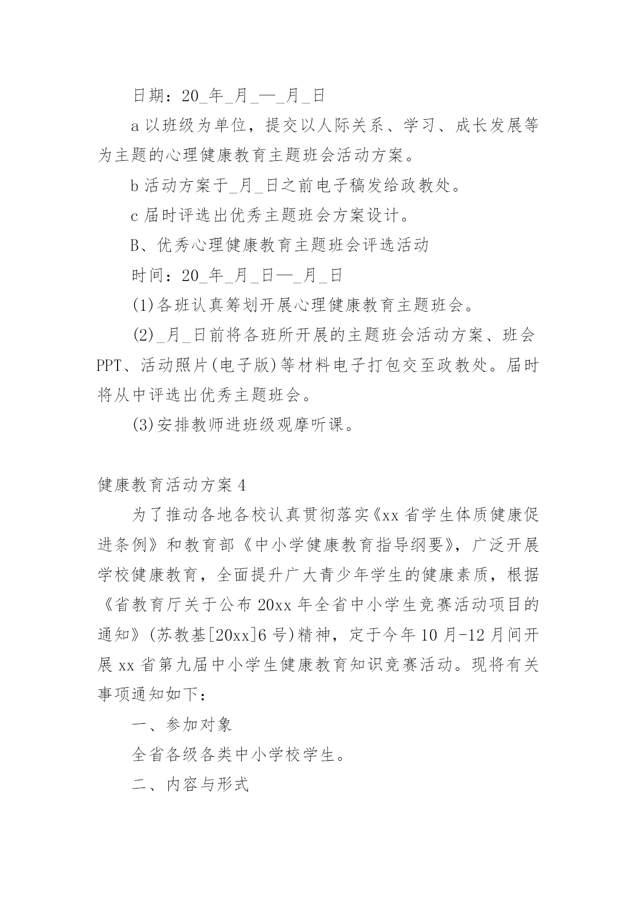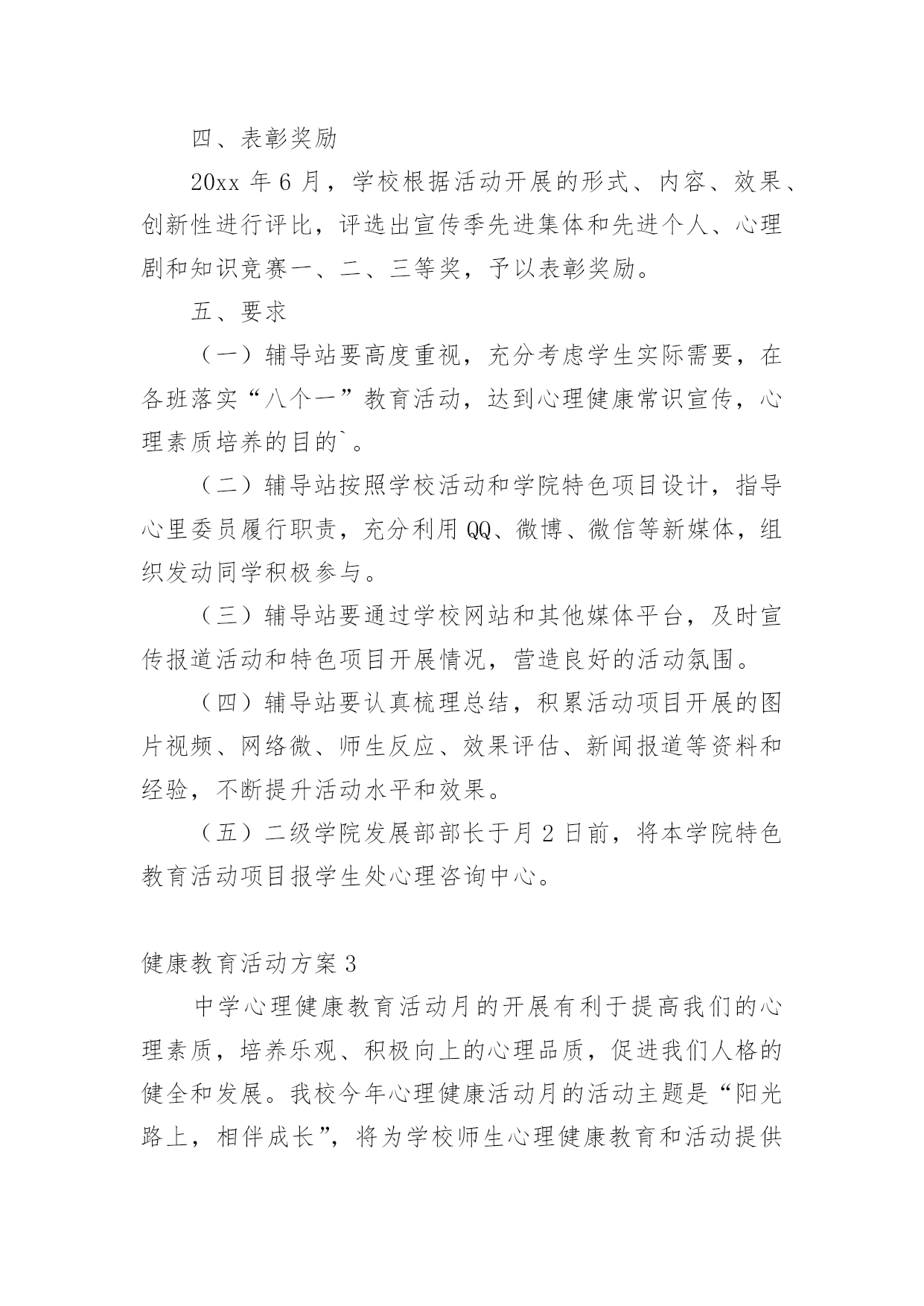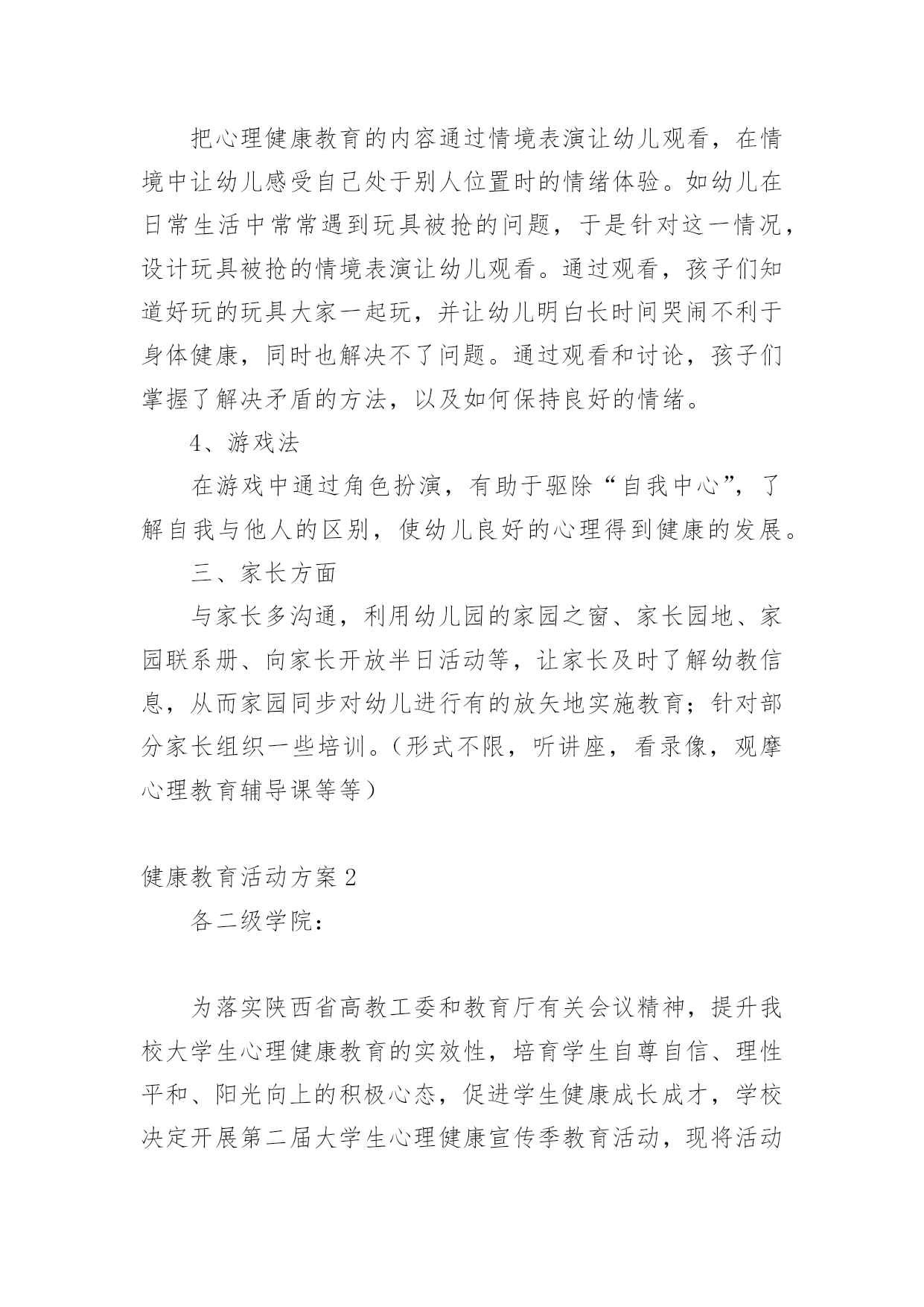 健康教育活动方案为了确保工作或事情能高效地开展,我们需要提前开始方案制定工作,方案是书面计划,是具体行动实施办法细则,步骤等。方案应该怎么制定呢?下面是小编帮大家整理的健康教育活动方案,供大家参考借鉴,希望可以帮助到有需要的朋友。健康教育活动方案1佛洛伊德曾说过:“早期的心理健全对一个人未来的发展很重要”。成年期许多心理健康源于他的儿童早期,儿童早期的心理健康,它会直接影响一个人的人格健康发展。而3—6岁是幼儿心理发展的关键期,在这一时期,幼儿的心理发展会直接影响着他的生理发展。因此我们必须重视幼儿的心理健康教育。具体实施:一、幼儿园方面1、设立心理角:针对不同年龄心理教育的目标,创设、选择适合幼儿操作的,有利于心理品质优化的环境与材料,如:某幼儿园的“快乐心情小屋”,教师将小朋友带来的有趣的玩具与图书,放进去,让孩子在游戏时间进去分享,交流快乐的事情。2、幼儿园设立游戏室(角):通过游戏,让幼儿自发地、自然地将自己的心理感受与问题充分表现出来,并获得情绪上的松弛,最终认识自我,学分控制自我。个体性的游戏矫治对解决由幼儿本身的情绪而导致的问题比较有效,而集体性的游戏矫治对解决由社会适应困难引进的问题较为有效。3、建立幼儿心情日记:为每位幼儿准备一本心情日记,在每天适当的时间请小朋友记下自己今天的心情,并与老师、同伴分享、交流,学会面对不同的心情,丰富幼儿生活中的情感体验。二、教师方面1、每学期对教师进行三次心理健康教育内容的培训。(形式不限,听讲座,看录像,观摩心理教育辅导课等等)2、上好健康教育课。教师备好心理健康教育课教案,并组织听课。3、组建教师心理咨询志愿者队伍。4、在幼儿的生活学习中注重培养孩子(1)生活活动孩子的情感在日常生活中时有流露,教师要善于抓住机会,随时随地进行培养,这种培养要既有群体性又有个别性。如在生活角里开展系鞋带、扣纽扣、叠手帕;午睡起床后两人互叠被子等,这样既锻炼了幼儿的自理能力,又感受到了相互合作的快乐感。如去敬老院慰问老人,从而教育幼儿尊敬老人。开展亲子活动,体会父母爱自己的情感,从而教育幼儿爱自己的父母。鼓励孩子周日串门,既培养幼儿的交往能力,又培养幼儿热情、开朗、以及合群性。(2)学习活动学习活动是幼儿的生成性活动和预设性活动的有机结合,它为幼儿的经验形成和发展提供了各种可能。在活动中,老师要有目的地渗透一些心理健康的`内容,并体现在教育的全过程之中。如:小班计算教学活动中的图形分类。活动中,老师将能力强和能力弱的孩子分在一起,他们只有相互合作,才能将同类图形归在一起,从而提高了他们的合群性。5、心理健康教育的方法1、同伴引导法教师尽量为幼儿创设良好的环境,引导幼儿与同伴交往,使他们从小养成大方、合群、热情开朗、团结友爱的心理。在游戏中为了培养幼儿的合作精神,老师将合作能力强的幼儿和合作能力弱的幼儿一起游戏,也不失为一种好方法。例如:体育活动的小组竞赛;日常生活中的共抬桌子、整理玩具、收拾积木、互叠被子等必须共同商量,才能顺利进行。2、角色互换法在一定的情景中,或在感受一定的情绪体验后,进行角色互换来体验自己处于别人位置时的感受。如:小班孩子在角色游戏中,他们很喜欢扮演大人的角色玩娃娃家的游戏来照顾娃娃,于是,组织孩子们一起做“喂娃娃吃饭的游戏”,通过角色互换,将吃饭这一生活行为,通过孩子们自己的行为和语言而牢记在心。通过儿歌“小宝宝,来来来,张开嘴,吃一口,一调羹,一勺饭,嚼一嚼,往下咽”不断地引导和鼓励,教会小班孩子们逐步学会了用小调羹自己吃饭了。3、情境表演法把心理健康教育的内容通过情境表演让幼儿观看,在情境中让幼儿感受自己处于别人位置时的情绪体验。如幼儿在日常生活中常常遇到玩具被抢的问题,于是针对这一情况,设计玩具被抢的情境表演让幼儿观看。通过观看,孩子们知道好玩的玩具大家一起玩,并让幼儿明白长时间哭闹不利于身体健康,同时也解决不了问题。通过观看和讨论,孩子们掌握了解决矛盾的方法,以及如何保持良好的情绪。4、游戏法在游戏中通过角色扮演,有助于驱除“自我中心”,了解自我与他人的区别,使幼儿良好的心理得到健康的发展。三、家长方面与家长多沟通,利用幼儿园的家园之窗、家长园地、家园联系册、向家长开放半日活动等,让家长及时了解幼教信息,从而家园同步对幼儿进行有的放矢地实施教育;针对部分家长组织一些培训。(形式不限,听讲座,看录像,观摩心理教育辅导课等等)健康教育活动方案2各二级学院:为落实陕西省高教工委和教育厅有关会议精神,提升我校大学生心理健康教育的实效性,培育学生自尊自信、理性平和、阳光向上的积极心态,促进学生健康成长成才,学校决定开展第二届大学生心理健康宣传季教育活动,现将活动有关事项通知如下:一、宣传季主题阳光护航珍爱生命,心理育人激扬青春二、活动时间和宗旨(一)活动时间:20x