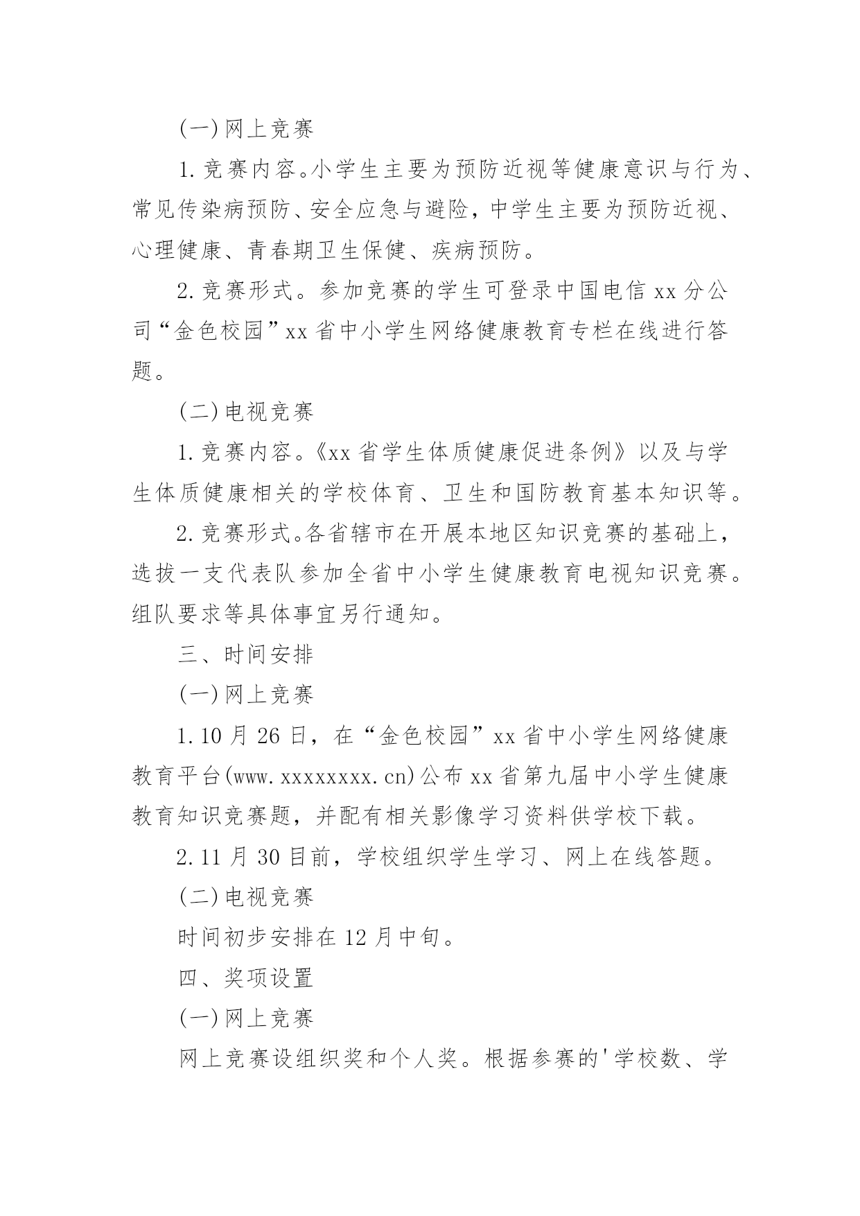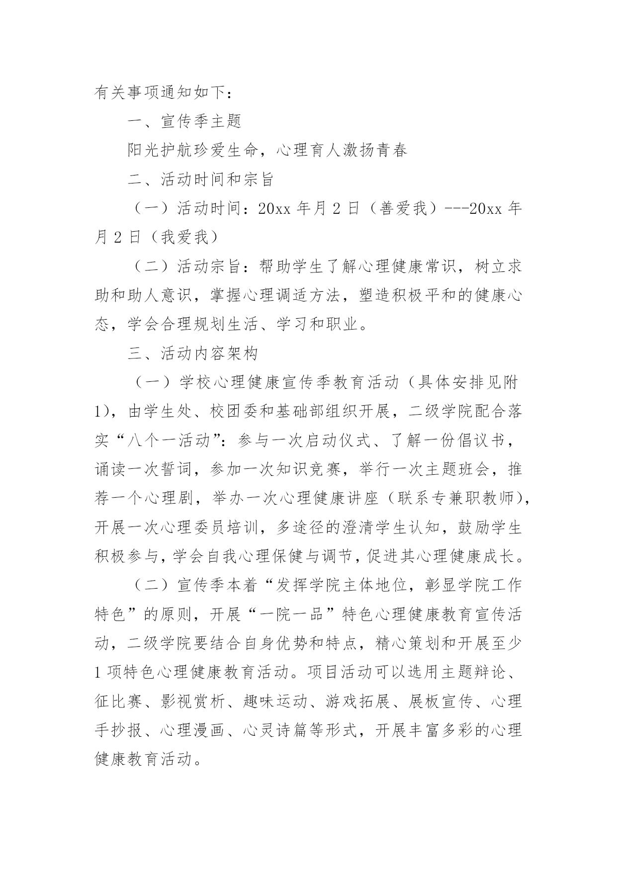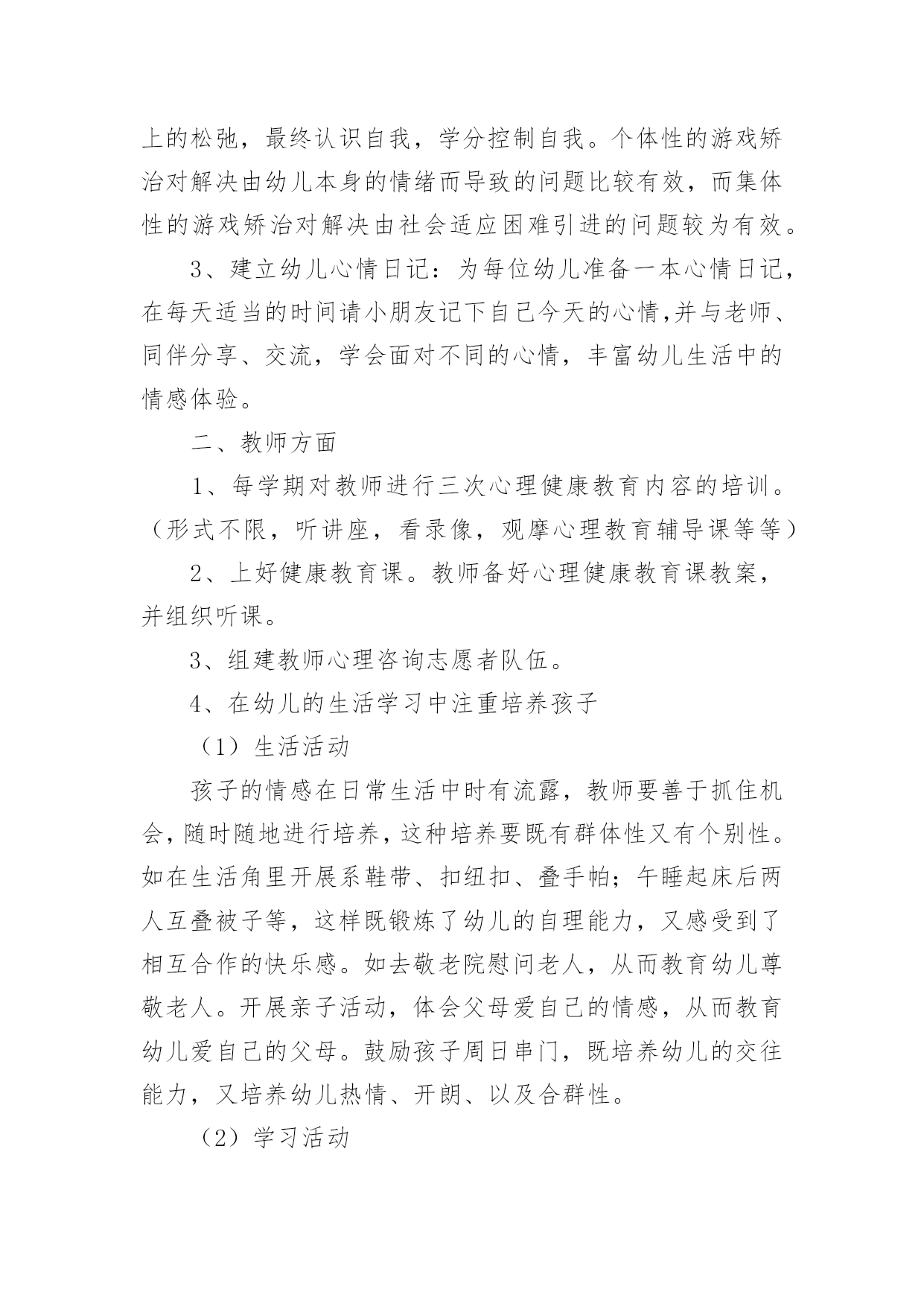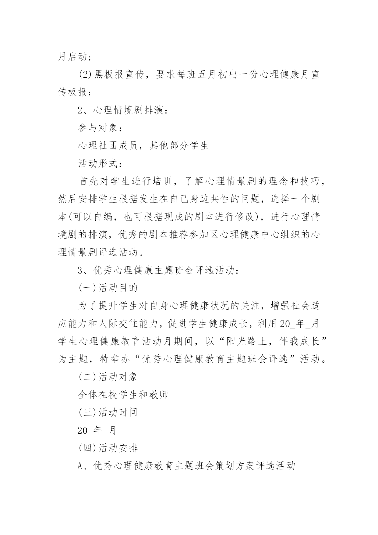 健康教育活动方案为了确保工作或事情能高效地开展,我们需要提前开始方案制定工作,方案是书面计划,是具体行动实施办法细则,步骤等。方案应该怎么制定呢?下面是小编帮大家整理的健康教育活动方案,供大家参考借鉴,希望可以帮助到有需要的朋友。健康教育活动方案1佛洛伊德曾说过:“早期的心理健全对一个人未来的发展很重要”。成年期许多心理健康源于他的儿童早期,儿童早期的心理健康,它会直接影响一个人的人格健康发展。而3—6岁是幼儿心理发展的关键期,在这一时期,幼儿的心理发展会直接影响着他的生理发展。因此我们必须重视幼儿的心理健康教育。具体实施:一、幼儿园方面1、设立心理角:针对不同年龄心理教育的目标,创设、选择适合幼儿操作的,有利于心理品质优化的环境与材料,如:某幼儿园的“快乐心情小屋”,教师将小朋友带来的有趣的玩具与图书,放进去,让孩子在游戏时间进去分享,交流快乐的事情。2、幼儿园设立游戏室(角):通过游戏,让幼儿自发地、自然地将自己的心理感受与问题充分表现出来,并获得情绪上的松弛,最终认识自我,学分控制自我。个体性的游戏矫治对解决由幼儿本身的情绪而导致的问题比较有效,而集体性的游戏矫治对解决由社会适应困难引进的问题较为有效。3、建立幼儿心情日记:为每位幼儿准备一本心情日记,在每天适当的时间请小朋友记下自己今天的心情,并与老师、同伴分享、交流,学会面对不同的心情,丰富幼儿生活中的情感体验。二、教师方面1、每学期对教师进行三次心理健康教育内容的培训。(形式不限,听讲座,看录像,观摩心理教育辅导课等等)2、上好健康教育课。教师备好心理健康教育课教案,并组织听课。3、组建教师心理咨询志愿者队伍。4、在幼儿的生活学习中注重培养孩子(1)生活活动孩子的情感在日常生活中时有流露,教师要善于抓住机会,随时随地进行培养,这种培养要既有群体性又有个别性。如在生活角里开展系鞋带、扣纽扣、叠手帕;午睡起床后两人互叠被子等,这样既锻炼了幼儿的自理能力,又感受到了相互合作的快乐感。如去敬老院慰问老人,从而教育幼儿尊敬老人。开展亲子活动,体会父母爱自己的情感,从而教育幼儿爱自己的父母。鼓励孩子周日串门,既培养幼儿的交往能力,又培养幼儿热情、开朗、以及合群性。(2)学习活动学习活动是幼儿的生成性活动和预设性活动的有机结合,它为幼儿的经验形成和发展提供了各种可能。在活动中,老师要有目的地渗透一些心理健康的`内容,并体现在教育的全过程之中。如:小班计算教学活动中的图形分类。活动中,老师将能力强和能力弱的孩子分在一起,他们只有相互合作,才能将同类图形归在一起,从而提高了他们的合群性。5、心理健康教育的方法1、同伴引导法教师尽量为幼儿创设良好的环境,引导幼儿与同伴交往,使他们从小养成大方、合群、热情开朗、团结友爱的心理。在游戏中为了培养幼儿的合作精神,老师将合作能力强的幼儿和合作能力弱的幼儿一起游戏,也不失为一种好方法。例如:体育活动的小组竞赛;日常生活中的共抬桌子、整理玩具、收拾积木、互叠被子等必须共同商量,才能顺利进行。2、角色互换法在一定的情景中,或在感受一定的情绪体验后,进行角色互换来体验自己处于别人位置时的感受。如:小班孩子在角色游戏中,他们很喜欢扮演大人的角色玩娃娃家的游戏来照顾娃娃,于是,组织孩子们一起做“喂娃娃吃饭的游戏”,通过角色互换,将吃饭这一生活行为,通过孩子们自己的行为和语言而牢记在心。通过儿歌“小宝宝,来来来,张开嘴,吃一口,一调羹,一勺饭,嚼一嚼,往下咽”不断地引导和鼓励,教会小班孩子们逐步学会了用小调羹自己吃饭了。3、情境表演法把心理健康教育的内容通过情境表演让幼儿观看,在情境中让幼儿感受自己处于别人位置时的情绪体验。如幼儿在日常生活中常常遇到玩具被抢的问题,于是针对这一情况,设计玩具被抢的情境表演让幼儿观看。通过观看,孩子们知道好玩的玩具大家一起玩,并让幼儿明白长时间哭闹不利于身体健康,同时也解决不了问题。通过观看和讨论,孩子们掌握了解决矛盾的方法,以及如何保持良好的情绪。4、游戏法在游戏中通过角色扮演,有助于驱除“自我中心”,了解自我与他人的区别,使幼儿良好的心理得到健康的发展。三、家长方面与家长多沟通,利用幼儿园的家园之窗、家长园地、家园联系册、向家长开放半日活动等,让家长及时了解幼教信息,从而家园同步对幼儿进行有的放矢地实施教育;针对部分家长组织一些培训。(形式不限,听讲座,看录像,观摩心理教育辅导课等等)健康教育活动方案2各二级学院:为落实陕西省高教工委和教育厅有关会议精神,提升我校大学生心理健康教育的实效性,培育学生自尊自信、理性平和、阳光向上的积极心态,促进学生健康成长成才,学校决定开展第二届大学生心理健康宣传季教育活动,现将活动有关事项通知如下:一、宣传季主题阳光护航珍爱生命,心理育人激扬青春二、活动时间和宗旨(一)活动时间:20x